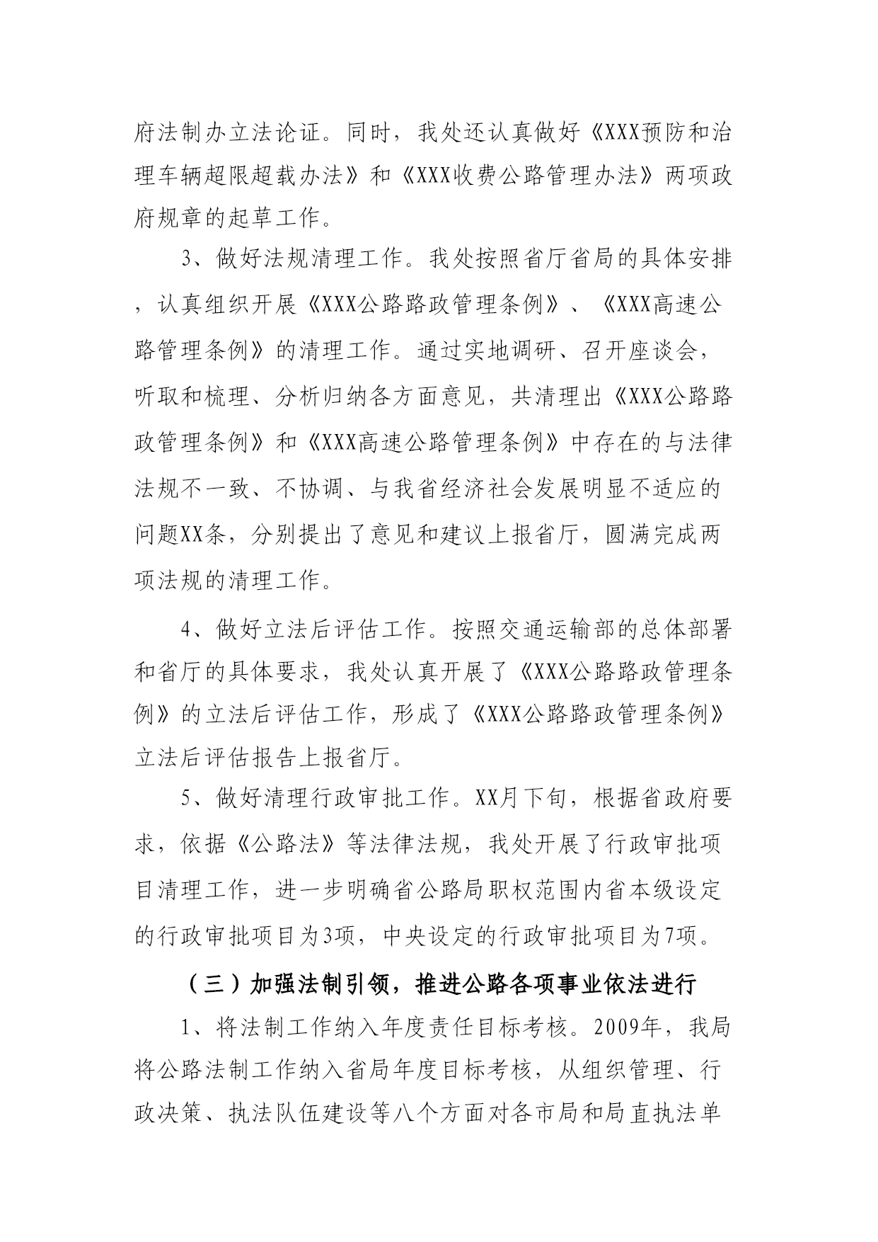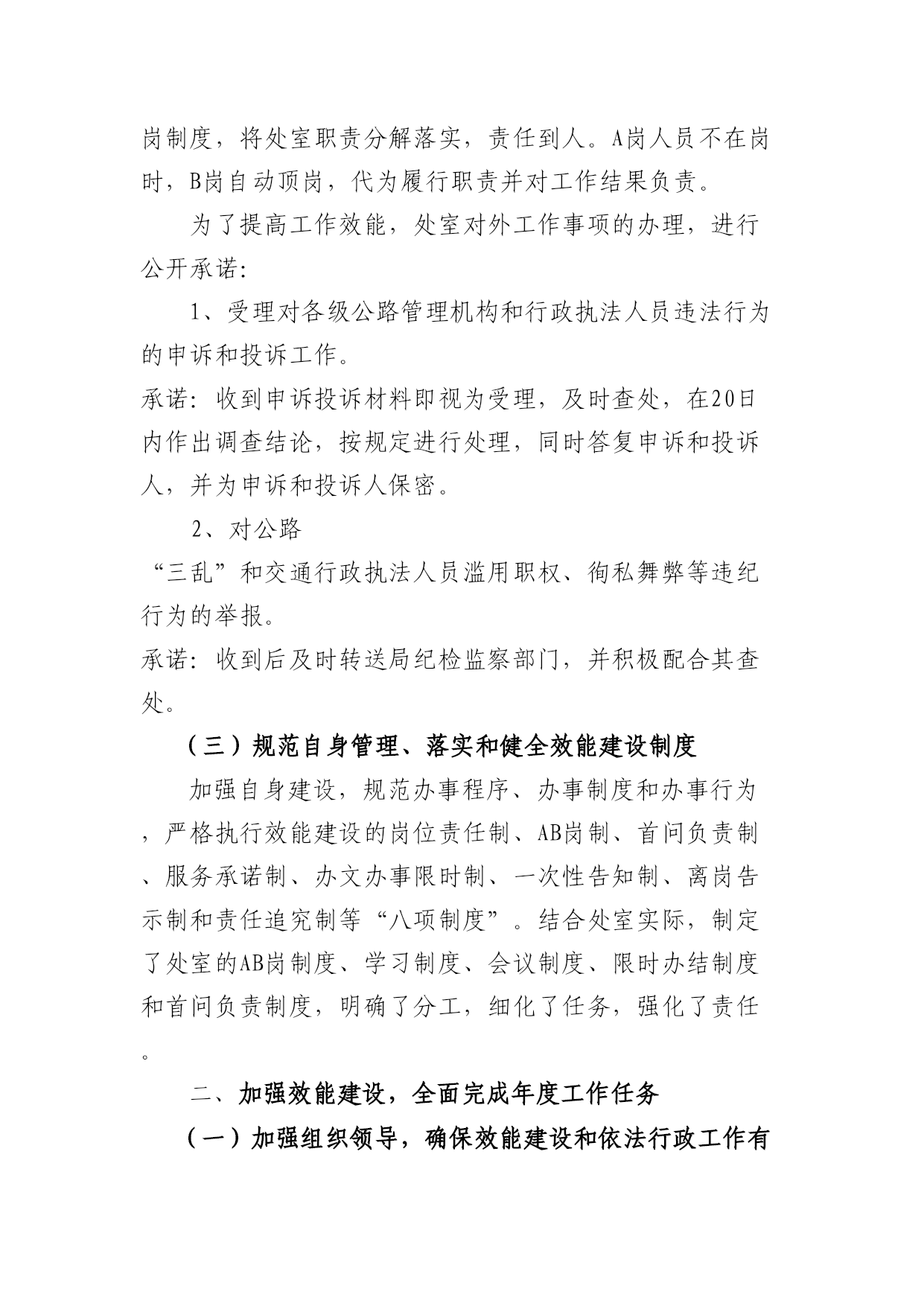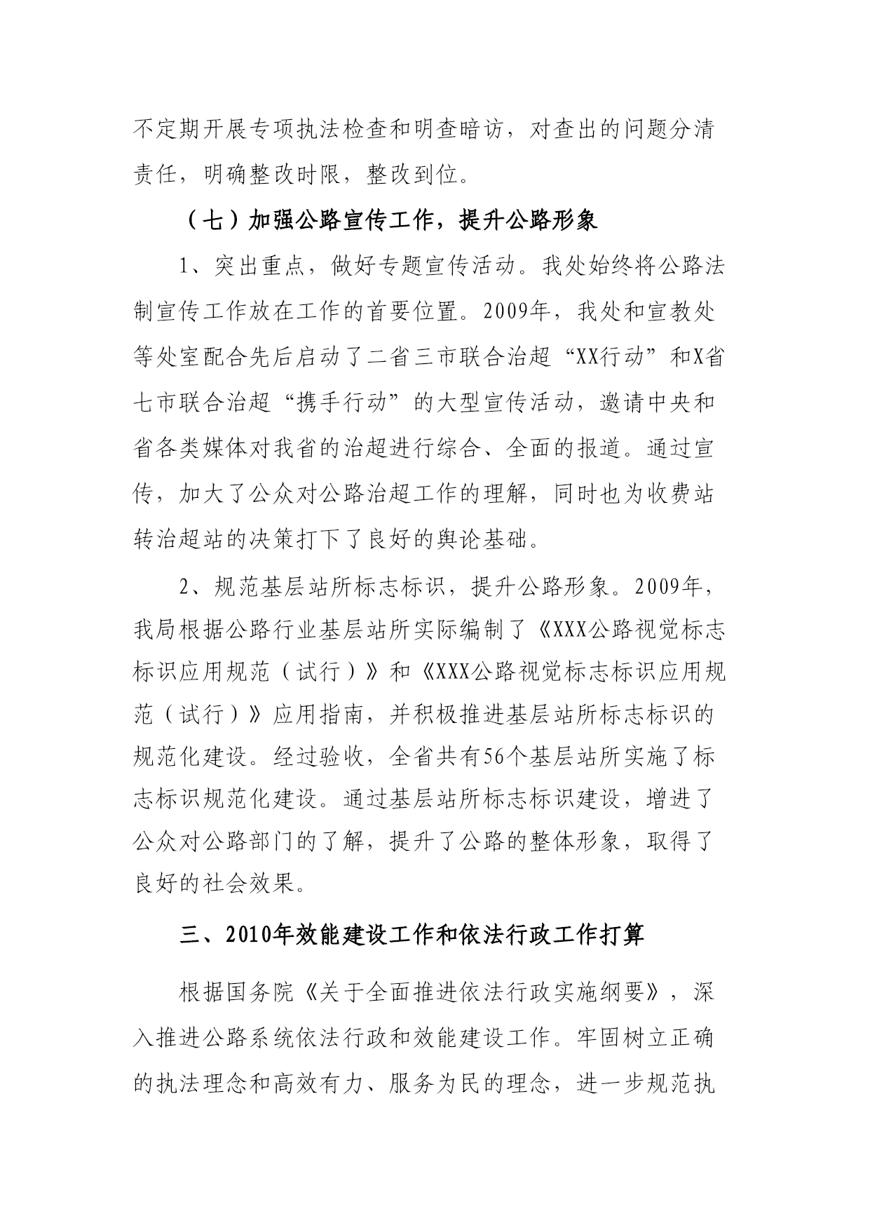 效能建设工作总结(体改法规处)2XXXX年法规处效能建设工作在在省局党委的直接领导下,以科学发展观为指导,加强效能建设,加快公路法制进程,规范执法行为,公路法制工作效率和服务水平明显提高。现将主要情况汇报如下:一、效能建设总体情况(一)提高认识,加强学习全处充分认识到,加强效能建设是转变工作作风、提高办事效率的重要途径,是提高思想觉悟、提升服务能力、强化业务素质的重要手段,必须认真地加以组织实施。全处高度重视,人人参与,认真对待,以昂扬的精神状态扎扎实实地开展效能建设。认真开展学习教育活动,利用支部会或处务会,定期不定期地组织学习党的路线方针政策,学习贯彻上级决策部署,学习传达十七届四中全会、省委八届十二次全会等重要会议精神,认真学习省政府关于深入推进效能建设的重要会议和重要文件精神。学习中,结合处室实际和个人岗位职责,通过撰写学习笔记、讨论与交流等方式,总结经验,查补不足。逐步形成了分工明确、流程规范、高效便捷、优质服务的工作机制,处室的工作效能得到明显提升。(二)严格岗位职责,履行效能建设公开承诺内容严格履行岗位责任制度和AB岗制,制定体改法规处AB岗制度,将处室职责分解落实,责任到人。A岗人员不在岗时,B岗自动顶岗,代为履行职责并对工作结果负责。为了提高工作效能,处室对外工作事项的办理,进行公开承诺:1、受理对各级公路管理机构和行政执法人员违法行为的申诉和投诉工作。承诺:收到申诉投诉材料即视为受理,及时查处,在20日内作出调查结论,按规定进行处理,同时答复申诉和投诉人,并为申诉和投诉人保密。2、对公路“三乱”和交通行政执法人员滥用职权、徇私舞弊等违纪行为的举报。承诺:收到后及时转送局纪检监察部门,并积极配合其查处。(三)规范自身管理、落实和健全效能建设制度加强自身建设,规范办事程序、办事制度和办事行为,严格执行效能建设的岗位责任制、AB岗制、首问负责制、服务承诺制、办文办事限时制、一次性告知制、离岗告示制和责任追究制等“八项制度”。结合处室实际,制定了处室的AB岗制度、学习制度、会议制度、限时办结制度和首问负责制度,明确了分工,细化了任务,强化了责任。二、加强效能建设,全面完成年度工作任务(一)加强组织领导,确保效能建设和依法行政工作有序有力我处始终把依法行政工作作为落实科学发展观的重要举措,依托局依法行政(行政执法责任制)领导小组,负责全省公路系统行政执法监督检查和考评工作,把推行公路依法行政工作列入议事日程,切实加强组织领导。在领导层面,单位主要领导亲自抓,分管领导具体抓,其他领导结合分管工作齐抓共管;在局机关各部门层面上,明确法规处具体负责行政执法的组织和督查工作,人事和纪检监察部门以及其他部门互相配合,形成了分工明确,各司其职,积极互动的良好局面。(二)加强公路立法调研工作,强化依法行政基础1、加强立法申报工作。我处在厅法规处和局领导的领导下,高度重视公路立法工作,积极申报公路立法项目。2009年我局申报的《XXX农村公路条例》被省人大常委会列为立法计划的调研、论证类立法项目。在申报2010年立法计划中,我局继续申报《XXX农村公路条例》,请求提升为审议实施类项目,并申报了《XXX预防和治理车辆超限超载办法》和《XXX收费公路管理办法》两项政府规章。2、做好公路法规起草工作。自《XXX农村公路条例》列入省人大立法规划后,我局组织制定了《XXX农村公路条例》立法起草工作方案,成立起草领导小组及办公室,明确立法起草工作的指导思想、实施步骤、相关人员的工作职责等,立法起草工作全面启动,目前该条例已通过省政府法制办立法论证。同时,我处还认真做好《XXX预防和治理车辆超限超载办法》和《XXX收费公路管理办法》两项政府规章的起草工作。3、做好法规清理工作。我处按照省厅省局的具体安排,认真组织开展《XXX公路路政管理条例》、《XXX高速公路管理条例》的清理工作。通过实地调研、召开座谈会,听取和梳理、分析归纳各方面意见,共清理出《XXX公路路政管理条例》和《XXX高速公路管理条例》中存在的与法律法规不一致、不协调、与我省经济社会发展明显不适应的问题XX条,分别提出了意见和建议上报省厅,圆满完成两项法规的清理工作。4、做好立法后评估工作。按照交通运输部的总体部署和省厅的具体要求,我处认真开展了《XXX公路路政管理条例》的立法后评估工作,形成了《XXX公路路政管理条例》立法后评估报告上报省厅。5、做好清理行政审批工作。XX月下旬,根据省政府要求,依据《公路法》等法律法规,我处开展了行政审批项目清理工作,进一步明确省公路局职权范围内省本级设定的行政审批项目为3项,中央设定的行政审批项目为7项。(三)加强法制引领,推进公路各项事业依法进行1、将法制工作纳入年度责任目标考核。2009年,我局