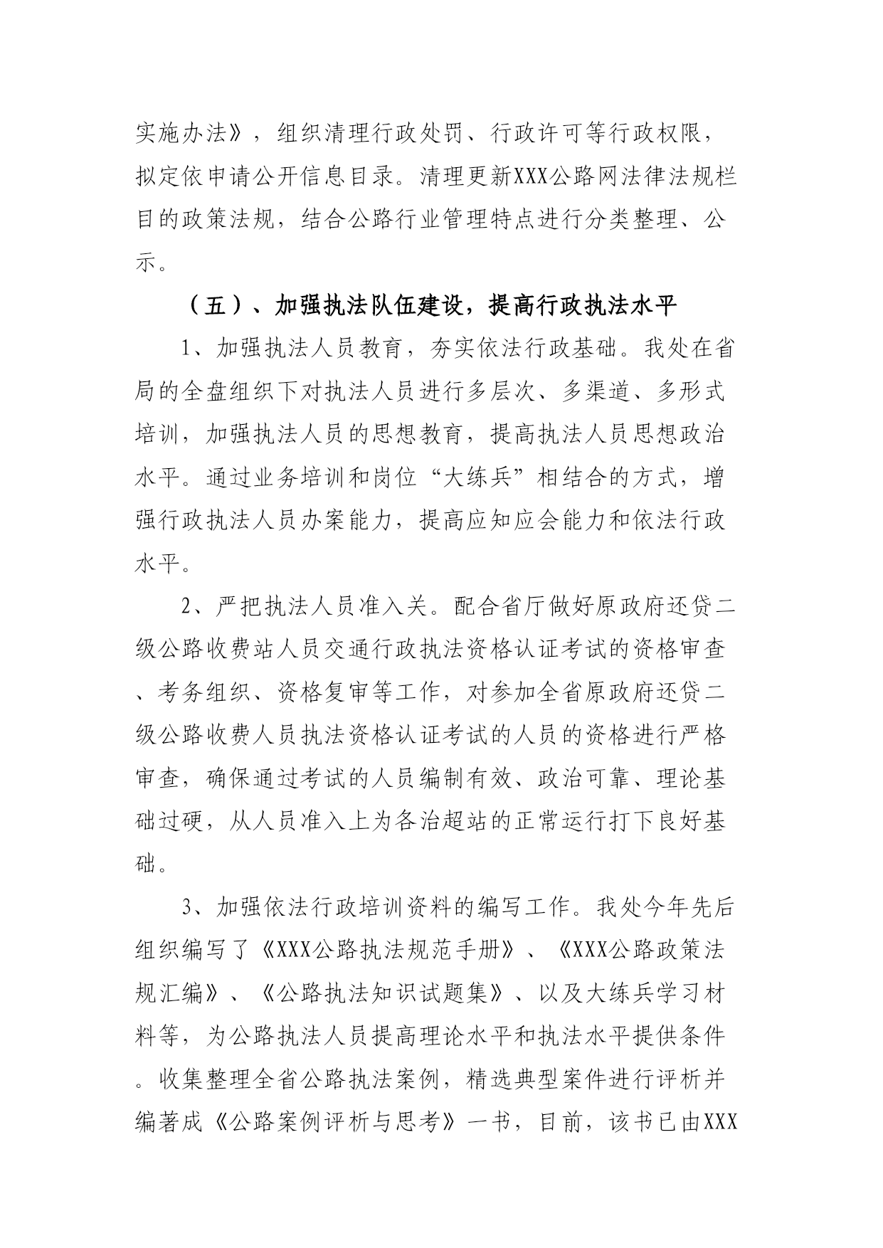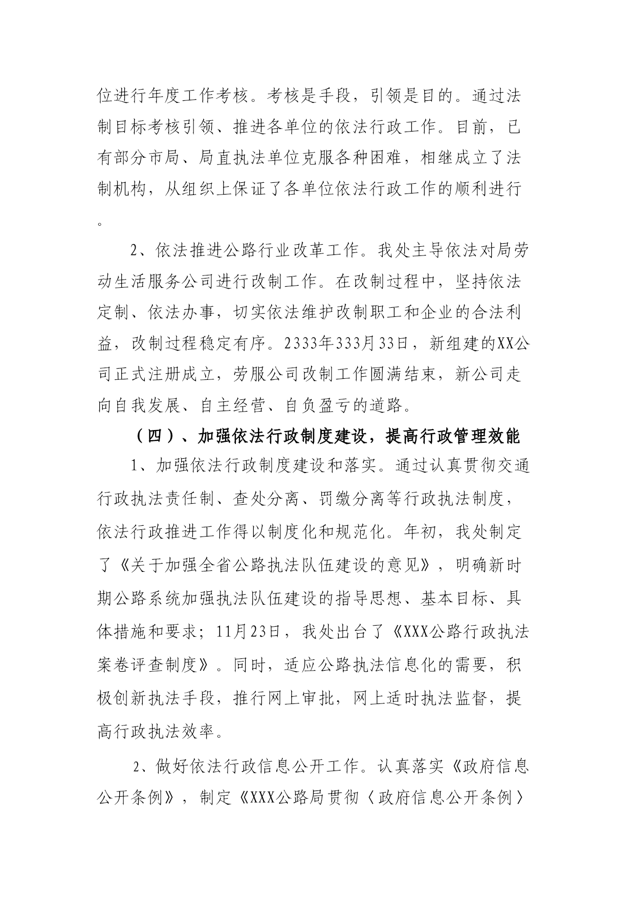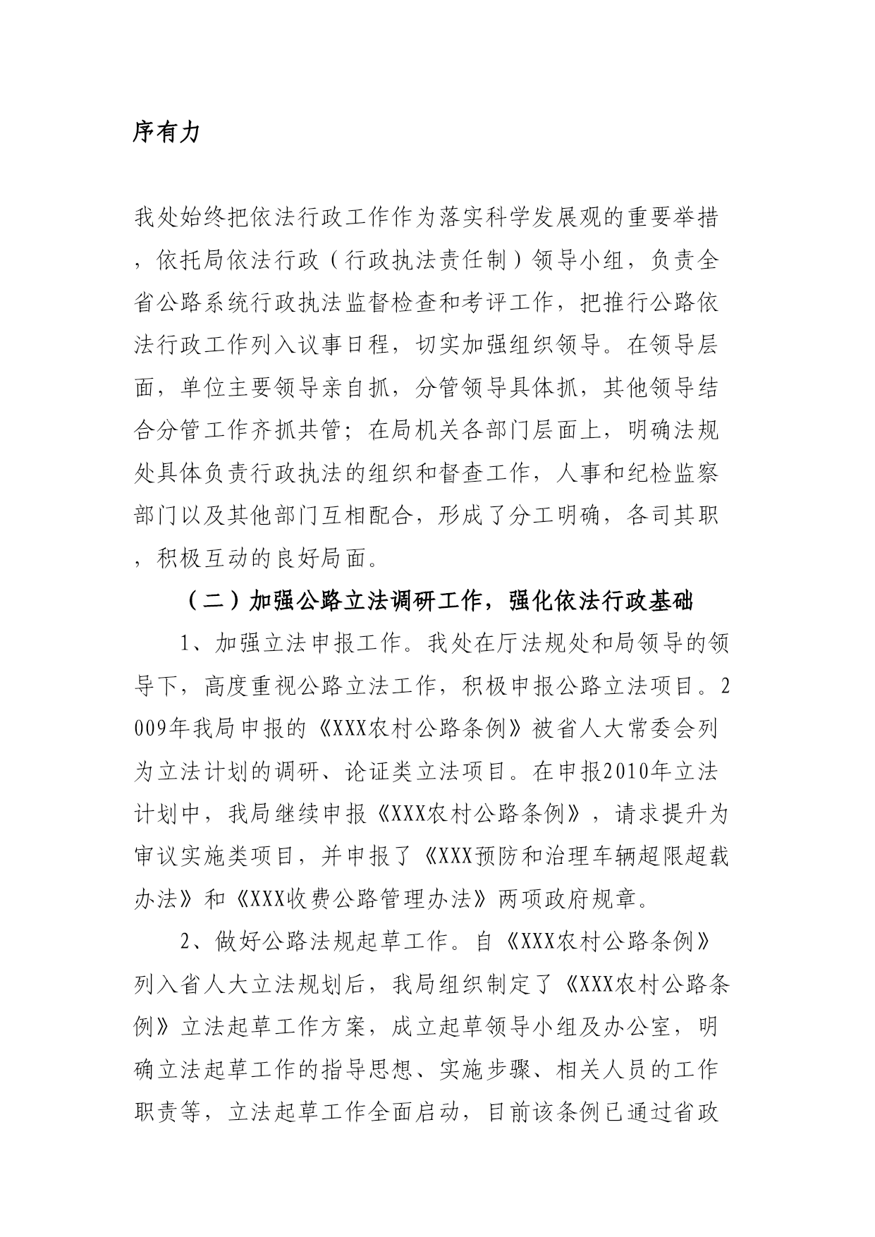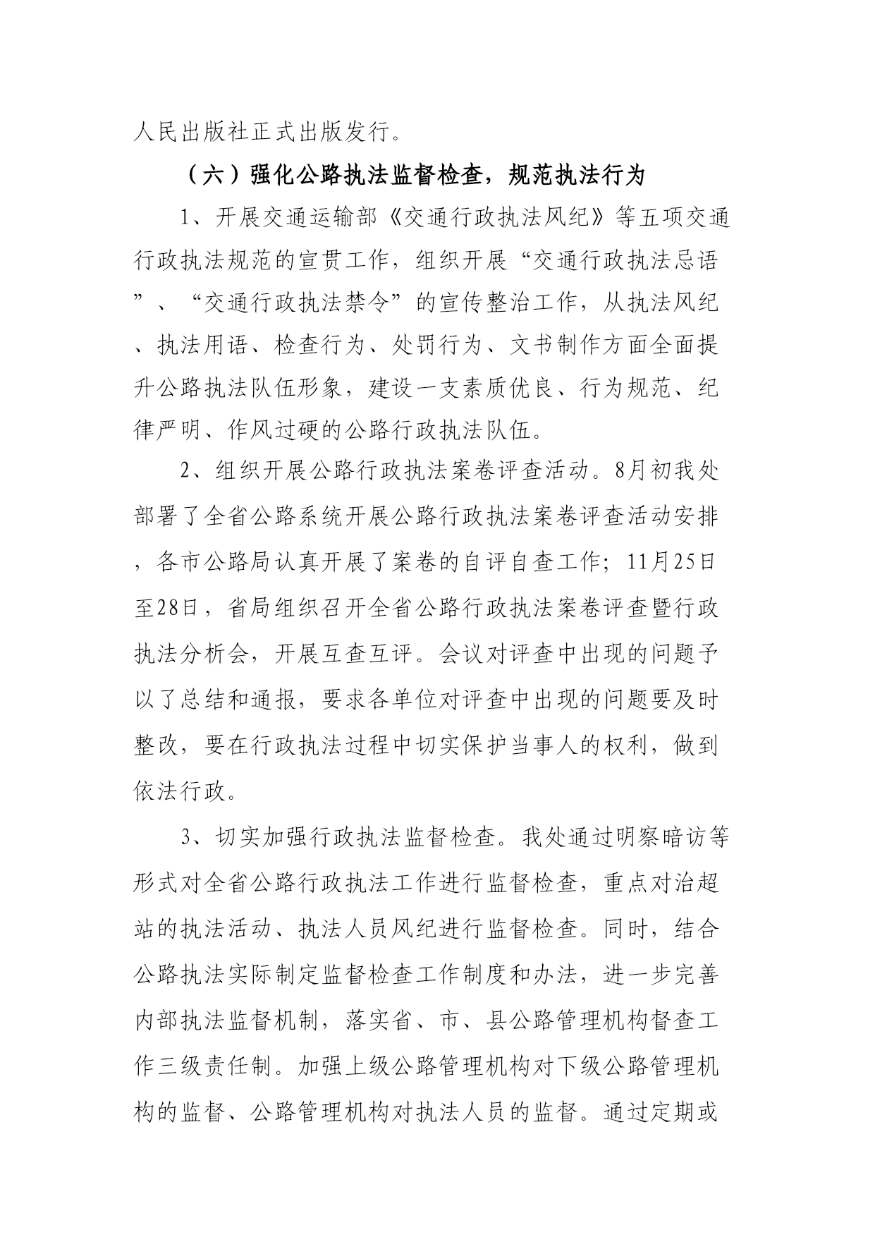 效能建设工作总结(体改法规处)2XXXX年法规处效能建设工作在在省局党委的直接领导下,以科学发展观为指导,加强效能建设,加快公路法制进程,规范执法行为,公路法制工作效率和服务水平明显提高。现将主要情况汇报如下:一、效能建设总体情况(一)提高认识,加强学习全处充分认识到,加强效能建设是转变工作作风、提高办事效率的重要途径,是提高思想觉悟、提升服务能力、强化业务素质的重要手段,必须认真地加以组织实施。全处高度重视,人人参与,认真对待,以昂扬的精神状态扎扎实实地开展效能建设。认真开展学习教育活动,利用支部会或处务会,定期不定期地组织学习党的路线方针政策,学习贯彻上级决策部署,学习传达十七届四中全会、省委八届十二次全会等重要会议精神,认真学习省政府关于深入推进效能建设的重要会议和重要文件精神。学习中,结合处室实际和个人岗位职责,通过撰写学习笔记、讨论与交流等方式,总结经验,查补不足。逐步形成了分工明确、流程规范、高效便捷、优质服务的工作机制,处室的工作效能得到明显提升。(二)严格岗位职责,履行效能建设公开承诺内容严格履行岗位责任制度和AB岗制,制定体改法规处AB岗制度,将处室职责分解落实,责任到人。A岗人员不在岗时,B岗自动顶岗,代为履行职责并对工作结果负责。为了提高工作效能,处室对外工作事项的办理,进行公开承诺:1、受理对各级公路管理机构和行政执法人员违法行为的申诉和投诉工作。承诺:收到申诉投诉材料即视为受理,及时查处,在20日内作出调查结论,按规定进行处理,同时答复申诉和投诉人,并为申诉和投诉人保密。2、对公路“三乱”和交通行政执法人员滥用职权、徇私舞弊等违纪行为的举报。承诺:收到后及时转送局纪检监察部门,并积极配合其查处。(三)规范自身管理、落实和健全效能建设制度加强自身建设,规范办事程序、办事制度和办事行为,严格执行效能建设的岗位责任制、AB岗制、首问负责制、服务承诺制、办文办事限时制、一次性告知制、离岗告示制和责任追究制等“八项制度”。结合处室实际,制定了处室的AB岗制度、学习制度、会议制度、限时办结制度和首问负责制度,明确了分工,细化了任务,强化了责任。二、加强效能建设,全面完成年度工作任务(一)加强组织领导,确保效能建设和依法行政工作有序有力我处始终把依法行政工作作为落实科学发展观的重要举措,依托局依法行政(行政执法责任制)领导小组,负责全省公路系统行政执法监督检查和考评工作,把推行公路依法行政工作列入议事日程,切实加强组织领导。在领导层面,单位主要领导亲自抓,分管领导具体抓,其他领导结合分管工作齐抓共管;在局机关各部门层面上,明确法规处具体负责行政执法的组织和督查工作,人事和纪检监察部门以及其他部门互相配合,形成了分工明确,各司其职,积极互动的良好局面。(二)加强公路立法调研工作,强化依法行政基础1、加强立法申报工作。我处在厅法规处和局领导的领导下,高度重视公路立法工作,积极申报公路立法项目。2009年我局申报的《XXX农村公路条例》被省人大常委会列为立法计划的调研、论证类立法项目。在申报2010年立法计划中,我局继续申报《XXX农村公路条例》,请求提升为审议实施类项目,并申报了《XXX预防和治理车辆超限超载办法》和《XXX收费公路管理办法》两项政府规章。2、做好公路法规起草工作。自《XXX农村公路条例》列入省人大立法规划后,我局组织制定了《XXX农村公路条例》立法起草工作方案,成立起草领导小组及办公室,明确立法起草工作的指导思想、实施步骤、相关人员的工作职责等,立法起草工作全面启动,目前该条例已通过省政府法制办立法论证。同时,我处还认真做好《XXX预防和治理车辆超限超载办法》和《XXX收费公路管理办法》两项政府规章的起草工作。3、做好法规清理工作。我处按照省厅省局的具体安排,认真组织开展《XXX公路路政管理条例》、《XXX高速公路管理条例》的清理工作。通过实地调研、召开座谈会,听取和梳理、分析归纳各方面意见,共清理出《XXX公路路政管理条例》和《XXX高速公路管理条例》中存在的与法律法规不一致、不协调、与我省经济社会发展明显不适应的问题XX条,分别提出了意见和建议上报省厅,圆满完成两项法规的清理工作。4、做好立法后评估工作。按照交通运输部的总体部署和省厅的具体要求,我处认真开展了《XXX公路路政管理条例》的立法后评估工作,形成了《XXX公路路政管理条例》立法后评估报告上报省厅。5、做好清理行政审批工作。XX月下旬,根据省政府要求,依据《公路法》等法律法规,我处开展了行政审批项目清理工作,进一步明确省公路局职权范围内省本级设定的行政审批项目为3项,中央设定的行政审批项目为7项。(三)加强法制引领,推进公路各项事业依法进行1、将法制工作纳入年度责任目标考核。2009年,我局