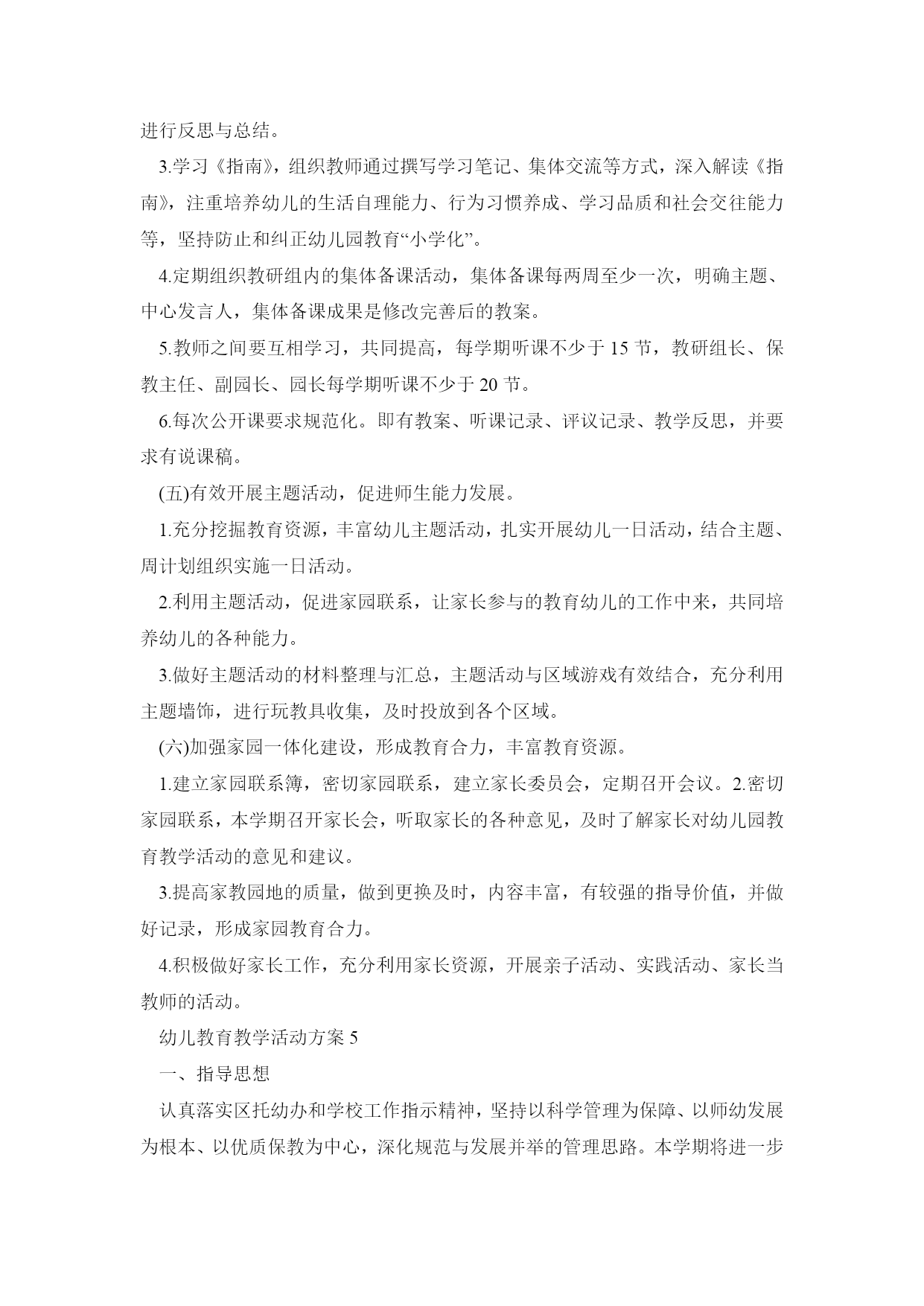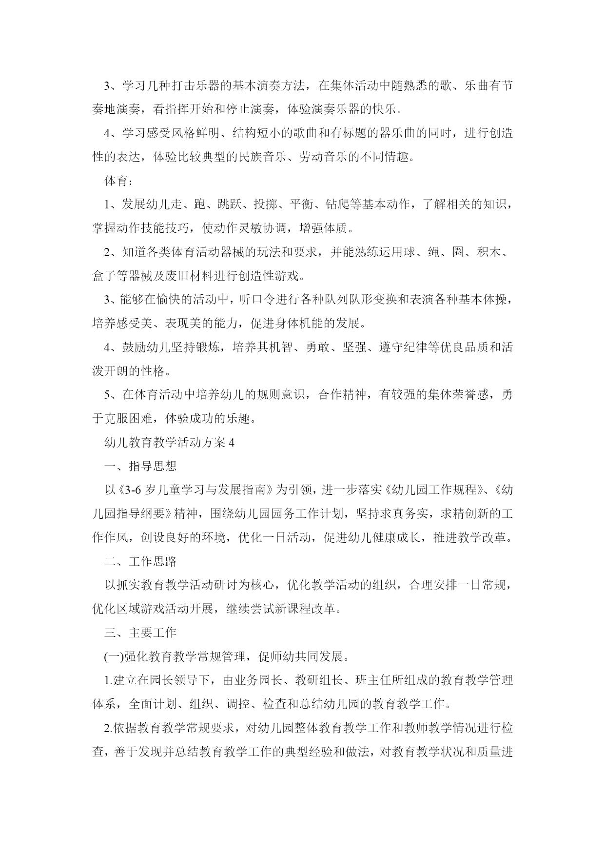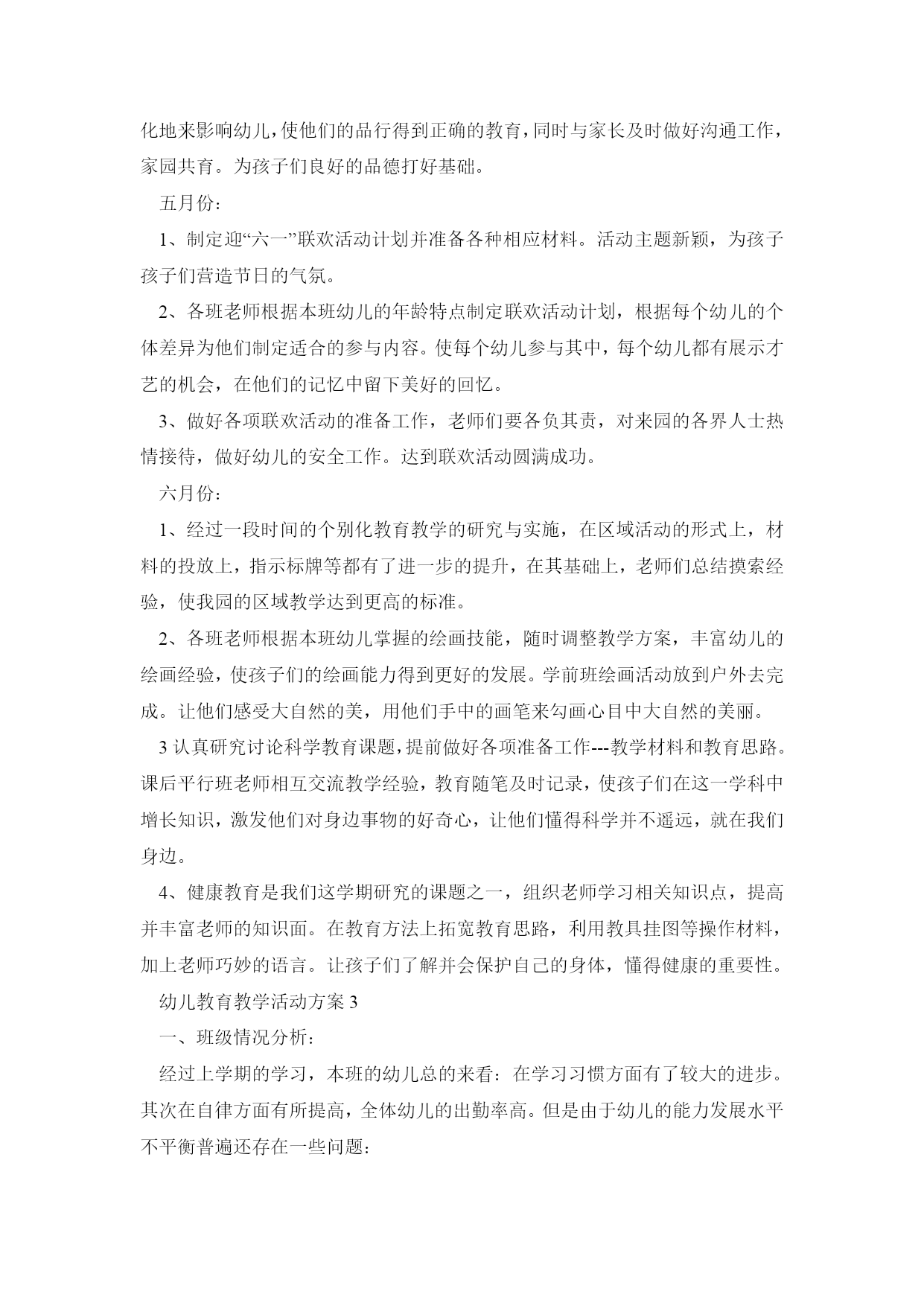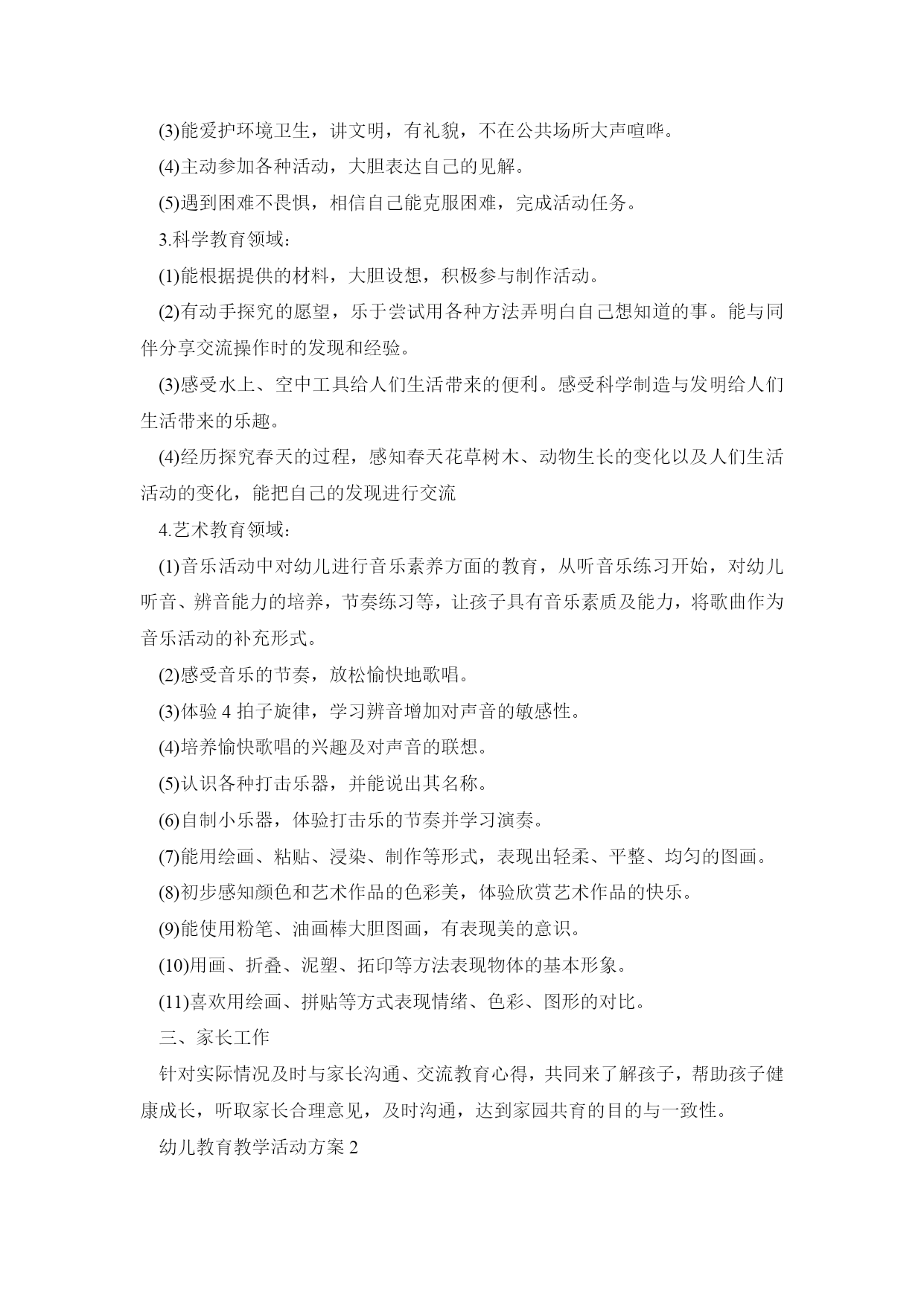 幼儿教育教学活动策划方案五篇幼儿园,原称勘儿园,是几百年前从普鲁士引进的体制。旧称蒙养园、幼稚园,为一种学前教育机构,用于对幼儿集中进行保育和教育,通常接纳三至六周岁的幼儿。以下是小编为大家精心整理的幼儿教育教学活动方案五篇,仅供大家查阅。幼儿教育教学活动方案1一、情况分析:1、我们中班,共有60名幼儿。其中女孩19名,男孩有22名。由于我班幼儿刚从小班升入中班,还需一定的时间适应,因此,在九月要注意常规的培养。冬季即将到来,多进行体育锻炼,增强体质,增加幼儿抗寒抗病能力。2、班内幼儿能基本了解和遵守幼儿园的生活常规,自理能力较强。3、在语言活动方面能坚持讲普通话,在鼓励下愿意试着大胆的讲话,个别孩子语言的交往能力较强,但词汇量不大,用词比较单一。在听别人讲话时,不能耐心的倾听别人的讲话,急于表达自己的意见。对图片的理解和讲述能力还比较薄弱。4、在音乐方面,个别幼儿能够很好地掌握节奏,能富有感情的演唱歌曲,吐字清晰,喜欢节奏感强、内容有趣旋律美的歌曲。能掌握简单的音乐游戏的进行方法。5、喜欢美术活动和动手类的活动,表现的-强。二、我根据班级的实际情况和-儿的年龄特点共同讨论并制定了本学期具有本班特色的教学工作计计划1.数学教育领域:(1)会用默数的方法数数。(2)感知数字6—10与相应物品数量的对应关系。(3)能正确熟练地点数10以内数量的物品。(4)通过实际操作活动,明白物体数量不会因为物体排列空间的大形式的改变而改变。2.社会教育领域:(1)喜欢认识新朋友,能大胆地介绍自己,愿意与同伴共同游戏。(2)爱劳动,爱惜劳动成果。(3)能爱护环境卫生,讲文明,有礼貌,不在公共场所大声喧哗。(4)主动参加各种活动,大胆表达自己的见解。(5)遇到困难不畏惧,相信自己能克服困难,完成活动任务。3.科学教育领域:(1)能根据提供的材料,大胆设想,积极参与制作活动。(2)有动手探究的愿望,乐于尝试用各种方法弄明白自己想知道的事。能与同伴分享交流操作时的发现和经验。(3)感受水上、空中工具给人们生活带来的便利。感受科学制造与发明给人们生活带来的乐趣。(4)经历探究春天的过程,感知春天花草树木、动物生长的变化以及人们生活活动的变化,能把自己的发现进行交流4.艺术教育领域:(1)音乐活动中对幼儿进行音乐素养方面的教育,从听音乐练习开始,对幼儿听音、辨音能力的培养,节奏练习等,让孩子具有音乐素质及能力,将歌曲作为音乐活动的补充形式。(2)感受音乐的节奏,放松愉快地歌唱。(3)体验4拍子旋律,学习辨音增加对声音的敏感性。(4)培养愉快歌唱的兴趣及对声音的联想。(5)认识各种打击乐器,并能说出其名称。(6)自制小乐器,体验打击乐的节奏并学习演奏。(7)能用绘画、粘贴、浸染、制作等形式,表现出轻柔、平整、均匀的图画。(8)初步感知颜色和艺术作品的色彩美,体验欣赏艺术作品的快乐。(9)能使用粉笔、油画棒大胆图画,有表现美的意识。(10)用画、折叠、泥塑、拓印等方法表现物体的基本形象。(11)喜欢用绘画、拼贴等方式表现情绪、色彩、图形的对比。三、家长工作针对实际情况及时与家长沟通、交流教育心得,共同来了解孩子,帮助孩子健康成长,听取家长合理意见,及时沟通,达到家园共育的目的与一致性。幼儿教育教学活动方案2工作思路:依据学前科工作重点和幼儿园自身的发展需求,我园以研究教学为基本思路,以《幼儿园指导纲要》精神为指导,加强学习和研究,不断更新教育观念,转变教育行为,提升老师业务素质。提高老师教育教学反思能力,提高我园教育质量。工作重点:1、在上学期区域活动进展的基础上继续完善,努力将个别化教学达到先进的教学标准。2、抓好老师思想道德,教学质量的工作,为老师们提供多种平台学习锻炼的机会,进一步加强师资队伍的建设,不断提高老师育人能力和水平。3、对新形势的课题研究。教研组在教学活动中遇到的难题展开讨论。4、做好儿童节的各项准备工作,使幼儿对自己的节日有个永久的美好回忆。5、科学教育和健康教育活动列入探索研究课题。具体工作:三月份1、新学期开始各项工作认真完成。2、区域活动在上学期的基础上进一步提高,操作材料,活动内容,活动形式,标牌等达到一个新的标准。3、根据教学改革的需要,制定适合我园现状的教学方案及调整课程。4、认真做好各项教育资料的书写工作。5、教研活动组及时研究讨论在教学中出现的难点。四月份:1、随着季节的变化,主题活动围绕着春天来创设活动内容,让孩子们感受春天的美,歌唱春天,描绘春天,到大自然中去寻找春天。2、天气逐渐转暖,孩子们的户外活动
