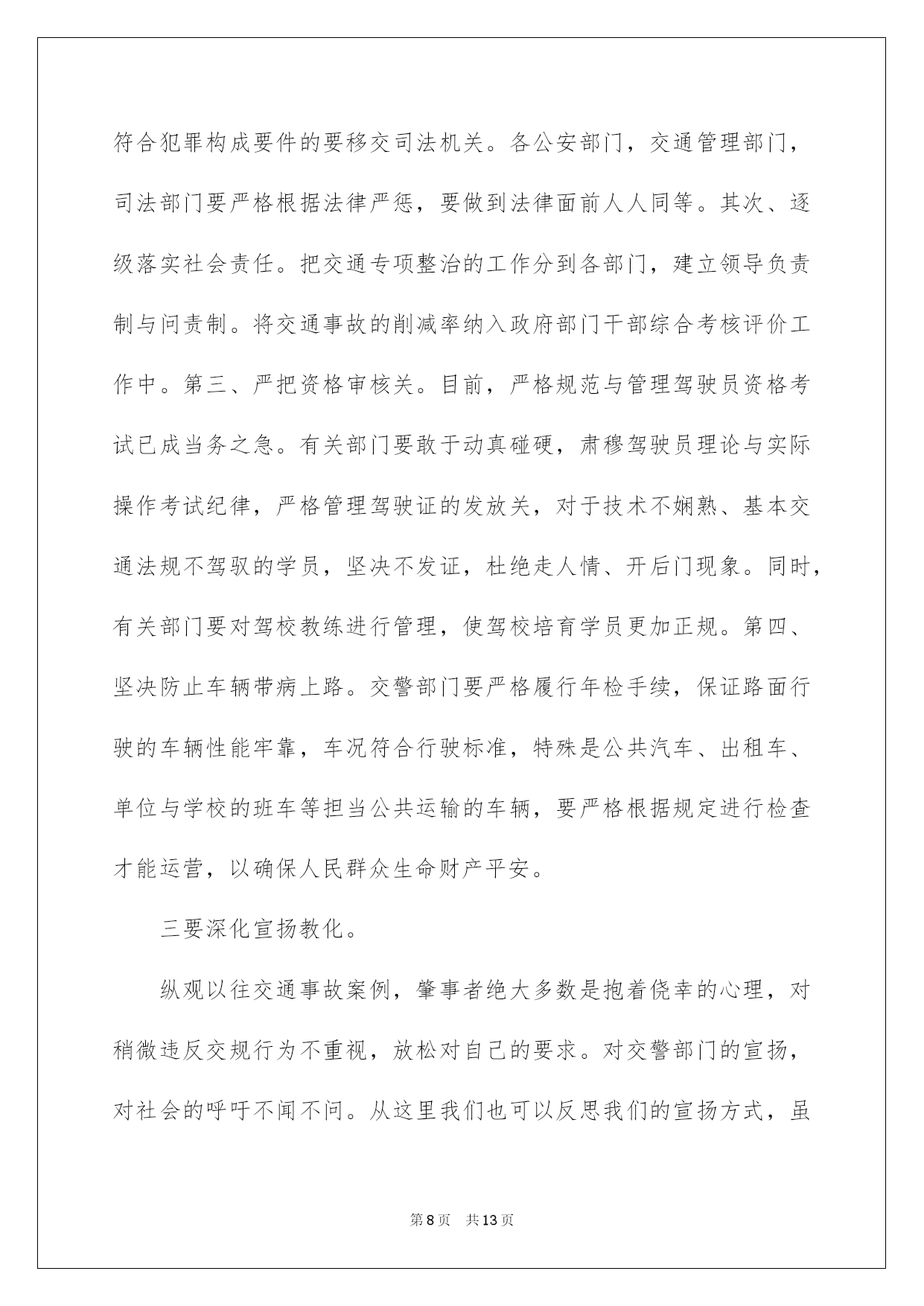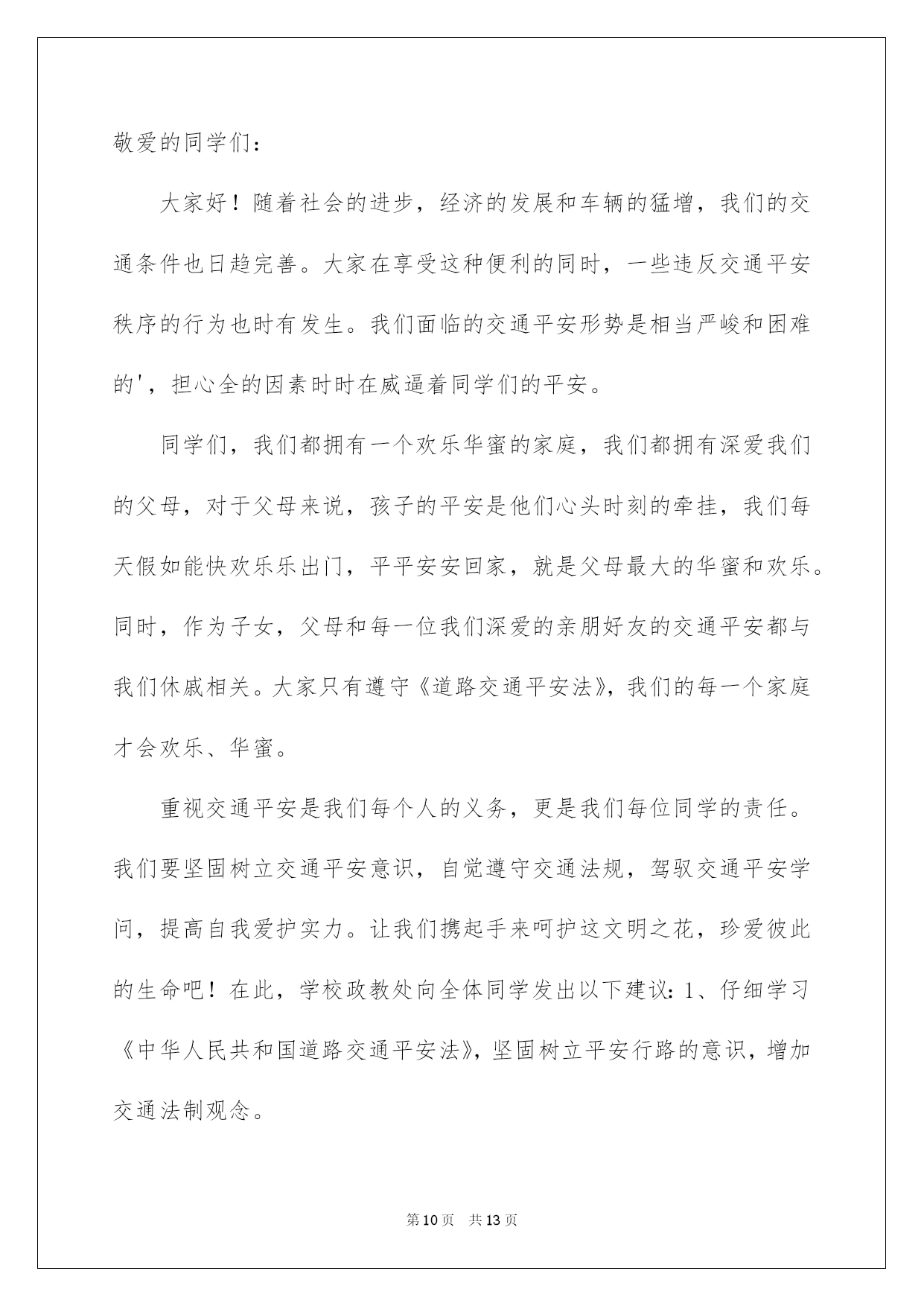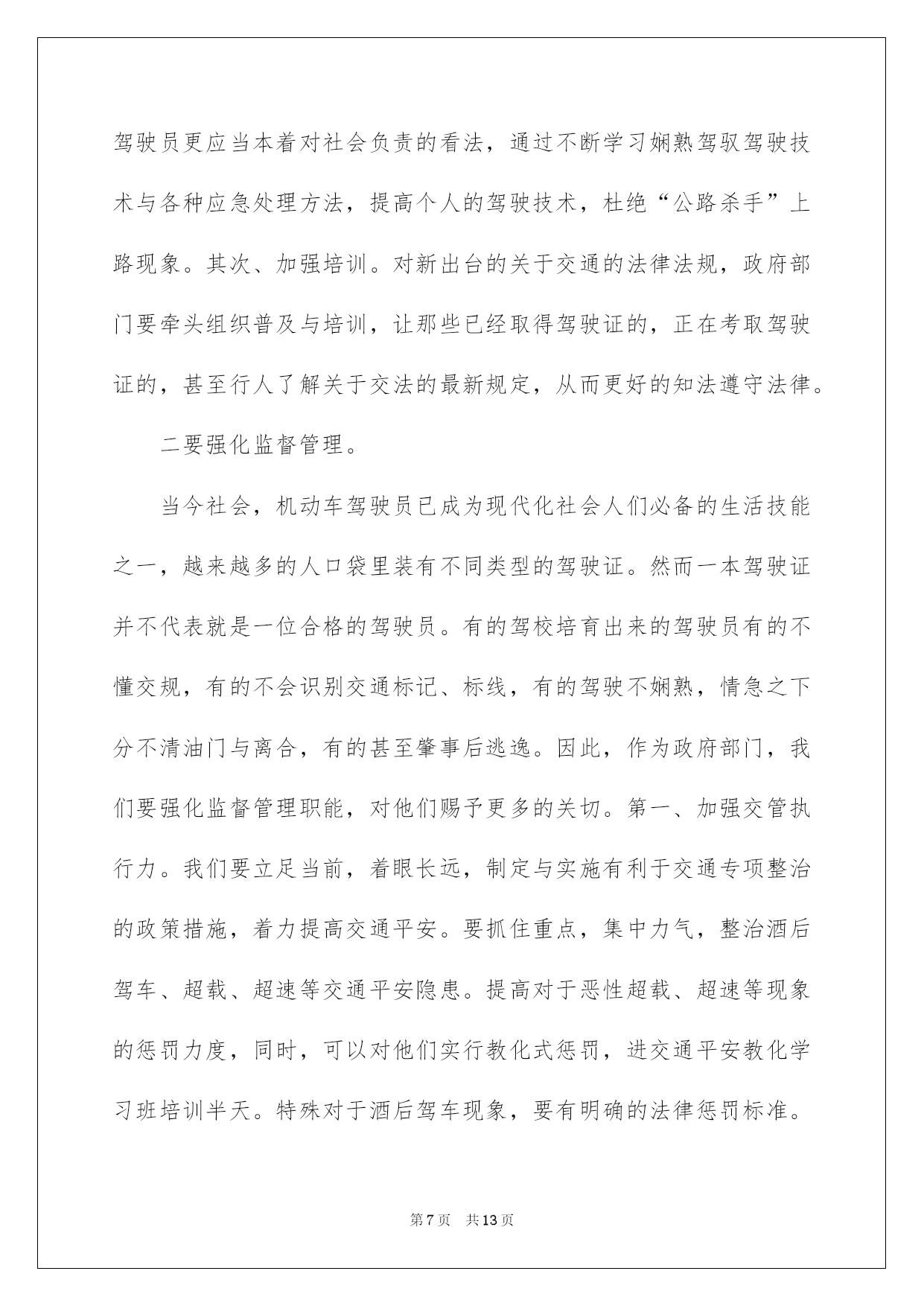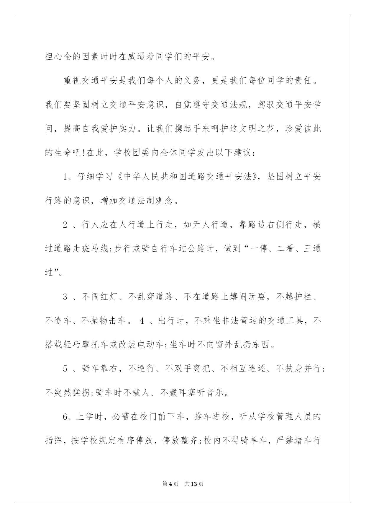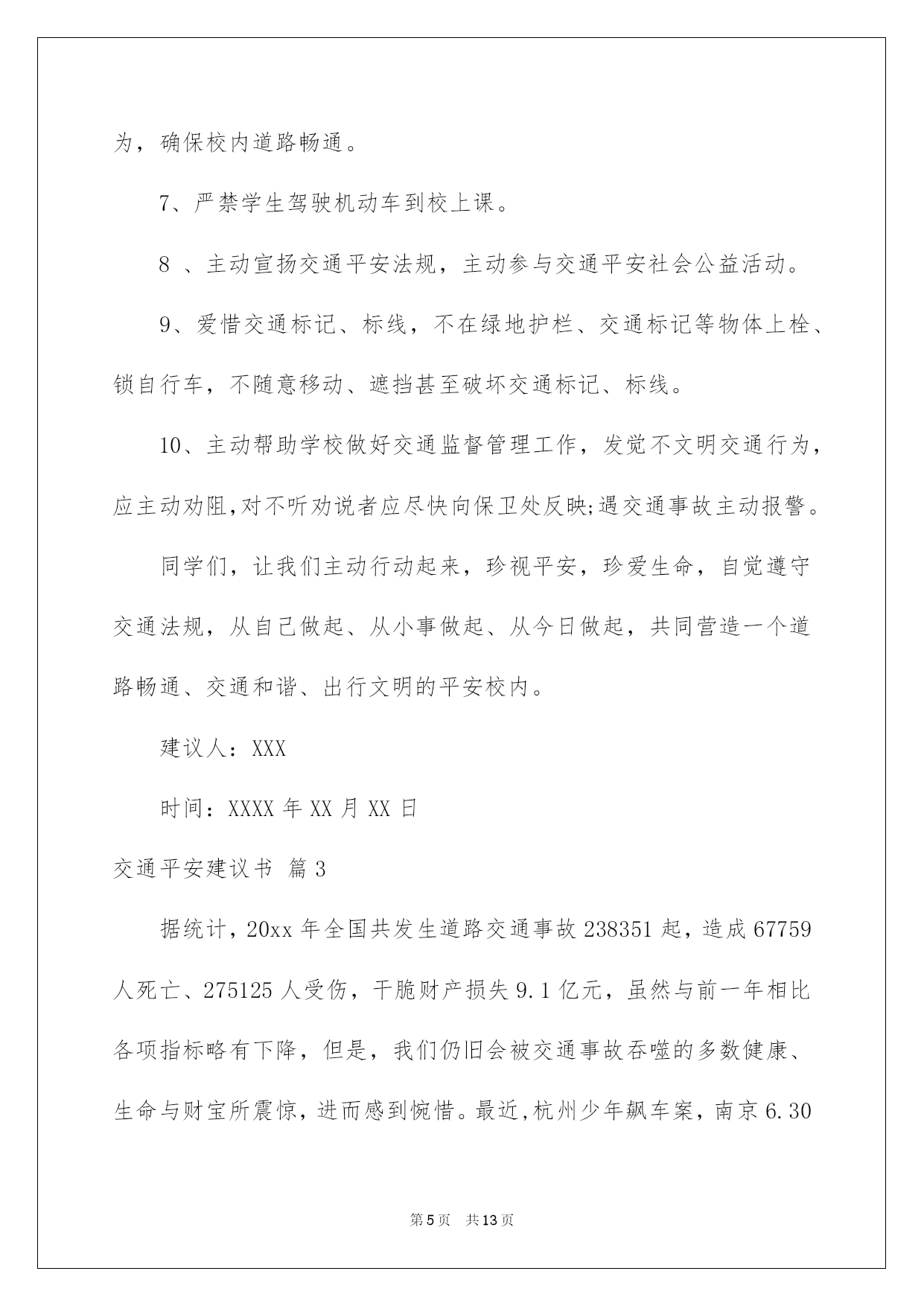 第PAGE\*Arabic\*MERGEFORMAT13页共NUMPAGES\*Arabic\*MERGEFORMAT13页第PAGE\*MERGEFORMAT13页共NUMPAGES\*MERGEFORMAT13页第PAGE\*MERGEFORMAT13页共NUMPAGES\*MERGEFORMAT13页第PAGE\*MERGEFORMAT13页共NUMPAGES\*MERGEFORMAT13页第PAGE\*MERGEFORMAT13页共NUMPAGES\*MERGEFORMAT13页第PAGE\*MERGEFORMAT13页共NUMPAGES\*MERGEFORMAT13页第PAGE\*MERGEFORMAT13页共NUMPAGES\*MERGEFORMAT13页第PAGE\*MERGEFORMAT13页共NUMPAGES\*MERGEFORMAT13页第PAGE\*MERGEFORMAT13页共NUMPAGES\*MERGEFORMAT13页第PAGE\*MERGEFORMAT13页共NUMPAGES\*MERGEFORMAT13页第PAGE\*MERGEFORMAT13页共NUMPAGES\*MERGEFORMAT13页2022交通安全建议书交通平安建议书集合5篇在快速改变和不断变革的新时代,我们须要用到建议书的情形越来越多,运用正确的写作思路书写建议书会更加事半功倍。信任许多挚友都对写建议书感到特别苦恼吧,下面是我帮大家整理的交通平安建议书5篇,希望能够帮助到大家。交通平安建议书篇1同学们:20_年全国共发生交通平安事故378781起,造成89455人死亡,其中有近3万名儿童在交通事故中受伤。在我们身边的因超载、超速、违规驾驶造成人员伤亡的事故也时有发生,这一切都是血的教训,给受害者及家庭造成了永久的损害,也给我们敲响了警钟。俗话说:“没有规则不成方圆”。遵守交通规则是我们应尽的责任和义务。在社会高速发展、交通面貌日新月异、交通路网四通八达、交通车辆络绎不绝的今日,道路交通平安对于我们每个人来说尤为重要。为了增加同学们的交通平安意识、交通法制意识、交通文明意识和自我爱护实力,共同营造文明、和谐的交通环境,为了你我的生命平安,慎重地向全体同学提出以下几点建议:一、仔细学习、宣扬和自觉遵守交通平安法律法规,增加社会公德意识和交通平安意识,树立文明交通新风。自觉遵守交通信号、交通标记、交通标线,听从交通警察的指挥;通过路口要遵守“红灯停、绿灯行”。二、文明走路。必需在人行道行走,没有人行道的靠路右边行走。不闯红灯,不三五成群并肩走,不贪图便利翻越、钻跨交通隔离护栏,不在公路上追逐打闹游戏,不在公路上运用划板,旱冰鞋,不要穿越、倚坐在公路边的护栏、花台上;在路口不要急拐猛跑;不准在道路上扒车、追车、强行拦车和抛物击车。三、文明骑车。未满12周岁的不准骑自行车;未满16周岁的不准骑电动车。做到不闯红灯,不走快车道,不扶身并行、猛拐、相互追逐;不牵引、攀扶车辆,不双手离把;骑自行车横过机动车道时,应下车推行;不骑车带人,不违章载物;不打伞骑车;步行或骑自行车过公路时要做到“一停、二看、三通过”。要确保自行车闸、铃、锁、牌齐全有效,要在划有停车区域停放车辆,不乱停、乱放。四、不得乘坐无牌无证车辆和黑车;不得乘坐超员超载车辆和病车;严禁乘坐二轮、三轮摩托和未取得运营资格的车辆;严禁中小学生驾驶机动车;严禁学生家长用摩托车接送学生;提高学生交通意识,增加学生平安意识。五、做文明交通的宣扬者和实践者,劝说你的家人、亲戚也要遵守交通规则,珍爱自己和他人的生命。同学们,平平安安出门,快欢乐乐回家。交通平安进万家,华蜜全靠你我他。学习和遵守交通平安法律法规是我们义不容辞的义务和责任,让我们从自己做起,从现在做起,自觉养成文明交通的良好习惯,为创建平安、畅通、有序的交通环境作出我们应有的贡献!建议人:_X时间:__年_月_日交通平安建议书篇2敬爱的同学们:大家好!随着社会的进步,经济的发展和车辆的猛增,我们的交通条件也日趋完善。大家在享受这种便利的同时,一些违反交通平安秩序的行为也时有发生。我们面临的交通平安形势是相当严峻和困难的,担心全的因素时时在威逼着同学们的平安。重视交通平安是我们每个人的义务,更是我们每位同学的责任。我们要坚固树立交通平安意识,自觉遵守交通法规,驾驭交通平安学问,提高自我爱护实力。让我们携起手来呵护这文明之花,珍爱彼此的生命吧!在此,学校团委向全体同学发出以下建议:1、仔细学习《中华人民共和国道路交通平安法》,坚固树立平安行路的意识,增加交通法制观念。2、行人应在人