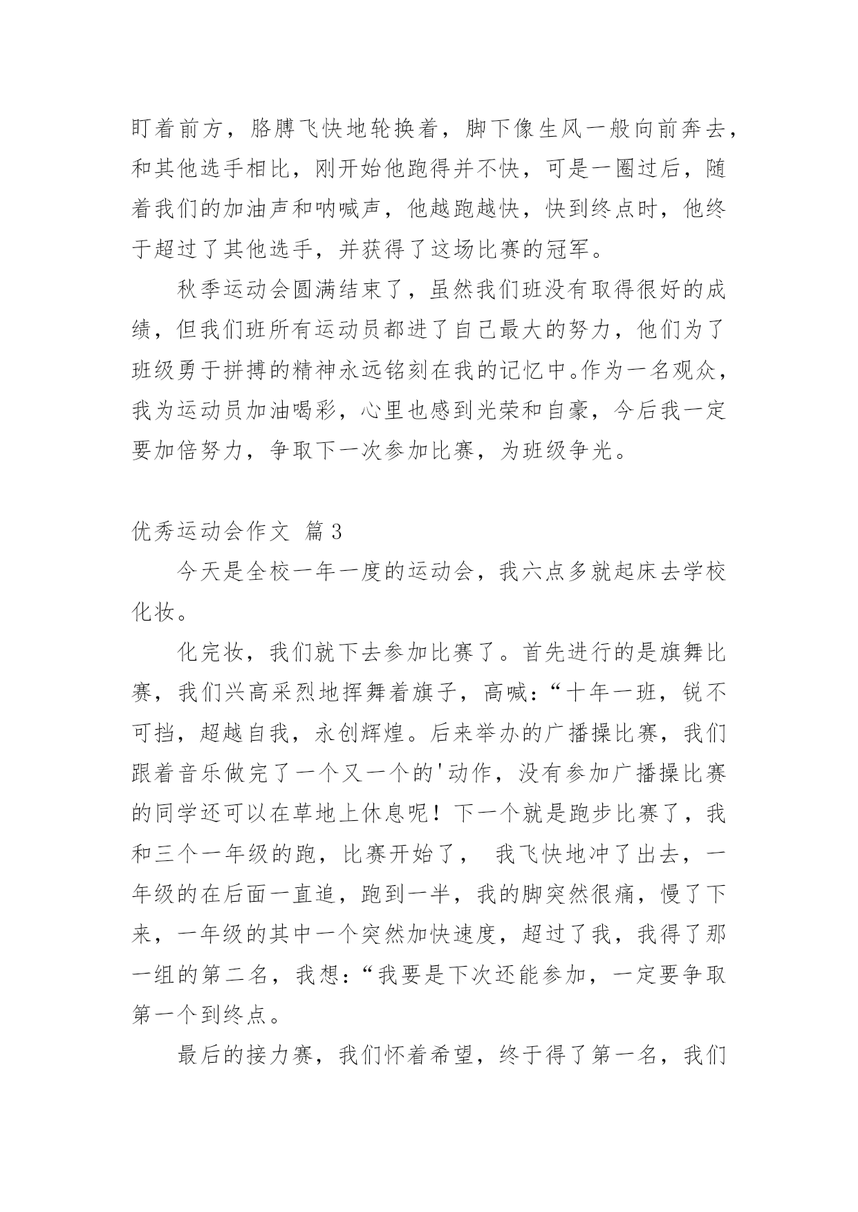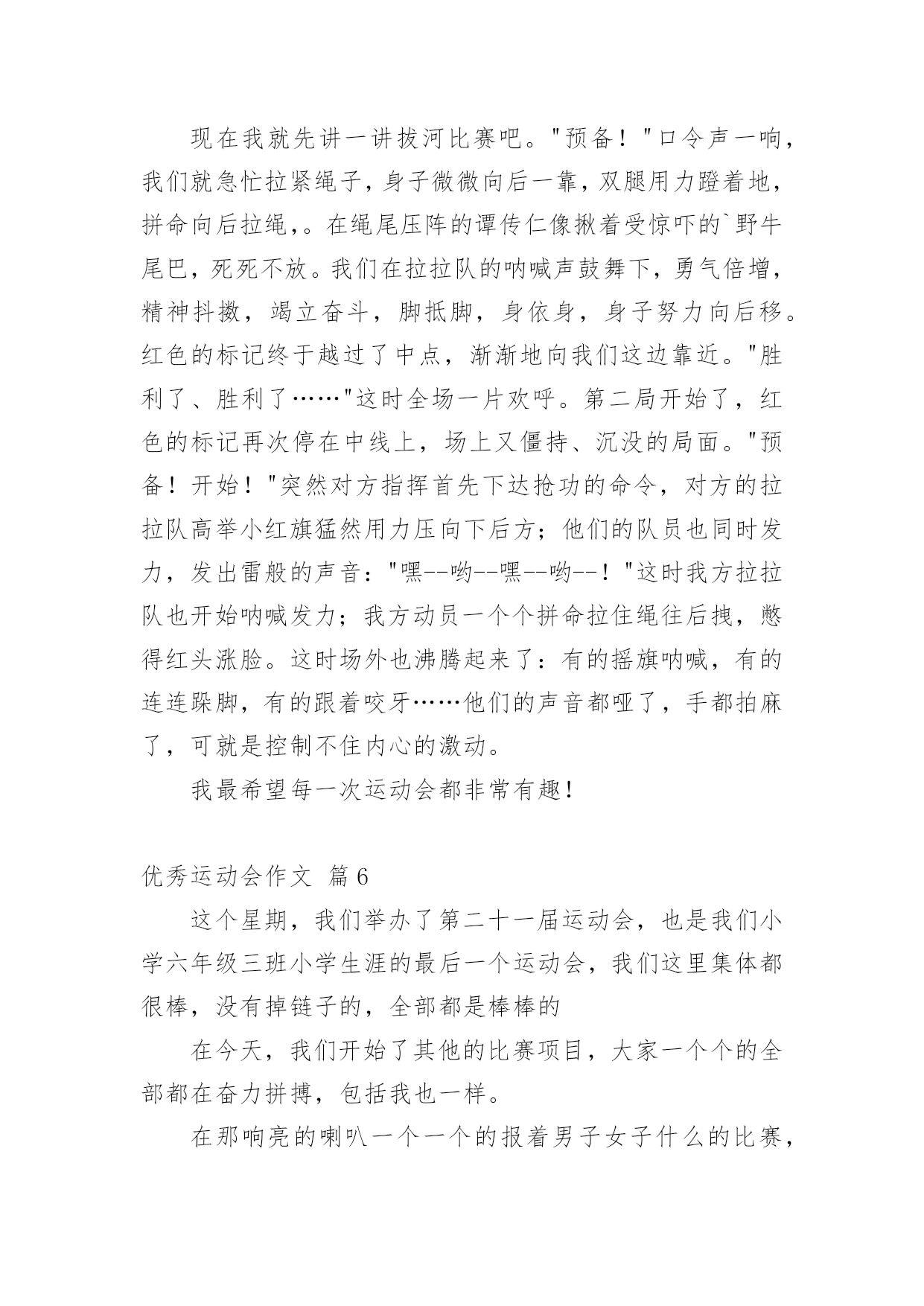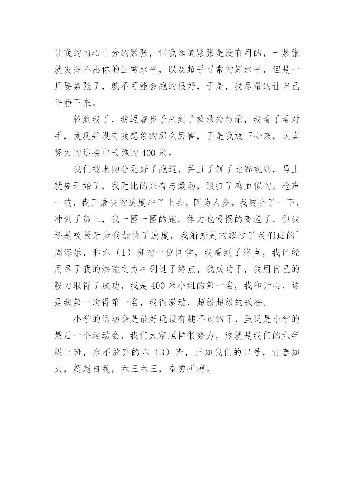 优秀运动会作文[精品]优秀运动会作文无论是在学校还是在社会中,大家都接触过作文吧,作文是人们把记忆中所存储的有关知识、经验和思想用书面形式表达出来的记叙方式。你知道作文怎样才能写的好吗?下面是小编帮大家整理的优秀运动会作文6篇,欢迎阅读与收藏。优秀运动会作文篇1在我记忆中的运动会,最清楚的是四年级,我带领着全班的队列队形运动会,但是最难忘的……,呵呵,已经过去很长时间了……记不清那时我几岁,上几年级,也不了解是怎么开幕的,此刻,我的脑瓜里不停的闪烁着,我奔跑的场面,还有冲刺到终点的笑容。农村的教学虽然不抵城市的质量好,可是,场地却是要多打就有多大,校长又发神经似的,把学校后面的一大片土地开发出来、修饰,先是黑乎乎的柏油路,然后成了水泥地,最后呗整成了一个环形跑道,上面没有正规的红色橡胶,只是灰平平的,大操场建成后,同学们每天下课都往那跑,比赛谁跑的更快,校长好像是突然终点了什么,广播要召开运动会,运动会?农村的孩子可是对这仨字不明白,在校长细心解说下,我们才恍然大悟,异口同声的说道:“原来是跑步啊”大家个个都特别兴奋,我也怀着激动的心情,迎接,所谓的运动会……“张杰加油,张杰加油”为了给我增气,好朋友们嘶力的呐喊着,而我满头大汗的以心只想超越,前面那几个傻大个,我奋力的跑啊跑,终于超过了一个,这下我更起劲了,加油再越一个,可能是开跑的前段用的力气太大了,现在没多少力气了,始终都赶不上,觉得要倒下去了,当我再次抬起头时,发现冠军产生了,“不行,一定要过终点”我不断鼓励着自己,呼,总算到了吧“完了吧”,我过喽,心里那个激动啊,用剩下的力气费力的.仰天长笑,感觉笑跟哭似的,同学们一并向我拥来,我的眼睛舒服的合起来了!我清醒过来的时候,教师说,我得了第三名,之后的话,全部忘记了。这些短暂、简单的故事,我真是觉得可气,可笑,难道我当时的身体那么弱么?呵呵……。我继续想着,回忆着,试图能在勾起点什么,凌乱的,破碎的记忆……优秀运动会作文篇2怀着着期盼地心情,我们又迎来了一年一度的秋季运动会。隆重的开幕式开始了,伴随着欢快的《运动员进行曲》,全体运动员们迈着整齐的步伐走到了操场中间。校长在主席台上致了开幕词,激动人心的比赛开始了。首先,运动会的第一个项目就是60米跑,一二年级的小同学都以自己最快的速度跑步,轮到我们三年级了,我们鼓起信心,不论谁上场参加比赛,我们班的拉拉队都为他们呐喊助威。为了我们的班级荣誉,为了给班级争光,发炮声一响,他们就像离玄的箭一样冲了出去,场上的运动员都在全神贯注、奋勇争先。我们台下的拉拉队也没有闲着,邢老师和我们这些拉拉队队员都在一起喊,加油,加油啊,坚持就是胜利!一天的比赛结束了,有成功的喜悦,也有失败的失落。尽管我们大家都很努力,很认真的对待了这个比赛,可比赛毕竟总会有输赢,有第一就会有末了。只要你参与了、付出了努力,你就不是失败者。你就值得别人学习。秋季运动会有感3一年一度的秋季运动会来临了,这不,前几天老师还让运动员练跳大绳呢!今天,秋季运动会如期举行,我们搬着板凳在操场北边的凉亭旁刚坐下,这时,主席台上宣布:秋季运动会正式开始。我们高兴地欢呼起来,比赛开始了,项目有:跳高、跳远、赛跑、跳大绳、实心球。我们班所有的项目都参加了,中午时分,虽然炽热的太阳暴晒着我们,但是我们都乐意为班里的同学加油喝彩,上午的比赛,我们班的成绩不太理想,只有三项取得了名次,其中齐逸凡进入了200米决赛。我们班所有同学都期待着他能在决赛中取得优异的`成绩。终于轮到他上场了,只听裁判员高喊:“各就位!预备——啪!”只听发令枪一响,选手们像离弦的箭一样飞了出去,我们都密切关注着齐逸凡,只见他脸涨得通红,两眼直盯着前方,胳膊飞快地轮换着,脚下像生风一般向前奔去,和其他选手相比,刚开始他跑得并不快,可是一圈过后,随着我们的加油声和呐喊声,他越跑越快,快到终点时,他终于超过了其他选手,并获得了这场比赛的冠军。秋季运动会圆满结束了,虽然我们班没有取得很好的成绩,但我们班所有运动员都进了自己最大的努力,他们为了班级勇于拼搏的精神永远铭刻在我的记忆中。作为一名观众,我为运动员加油喝彩,心里也感到光荣和自豪,今后我一定要加倍努力,争取下一次参加比赛,为班级争光。优秀运动会作文篇3今天是全校一年一度的运动会,我六点多就起床去学校化妆。化完妆,我们就下去参加比赛了。首先进行的是旗舞比赛,我们兴高采烈地挥舞着旗子,高喊:“十年一班,锐不可挡,超越自我,永创辉煌。后来举办的广播操比赛,我们跟着音乐做完了一个又一个的'动作,没有参加广播操比赛的同学还可以在草地上休息呢!下一个就是跑步比赛了,我和三个一年级的跑,比赛开始了,我飞快地冲了出去,一年级的在后面一直追,跑到一半,我的脚突然很痛,慢了下来,一年级的其中一个突然加快速度,超过了我,我得了那一组的第