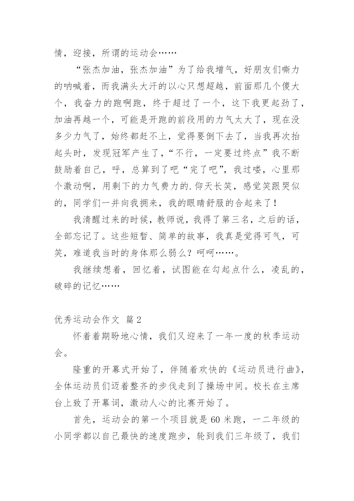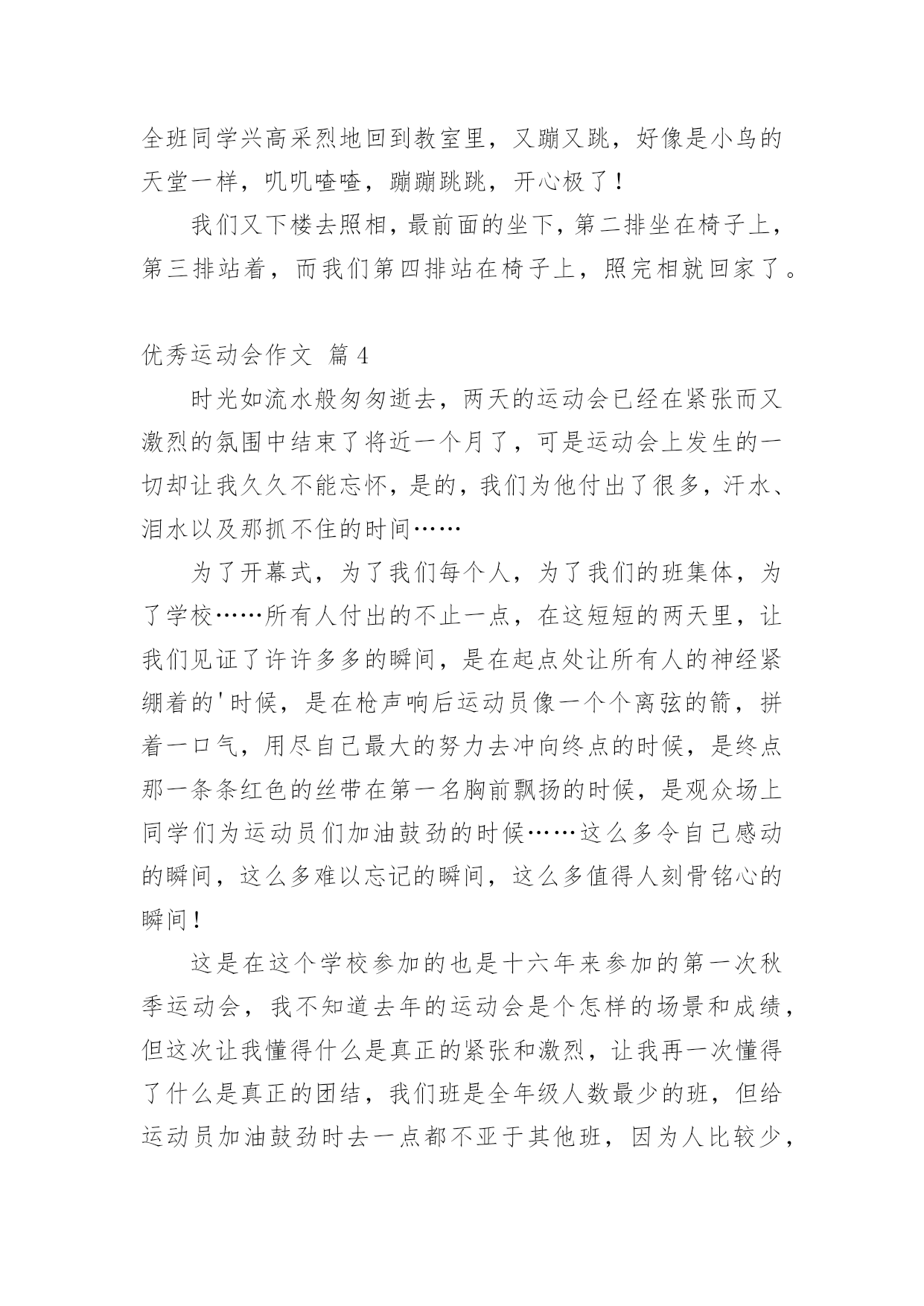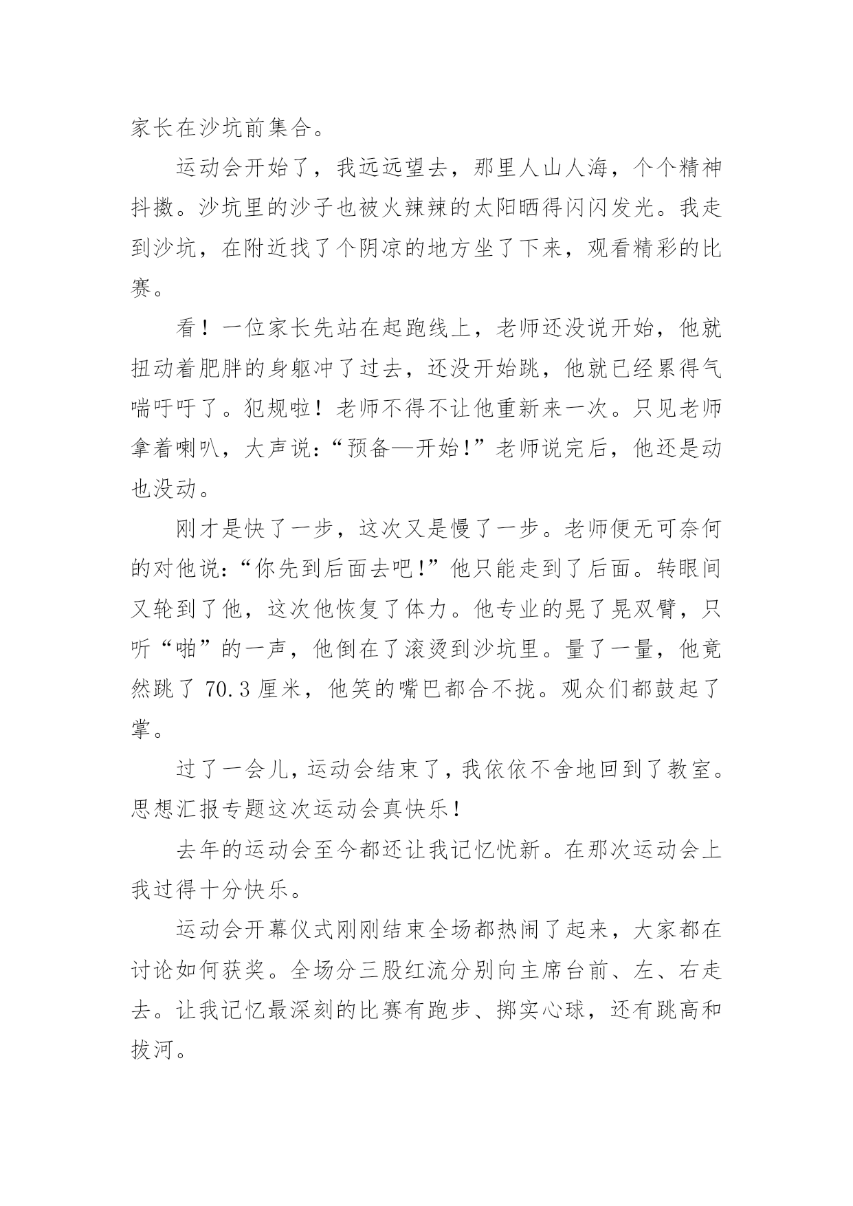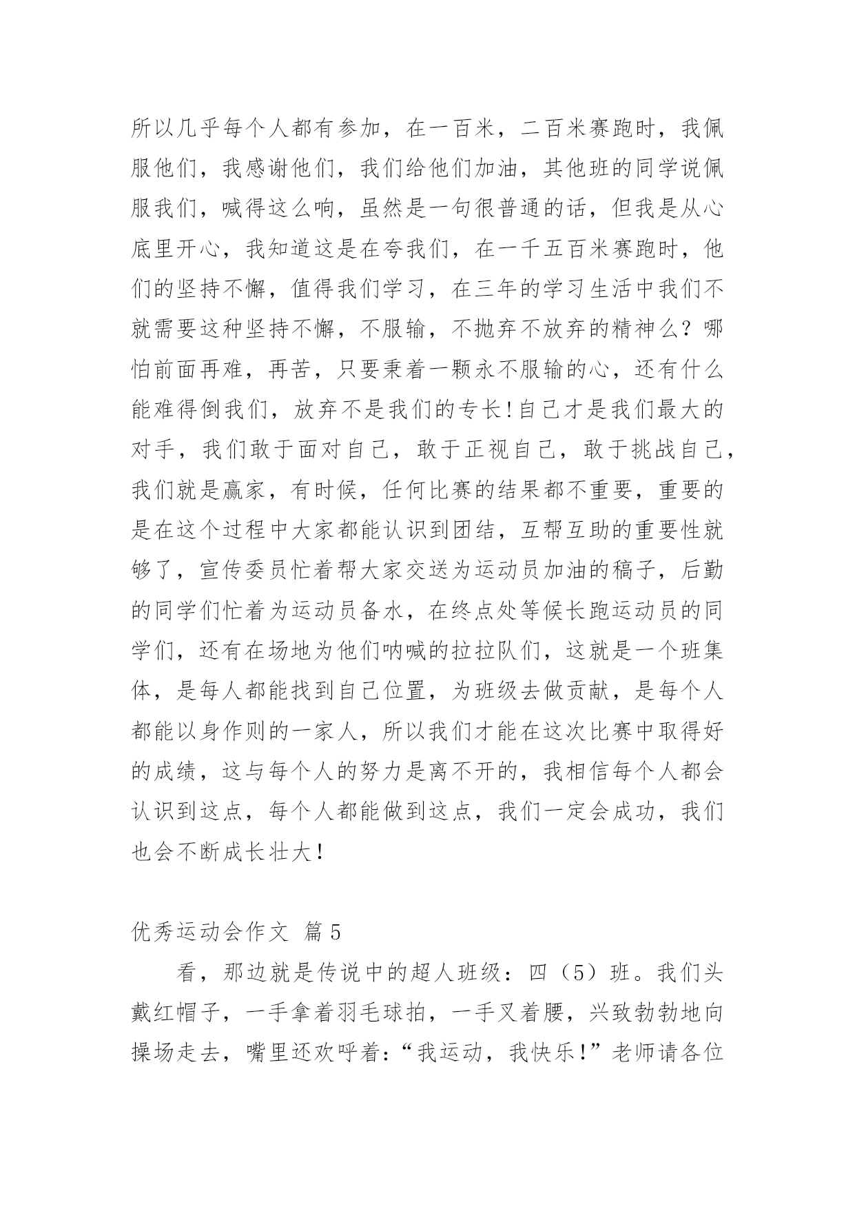 优秀运动会作文[精品]优秀运动会作文无论是在学校还是在社会中,大家都接触过作文吧,作文是人们把记忆中所存储的有关知识、经验和思想用书面形式表达出来的记叙方式。你知道作文怎样才能写的好吗?下面是小编帮大家整理的优秀运动会作文6篇,欢迎阅读与收藏。优秀运动会作文篇1在我记忆中的运动会,最清楚的是四年级,我带领着全班的队列队形运动会,但是最难忘的……,呵呵,已经过去很长时间了……记不清那时我几岁,上几年级,也不了解是怎么开幕的,此刻,我的脑瓜里不停的闪烁着,我奔跑的场面,还有冲刺到终点的笑容。农村的教学虽然不抵城市的质量好,可是,场地却是要多打就有多大,校长又发神经似的,把学校后面的一大片土地开发出来、修饰,先是黑乎乎的柏油路,然后成了水泥地,最后呗整成了一个环形跑道,上面没有正规的红色橡胶,只是灰平平的,大操场建成后,同学们每天下课都往那跑,比赛谁跑的更快,校长好像是突然终点了什么,广播要召开运动会,运动会?农村的孩子可是对这仨字不明白,在校长细心解说下,我们才恍然大悟,异口同声的说道:“原来是跑步啊”大家个个都特别兴奋,我也怀着激动的心情,迎接,所谓的运动会……“张杰加油,张杰加油”为了给我增气,好朋友们嘶力的呐喊着,而我满头大汗的以心只想超越,前面那几个傻大个,我奋力的跑啊跑,终于超过了一个,这下我更起劲了,加油再越一个,可能是开跑的前段用的力气太大了,现在没多少力气了,始终都赶不上,觉得要倒下去了,当我再次抬起头时,发现冠军产生了,“不行,一定要过终点”我不断鼓励着自己,呼,总算到了吧“完了吧”,我过喽,心里那个激动啊,用剩下的力气费力的.仰天长笑,感觉笑跟哭似的,同学们一并向我拥来,我的眼睛舒服的合起来了!我清醒过来的时候,教师说,我得了第三名,之后的话,全部忘记了。这些短暂、简单的故事,我真是觉得可气,可笑,难道我当时的身体那么弱么?呵呵……。我继续想着,回忆着,试图能在勾起点什么,凌乱的,破碎的记忆……优秀运动会作文篇2怀着着期盼地心情,我们又迎来了一年一度的秋季运动会。隆重的开幕式开始了,伴随着欢快的《运动员进行曲》,全体运动员们迈着整齐的步伐走到了操场中间。校长在主席台上致了开幕词,激动人心的比赛开始了。首先,运动会的第一个项目就是60米跑,一二年级的小同学都以自己最快的速度跑步,轮到我们三年级了,我们鼓起信心,不论谁上场参加比赛,我们班的拉拉队都为他们呐喊助威。为了我们的班级荣誉,为了给班级争光,发炮声一响,他们就像离玄的箭一样冲了出去,场上的运动员都在全神贯注、奋勇争先。我们台下的拉拉队也没有闲着,邢老师和我们这些拉拉队队员都在一起喊,加油,加油啊,坚持就是胜利!一天的比赛结束了,有成功的喜悦,也有失败的失落。尽管我们大家都很努力,很认真的对待了这个比赛,可比赛毕竟总会有输赢,有第一就会有末了。只要你参与了、付出了努力,你就不是失败者。你就值得别人学习。秋季运动会有感3一年一度的秋季运动会来临了,这不,前几天老师还让运动员练跳大绳呢!今天,秋季运动会如期举行,我们搬着板凳在操场北边的凉亭旁刚坐下,这时,主席台上宣布:秋季运动会正式开始。我们高兴地欢呼起来,比赛开始了,项目有:跳高、跳远、赛跑、跳大绳、实心球。我们班所有的项目都参加了,中午时分,虽然炽热的太阳暴晒着我们,但是我们都乐意为班里的同学加油喝彩,上午的比赛,我们班的成绩不太理想,只有三项取得了名次,其中齐逸凡进入了200米决赛。我们班所有同学都期待着他能在决赛中取得优异的`成绩。终于轮到他上场了,只听裁判员高喊:“各就位!预备——啪!”只听发令枪一响,选手们像离弦的箭一样飞了出去,我们都密切关注着齐逸凡,只见他脸涨得通红,两眼直盯着前方,胳膊飞快地轮换着,脚下像生风一般向前奔去,和其他选手相比,刚开始他跑得并不快,可是一圈过后,随着我们的加油声和呐喊声,他越跑越快,快到终点时,他终于超过了其他选手,并获得了这场比赛的冠军。秋季运动会圆满结束了,虽然我们班没有取得很好的成绩,但我们班所有运动员都进了自己最大的努力,他们为了班级勇于拼搏的精神永远铭刻在我的记忆中。作为一名观众,我为运动员加油喝彩,心里也感到光荣和自豪,今后我一定要加倍努力,争取下一次参加比赛,为班级争光。优秀运动会作文篇3今天是全校一年一度的运动会,我六点多就起床去学校化妆。化完妆,我们就下去参加比赛了。首先进行的是旗舞比赛,我们兴高采烈地挥舞着旗子,高喊:“十年一班,锐不可挡,超越自我,永创辉煌。后来举办的广播操比赛,我们跟着音乐做完了一个又一个的'动作,没有参加广播操比赛的同学还可以在草地上休息呢!下一个就是跑步比赛了,我和三个一年级的跑,比赛开始了,我飞快地冲了出去,一年级的在后面一直追,跑到一半,我的脚突然很痛,慢了下来,一年级的其中一个突然加快速度,超过了我,我得了那一组的第