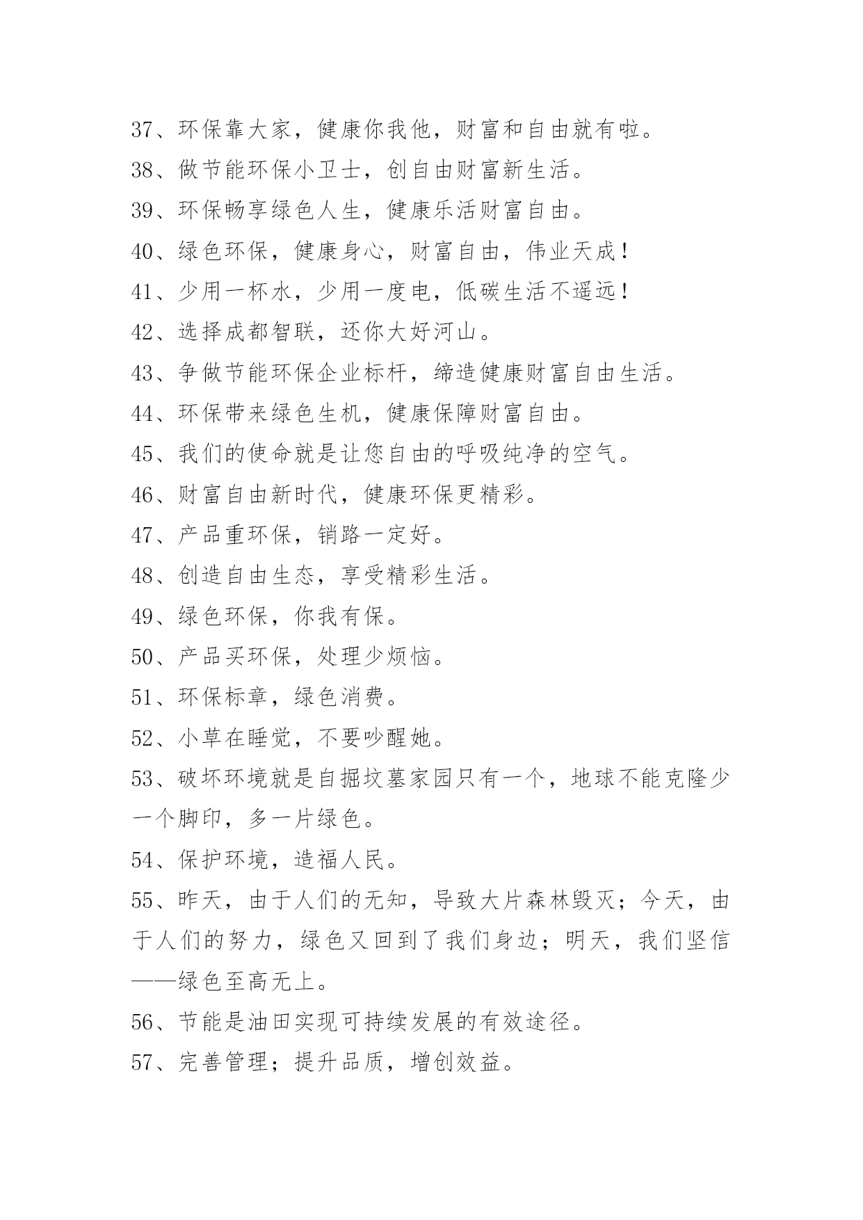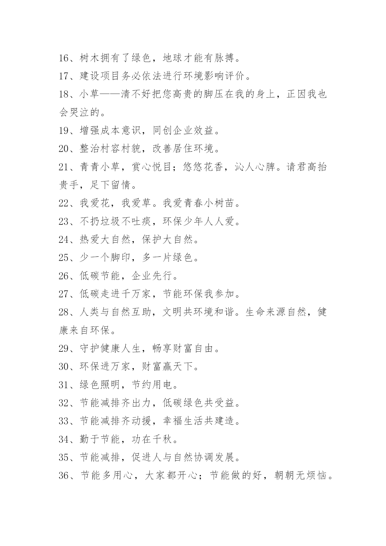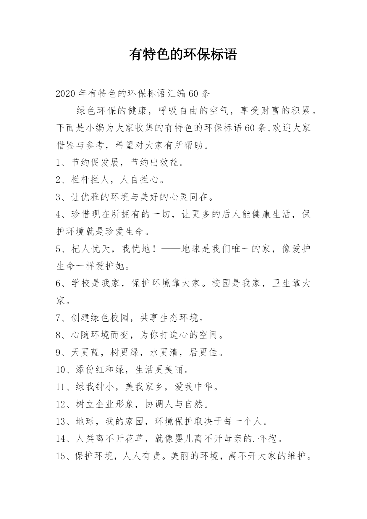 有特色的环保标语2020年有特色的环保标语汇编60条绿色环保的健康,呼吸自由的空气,享受财富的积累。下面是小编为大家收集的有特色的环保标语60条,欢迎大家借鉴与参考,希望对大家有所帮助。1、节约促发展,节约出效益。2、栏杆拦人,人自拦心。3、让优雅的环境与美好的心灵同在。4、珍惜现在所拥有的一切,让更多的后人能健康生活,保护环境就是珍爱生命。5、杞人忧天,我忧地!——地球是我们唯一的家,像爱护生命一样爱护她。6、学校是我家,保护环境靠大家。校园是我家,卫生靠大家。7、创建绿色校园,共享生态环境。8、心随环境而变,为你打造心的空间。9、天更蓝,树更绿,水更清,居更佳。10、添份红和绿,生活更美丽。11、绿我钟小,美我家乡,爱我中华。12、树立企业形象,协调人与自然。13、地球,我的家园,环境保护取决于每一个人。14、人类离不开花草,就像婴儿离不开母亲的.怀抱。15、保护环境,人人有责。美丽的环境,离不开大家的维护。16、树木拥有了绿色,地球才能有脉搏。17、建设项目务必依法进行环境影响评价。18、小草——清不好把您高贵的脚压在我的身上,正因我也会哭泣的。19、增强成本意识,同创企业效益。20、整治村容村貌,改善居住环境。21、青青小草,赏心悦目;悠悠花香,沁人心脾。请君高抬贵手,足下留情。22、我爱花,我爱草。我爱青春小树苗。23、不扔垃圾不吐痰,环保少年人人爱。24、热爱大自然,保护大自然。25、少一个脚印,多一片绿色。26、低碳节能,企业先行。27、低碳走进千万家,节能环保我参加。28、人类与自然互助,文明共环境和谐。生命来源自然,健康来自环保。29、守护健康人生,畅享财富自由。30、环保进万家,财富赢天下。31、绿色照明,节约用电。32、节能减排齐出力,低碳绿色共受益。33、节能减排齐动援,幸福生活共建造。34、勤于节能,功在千秋。35、节能减排,促进人与自然协调发展。36、节能多用心,大家都开心;节能做的好,朝朝无烦恼。37、环保靠大家,健康你我他,财富和自由就有啦。38、做节能环保小卫士,创自由财富新生活。39、环保畅享绿色人生,健康乐活财富自由。40、绿色环保,健康身心,财富自由,伟业天成!41、少用一杯水,少用一度电,低碳生活不遥远!42、选择成都智联,还你大好河山。43、争做节能环保企业标杆,缔造健康财富自由生活。44、环保带来绿色生机,健康保障财富自由。45、我们的使命就是让您自由的呼吸纯净的空气。46、财富自由新时代,健康环保更精彩。47、产品重环保,销路一定好。48、创造自由生态,享受精彩生活。49、绿色环保,你我有保。50、产品买环保,处理少烦恼。51、环保标章,绿色消费。52、小草在睡觉,不要吵醒她。53、破坏环境就是自掘坟墓家园只有一个,地球不能克隆少一个脚印,多一片绿色。54、保护环境,造福人民。55、昨天,由于人们的无知,导致大片森林毁灭;今天,由于人们的努力,绿色又回到了我们身边;明天,我们坚信——绿色至高无上。56、节能是油田实现可持续发展的有效途径。57、完善管理;提升品质,增创效益。58、发展绿色产业,共圆生态梦想。59、绿水天长(地久天长),诚信力皇。60、节能做得好,朝朝无烦恼。