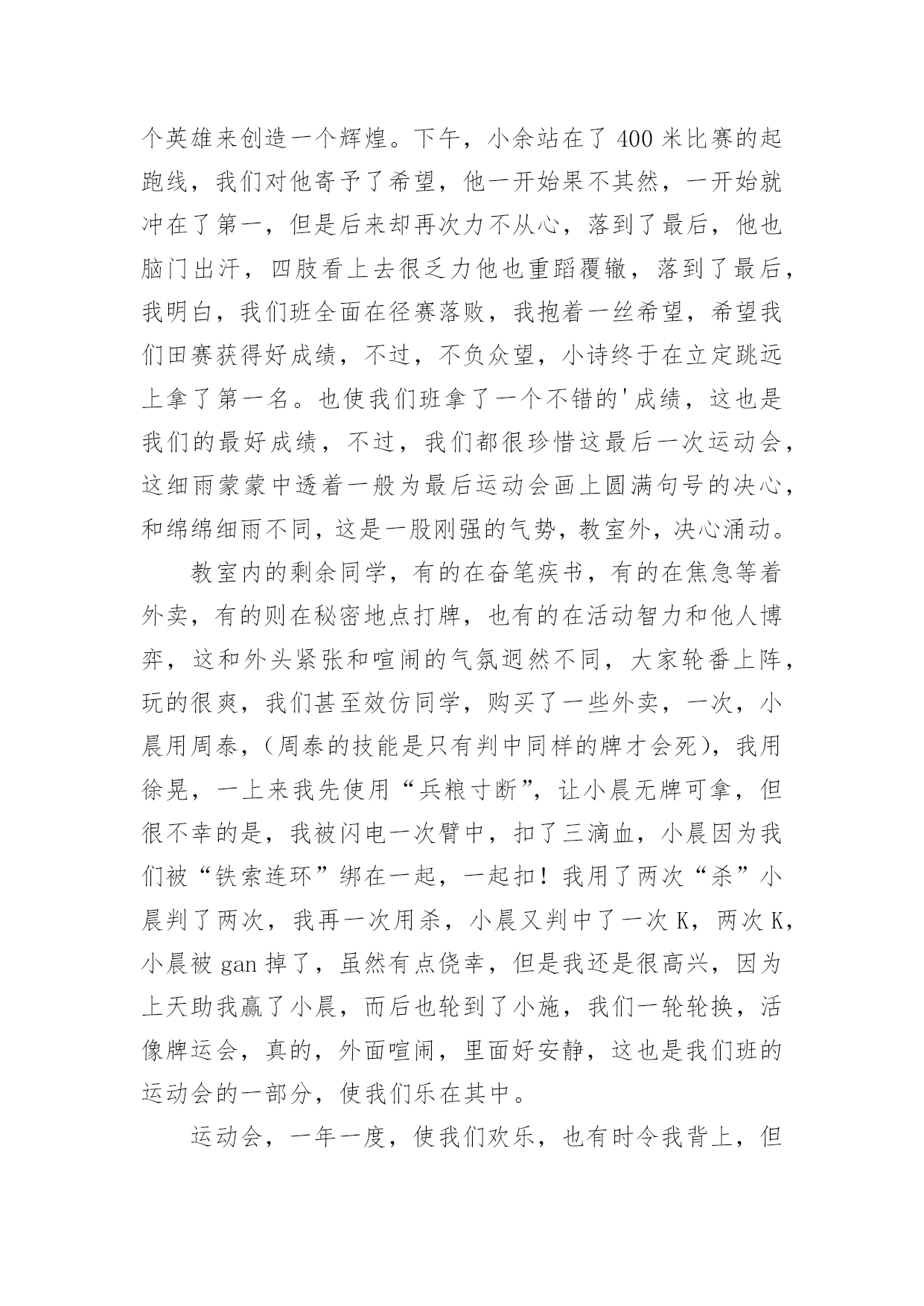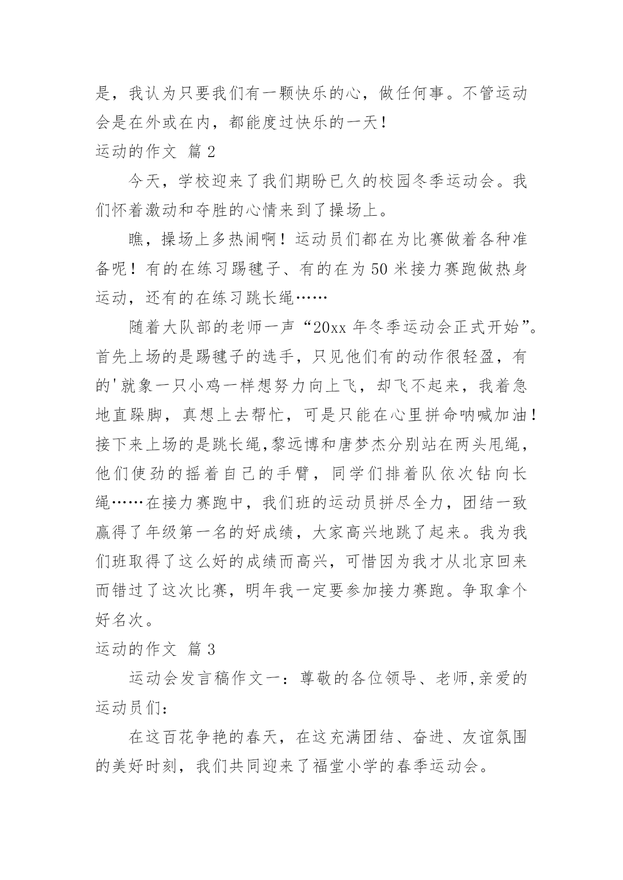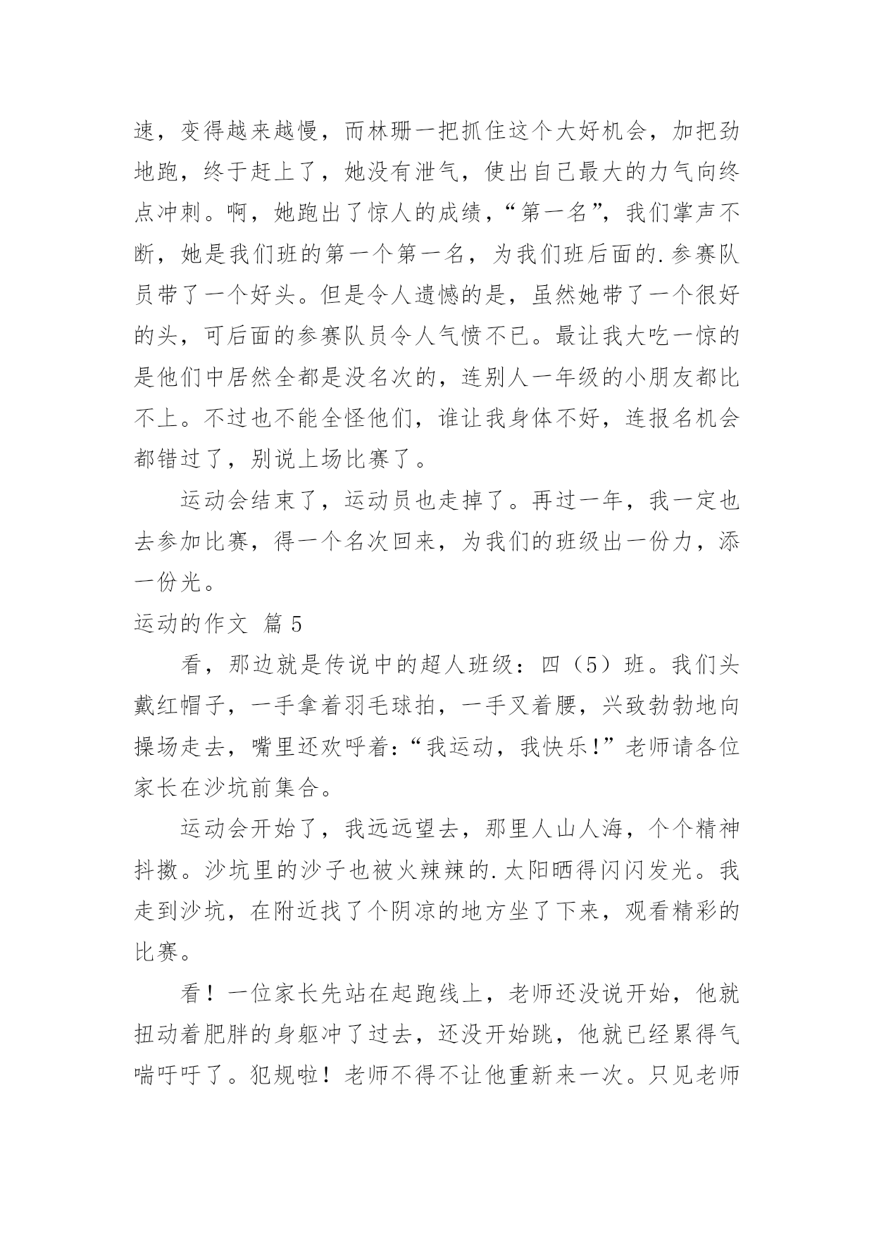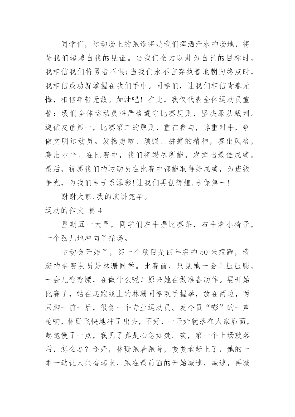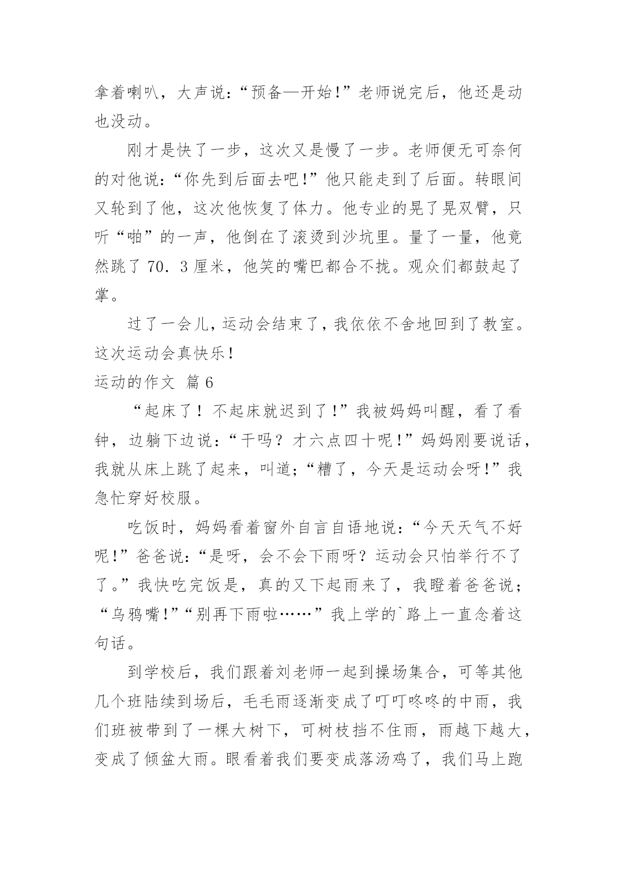 运动的作文运动的作文在平平淡淡的学习、工作、生活中,大家或多或少都会接触过作文吧,写作文是培养人们的观察力、联想力、想象力、思考力和记忆力的重要手段。相信写作文是一个让许多人都头痛的问题,下面是小编收集整理的运动的作文6篇,希望对大家有所帮助。运动的作文篇111月9日,下着朦胧的小雨,与这优美的意境截然迥异的是操场上的喧闹,几乎全校的学生都集中在操场上,但我们班则大不同,外面热闹十分,里面也是歌舞升平,弈者胜啊!教室外教室外面,走廊里几乎都没有人了,而操场上人潮涌动,声音一浪接着一浪,为运动员呐喊助威,先是女子四百米的决赛,小旸精神地站到了起跑线上,她甩了甩手臂,深吸了一口气,她顺备好了,“嘣!”的一声发令枪响了,众人像离弦的箭飞射出去,小旸两步并作三步跑在了最前面,但是很快的她的速度慢慢的下来了,渐渐落到了最后,几乎雨点打在她的身上,看上去那么重,她坚强地撑到最后,我们的心都揪在那里,她沉重地软到在终点线上,欣儿一个箭步冲上去,扶起了她,细雨蒙蒙衬托出我们的心情,我们希望有一个英雄来创造一个辉煌。下午,小余站在了400米比赛的起跑线,我们对他寄予了希望,他一开始果不其然,一开始就冲在了第一,但是后来却再次力不从心,落到了最后,他也脑门出汗,四肢看上去很乏力他也重蹈覆辙,落到了最后,我明白,我们班全面在径赛落败,我抱着一丝希望,希望我们田赛获得好成绩,不过,不负众望,小诗终于在立定跳远上拿了第一名。也使我们班拿了一个不错的'成绩,这也是我们的最好成绩,不过,我们都很珍惜这最后一次运动会,这细雨蒙蒙中透着一般为最后运动会画上圆满句号的决心,和绵绵细雨不同,这是一股刚强的气势,教室外,决心涌动。教室内的剩余同学,有的在奋笔疾书,有的在焦急等着外卖,有的则在秘密地点打牌,也有的在活动智力和他人博弈,这和外头紧张和喧闹的气氛迥然不同,大家轮番上阵,玩的很爽,我们甚至效仿同学,购买了一些外卖,一次,小晨用周泰,(周泰的技能是只有判中同样的牌才会死),我用徐晃,一上来我先使用“兵粮寸断”,让小晨无牌可拿,但很不幸的是,我被闪电一次臂中,扣了三滴血,小晨因为我们被“铁索连环”绑在一起,一起扣!我用了两次“杀”小晨判了两次,我再一次用杀,小晨又判中了一次K,两次K,小晨被gan掉了,虽然有点侥幸,但是我还是很高兴,因为上天助我赢了小晨,而后也轮到了小施,我们一轮轮换,活像牌运会,真的,外面喧闹,里面好安静,这也是我们班的运动会的一部分,使我们乐在其中。运动会,一年一度,使我们欢乐,也有时令我背上,但是,我认为只要我们有一颗快乐的心,做任何事。不管运动会是在外或在内,都能度过快乐的一天!运动的作文篇2今天,学校迎来了我们期盼已久的校园冬季运动会。我们怀着激动和夺胜的心情来到了操场上。瞧,操场上多热闹啊!运动员们都在为比赛做着各种准备呢!有的在练习踢毽子、有的在为50米接力赛跑做热身运动,还有的在练习跳长绳……随着大队部的老师一声“20xx年冬季运动会正式开始”。首先上场的是踢毽子的选手,只见他们有的动作很轻盈,有的'就象一只小鸡一样想努力向上飞,却飞不起来,我着急地直跺脚,真想上去帮忙,可是只能在心里拼命呐喊加油!接下来上场的是跳长绳,黎远博和唐梦杰分别站在两头甩绳,他们使劲的摇着自己的手臂,同学们排着队依次钻向长绳……在接力赛跑中,我们班的运动员拼尽全力,团结一致赢得了年级第一名的好成绩,大家高兴地跳了起来。我为我们班取得了这么好的成绩而高兴,可惜因为我才从北京回来而错过了这次比赛,明年我一定要参加接力赛跑。争取拿个好名次。运动的作文篇3运动会发言稿作文一:尊敬的各位领导、老师,亲爱的运动员们:在这百花争艳的春天,在这充满团结、奋进、友谊氛围的美好时刻,我们共同迎来了福堂小学的春季运动会。发展体育运动,弘扬体育精神对学校培养新世纪合格人才、对学校的发展建设有着重要的意义。坚持发扬体育的奥林匹克精神,必将对我校素质教育规划的顺利实施,早日实现建设一流小学的目标起到积极的推进作用。今天,我们全体运动员欢聚一堂,要在本次运动会上展示自己,发扬奥运精神,做一个名副其实的.“领头羊”。虽然我们来自不同的班级,但我们是一个团结的集体。我们要把这次春季体育运动会,做为锻炼自己,增强体质,培养集体荣誉感的好机会。在此,我代表全体运动员宣誓:一定遵守比赛规则,遵守大会纪律,服从裁判,听从指挥;坚持友谊第一,比赛第二的体育风尚,赛出成绩,赛出水平。让我们以优异的成绩,以顽强拼搏的精神,为奥运火炬添彩;让我们团结进取,为福堂小学的繁荣发展贡献力量!最后,祝我校20xx年春季运动会圆满成功!运动会发言稿作文二:尊敬的各位裁判员、运动员,老师们、同学们:大家上午好!身披初冬薄雾,沐浴冬日暖阳。我校20xx年冬季田径运动会马上就开幕了。值此开幕之际,我代表大会组委会