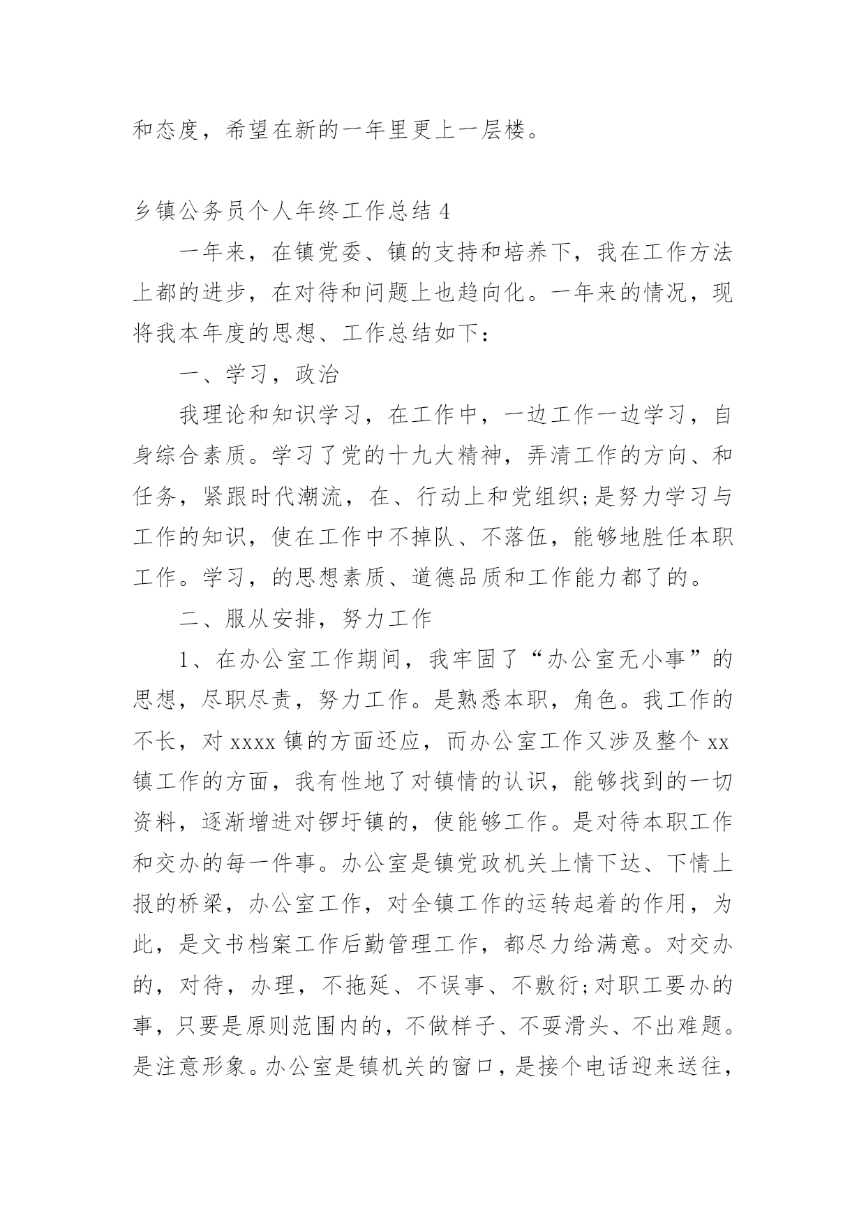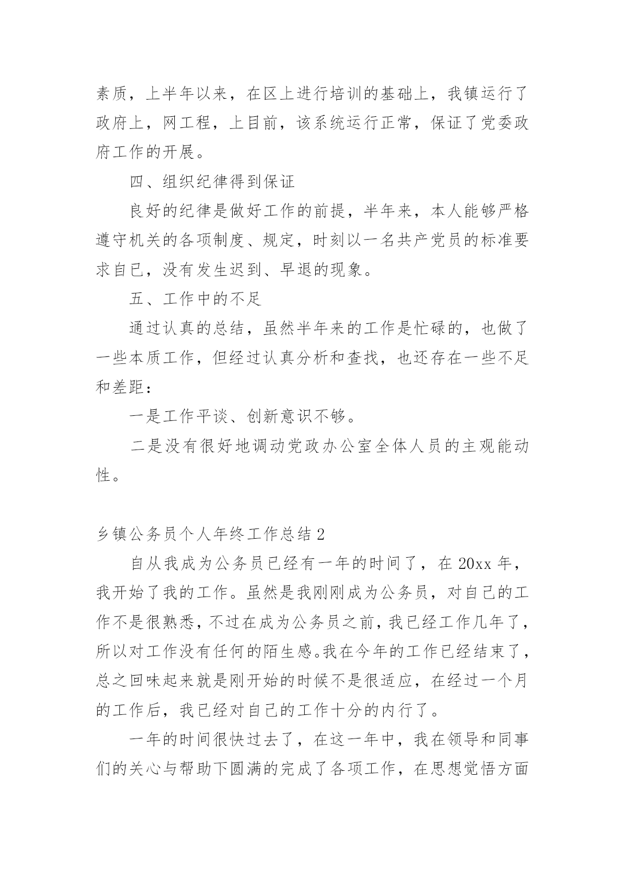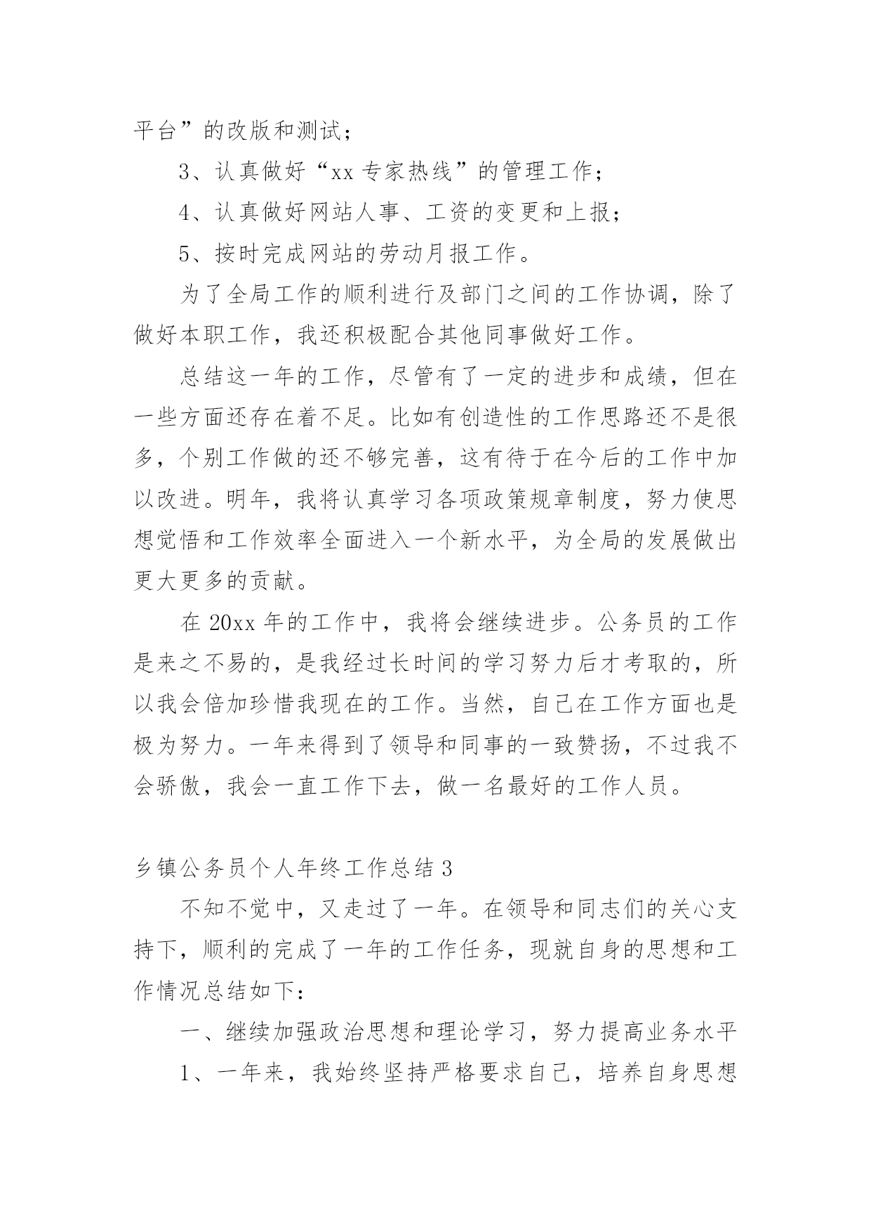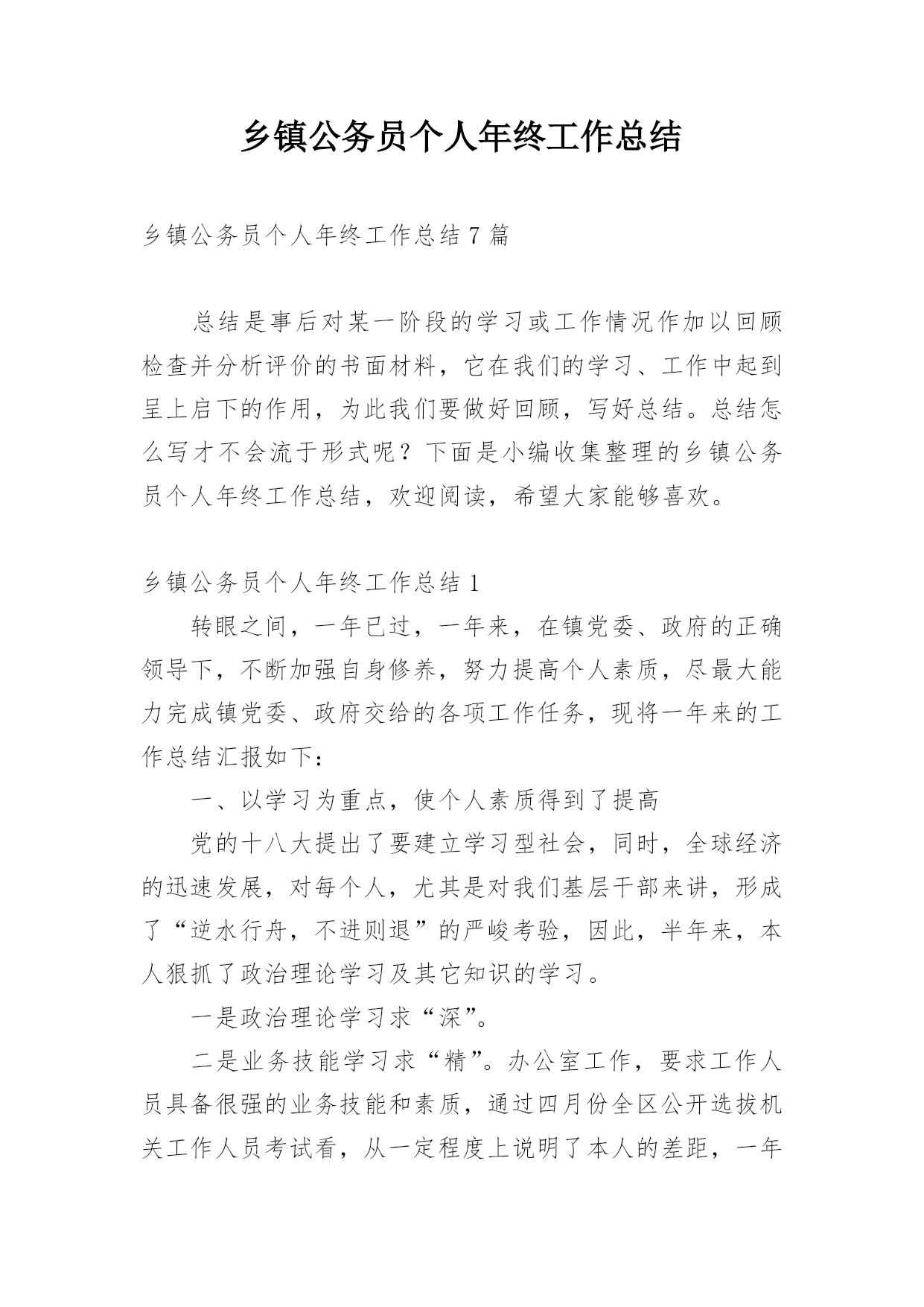 乡镇公务员个人年终工作总结乡镇公务员个人年终工作总结7篇总结是事后对某一阶段的学习或工作情况作加以回顾检查并分析评价的书面材料,它在我们的学习、工作中起到呈上启下的作用,为此我们要做好回顾,写好总结。总结怎么写才不会流于形式呢?下面是小编收集整理的乡镇公务员个人年终工作总结,欢迎阅读,希望大家能够喜欢。乡镇公务员个人年终工作总结1转眼之间,一年已过,一年来,在镇党委、政府的正确领导下,不断加强自身修养,努力提高个人素质,尽最大能力完成镇党委、政府交给的各项工作任务,现将一年来的工作总结汇报如下:一、以学习为重点,使个人素质得到了提高党的十八大提出了要建立学习型社会,同时,全球经济的迅速发展,对每个人,尤其是对我们基层干部来讲,形成了“逆水行舟,不进则退”的严峻考验,因此,半年来,本人狠抓了政治理论学习及其它知识的学习。一是政治理论学习求“深”。二是业务技能学习求“精”。办公室工作,要求工作人员具备很强的业务技能和素质,通过四月份全区公开选拔机关工作人员考试看,从一定程度上说明了本人的差距,一年来,我先后自学了办公自动化管理、秘书工作及应用文写作等业务知识,参加了一期新闻写作培训班,从一定程度上提高了业务知识水平。三是其它知识学习求“广”。为了开阔自己知识面,在工作空闲之余,也还能够广泛涉猎一些其它方面的知识。二、中心工作今年以来,按照党委、政府安排,我在xx村包村,半年来,我积极配合村支部、村委会完成各项工作。一是进行了产业结构调整。年初,我们多方联系种了公司、经销公司等单位,制定了“六个一”增收富民目标,即人均一亩饲草,一亩制种,一亩中药材,一亩蔬菜,一亩优质果园,户均一座暖棚圈,在逐社宣传的基础上,全村共落实玉米制种xx亩,菊芋xx亩,粮经比例达xxx,全村群众订单面积达到70%,同时时全面完成了退耕还林补植任务,栽植杨树xx株。二是重点建设项目进展顺利。全村共落实渠道4.6公理,止目前已衬砌2公理,新建五社亭子一处,栽植绿化风景木300株.新发展养殖大户36户.三是党建、精神文明建设得到加强。上半年来,全村利用元旦、春节、五一、七一等节日,举办文艺活动4次,开展捐助活动1次,捐助现金xxx多元。四是社会各项事业平稳发展.今年以来,本人配合村党支部、村委会完成了禽流感防治、村级防火防盗制度的落实、以农机安全生产为主的阶段性工作,确保了全村的稳定。五是健全完善了村上各项制度。结合基层组织建设规范化管理工作的开展,针对村上财务管理不健全等问题,从抓基础入手,先后健全了村支部仪事制度、社干部管理制度等多项管理制度。三、业务工作在创新中得到提高一是较好地完成了文秘工作。上半年来,本人将提高业务水平做为工作的重点,能够按照办公室工作及时、准确、高效的要求,认真做到了上情下传、下情上报,尤其是对一些时效性强的工作加班加点、起早贪黑,保质保量地完成任务,没有发生因工作失误而造成工作被动,据初步统计,上目前,完成各种上报材料20篇,下发各种文件xx份,完成调研报告3篇。二是党员管理工作得到加强。今年的基层组织建设我们按照区委安排,主要开展了三项工作:1、以党群致富信用联合体和产业党小组组建为主的双培双带工程顺利开展,全镇组建信用联合体14个,上报待审批3个。2、对全镇流动党员及村级组织状况进行了全面摸底,为党员先进性教育的开展奠定了基矗3、做好了党员的教育和培养工作。全年新发展党员40人。三是全镇办公自动化管理系统运行正常。办公自动化管理是今后办公室工作人员必备的技能的素质,上半年以来,在区上进行培训的基础上,我镇运行了政府上,网工程,上目前,该系统运行正常,保证了党委政府工作的开展。四、组织纪律得到保证良好的纪律是做好工作的前提,半年来,本人能够严格遵守机关的各项制度、规定,时刻以一名共产党员的标准要求自已,没有发生迟到、早退的现象。五、工作中的不足通过认真的总结,虽然半年来的工作是忙碌的,也做了一些本质工作,但经过认真分析和查找,也还存在一些不足和差距:一是工作平谈、创新意识不够。二是没有很好地调动党政办公室全体人员的主观能动性。乡镇公务员个人年终工作总结2自从我成为公务员已经有一年的时间了,在20xx年,我开始了我的工作。虽然是我刚刚成为公务员,对自己的工作不是很熟悉,不过在成为公务员之前,我已经工作几年了,所以对工作没有任何的陌生感。我在今年的工作已经结束了,总之回味起来就是刚开始的时候不是很适应,在经过一个月的工作后,我已经对自己的工作十分的内行了。一年的时间很快过去了,在这一年中,我在领导和同事们的关心与帮助下圆满的完成了各项工作,在思想觉悟方面有了更进一步的提高。为今后取得更大的成绩,纠正不足,现将这一年的工作情况汇报如下:一、工作态度和勤奋敬业方面热爱自己的本职工作,能够正确认真的对待每一项工作,工作投入,热心为大家服