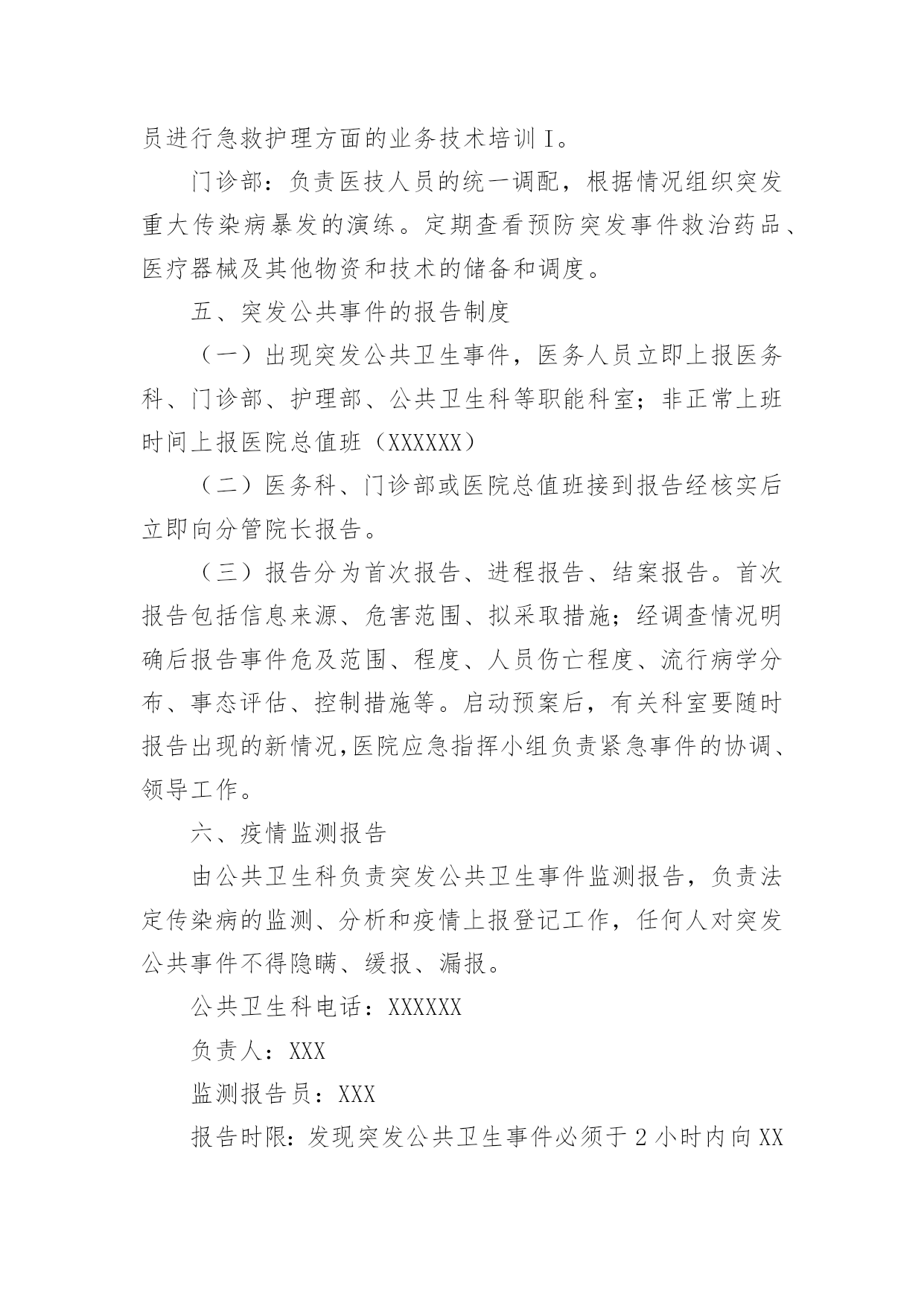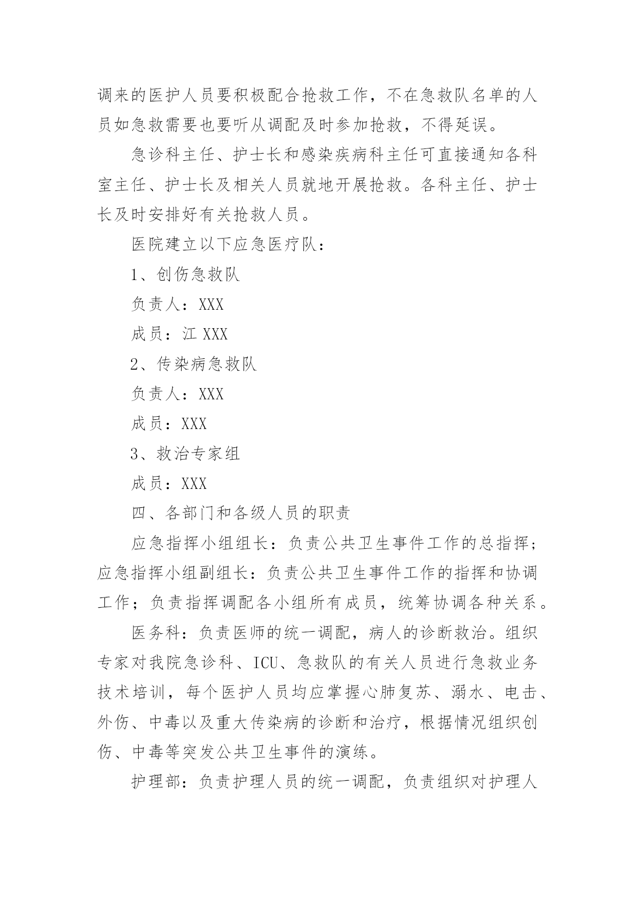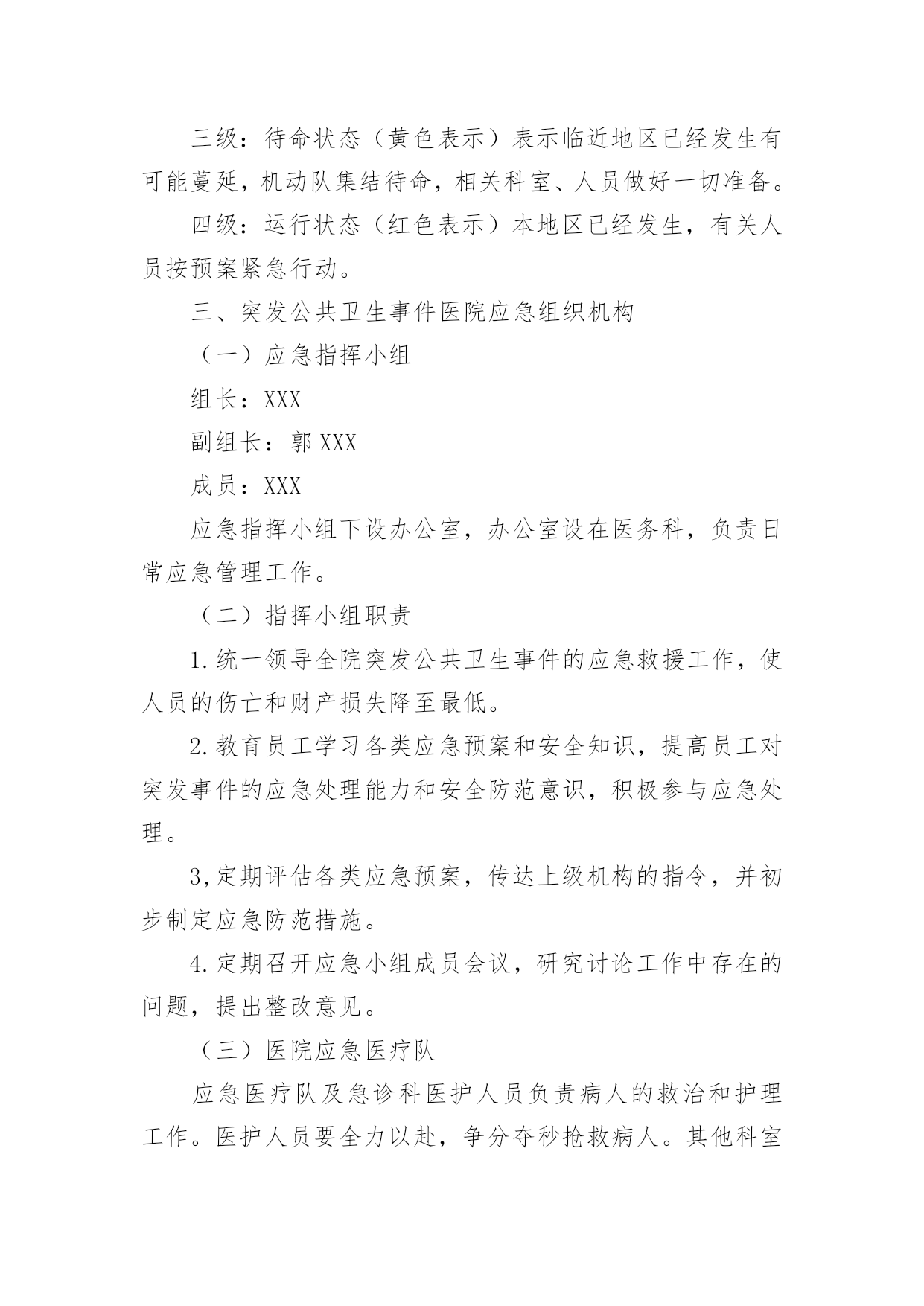 医院突发公共卫生事件应急预案[精选]医院突发公共卫生事件应急预案在平时的学习、工作或生活中,有时会发生突发事件,为了避免造成重大损失和危害,时常需要预先编制应急预案。那么大家知道应急预案怎么写才规范吗?以下是小编为大家收集的医院突发公共卫生事件应急预案,希望能够帮助到大家。一、适用范围本预案适用于突然发生,造成或可能造成社会公众身心健康严重损害的重大传染病、群体性不明原因疾病、重大食物、职业中毒以及影响公众健康的公共卫生事件的防控、治疗和发生其他因自然灾害、事故灾难或社会安全等事件,按上级行政部门指示承担医疗救援防控工作等。二、救治预警分级根据突发事件造成伤亡人数、程度,将突发事件医疗救治预警分为四级:一级:常规状态(绿色表示)表明没有异常情况,一切处于正常状态。二级:预备状态(蓝色表示)表明已经发生可能波及到本区的异常情况,急救中心、机动队员等禁止外出,在外人员立即返回。三级:待命状态(黄色表示)表示临近地区已经发生有可能蔓延,机动队集结待命,相关科室、人员做好一切准备。四级:运行状态(红色表示)本地区已经发生,有关人员按预案紧急行动。三、突发公共卫生事件医院应急组织机构(一)应急指挥小组组长:XXX副组长:郭XXX成员:XXX应急指挥小组下设办公室,办公室设在医务科,负责日常应急管理工作。(二)指挥小组职责1.统一领导全院突发公共卫生事件的应急救援工作,使人员的伤亡和财产损失降至最低。2.教育员工学习各类应急预案和安全知识,提高员工对突发事件的应急处理能力和安全防范意识,积极参与应急处理。3,定期评估各类应急预案,传达上级机构的指令,并初步制定应急防范措施。4.定期召开应急小组成员会议,研究讨论工作中存在的问题,提出整改意见。(三)医院应急医疗队应急医疗队及急诊科医护人员负责病人的救治和护理工作。医护人员要全力以赴,争分夺秒抢救病人。其他科室调来的医护人员要积极配合抢救工作,不在急救队名单的人员如急救需要也要听从调配及时参加抢救,不得延误。急诊科主任、护士长和感染疾病科主任可直接通知各科室主任、护士长及相关人员就地开展抢救。各科主任、护士长及时安排好有关抢救人员。医院建立以下应急医疗队:1、创伤急救队负责人:XXX成员:江XXX2、传染病急救队负责人:XXX成员:XXX3、救治专家组成员:XXX四、各部门和各级人员的职责应急指挥小组组长:负责公共卫生事件工作的总指挥;应急指挥小组副组长:负责公共卫生事件工作的指挥和协调工作;负责指挥调配各小组所有成员,统筹协调各种关系。医务科:负责医师的统一调配,病人的诊断救治。组织专家对我院急诊科、ICU、急救队的有关人员进行急救业务技术培训,每个医护人员均应掌握心肺复苏、溺水、电击、外伤、中毒以及重大传染病的诊断和治疗,根据情况组织创伤、中毒等突发公共卫生事件的演练。护理部:负责护理人员的统一调配,负责组织对护理人员进行急救护理方面的业务技术培训I。门诊部:负责医技人员的统一调配,根据情况组织突发重大传染病暴发的演练。定期查看预防突发事件救治药品、医疗器械及其他物资和技术的储备和调度。五、突发公共事件的报告制度(一)出现突发公共卫生事件,医务人员立即上报医务科、门诊部、护理部、公共卫生科等职能科室;非正常上班时间上报医院总值班(XXXXXX)(二)医务科、门诊部或医院总值班接到报告经核实后立即向分管院长报告。(三)报告分为首次报告、进程报告、结案报告。首次报告包括信息来源、危害范围、拟采取措施;经调查情况明确后报告事件危及范围、程度、人员伤亡程度、流行病学分布、事态评估、控制措施等。启动预案后,有关科室要随时报告出现的新情况,医院应急指挥小组负责紧急事件的协调、领导工作。六、疫情监测报告由公共卫生科负责突发公共卫生事件监测报告,负责法定传染病的监测、分析和疫情上报登记工作,任何人对突发公共事件不得隐瞒、缓报、漏报。公共卫生科电话:XXXXXX负责人:XXX监测报告员:XXX报告时限:发现突发公共卫生事件必须于2小时内向XX县卫生局报告并网报。XX县卫生局电话:XXXXXX七、应急响应(一)急诊科接到突发事件报告核实后,立即报告相关急救队队长,开通“绿色通道”,做好抢救准备,同时向医务科,医院总值班(夜间及周末)报告。(二)急救队长立刻调动急救队出发,医务科或总值班立即报告分管院长及上级行政主管部门,同时协调检验科、影像科、ICU、手术室、输血室、院感科、感染疾病科、公共卫生科、有关临床科室做好抢救准备。(三)后勤保障科、设备科、药剂科等后勤人员迅速行动起来,随时解决临床出现的困难及伤员的需求。(四)急救队按有关要求到现场进行抢救,同时将有关情况向医务科汇报,医务科向分管院长汇报。同样急诊科也将救治病人情况向医务科汇报。(五)对急救队成员的要求:1.必须24小时保持电话畅通。2,外出