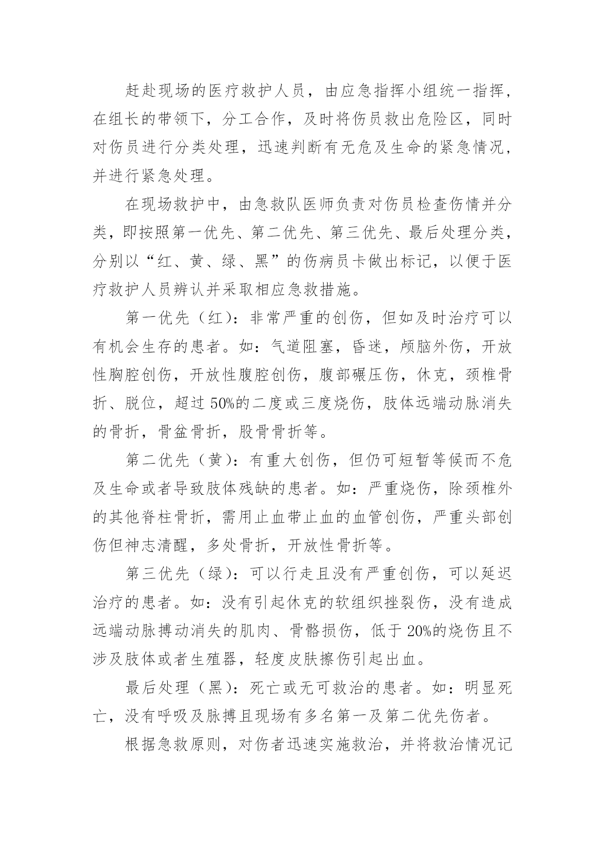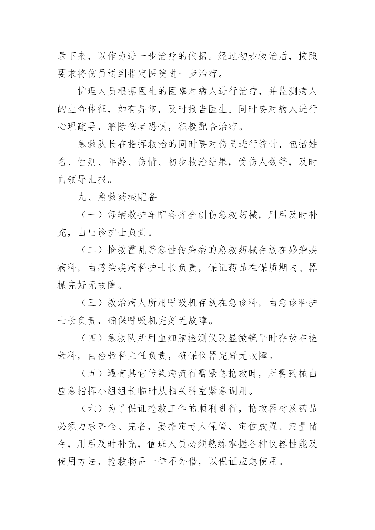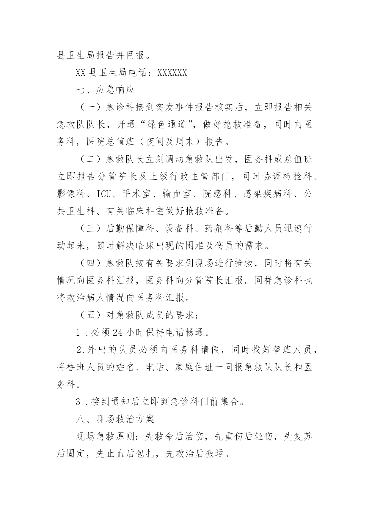 医院突发公共卫生事件应急预案[精选]医院突发公共卫生事件应急预案在平时的学习、工作或生活中,有时会发生突发事件,为了避免造成重大损失和危害,时常需要预先编制应急预案。那么大家知道应急预案怎么写才规范吗?以下是小编为大家收集的医院突发公共卫生事件应急预案,希望能够帮助到大家。一、适用范围本预案适用于突然发生,造成或可能造成社会公众身心健康严重损害的重大传染病、群体性不明原因疾病、重大食物、职业中毒以及影响公众健康的公共卫生事件的防控、治疗和发生其他因自然灾害、事故灾难或社会安全等事件,按上级行政部门指示承担医疗救援防控工作等。二、救治预警分级根据突发事件造成伤亡人数、程度,将突发事件医疗救治预警分为四级:一级:常规状态(绿色表示)表明没有异常情况,一切处于正常状态。二级:预备状态(蓝色表示)表明已经发生可能波及到本区的异常情况,急救中心、机动队员等禁止外出,在外人员立即返回。三级:待命状态(黄色表示)表示临近地区已经发生有可能蔓延,机动队集结待命,相关科室、人员做好一切准备。四级:运行状态(红色表示)本地区已经发生,有关人员按预案紧急行动。三、突发公共卫生事件医院应急组织机构(一)应急指挥小组组长:XXX副组长:郭XXX成员:XXX应急指挥小组下设办公室,办公室设在医务科,负责日常应急管理工作。(二)指挥小组职责1.统一领导全院突发公共卫生事件的应急救援工作,使人员的伤亡和财产损失降至最低。2.教育员工学习各类应急预案和安全知识,提高员工对突发事件的应急处理能力和安全防范意识,积极参与应急处理。3,定期评估各类应急预案,传达上级机构的指令,并初步制定应急防范措施。4.定期召开应急小组成员会议,研究讨论工作中存在的问题,提出整改意见。(三)医院应急医疗队应急医疗队及急诊科医护人员负责病人的救治和护理工作。医护人员要全力以赴,争分夺秒抢救病人。其他科室调来的医护人员要积极配合抢救工作,不在急救队名单的人员如急救需要也要听从调配及时参加抢救,不得延误。急诊科主任、护士长和感染疾病科主任可直接通知各科室主任、护士长及相关人员就地开展抢救。各科主任、护士长及时安排好有关抢救人员。医院建立以下应急医疗队:1、创伤急救队负责人:XXX成员:江XXX2、传染病急救队负责人:XXX成员:XXX3、救治专家组成员:XXX四、各部门和各级人员的职责应急指挥小组组长:负责公共卫生事件工作的总指挥;应急指挥小组副组长:负责公共卫生事件工作的指挥和协调工作;负责指挥调配各小组所有成员,统筹协调各种关系。医务科:负责医师的统一调配,病人的诊断救治。组织专家对我院急诊科、ICU、急救队的有关人员进行急救业务技术培训,每个医护人员均应掌握心肺复苏、溺水、电击、外伤、中毒以及重大传染病的诊断和治疗,根据情况组织创伤、中毒等突发公共卫生事件的演练。护理部:负责护理人员的统一调配,负责组织对护理人员进行急救护理方面的业务技术培训I。门诊部:负责医技人员的统一调配,根据情况组织突发重大传染病暴发的演练。定期查看预防突发事件救治药品、医疗器械及其他物资和技术的储备和调度。五、突发公共事件的报告制度(一)出现突发公共卫生事件,医务人员立即上报医务科、门诊部、护理部、公共卫生科等职能科室;非正常上班时间上报医院总值班(XXXXXX)(二)医务科、门诊部或医院总值班接到报告经核实后立即向分管院长报告。(三)报告分为首次报告、进程报告、结案报告。首次报告包括信息来源、危害范围、拟采取措施;经调查情况明确后报告事件危及范围、程度、人员伤亡程度、流行病学分布、事态评估、控制措施等。启动预案后,有关科室要随时报告出现的新情况,医院应急指挥小组负责紧急事件的协调、领导工作。六、疫情监测报告由公共卫生科负责突发公共卫生事件监测报告,负责法定传染病的监测、分析和疫情上报登记工作,任何人对突发公共事件不得隐瞒、缓报、漏报。公共卫生科电话:XXXXXX负责人:XXX监测报告员:XXX报告时限:发现突发公共卫生事件必须于2小时内向XX县卫生局报告并网报。XX县卫生局电话:XXXXXX七、应急响应(一)急诊科接到突发事件报告核实后,立即报告相关急救队队长,开通“绿色通道”,做好抢救准备,同时向医务科,医院总值班(夜间及周末)报告。(二)急救队长立刻调动急救队出发,医务科或总值班立即报告分管院长及上级行政主管部门,同时协调检验科、影像科、ICU、手术室、输血室、院感科、感染疾病科、公共卫生科、有关临床科室做好抢救准备。(三)后勤保障科、设备科、药剂科等后勤人员迅速行动起来,随时解决临床出现的困难及伤员的需求。(四)急救队按有关要求到现场进行抢救,同时将有关情况向医务科汇报,医务科向分管院长汇报。同样急诊科也将救治病人情况向医务科汇报。(五)对急救队成员的要求:1.必须24小时保持电话畅通。2,外出
