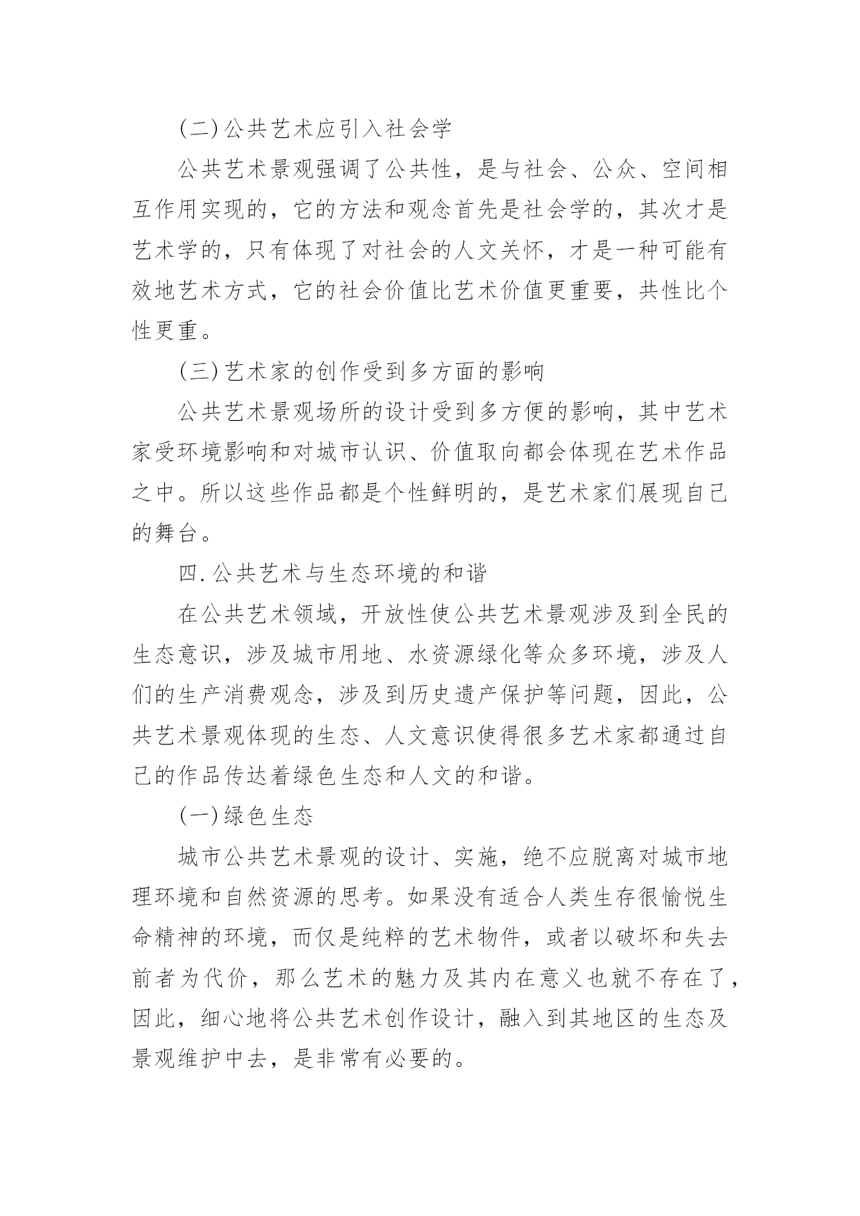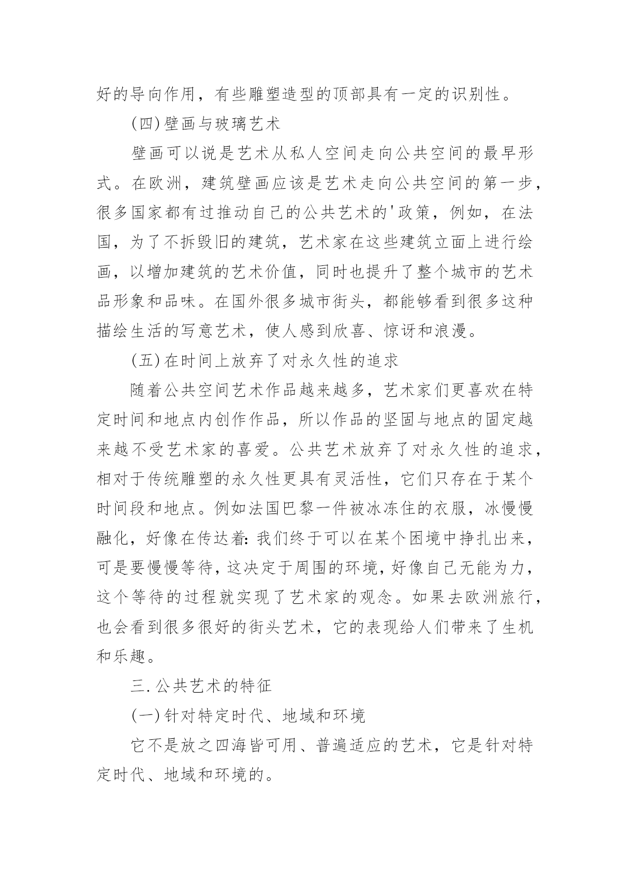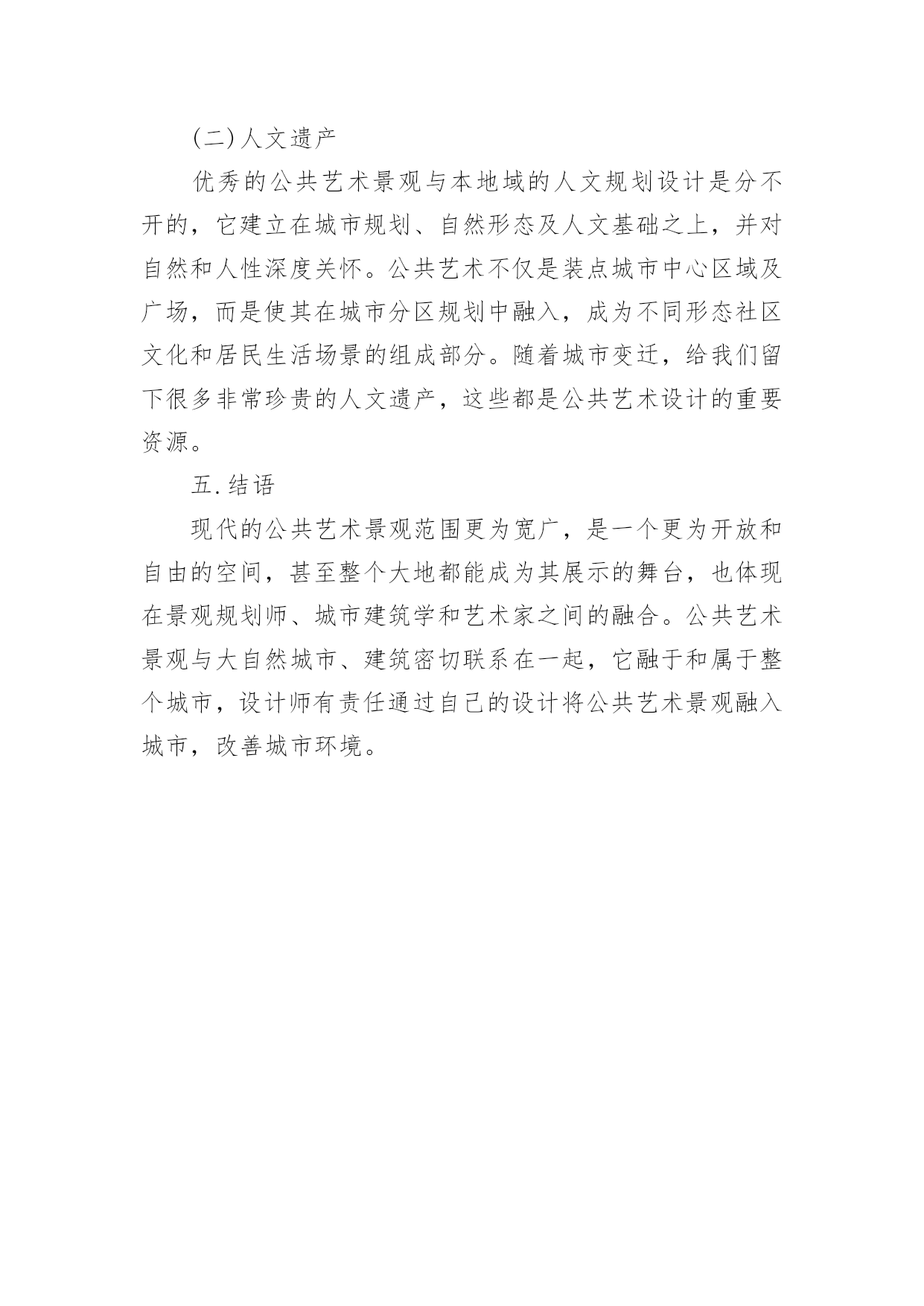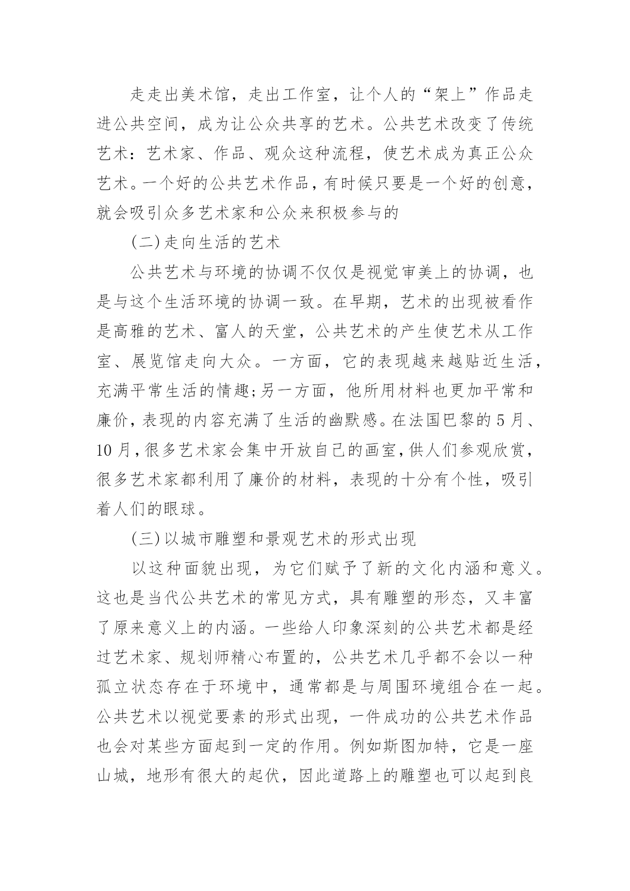 城市公共艺术景观设计研究城市公共艺术景观设计研究现代的公共艺术景观范围更为宽广,是一个更为开放和自由的空间,甚至整个大地都能成为其展示的舞台,也体现在景观规划师、城市建筑学和艺术家之间的融合。下面就来看看城市公共艺术景观设计研究吧。一.引言公共艺术所包涵的内容十分广泛,一切具有公共性,为公众服务的艺术形式都能被称为公共艺术。公共艺术作品经常是构成一处特定景观环境的主体和视觉的焦点,在空间形态、比例、色彩、质感、人们情感等方面协调与周围环境的关系,构成与建筑及人居环境之间的完整。公共艺术只有与城市的环境、政治、经济、文化等方面相协调一致才是最适宜的,从大环境和系统的角度认识公共艺术景观是很有必要的。二.公共艺术的形式公共艺术景观除强调它的公共性与公众的交流和互动以外,在价值上,还尊重不用的文化差异,体现出多元丰富的特征,打破了传统城市雕塑和景观艺术视觉上的审美,还强调了趣味上的“正面性”,功能上的“纪念性”等特征,在作品形态上,也体现出多样性的特点。(一)是让艺术作品向公共空间走走出美术馆,走出工作室,让个人的“架上”作品走进公共空间,成为让公众共享的艺术。公共艺术改变了传统艺术:艺术家、作品、观众这种流程,使艺术成为真正公众艺术。一个好的公共艺术作品,有时候只要是一个好的创意,就会吸引众多艺术家和公众来积极参与的(二)走向生活的艺术公共艺术与环境的协调不仅仅是视觉审美上的协调,也是与这个生活环境的协调一致。在早期,艺术的出现被看作是高雅的艺术、富人的天堂,公共艺术的产生使艺术从工作室、展览馆走向大众。一方面,它的表现越来越贴近生活,充满平常生活的情趣;另一方面,他所用材料也更加平常和廉价,表现的内容充满了生活的幽默感。在法国巴黎的5月、10月,很多艺术家会集中开放自己的画室,供人们参观欣赏,很多艺术家都利用了廉价的材料,表现的十分有个性,吸引着人们的眼球。(三)以城市雕塑和景观艺术的形式出现以这种面貌出现,为它们赋予了新的文化内涵和意义。这也是当代公共艺术的常见方式,具有雕塑的形态,又丰富了原来意义上的内涵。一些给人印象深刻的公共艺术都是经过艺术家、规划师精心布置的,公共艺术几乎都不会以一种孤立状态存在于环境中,通常都是与周围环境组合在一起。公共艺术以视觉要素的形式出现,一件成功的公共艺术作品也会对某些方面起到一定的作用。例如斯图加特,它是一座山城,地形有很大的起伏,因此道路上的雕塑也可以起到良好的导向作用,有些雕塑造型的顶部具有一定的识别性。(四)壁画与玻璃艺术壁画可以说是艺术从私人空间走向公共空间的最早形式。在欧洲,建筑壁画应该是艺术走向公共空间的第一步,很多国家都有过推动自己的公共艺术的'政策,例如,在法国,为了不拆毁旧的建筑,艺术家在这些建筑立面上进行绘画,以增加建筑的艺术价值,同时也提升了整个城市的艺术品形象和品味。在国外很多城市街头,都能够看到很多这种描绘生活的写意艺术,使人感到欣喜、惊讶和浪漫。(五)在时间上放弃了对永久性的追求随着公共空间艺术作品越来越多,艺术家们更喜欢在特定时间和地点内创作作品,所以作品的坚固与地点的固定越来越不受艺术家的喜爱。公共艺术放弃了对永久性的追求,相对于传统雕塑的永久性更具有灵活性,它们只存在于某个时间段和地点。例如法国巴黎一件被冰冻住的衣服,冰慢慢融化,好像在传达着:我们终于可以在某个困境中挣扎出来,可是要慢慢等待,这决定于周围的环境,好像自己无能为力,这个等待的过程就实现了艺术家的观念。如果去欧洲旅行,也会看到很多很好的街头艺术,它的表现给人们带来了生机和乐趣。三.公共艺术的特征(一)针对特定时代、地域和环境它不是放之四海皆可用、普遍适应的艺术,它是针对特定时代、地域和环境的。(二)公共艺术应引入社会学公共艺术景观强调了公共性,是与社会、公众、空间相互作用实现的,它的方法和观念首先是社会学的,其次才是艺术学的,只有体现了对社会的人文关怀,才是一种可能有效地艺术方式,它的社会价值比艺术价值更重要,共性比个性更重。(三)艺术家的创作受到多方面的影响公共艺术景观场所的设计受到多方便的影响,其中艺术家受环境影响和对城市认识、价值取向都会体现在艺术作品之中。所以这些作品都是个性鲜明的,是艺术家们展现自己的舞台。四.公共艺术与生态环境的和谐在公共艺术领域,开放性使公共艺术景观涉及到全民的生态意识,涉及城市用地、水资源绿化等众多环境,涉及人们的生产消费观念,涉及到历史遗产保护等问题,因此,公共艺术景观体现的生态、人文意识使得很多艺术家都通过自己的作品传达着绿色生态和人文的和谐。(一)绿色生态城市公共艺术景观的设计、实施,绝不应脱离对城市地理环境和自然资源的思考。如果没有适合人类生存很愉悦生命精神的环境,而仅是纯粹的艺术物件,或者以破坏和失去前者为代价,那么艺术的魅力及其内在意义也就不存在了