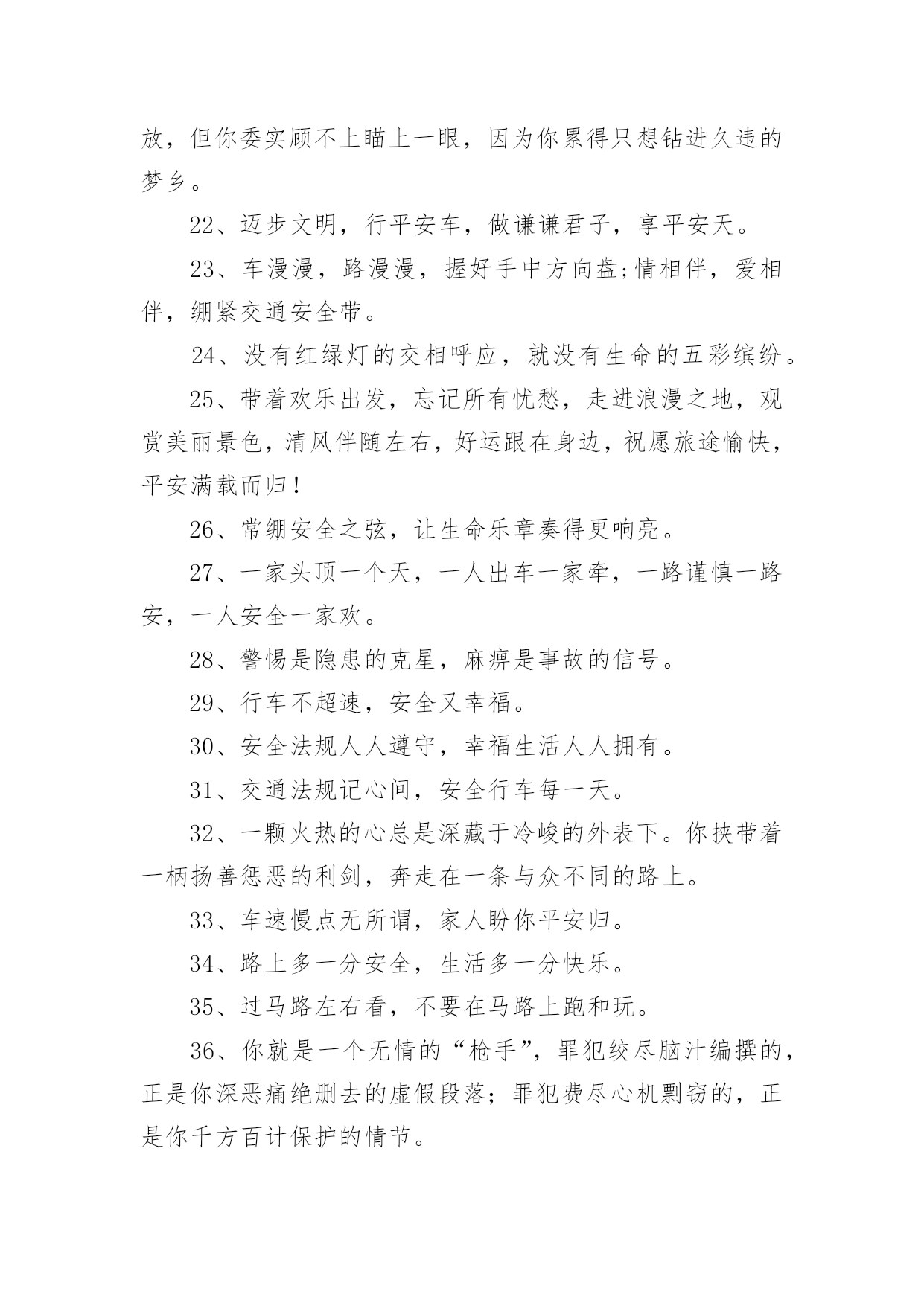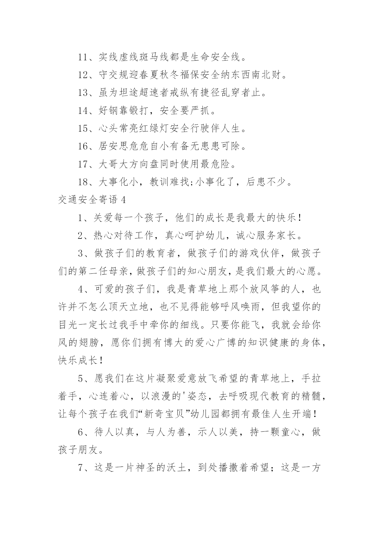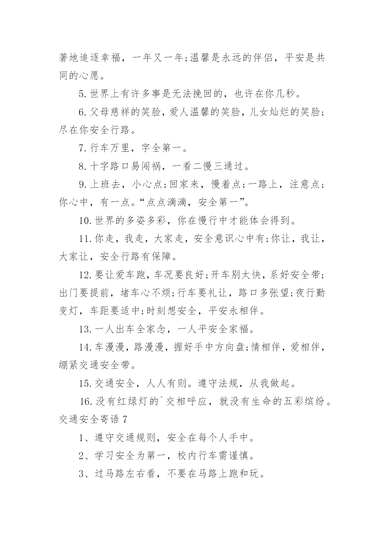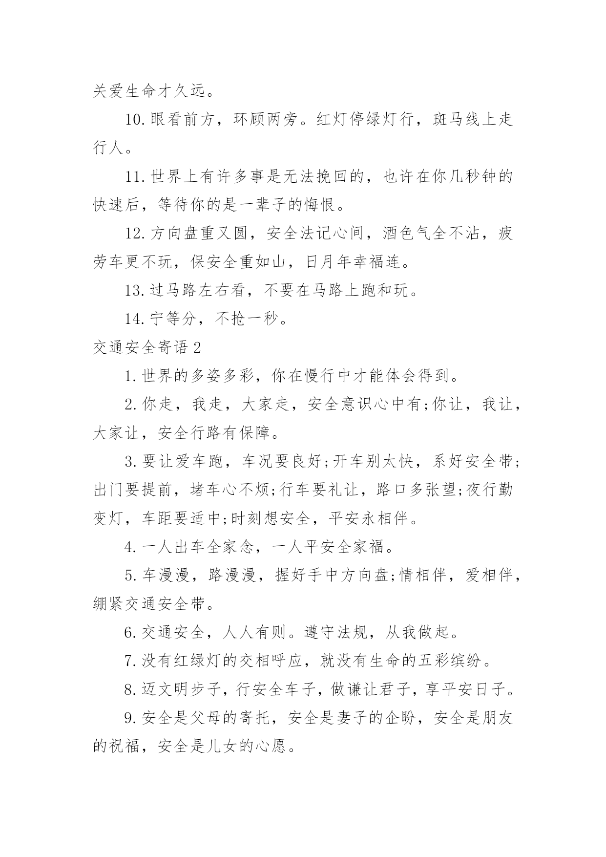 交通安全寄语交通安全寄语在我们平凡的日常里,大家总少不了要接触或使用寄语吧,通过寄语人们可以心中的所思所想表达出来。那什么样的寄语才是好的寄语呢?以下是小编收集整理的交通安全寄语,希望对大家有所帮助。交通安全寄语11.严格遵守交通法,平安和谐靠大家。2.彼此多一分理解和谦让路上便多一分安静与和谐。3.安全是我们幸福的前提和基础,是社会稳定和发展的保障。预防交通事故,保障交通安全,确保出入平安,是你我的共同追求,也是亲人朋友的共同期盼。4.安全是天责任如山永挂心间。抓好常规,以防为主,创造一个平安和谐洁净幽雅的.教育环境,用爱心呵护每一片绿色,让每一个学生快乐健康地成长。5.生命无返程-珍惜生命;安全出行,从我做起。6.父母慈祥的笑脸,爱人温馨的笑脸,儿女灿烂的笑脸;尽在你安全行路。7.生命无返程,珍惜生命,安全出行,从我做起。8.酒后驾车生命打折。9.世上的路千万条,安全行驶一线牵;生活的情万万千,关爱生命才久远。10.眼看前方,环顾两旁。红灯停绿灯行,斑马线上走行人。11.世界上有许多事是无法挽回的,也许在你几秒钟的快速后,等待你的是一辈子的悔恨。12.方向盘重又圆,安全法记心间,酒色气全不沾,疲劳车更不玩,保安全重如山,日月年幸福连。13.过马路左右看,不要在马路上跑和玩。14.宁等分,不抢一秒。交通安全寄语21.世界的多姿多彩,你在慢行中才能体会得到。2.你走,我走,大家走,安全意识心中有;你让,我让,大家让,安全行路有保障。3.要让爱车跑,车况要良好;开车别太快,系好安全带;出门要提前,堵车心不烦;行车要礼让,路口多张望;夜行勤变灯,车距要适中;时刻想安全,平安永相伴。4.一人出车全家念,一人平安全家福。5.车漫漫,路漫漫,握好手中方向盘;情相伴,爱相伴,绷紧交通安全带。6.交通安全,人人有则。遵守法规,从我做起。7.没有红绿灯的交相呼应,就没有生命的五彩缤纷。8.迈文明步子,行安全车子,做谦让君子,享平安日子。9.安全是父母的寄托,安全是妻子的企盼,安全是朋友的祝福,安全是儿女的心愿。10.带一分小心上路,携一团温馨回家。11.遵规驾驶有速度,珍惜生命是成熟,出入平安是祝福,合家团圆享富足。12.严格遵守交通法,平安和谐靠大家。13.彼此多一分理解和谦让路上便多一分安静与和谐。14.安全是我们幸福的前提和基础,是社会稳定和进展的保障。预防交通事故,保障交通安全,确保出入平安,是你我的共同追求,也是亲人朋友的共同期盼。15.安全是天责任如山永挂心间。抓好常规,以防为主,制造一个平安和谐干净幽雅的教育环境,用爱心呵护每一片绿色,让每一个学生欢乐健康地成长。16.生命无返程-珍惜生命;安全出行,从我做起。17.父母慈爱的笑脸,爱人温馨的笑脸,儿女灿烂的笑脸;尽在你安全行路。18.生命无返程,珍惜生命,安全出行,从我做起。19.酒后驾车生命打折。20.世上的路千万条,安全行驶一线牵;生活的情万万千,关爱生命才久远。21.眼看前方,环顾两旁。红灯停绿灯行,斑马线上走行人。22.世界上有许多事是无法挽回的,也许在你几秒钟的快速后,等待你的'是一辈子的悔恨。23.方向盘重又圆,安全法记心间,酒色气全不沾,疲劳车更不玩,保安全重如山,日月年幸福连。24.过马路左右看,不要在马路上跑和玩。25.车漫漫,路漫漫,握好手中方向盘;情相伴,爱相伴,绷紧交通安全带。26.交通安全,人人有则。遵守法规,从我做起。27.没有红绿灯的交相呼应,就没有生命的五彩缤纷。28.迈文明步子,行安全车子,做谦让君子,享平安日子。29.安全是父母的寄托,安全是妻子的企盼,安全是朋友的祝福,安全是儿女的心愿。30.交通你我他,关系千万家,关心交通,关爱生命。31.心无交规,路有坎坷乱穿马路,失道无助。32.遵守交通规则,安全在每个人手中。33.走过春夏秋冬,安全永驻心中。交通安全寄语31、绳套松逮不住恶狼,制度松防不了祸患。2、好拳不在花样巧,安全别光嘴上叫。3、车辆超载一吨危险增加十分。4、安全与生命一线索幸福和安全两相连。5、生命只有一次平安伴君一生。6、群策群力科学管理,戒骄戒躁杜绝事故。7、病树的医生是啄木鸟,隐患的医生是安全员。8、停让躲慢要果断犹豫不决出祸端。9、违章铸成终身悔守规伴你一世安。10、遵守交通法规关爱生命旅程。11、实线虚线斑马线都是生命安全线。12、守交规迎春夏秋冬福保安全纳东西南北财。13、虽为坦途超速者戒纵有捷径乱穿者止。14、好钢靠锻打,安全要严抓。15、心头常亮红绿灯安全行驶伴人生。16、居安思危危自小有备无患患可除。17、大哥大方向盘同时使用最危险。18、大事化小,教训难找;小事化了,后患不少。交通安全寄语41、关爱每一个孩子,他们的成长是我最大的快乐!2、热心对待工作,真心呵护幼儿,诚心服务家长。3、做孩子们的教育者,