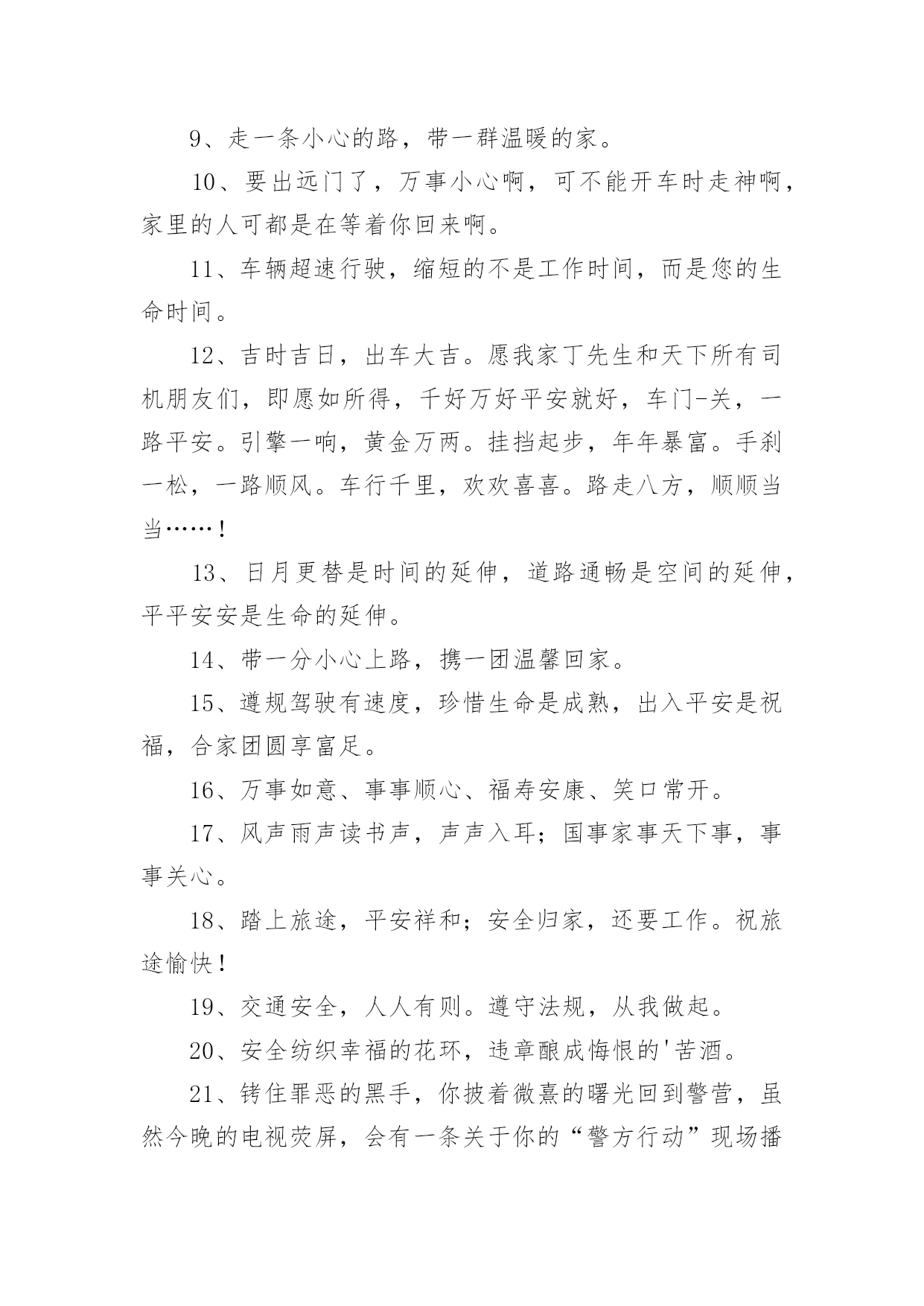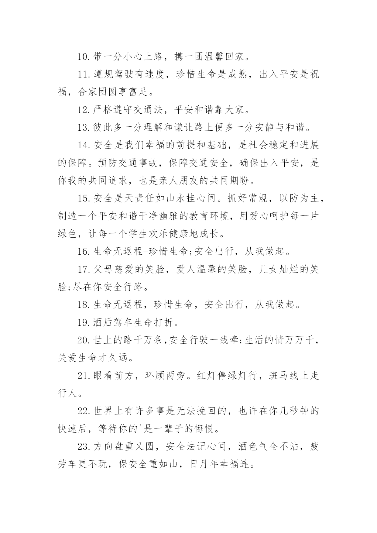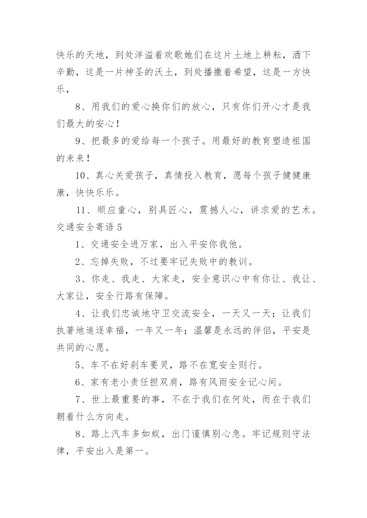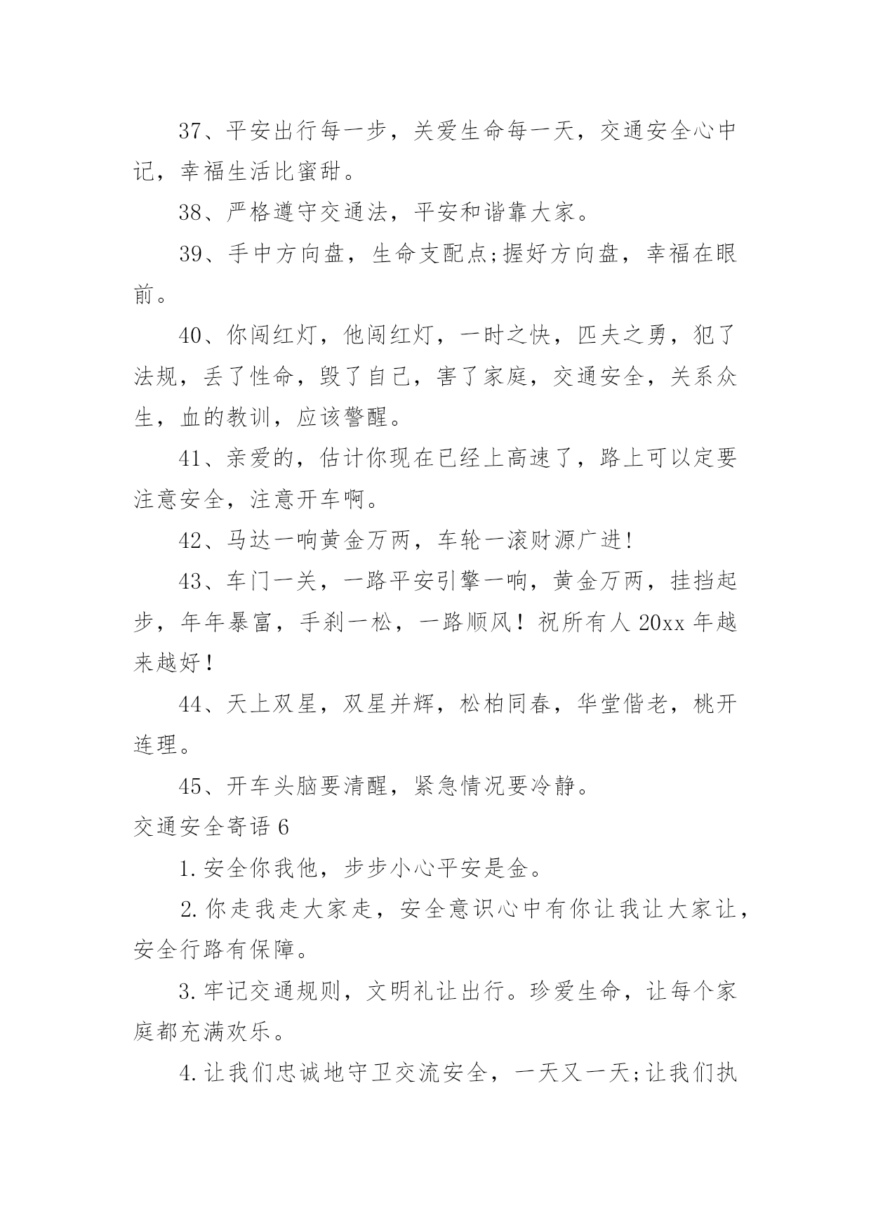 交通安全寄语交通安全寄语在我们平凡的日常里,大家总少不了要接触或使用寄语吧,通过寄语人们可以心中的所思所想表达出来。那什么样的寄语才是好的寄语呢?以下是小编收集整理的交通安全寄语,希望对大家有所帮助。交通安全寄语11.严格遵守交通法,平安和谐靠大家。2.彼此多一分理解和谦让路上便多一分安静与和谐。3.安全是我们幸福的前提和基础,是社会稳定和发展的保障。预防交通事故,保障交通安全,确保出入平安,是你我的共同追求,也是亲人朋友的共同期盼。4.安全是天责任如山永挂心间。抓好常规,以防为主,创造一个平安和谐洁净幽雅的.教育环境,用爱心呵护每一片绿色,让每一个学生快乐健康地成长。5.生命无返程-珍惜生命;安全出行,从我做起。6.父母慈祥的笑脸,爱人温馨的笑脸,儿女灿烂的笑脸;尽在你安全行路。7.生命无返程,珍惜生命,安全出行,从我做起。8.酒后驾车生命打折。9.世上的路千万条,安全行驶一线牵;生活的情万万千,关爱生命才久远。10.眼看前方,环顾两旁。红灯停绿灯行,斑马线上走行人。11.世界上有许多事是无法挽回的,也许在你几秒钟的快速后,等待你的是一辈子的悔恨。12.方向盘重又圆,安全法记心间,酒色气全不沾,疲劳车更不玩,保安全重如山,日月年幸福连。13.过马路左右看,不要在马路上跑和玩。14.宁等分,不抢一秒。交通安全寄语21.世界的多姿多彩,你在慢行中才能体会得到。2.你走,我走,大家走,安全意识心中有;你让,我让,大家让,安全行路有保障。3.要让爱车跑,车况要良好;开车别太快,系好安全带;出门要提前,堵车心不烦;行车要礼让,路口多张望;夜行勤变灯,车距要适中;时刻想安全,平安永相伴。4.一人出车全家念,一人平安全家福。5.车漫漫,路漫漫,握好手中方向盘;情相伴,爱相伴,绷紧交通安全带。6.交通安全,人人有则。遵守法规,从我做起。7.没有红绿灯的交相呼应,就没有生命的五彩缤纷。8.迈文明步子,行安全车子,做谦让君子,享平安日子。9.安全是父母的寄托,安全是妻子的企盼,安全是朋友的祝福,安全是儿女的心愿。10.带一分小心上路,携一团温馨回家。11.遵规驾驶有速度,珍惜生命是成熟,出入平安是祝福,合家团圆享富足。12.严格遵守交通法,平安和谐靠大家。13.彼此多一分理解和谦让路上便多一分安静与和谐。14.安全是我们幸福的前提和基础,是社会稳定和进展的保障。预防交通事故,保障交通安全,确保出入平安,是你我的共同追求,也是亲人朋友的共同期盼。15.安全是天责任如山永挂心间。抓好常规,以防为主,制造一个平安和谐干净幽雅的教育环境,用爱心呵护每一片绿色,让每一个学生欢乐健康地成长。16.生命无返程-珍惜生命;安全出行,从我做起。17.父母慈爱的笑脸,爱人温馨的笑脸,儿女灿烂的笑脸;尽在你安全行路。18.生命无返程,珍惜生命,安全出行,从我做起。19.酒后驾车生命打折。20.世上的路千万条,安全行驶一线牵;生活的情万万千,关爱生命才久远。21.眼看前方,环顾两旁。红灯停绿灯行,斑马线上走行人。22.世界上有许多事是无法挽回的,也许在你几秒钟的快速后,等待你的'是一辈子的悔恨。23.方向盘重又圆,安全法记心间,酒色气全不沾,疲劳车更不玩,保安全重如山,日月年幸福连。24.过马路左右看,不要在马路上跑和玩。25.车漫漫,路漫漫,握好手中方向盘;情相伴,爱相伴,绷紧交通安全带。26.交通安全,人人有则。遵守法规,从我做起。27.没有红绿灯的交相呼应,就没有生命的五彩缤纷。28.迈文明步子,行安全车子,做谦让君子,享平安日子。29.安全是父母的寄托,安全是妻子的企盼,安全是朋友的祝福,安全是儿女的心愿。30.交通你我他,关系千万家,关心交通,关爱生命。31.心无交规,路有坎坷乱穿马路,失道无助。32.遵守交通规则,安全在每个人手中。33.走过春夏秋冬,安全永驻心中。交通安全寄语31、绳套松逮不住恶狼,制度松防不了祸患。2、好拳不在花样巧,安全别光嘴上叫。3、车辆超载一吨危险增加十分。4、安全与生命一线索幸福和安全两相连。5、生命只有一次平安伴君一生。6、群策群力科学管理,戒骄戒躁杜绝事故。7、病树的医生是啄木鸟,隐患的医生是安全员。8、停让躲慢要果断犹豫不决出祸端。9、违章铸成终身悔守规伴你一世安。10、遵守交通法规关爱生命旅程。11、实线虚线斑马线都是生命安全线。12、守交规迎春夏秋冬福保安全纳东西南北财。13、虽为坦途超速者戒纵有捷径乱穿者止。14、好钢靠锻打,安全要严抓。15、心头常亮红绿灯安全行驶伴人生。16、居安思危危自小有备无患患可除。17、大哥大方向盘同时使用最危险。18、大事化小,教训难找;小事化了,后患不少。交通安全寄语41、关爱每一个孩子,他们的成长是我最大的快乐!2、热心对待工作,真心呵护幼儿,诚心服务家长。3、做孩子们的教育者,