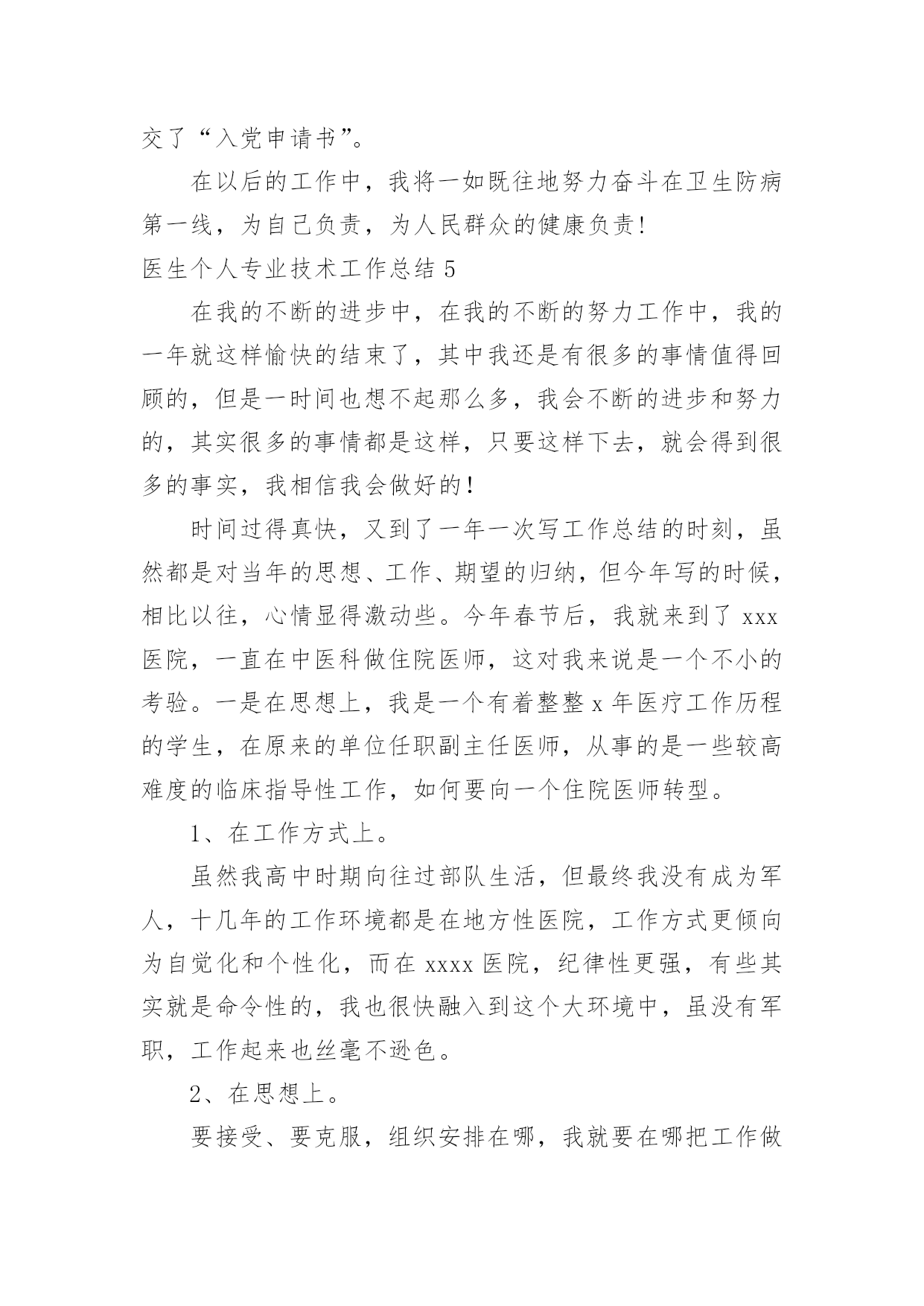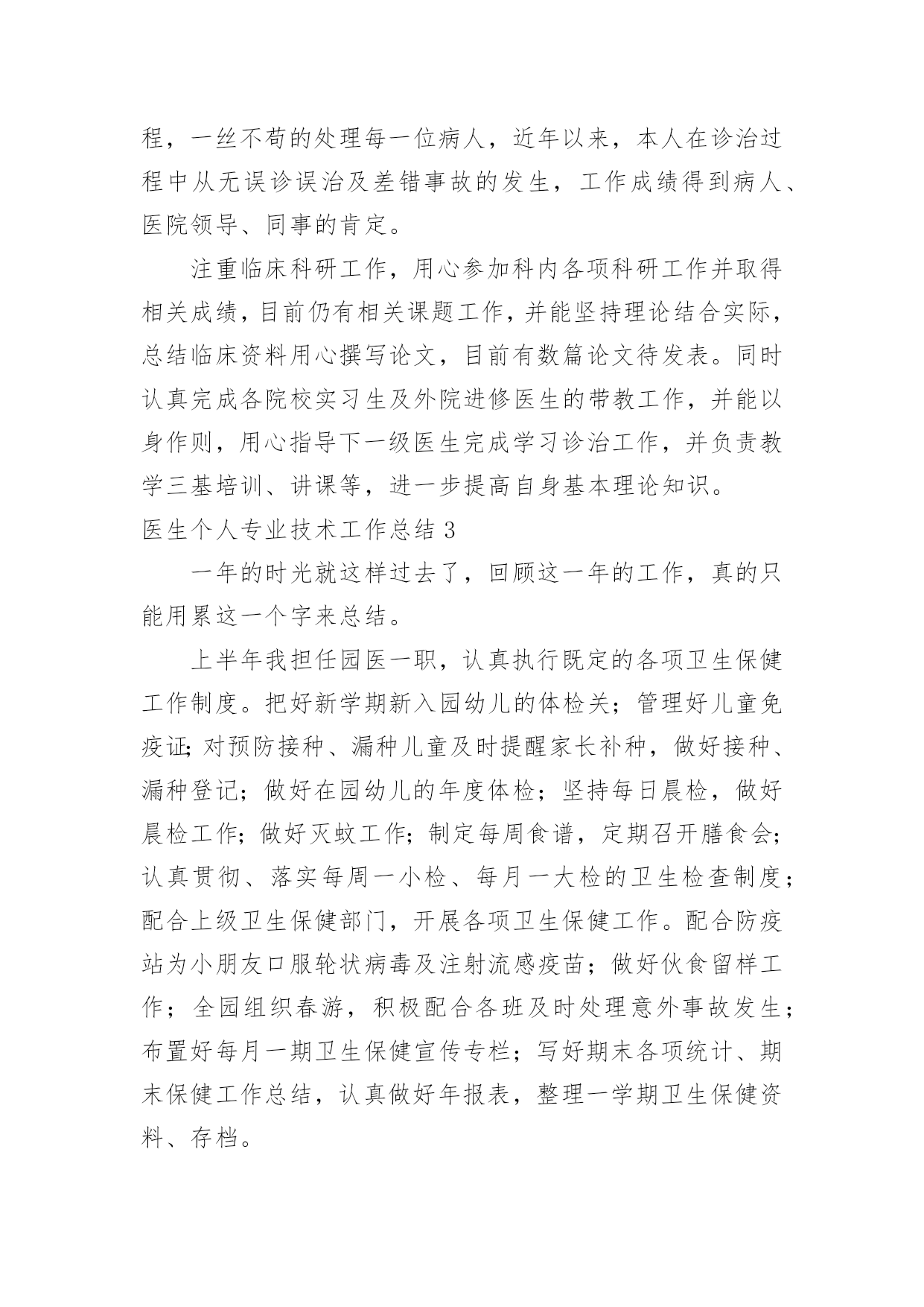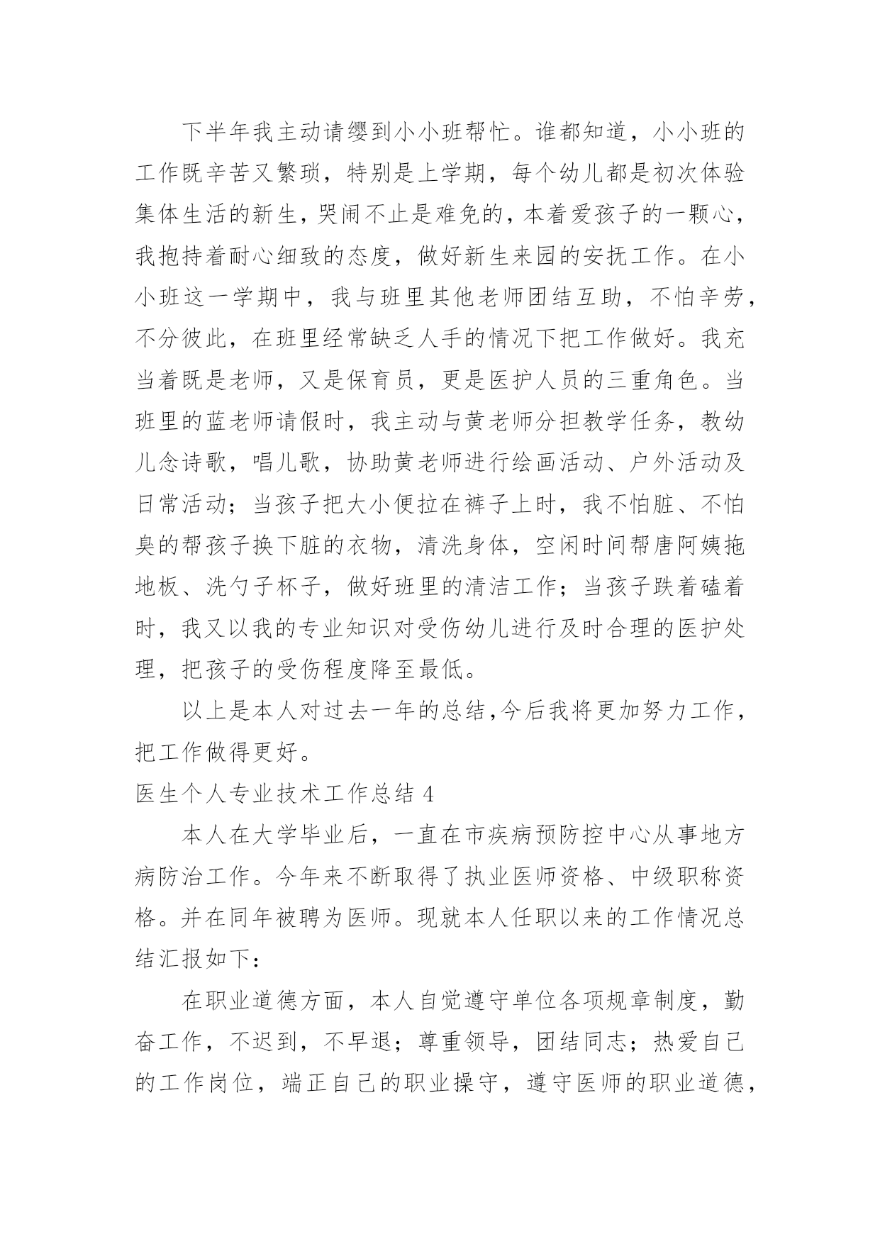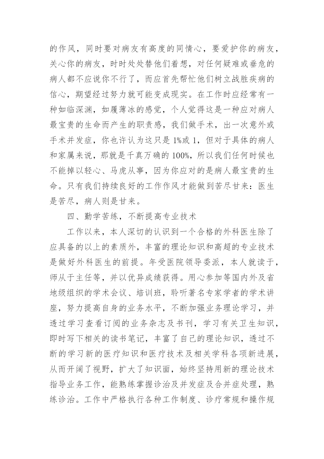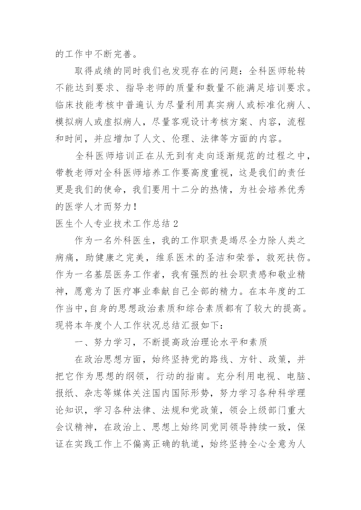 医生个人专业技术工作总结医生个人专业技术工作总结(精选15篇)总结是把一定阶段内的有关情况分析研究,做出有指导性的经验方法以及结论的书面材料,它可以促使我们思考,因此,让我们写一份总结吧。我们该怎么写总结呢?下面是小编收集整理的医生个人专业技术工作总结,欢迎阅读,希望大家能够喜欢。医生个人专业技术工作总结1全科医师的培训是医学生毕业后教育的重要组成部分,对于培训全科医师,提高医疗质量极为重要,是医学临床专家形成过程的关键所在。我科在陈启松院长的领导下,结合院内的实际情况,对院内全科医师进行了比较规范的一系列培训。1、高尚医德及责任意识的培养:医德观念模糊影响医生的进步及行业发展,即损害了卫生行业的形象,还造成了恶劣的社会影响问题。而医生的技术水平与其责任心呈正比,没有责任心的医生不可能用心观察病人、处理病人,故其技术水平也不会很高,甚至引发医疗纠纷。我院在全科医师培训中强化职业道德和责任意识的培养,督促带教老师以身作则树榜样,潜移默化感染规范化培训医师,同时带教老师需结合工作中所遇到的具体情况有针对性的进行分析、讨论,抓住典型,深入剖析,培养规范化培训医师抵制非道德行为的坚决性和长期性。2、强化医患沟通能力的培养:融洽的医患关系能有效地预防和减少医疗纠纷的发生,而沟通障碍是导致患者及其家属对医院和医务人员信任度下降的重要因素,也是引发医疗纠纷的潜在危险因素。因此,我们在培训过程中提倡“多作换位思考,真诚关心患者”。一些看起来微不足道的动作可以换来病人高度的信任,比如查房时与病人握握手,晚上查房时帮病人掖一下被角等。规范化培训医师要从细微之处体现“以人为本”的服务理念,这对提高医患沟通能力有着巨大的推动作用。3、参与临床研究,开拓科研思维:我科在全科医师全面素质训练中还增加了临床科研能力培训和专业外语阅读项目,要求培训人员在接受培训期间参加科里科研工作,从中培养研究思路和严谨的科学态度。目的是让其了解本学科的发展以及新知识、新技能,跟上时代的脚步。4、基础理论培训以集中授课为主,每月定期召开全科医师例会,并请医院外出进修回来的医、技师授课一次。临床实践培训,全科医师深入科室后由科主任指定主治医师、副高或以上职称的指导教师负责,实行指导教师与上级医师集体指导相结合的培训方式。5、加强评估和考核:建立、实施质量评估及考核制度,包括培训质量及组织管理水平等方面的评估、检查,认真组织出科考核。评估、考核的目的是对临床医师参加培训的情况进行检验,同时也能发现培训中存在的不足,使之在今后的工作中不断完善。取得成绩的同时我们也发现存在的问题:全科医师轮转不能达到要求、指导老师的质量和数量不能满足培训要求。临床技能考核中普遍认为尽量利用真实病人或标准化病人、模拟病人或虚拟病人,尽量客观设计考核方案、内容,流程和时间,并应增加了人文、伦理、法律等方面的内容。全科医师培训正在从无到有走向逐渐规范的过程之中,带教老师对全科医师培养工作要高度重视,这是我们的责任更是我们的使命,我们要用十二分的热情,为社会培养优秀的医学人才而努力!医生个人专业技术工作总结2作为一名外科医生,我的工作职责是竭尽全力除人类之病痛,助健康之完美,维系医术的圣洁和荣誉,救死扶伤。作为一名基层医务工作者,我有强烈的社会职责感和敬业精神,愿意为了医疗事业奉献自己全部的精力。在本年度的工作当中,自身的思想政治素质和综合素质都有了较大的提高。现将本年度个人工作状况总结汇报如下:一、努力学习,不断提高政治理论水平和素质在政治思想方面,始终坚持党的路线、方针、政策,并把它作为思想的纲领,行动的指南。充分利用电视、电脑、报纸、杂志等媒体关注国内国际形势,努力学习各种科学理论知识,学习各种法律、法规和党政策,领会上级部门重大会议精神,在政治上、思想上始终同党同领导持续一致,保证在实践工作上不偏离正确的轨道,始终坚持全心全意为人民服务的主导思想,坚持改革、发展和不断进取,不断提高自己的政治理论水平,用心参加医院组织的各种政治学习及教育活动。同时,透过认真学习有关国家医疗卫生政策,医疗卫生理论及技能,不断武装自己的头脑。时刻牢记为人民服务的宗旨,明白自己所肩负的职责,并根据工作中实际状况,努力用理论指导实践,以客观事实为依据,在实践中不断总结经验教训并结合本职工作,解决自己在工作中遇到的问题。二、恪尽职守,重视自身道德修养当年我步入神圣的医学学府的时候,我就曾在学生大会上庄严宣誓过:我志愿献身医学,热爱祖国,忠于人民,恪守医德,尊师守纪,刻苦钻研,孜孜不倦,精益求精,全面发展。我决心竭尽全力除人类之病痛,助健康之完美,维系医术的圣洁和荣誉,救死扶伤,不辞艰辛,执着追求。为祖国医药卫生事业的。发展和人类身心健康奋斗终生。时至今日,我仍牢记在心并不断的努力着。医乃仁术,无德不立。大医有魂,生生不息