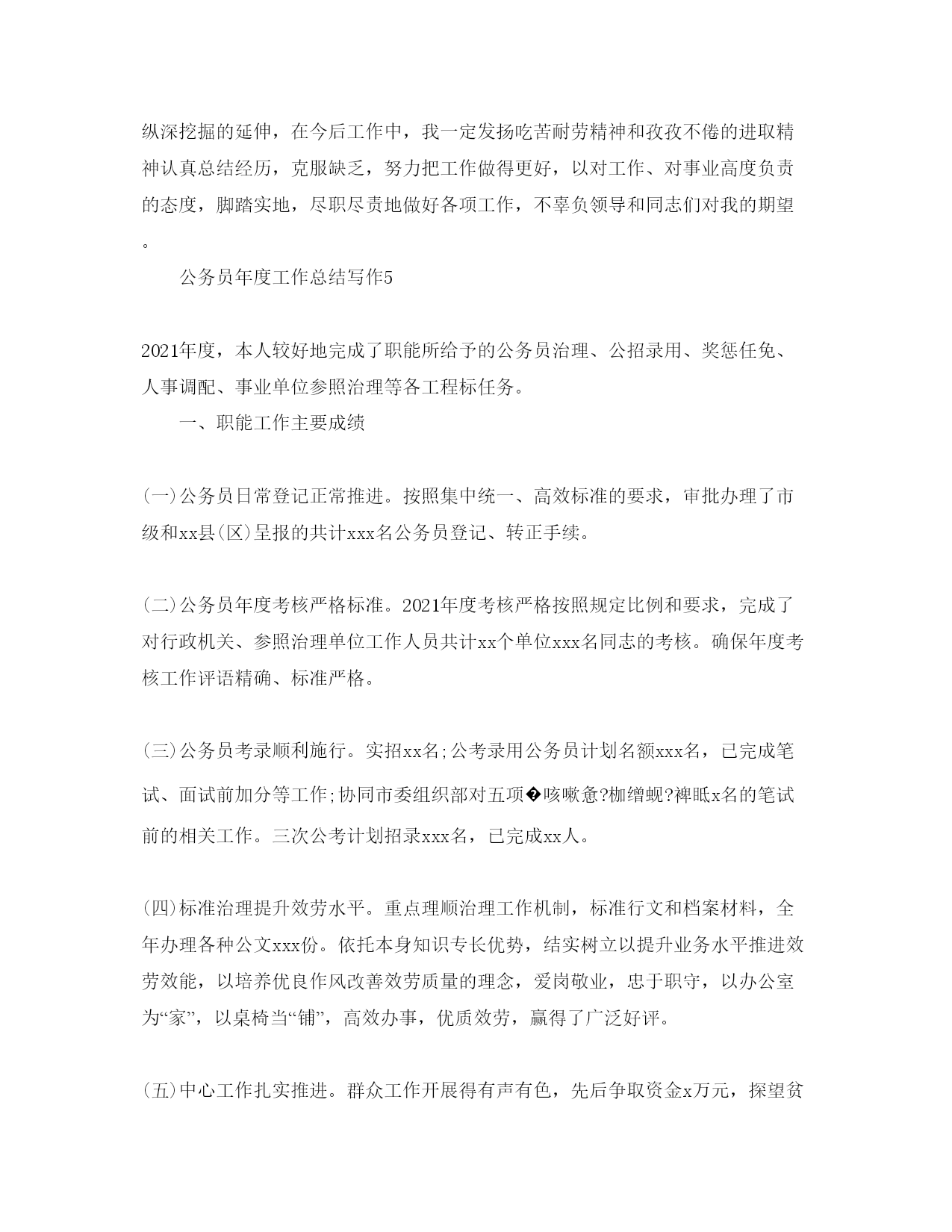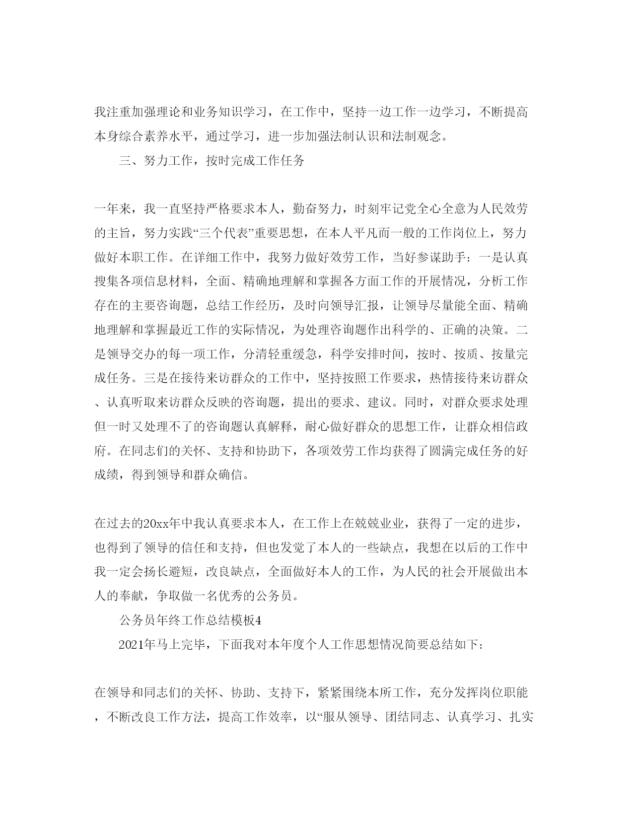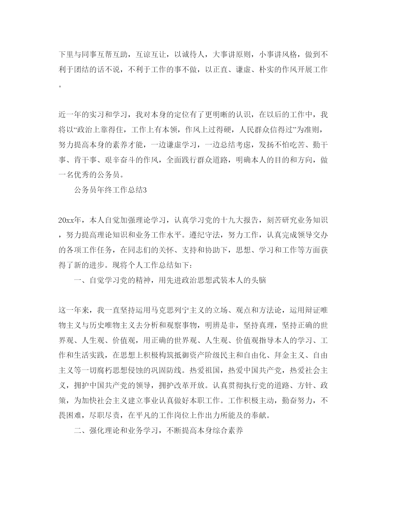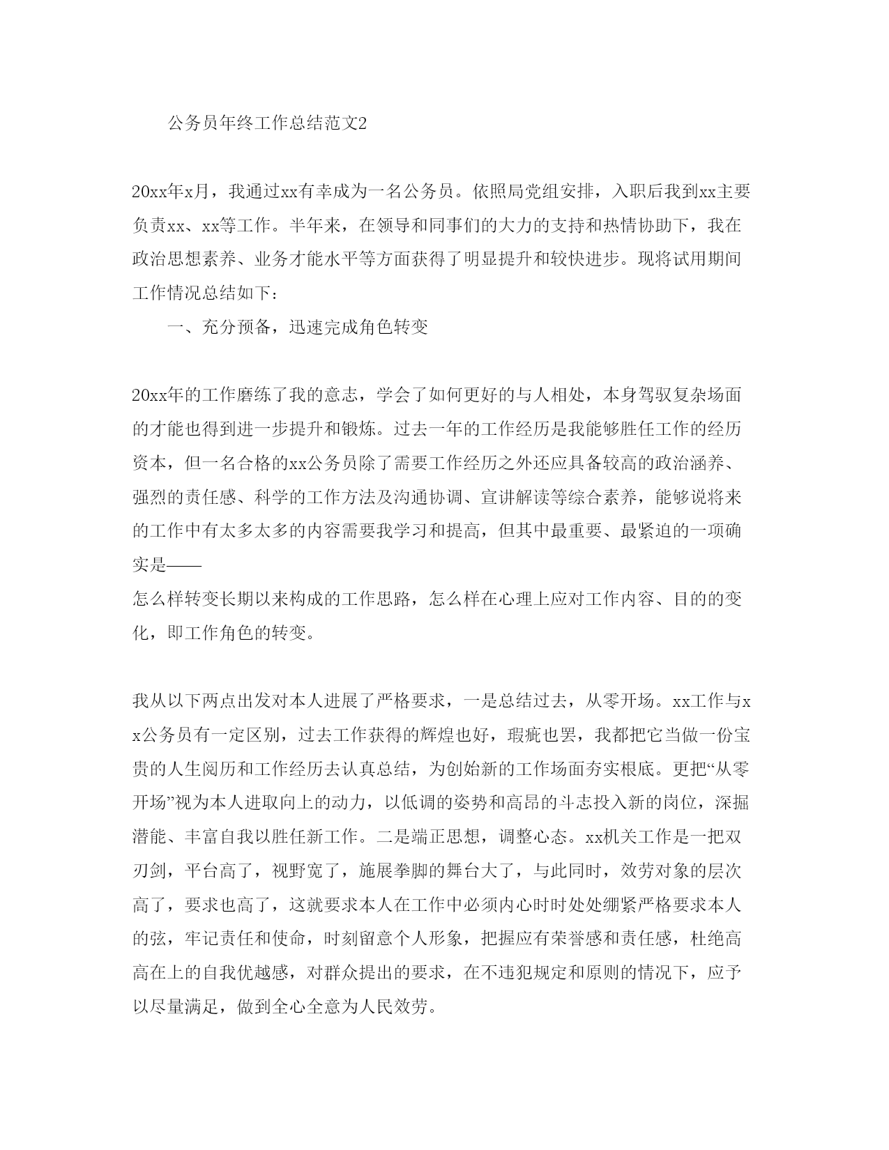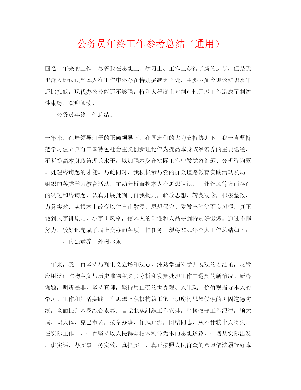 公务员年终工作参考总结(通用)回忆一年来的工作,尽管我在思想上、学习上、工作上获得了新的进步,但是我也深入地认识到本人在工作中还存在特别多缺乏之处,主要表如今理论知识水平还比拟低,现代办公技能还不够强,特别大程度上对制造性开展工作造成了制约性束缚。欢迎阅读。公务员年终工作总结1一年来,在局领导班子的正确领导下,在同志们的大力支持协助下,我一直坚持把学习建立具有中国特色社会主义创新理论作为提高本身政治素养的主要途径,不断提高本身政策理论水平,以加强本身在实际工作中发觉咨询题、分析咨询题、处理咨询题的才能。与此同时,我积极参与党的群众道路教育实践活动及局上组织的各类学习教育活动,主动分析查找本人在思想认识、工作作风等方面存在的缺乏和咨询题,认真开展批判与自我批判,解放思想,转变观念,积极整改,力务实效,从根本上改变以往自由散漫、思想保守、爱发牢骚等不良习惯,真正做到大事讲原则,小事讲风格,使本人的党性和人品得到特别好锻炼。通过不懈努力,较好地完成了局上交办的各项工作任务,现将20xx年个人工作总结如下:一、内强素养,外树形象一年来,我一直坚持马列主义立场和观点,纯熟掌握科学开展观的方法论,灵敏应用辩证唯物主义与历史唯物主义去分析和发觉处理工作中遇到的新情况、新咨询题,明辨是非,坚持真理,坚持用正确的世界观、人生观、价值观指导本人的学习、工作和生活实践,在思想上积极构筑抵御一切腐朽思想侵蚀的巩固道德防线,全面提升本身综合素养。自觉服从组织工作安排,严格恪守工作纪律,顾大局、识大体,克己奉公,按章办事,作风正派,团结同志,从不计较个人得失。在实际工作中,一直坚持以人民群众根本利益为本的思想道路,一切从实际出发,讲实话,办实事,务实效,真抓实干,真正按照人民群众的意愿依法履行好本人的职责,积极参与各种方式的社会救助实践活动,以实际行动兑现本人作为一名构建社会主义和谐社会的坚决拥护者、执政为民的实践者、遵纪守法的倡导者的庄严承诺。二、强化理论和业务学习,不断提高本身综合素养在实际工作中,我一直坚持把理论学习作为提高本身综合素养的最有效途径抓实抓好,抓出成效。一方面我积极参与局上组织各类学习教育活动,不断积累理论知识、努力提高工作技能的同时,积极报名参加省、市、县组织的各类业务技能知识培训,有针对性地重点学习掌握了公文写作、电脑操作技能及法律法规知识,使本人在实际工作技能上有较大提高和进步,真正做到学习工作两不误、两促进、两提高。三、努力加强党性锻炼,不断加强拒腐防变才能多年来,我积极倡导勤政廉洁的优良作风。不管在生活上依然在工作上,我一直保持着节省习惯,慎细慎微,从不大意,时刻检点着本人的言行,严格执行卫生干部工作纪律,从不向被下属单位吃拿卡要,并自觉接受社会监视;时刻牢记党的主旨,严守党的纪律,坚决与享乐主义、拜金主义、方式主义、官僚主义作斗争,反对一切方式的浪费之风、奢侈之风、腐化之风,以实际行动维护社会公平正义。四、努力工作,按时全面完成各项工作任务一年来,我遵照领导安排,对局上交办的每一项工作任务,都能做到分清轻重缓急,科学安排时间,按时、按质、按量地完成各项工作任务。因而,在今后工作中,我一定要认真克服缺点,发扬成绩,自觉把本人置于党组织和群众的监视之下,刻苦学习、勤奋工作,全面完成组织交给的各项工作任务,真正做一名组织信任、人民满意的合格公务员。公务员年终工作总结范文220xx年x月,我通过xx有幸成为一名公务员。依照局党组安排,入职后我到xx主要负责xx、xx等工作。半年来,在领导和同事们的大力的支持和热情协助下,我在政治思想素养、业务才能水平等方面获得了明显提升和较快进步。现将试用期间工作情况总结如下:一、充分预备,迅速完成角色转变20xx年的工作磨练了我的意志,学会了如何更好的与人相处,本身驾驭复杂场面的才能也得到进一步提升和锻炼。过去一年的工作经历是我能够胜任工作的经历资本,但一名合格的xx公务员除了需要工作经历之外还应具备较高的政治涵养、强烈的责任感、科学的工作方法及沟通协调、宣讲解读等综合素养,能够说将来的工作中有太多太多的内容需要我学习和提高,但其中最重要、最紧迫的一项确实是——怎么样转变长期以来构成的工作思路,怎么样在心理上应对工作内容、目的的变化,即工作角色的转变。我从以下两点出发对本人进展了严格要求,一是总结过去,从零开场。xx工作与xx公务员有一定区别,过去工作获得的辉煌也好,瑕疵也罢,我都把它当做一份宝贵的人生阅历和工作经历去认真总结,为创始新的工作场面夯实根底。更把“从零开场”视为本人进取向上的动力,以低调的姿势和高昂的斗志投入新的岗位,深掘潜能、丰富自我以胜任新工作。二是端正思想,调整心态。xx机关工作是一把双刃剑,平台高了,视野宽了,施展拳脚的舞台大了,与此同时,