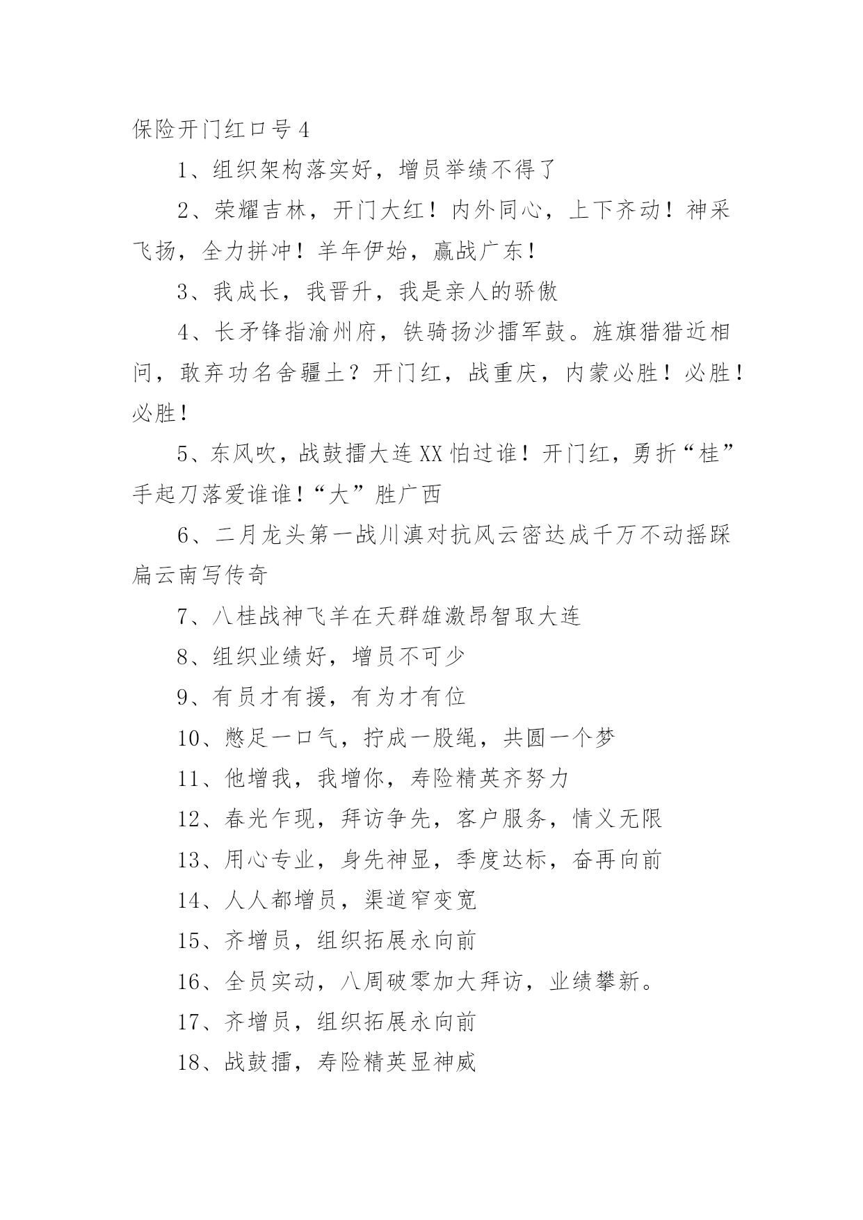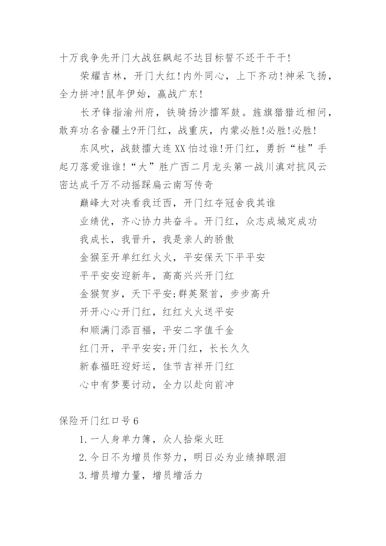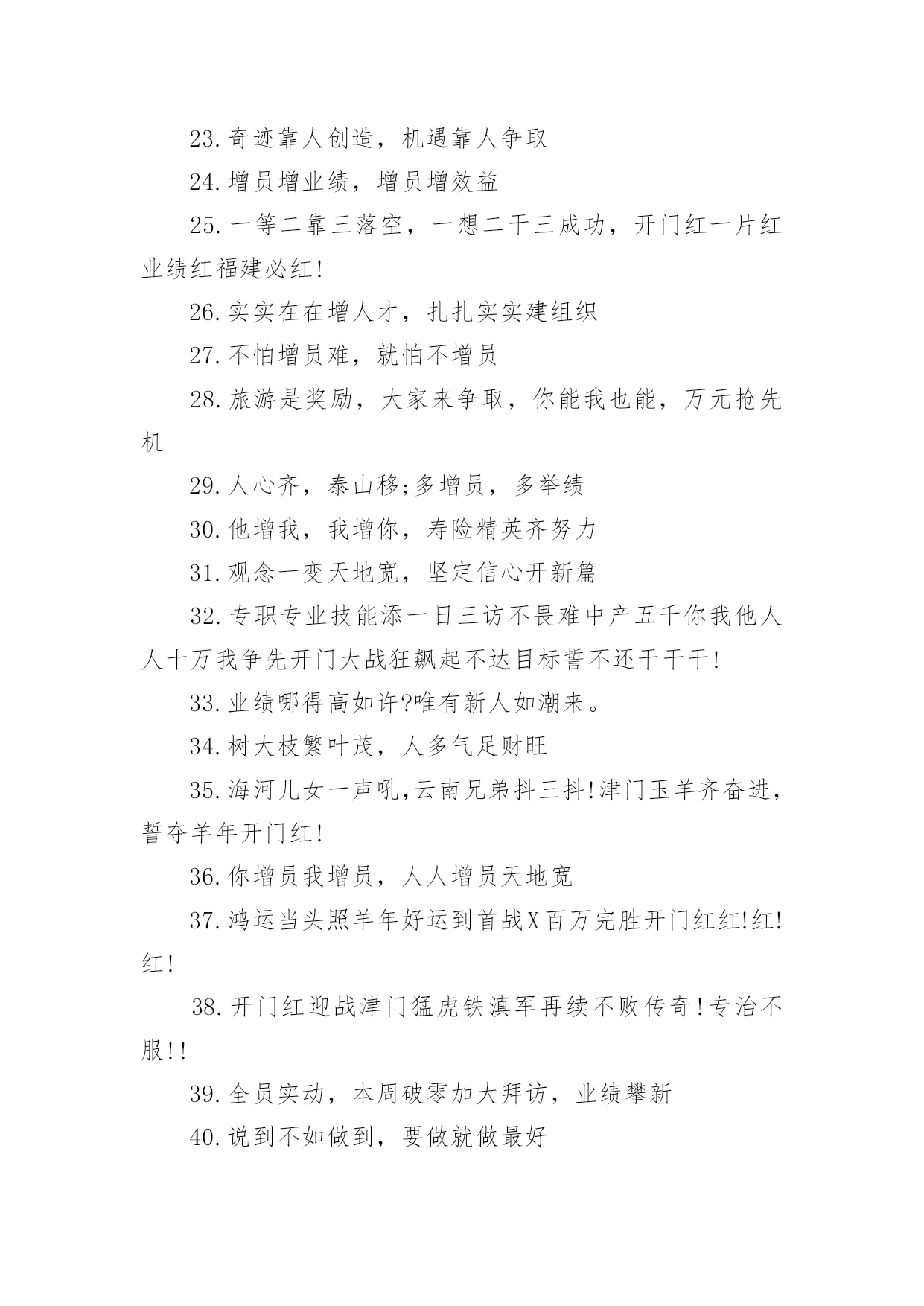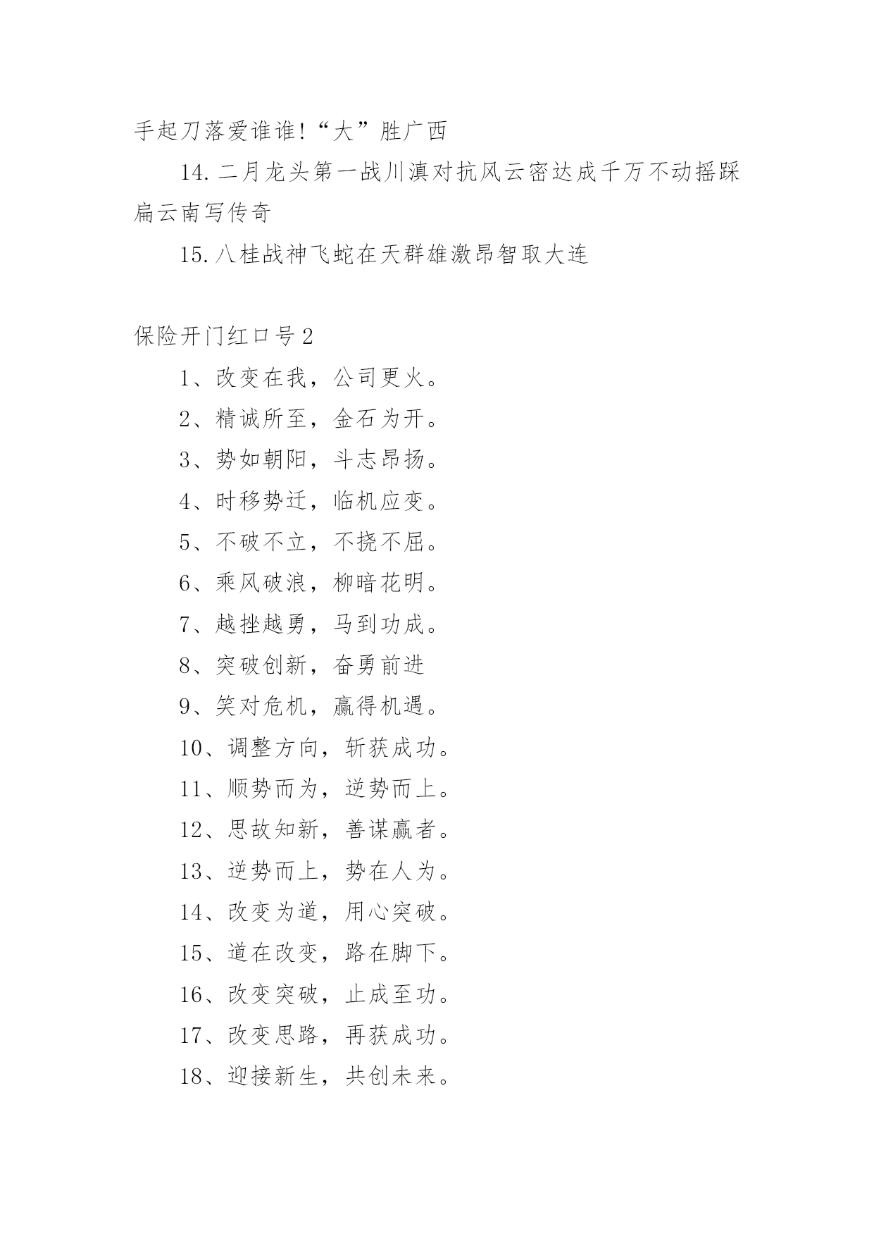 保险开门红口号在日常学习、工作或生活中,说到口号,大家肯定都不陌生吧,口号在句式上,除了简短,容易记忆之外,还要容易念,容易传。其实很多朋友都不太清楚什么样的口号才是好的口号,以下是小编收集整理的保险开门红口号,希望能够帮助到大家。保险开门红口号11.一步先,步步先;开门红,月月红2.从业有缘,借福感恩,坚定信念;行销一生3.用心专业,身先神显,季度达标,奋再向前4.人人心中有目标,失败成功我都要5.心中有梦不认命,全员实动一条心6.风起云涌金猴至,势不可挡开门红7.金猴送福,开门大红,票子多多,福气多多8.争分夺秒勤拜访,广积客户备战忙9.改变思路,再获成功。10.越挫越勇,马到功成。11.我成长,我晋升,我是亲人的骄傲12.长矛锋指渝州府,铁骑扬沙擂军鼓。旌旗猎猎近相问,敢弃功名舍疆土?开门红,战重庆,内蒙必胜!必胜!必胜!13.东风吹,战鼓擂大连XX怕过谁!开门红,勇折“桂”手起刀落爱谁谁!“大”胜广西14.二月龙头第一战川滇对抗风云密达成千万不动摇踩扁云南写传奇15.八桂战神飞蛇在天群雄激昂智取大连保险开门红口号21、改变在我,公司更火。2、精诚所至,金石为开。3、势如朝阳,斗志昂扬。4、时移势迁,临机应变。5、不破不立,不挠不屈。6、乘风破浪,柳暗花明。7、越挫越勇,马到功成。8、突破创新,奋勇前进9、笑对危机,赢得机遇。10、调整方向,斩获成功。11、顺势而为,逆势而上。12、思故知新,善谋赢者。13、逆势而上,势在人为。14、改变为道,用心突破。15、道在改变,路在脚下。16、改变突破,止成至功。17、改变思路,再获成功。18、迎接新生,共创未来。19、狭路亮剑,勇者取胜。20、金猴送福,开门大红,票子多多,福气多多21、稳定市场,重在回访精心打理,休养生息22、红五月里拜访忙,业绩过半心不慌23、服务回访辞旧岁,全力举绩贺新春24、恭喜发财多拜访,全员破零开好张25、长期经营,积累客户充分准备,伺机而行26、全员实动,本周破零加大拜访,业绩攀新27、赢在开门,胜在猴年28、追求卓越,挑战自我全力以赴,目标达成29、一步先,步步先;开门红,月月红30、从业有缘,借福感恩,坚定信念;行销一生保险开门红口号3金猴送福,开门大红,票子多多,福气多多爆竹辞旧岁,平安开门红鸿运当头照鼠年好运到首战X百万完胜开门红红!红!红!二月龙头第一战川滇对抗风云密达成千万不动摇踩扁云南写传奇群英聚首平安,共创新开门红开门红,红门开,平平安安好运来稳定市场,重在回访精心打理,休养生息红五月里拜访忙,业绩过半心不慌服务回访辞旧岁,全力举绩贺新春恭喜发财多拜访,全员破零开好张长期经营,积累客户充分准备,伺机而行全员实动,本周破零加大拜访,业绩攀新赢在开门,胜在鼠年追求卓越,挑战自我全力以赴,目标达成一步先,步步先;开门红,月月红从业有缘,借福感恩,坚定信念;行销一生用心专业,身先神显,季度达标,奋再向前人人心中有目标,失败成功我都要心中有梦不认命,全员实动一条心风起云涌金猴至,势不可挡开门红组织业绩好,增员不可少有员才有援,有为才有位憋足一口气,拧成一股绳,共圆一个梦观念一变天地宽,坚定信心开新篇业绩哪得高如许?唯有新人如潮来。树大枝繁叶茂,人多气足财旺你增员我增员,人人增员天地宽开门红迎战津门猛虎铁滇军再续不败传奇!专治不服!!说到不如做到,要做就做快马加鞭抓增员,齐心协力促发展成功看得见,行动是关键保险开门红口号41、组织架构落实好,增员举绩不得了2、荣耀吉林,开门大红!内外同心,上下齐动!神采飞扬,全力拼冲!羊年伊始,赢战广东!3、我成长,我晋升,我是亲人的骄傲4、长矛锋指渝州府,铁骑扬沙擂军鼓。旌旗猎猎近相问,敢弃功名舍疆土?开门红,战重庆,内蒙必胜!必胜!必胜!5、东风吹,战鼓擂大连XX怕过谁!开门红,勇折“桂”手起刀落爱谁谁!“大”胜广西6、二月龙头第一战川滇对抗风云密达成千万不动摇踩扁云南写传奇7、八桂战神飞羊在天群雄激昂智取大连8、组织业绩好,增员不可少9、有员才有援,有为才有位10、憋足一口气,拧成一股绳,共圆一个梦11、他增我,我增你,寿险精英齐努力12、春光乍现,拜访争先,客户服务,情义无限13、用心专业,身先神显,季度达标,奋再向前14、人人都增员,渠道窄变宽15、齐增员,组织拓展永向前16、全员实动,八周破零加大拜访,业绩攀新。17、齐增员,组织拓展永向前18、战鼓擂,寿险精英显神威19、增员增贤增人气,经营发展促业绩20、知难而进,重铸辉煌21、一人身单力簿,众人拾柴火旺22、今日不为增员作努力,明日必为业绩掉眼泪23、增员增力量,增员增活力24、奇迹靠人创造,机遇靠人争取25、增员增业绩,增员增效益26、一等二靠三落空,一想二干三成功,开门红一片红业绩红福建必红!27、实实在在增人才,扎扎实实建组织28、不