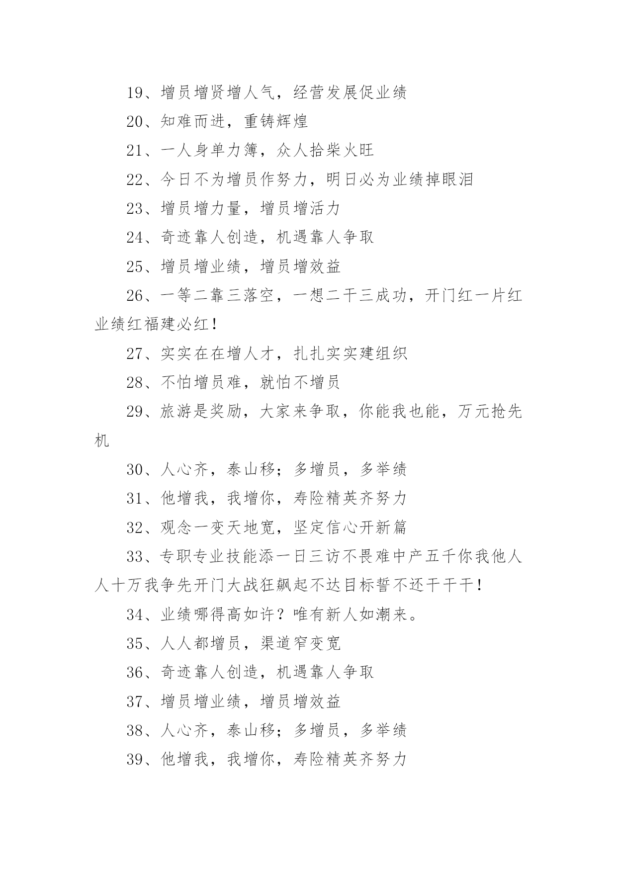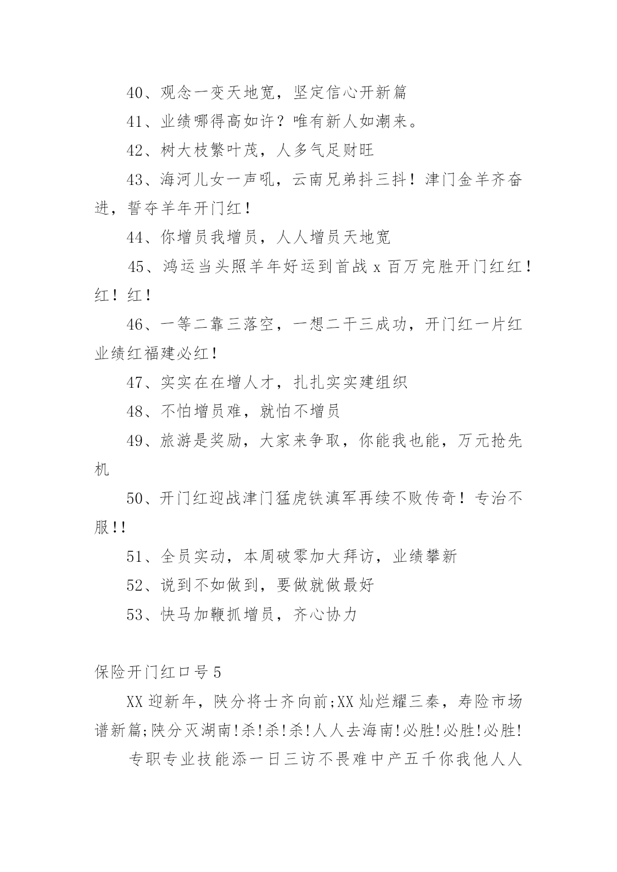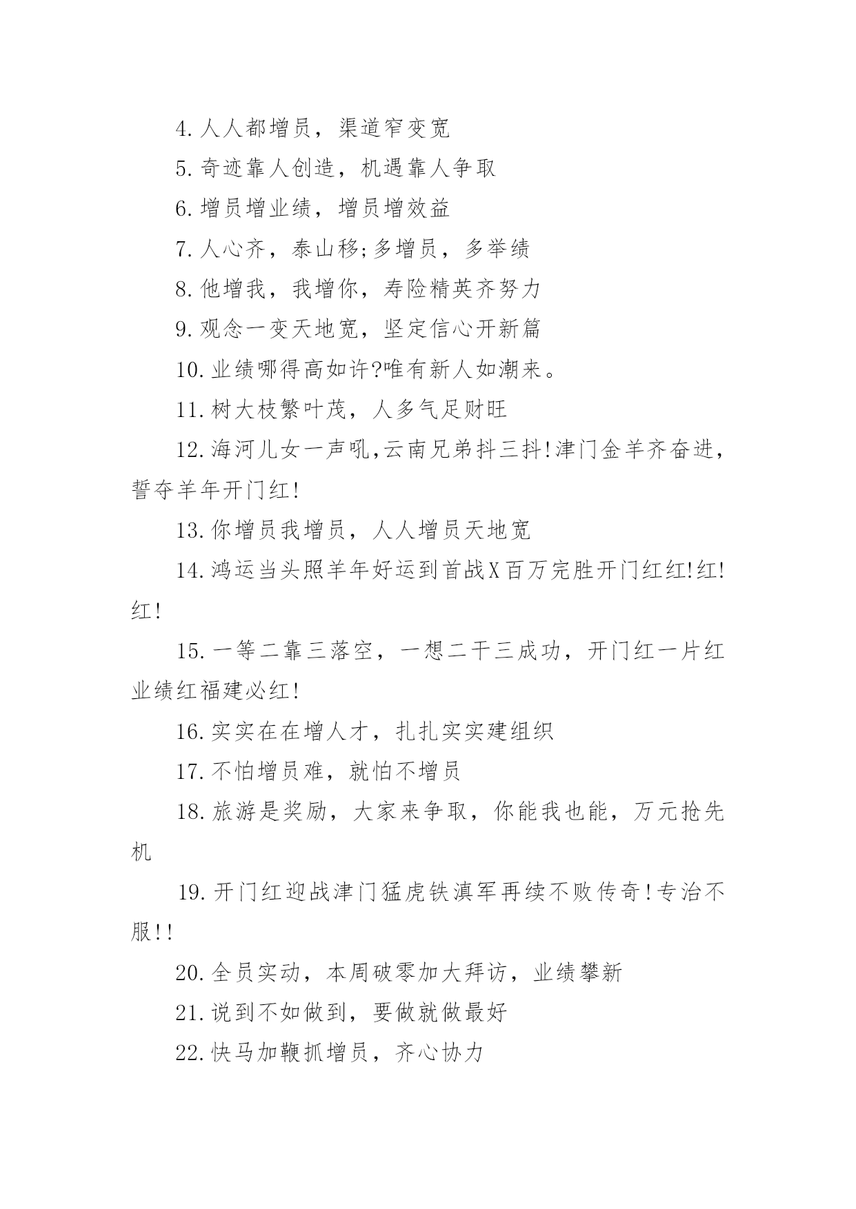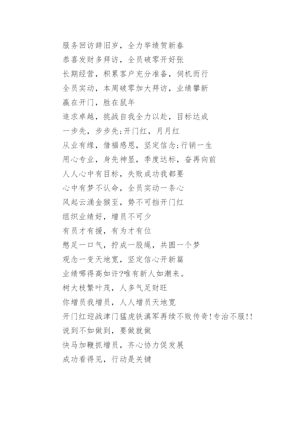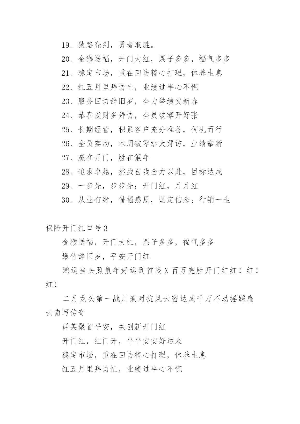 保险开门红口号在日常学习、工作或生活中,说到口号,大家肯定都不陌生吧,口号在句式上,除了简短,容易记忆之外,还要容易念,容易传。其实很多朋友都不太清楚什么样的口号才是好的口号,以下是小编收集整理的保险开门红口号,希望能够帮助到大家。保险开门红口号11.一步先,步步先;开门红,月月红2.从业有缘,借福感恩,坚定信念;行销一生3.用心专业,身先神显,季度达标,奋再向前4.人人心中有目标,失败成功我都要5.心中有梦不认命,全员实动一条心6.风起云涌金猴至,势不可挡开门红7.金猴送福,开门大红,票子多多,福气多多8.争分夺秒勤拜访,广积客户备战忙9.改变思路,再获成功。10.越挫越勇,马到功成。11.我成长,我晋升,我是亲人的骄傲12.长矛锋指渝州府,铁骑扬沙擂军鼓。旌旗猎猎近相问,敢弃功名舍疆土?开门红,战重庆,内蒙必胜!必胜!必胜!13.东风吹,战鼓擂大连XX怕过谁!开门红,勇折“桂”手起刀落爱谁谁!“大”胜广西14.二月龙头第一战川滇对抗风云密达成千万不动摇踩扁云南写传奇15.八桂战神飞蛇在天群雄激昂智取大连保险开门红口号21、改变在我,公司更火。2、精诚所至,金石为开。3、势如朝阳,斗志昂扬。4、时移势迁,临机应变。5、不破不立,不挠不屈。6、乘风破浪,柳暗花明。7、越挫越勇,马到功成。8、突破创新,奋勇前进9、笑对危机,赢得机遇。10、调整方向,斩获成功。11、顺势而为,逆势而上。12、思故知新,善谋赢者。13、逆势而上,势在人为。14、改变为道,用心突破。15、道在改变,路在脚下。16、改变突破,止成至功。17、改变思路,再获成功。18、迎接新生,共创未来。19、狭路亮剑,勇者取胜。20、金猴送福,开门大红,票子多多,福气多多21、稳定市场,重在回访精心打理,休养生息22、红五月里拜访忙,业绩过半心不慌23、服务回访辞旧岁,全力举绩贺新春24、恭喜发财多拜访,全员破零开好张25、长期经营,积累客户充分准备,伺机而行26、全员实动,本周破零加大拜访,业绩攀新27、赢在开门,胜在猴年28、追求卓越,挑战自我全力以赴,目标达成29、一步先,步步先;开门红,月月红30、从业有缘,借福感恩,坚定信念;行销一生保险开门红口号3金猴送福,开门大红,票子多多,福气多多爆竹辞旧岁,平安开门红鸿运当头照鼠年好运到首战X百万完胜开门红红!红!红!二月龙头第一战川滇对抗风云密达成千万不动摇踩扁云南写传奇群英聚首平安,共创新开门红开门红,红门开,平平安安好运来稳定市场,重在回访精心打理,休养生息红五月里拜访忙,业绩过半心不慌服务回访辞旧岁,全力举绩贺新春恭喜发财多拜访,全员破零开好张长期经营,积累客户充分准备,伺机而行全员实动,本周破零加大拜访,业绩攀新赢在开门,胜在鼠年追求卓越,挑战自我全力以赴,目标达成一步先,步步先;开门红,月月红从业有缘,借福感恩,坚定信念;行销一生用心专业,身先神显,季度达标,奋再向前人人心中有目标,失败成功我都要心中有梦不认命,全员实动一条心风起云涌金猴至,势不可挡开门红组织业绩好,增员不可少有员才有援,有为才有位憋足一口气,拧成一股绳,共圆一个梦观念一变天地宽,坚定信心开新篇业绩哪得高如许?唯有新人如潮来。树大枝繁叶茂,人多气足财旺你增员我增员,人人增员天地宽开门红迎战津门猛虎铁滇军再续不败传奇!专治不服!!说到不如做到,要做就做快马加鞭抓增员,齐心协力促发展成功看得见,行动是关键保险开门红口号41、组织架构落实好,增员举绩不得了2、荣耀吉林,开门大红!内外同心,上下齐动!神采飞扬,全力拼冲!羊年伊始,赢战广东!3、我成长,我晋升,我是亲人的骄傲4、长矛锋指渝州府,铁骑扬沙擂军鼓。旌旗猎猎近相问,敢弃功名舍疆土?开门红,战重庆,内蒙必胜!必胜!必胜!5、东风吹,战鼓擂大连XX怕过谁!开门红,勇折“桂”手起刀落爱谁谁!“大”胜广西6、二月龙头第一战川滇对抗风云密达成千万不动摇踩扁云南写传奇7、八桂战神飞羊在天群雄激昂智取大连8、组织业绩好,增员不可少9、有员才有援,有为才有位10、憋足一口气,拧成一股绳,共圆一个梦11、他增我,我增你,寿险精英齐努力12、春光乍现,拜访争先,客户服务,情义无限13、用心专业,身先神显,季度达标,奋再向前14、人人都增员,渠道窄变宽15、齐增员,组织拓展永向前16、全员实动,八周破零加大拜访,业绩攀新。17、齐增员,组织拓展永向前18、战鼓擂,寿险精英显神威19、增员增贤增人气,经营发展促业绩20、知难而进,重铸辉煌21、一人身单力簿,众人拾柴火旺22、今日不为增员作努力,明日必为业绩掉眼泪23、增员增力量,增员增活力24、奇迹靠人创造,机遇靠人争取25、增员增业绩,增员增效益26、一等二靠三落空,一想二干三成功,开门红一片红业绩红福建必红!27、实实在在增人才,扎扎实实建组织28、不