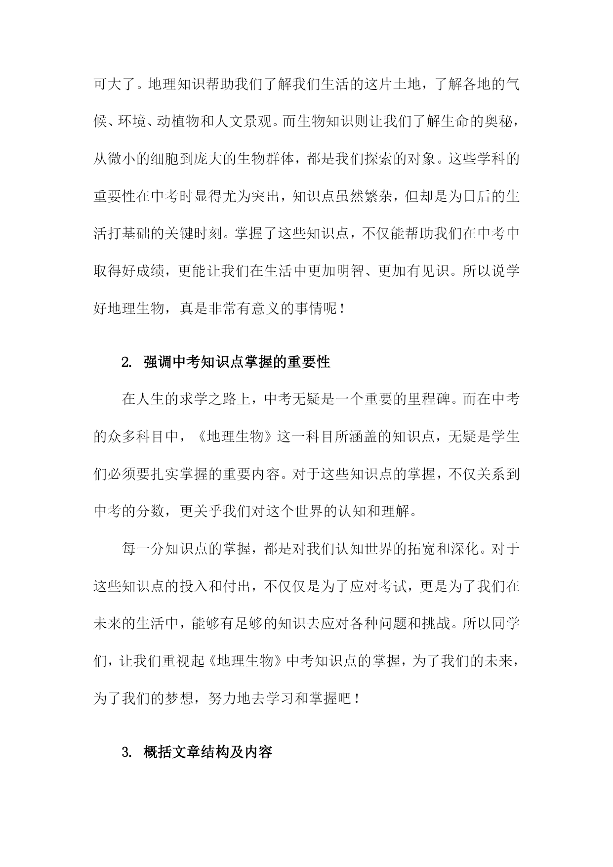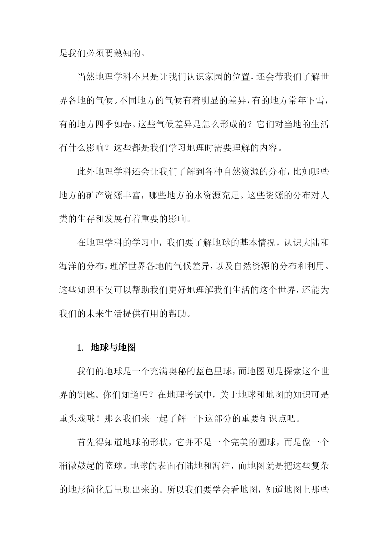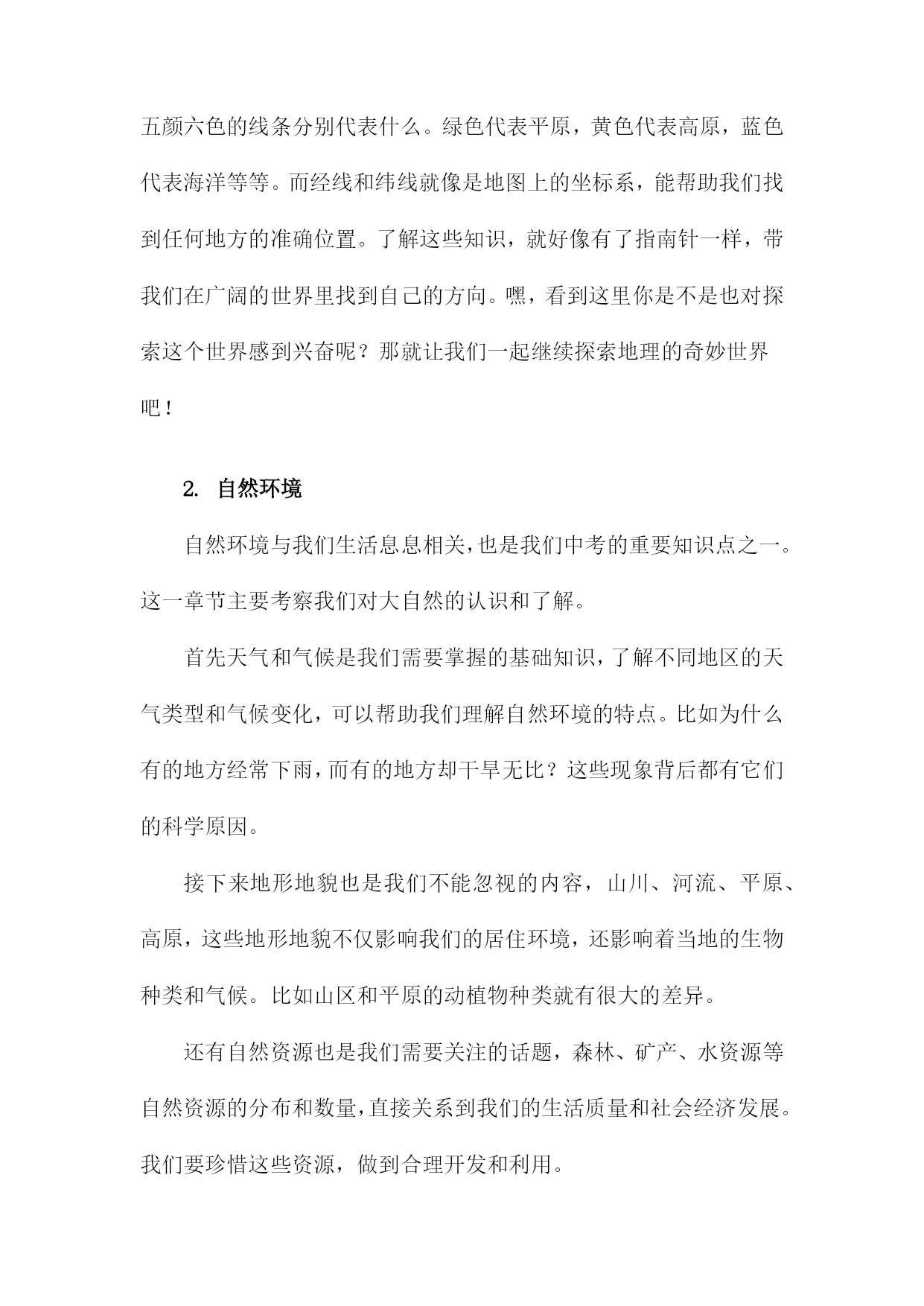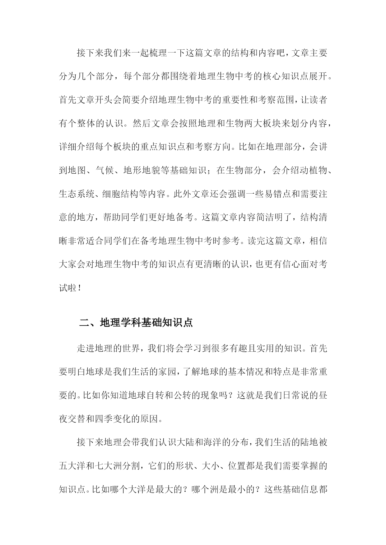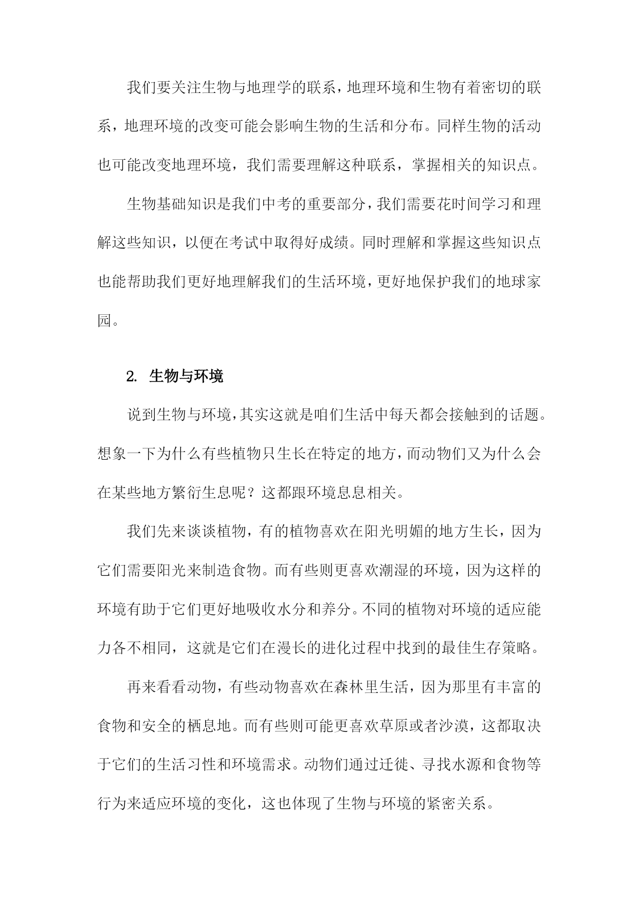地理生物中考知识点一、内容概述亲爱的小伙伴们,接下来的文章将和你一起梳理地理生物中考的重点知识点。不要害怕中考虽然重要,但我们一定可以共同面对,一起进步。首先我们要知道地理生物这门科目主要是考察我们对于地理环境和生物知识的理解和应用。知识点繁多,但只要我们分类梳理,就会发现规律,掌握起来就会得心应手。接下来我们会从地理和生物两大板块进行介绍,地理方面我们会关注地图知识、大洲和海洋的分布、气候类型、自然资源的利用等。生物方面我们会重点了解生物的多样性、生物的分类、生物与环境的关系、人体的生理健康等。每个知识点我们都会进行简明扼要的解释,并且配合实例和图表,帮助你更直观地理解。我们的目标是让你对每一个知识点都有所了解,考试时不慌张,从容应对。1.简述地理生物学科的重要性说起地理生物,你是不是觉得它们都是很深奥的学科呢?其实不然哦,地理和生物知识其实和我们日常生活息息相关,它们的重要性可大了。地理知识帮助我们了解我们生活的这片土地,了解各地的气候、环境、动植物和人文景观。而生物知识则让我们了解生命的奥秘,从微小的细胞到庞大的生物群体,都是我们探索的对象。这些学科的重要性在中考时显得尤为突出,知识点虽然繁杂,但却是为日后的生活打基础的关键时刻。掌握了这些知识点,不仅能帮助我们在中考中取得好成绩,更能让我们在生活中更加明智、更加有见识。所以说学好地理生物,真是非常有意义的事情呢!2.强调中考知识点掌握的重要性在人生的求学之路上,中考无疑是一个重要的里程碑。而在中考的众多科目中,《地理生物》这一科目所涵盖的知识点,无疑是学生们必须要扎实掌握的重要内容。对于这些知识点的掌握,不仅关系到中考的分数,更关乎我们对这个世界的认知和理解。每一分知识点的掌握,都是对我们认知世界的拓宽和深化。对于这些知识点的投入和付出,不仅仅是为了应对考试,更是为了我们在未来的生活中,能够有足够的知识去应对各种问题和挑战。所以同学们,让我们重视起《地理生物》中考知识点的掌握,为了我们的未来,为了我们的梦想,努力地去学习和掌握吧!3.概括文章结构及内容接下来我们来一起梳理一下这篇文章的结构和内容吧,文章主要分为几个部分,每个部分都围绕着地理生物中考的核心知识点展开。首先文章开头会简要介绍地理生物中考的重要性和考察范围,让读者有个整体的认识。然后文章会按照地理和生物两大板块来划分内容,详细介绍每个板块的重点知识点和考察方向。比如在地理部分,会讲到地图、气候、地形地貌等基础知识;在生物部分,会介绍动植物、生态系统、细胞结构等内容。此外文章还会强调一些易错点和需要注意的地方,帮助同学们更好地备考。这篇文章内容简洁明了,结构清晰非常适合同学们在备考地理生物中考时参考。读完这篇文章,相信大家会对地理生物中考的知识点有更清晰的认识,也更有信心面对考试啦!二、地理学科基础知识点走进地理的世界,我们将会学习到很多有趣且实用的知识。首先要明白地球是我们生活的家园,了解地球的基本情况和特点是非常重要的。比如你知道地球自转和公转的现象吗?这就是我们日常说的昼夜交替和四季变化的原因。接下来地理会带我们认识大陆和海洋的分布,我们生活的陆地被五大洋和七大洲分割,它们的形状、大小、位置都是我们需要掌握的知识点。比如哪个大洋是最大的?哪个洲是最小的?这些基础信息都是我们必须要熟知的。当然地理学科不只是让我们认识家园的位置,还会带我们了解世界各地的气候。不同地方的气候有着明显的差异,有的地方常年下雪,有的地方四季如春。这些气候差异是怎么形成的?它们对当地的生活有什么影响?这些都是我们学习地理时需要理解的内容。此外地理学科还会让我们了解到各种自然资源的分布,比如哪些地方的矿产资源丰富,哪些地方的水资源充足。这些资源的分布对人类的生存和发展有着重要的影响。在地理学科的学习中,我们要了解地球的基本情况,认识大陆和海洋的分布,理解世界各地的气候差异,以及自然资源的分布和利用。这些知识不仅可以帮助我们更好地理解我们生活的这个世界,还能为我们的未来生活提供有用的帮助。1.地球与地图我们的地球是一个充满奥秘的蓝色星球,而地图则是探索这个世界的钥匙。你们知道吗?在地理考试中,关于地球和地图的知识可是重头戏哦!那么我们来一起了解一下这部分的重要知识点吧。首先得知道地球的形状,它并不是一个完美的圆球,而是像一个稍微鼓起的篮球。地球的表面有陆地和海洋,而地图就是把这些复杂的地形简化后呈现出来的。所以我们要学会看地图,知道地图上那些五颜六色的线条分别代表什么。绿色代表平原,黄色代表高原,蓝色代表海洋等等。而经线和纬线就像是地图上的坐标系,能帮助我们找到任何地方的准确位置。了解这些知识,就好像有了指南针一样,带我们在广阔的世界里找到自己的方向。嘿,看到这里你是不是也对探索这个世界感到兴奋