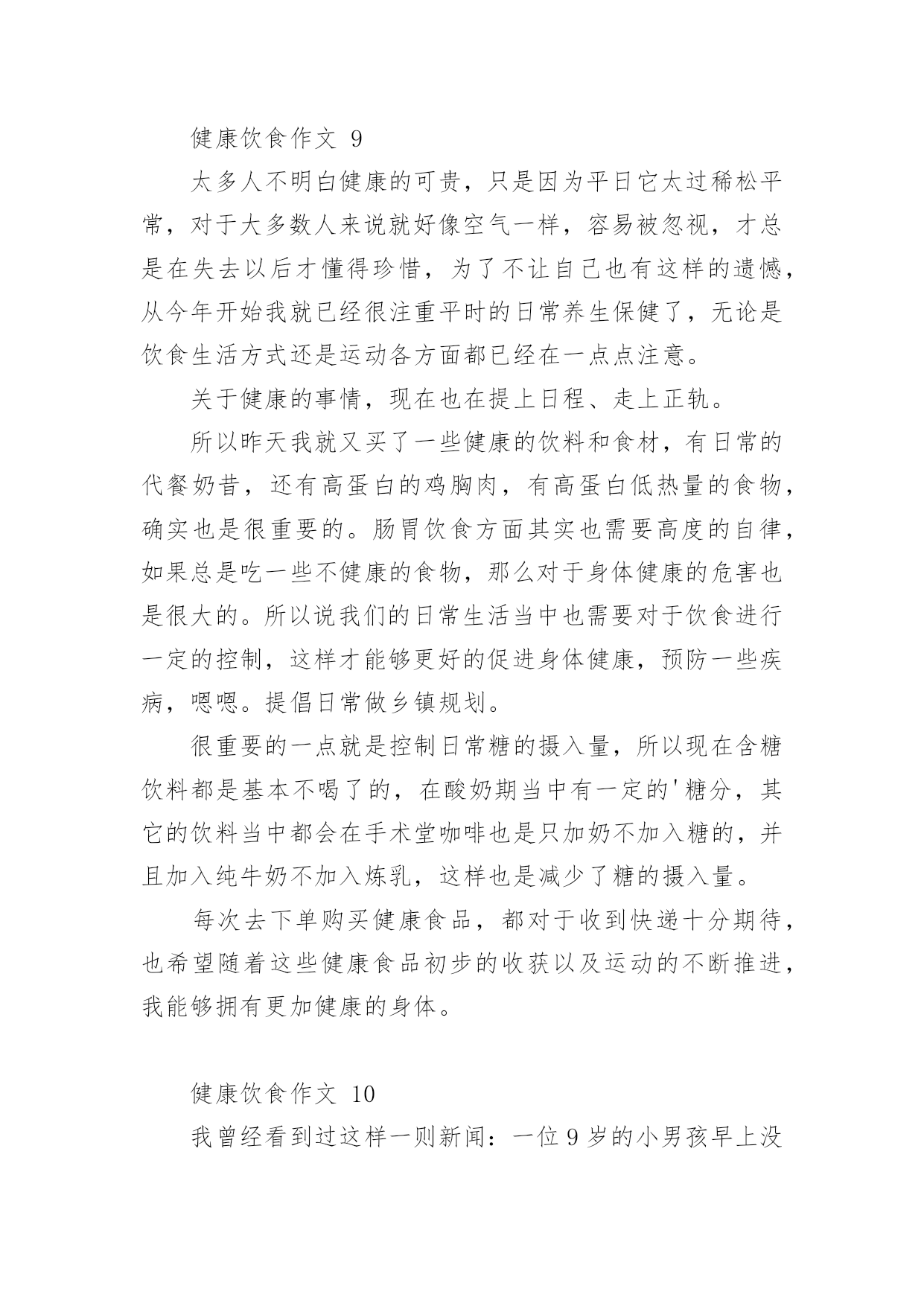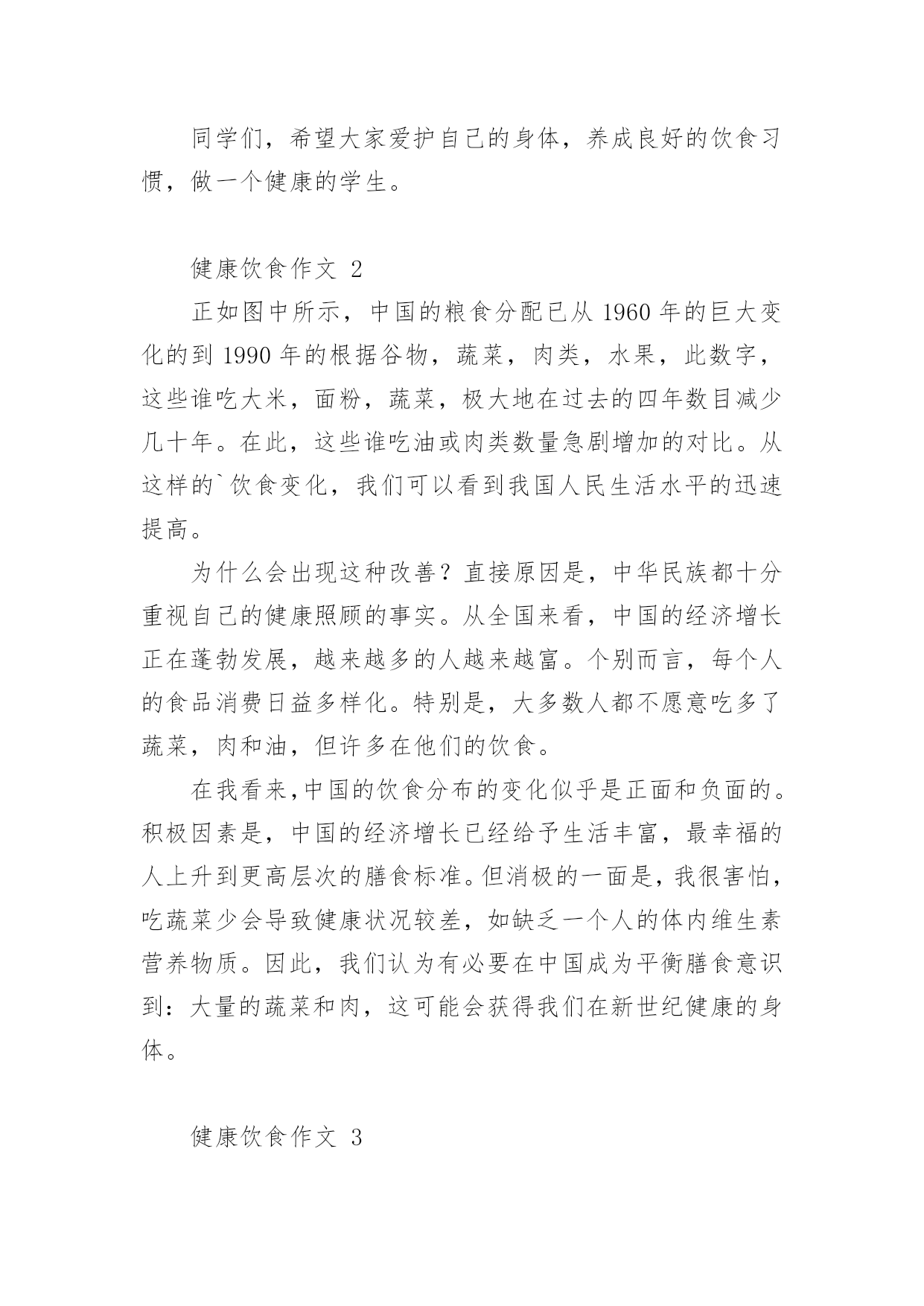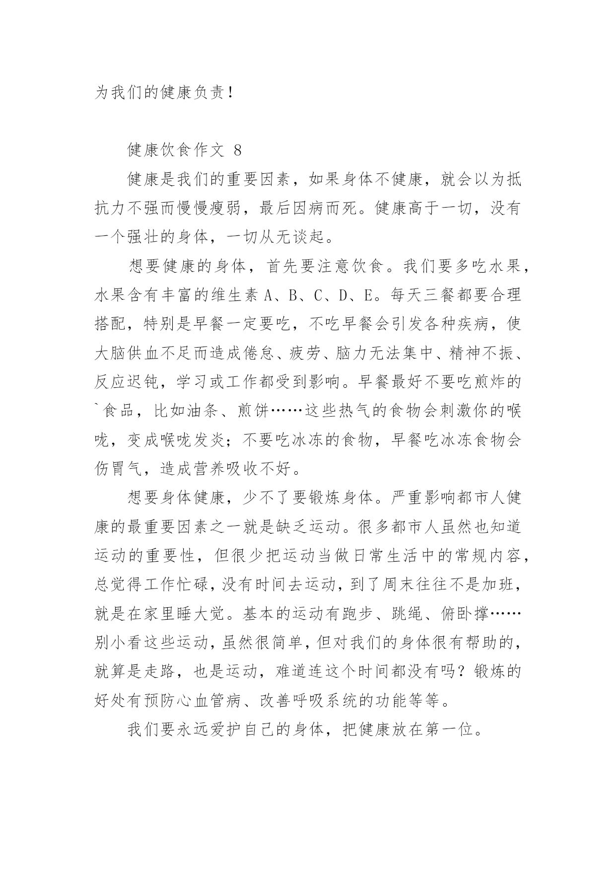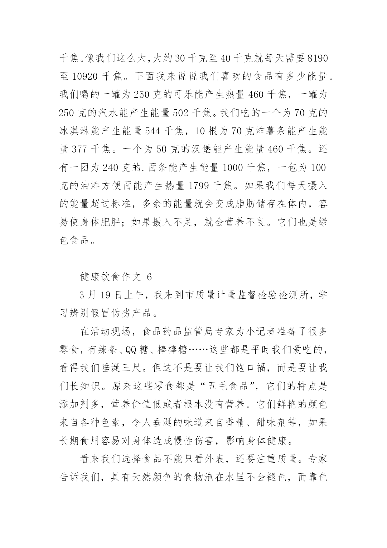 健康饮食作文健康饮食作文(通用20篇)在学习、工作、生活中,大家或多或少都会接触过作文吧,作文是一种言语活动,具有高度的综合性和创造性。那么一般作文是怎么写的呢?下面是小编帮大家整理的健康饮食作文,希望对大家有所帮助。健康饮食作文1随着人们的生活条件越来越好,大家会经常买一些对身体不好的小零食、路边摊、一些不卫生的食品。我们要杜绝这种不好的饮食习惯。我们要科学合理地饮食。要学会鉴别垃圾食品,树立健康的饮食观念。像同学们比较喜爱的食品:辣条、烧烤、膨化食品、饮品,要科学饮食。不要经常吃,要学会控制饮食,不暴饮暴食,要讲卫生,不吃不卫生的食品。买食品时要注意查看生产日期、保质期、生产许可标题等。少吃油炸食品,多吃一些蔬菜水果,等有营养的食品。还有,许多同学都有挑食的习惯,在日常生活中要吃各种粮食,水果、蔬菜、鱼肉、鸡蛋、牛奶等食物。如果有挑食的`习惯,就容易引起营养失调,发育不良等状况,影响我们的健康。在吃饭时,要细嚼慢咽,不要吃太快,这样有助于消化和保护肠胃。同学们,希望大家爱护自己的身体,养成良好的饮食习惯,做一个健康的学生。健康饮食作文2正如图中所示,中国的粮食分配已从1960年的巨大变化的到1990年的根据谷物,蔬菜,肉类,水果,此数字,这些谁吃大米,面粉,蔬菜,极大地在过去的四年数目减少几十年。在此,这些谁吃油或肉类数量急剧增加的对比。从这样的`饮食变化,我们可以看到我国人民生活水平的迅速提高。为什么会出现这种改善?直接原因是,中华民族都十分重视自己的健康照顾的事实。从全国来看,中国的经济增长正在蓬勃发展,越来越多的人越来越富。个别而言,每个人的食品消费日益多样化。特别是,大多数人都不愿意吃多了蔬菜,肉和油,但许多在他们的饮食。在我看来,中国的饮食分布的变化似乎是正面和负面的。积极因素是,中国的经济增长已经给予生活丰富,最幸福的人上升到更高层次的膳食标准。但消极的一面是,我很害怕,吃蔬菜少会导致健康状况较差,如缺乏一个人的体内维生素营养物质。因此,我们认为有必要在中国成为平衡膳食意识到:大量的蔬菜和肉,这可能会获得我们在新世纪健康的身体。健康饮食作文3随着经济的发展和人民生活水平的,含有高浓度的蛋白质营养食品越来越多的改善,脂肪和热量都被引入到人们的饮食。现在很多人都享有一个更美好的生活,这是由他们的祖父母视为奢侈品。孩子们总是缠着父母带他们去如McDonlds和肯德基快餐店。成人,另一方面,喜欢有大量的肉类和海鲜。因此,胖人随处可见。有些人认为肥胖是指身体健康。但是,这不是真的据考证,在这方面做了实验。太胖了,其实是可能造成这种脂肪作为心脏病,高血压等,看他们发胖,有些人对饮食太严格或太精益为了减肥去有关的`疾病。因此,他们患有贫血和营养不良等其他疾病。显然,我们吃的食物对我们的健康有深远的影响。丰富的食物有太多的时间都没有好,也不是太大的好处有过于简单adiet。我们不应该去要么极端。如果我们想保持健康,我们应该有一个均衡的饮食。记得有一个均衡的饮食加上适当的锻炼可以使我们保持健康,充满活力的所有的时间。健康饮食作文4随着社会生活水平的提高,物质的日益丰富,现代人尤其是小学生的饮食习惯也发生了很大的改变。饮食中营养摄入的不均衡、吃零食过多的现象是最严重的问题。如早餐只吃一两块面包,甚至只喝一瓶饮料;午饭只吃一块三文治;平日常在快餐店进食,这些都是常见的现象。忽视早餐,应付午餐,进餐随意,长此下去,必将对身体的发育造成严重的影响。为了帮助小学生纠正错误的饮食观念。我们只所以要提出有关与有关健康的内容是因为:“现在的'中小学生可能因为学习的负担过多,晚上睡觉的时间也非常的少,起来时也非常迟了所以才吃了几块面包!”①街头食品加工者构成十分混杂,有农民、菜农、在职工人、城市闲散劳动力及两劳释放人员等。一般文化素质低,法制观念淡薄。②街头食品经营设施简陋,卫生防护设施不健全。③街头食品摊点一般集聚在人群密集,流动大的公共场所,比如学校门口,空气中的尘埃细菌极易污染食物。所以小学生应尽量克制自己少吃此类食品。我们因该尽量的避免这些污染食物,以防它对我们中小学生造成危害,让我们有一个健康的身体吧!健康饮食作文5“我们要吃绿色食品,不能吃垃圾食品······”这句话常常萦绕在我的耳边。大多数的人都知道要吃绿色食品,但是绿色食品又是什么呢?绿色食品就是无污染的符合一定标准的优质食品。我来举个例子吧!大家都喜欢肯德基和麦当劳吧!但你们又知不知道食物里有多少能量呢?它们又是不是绿色食品呢?在我们的视线里6~8岁的儿童每天每千克体重约需要336千焦,9~12岁为273千焦。像我们这么大,大约30千克至40千克就每天需要8190至10920千焦。下面我来说说我们喜欢的食品有多少能量。我们喝的一罐为250克的可乐能产生热量460千焦,一罐为
