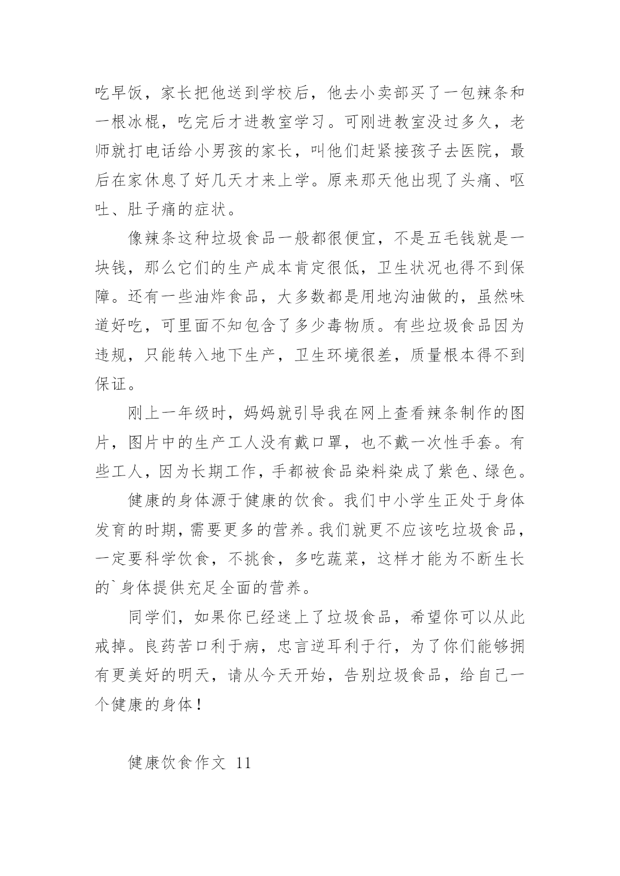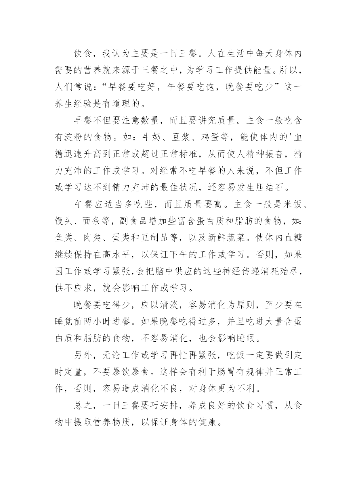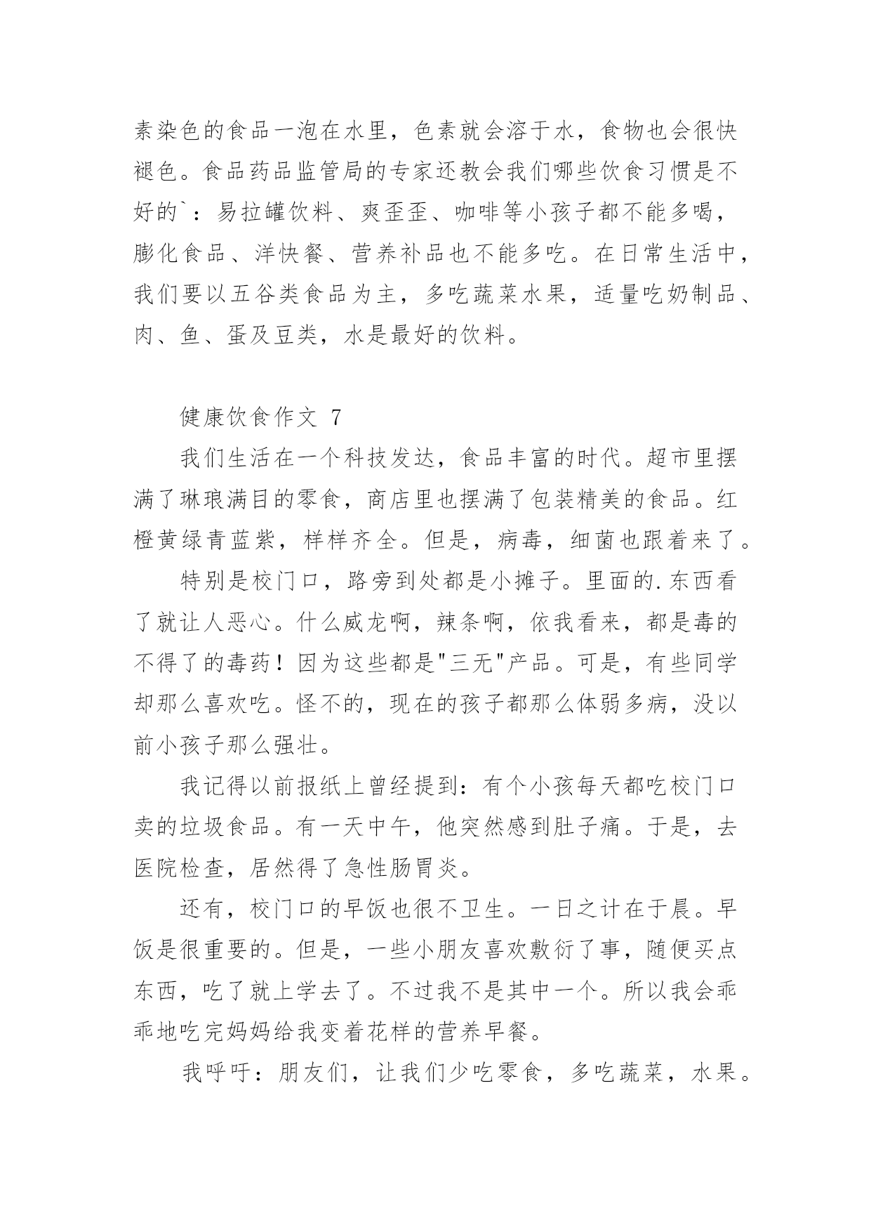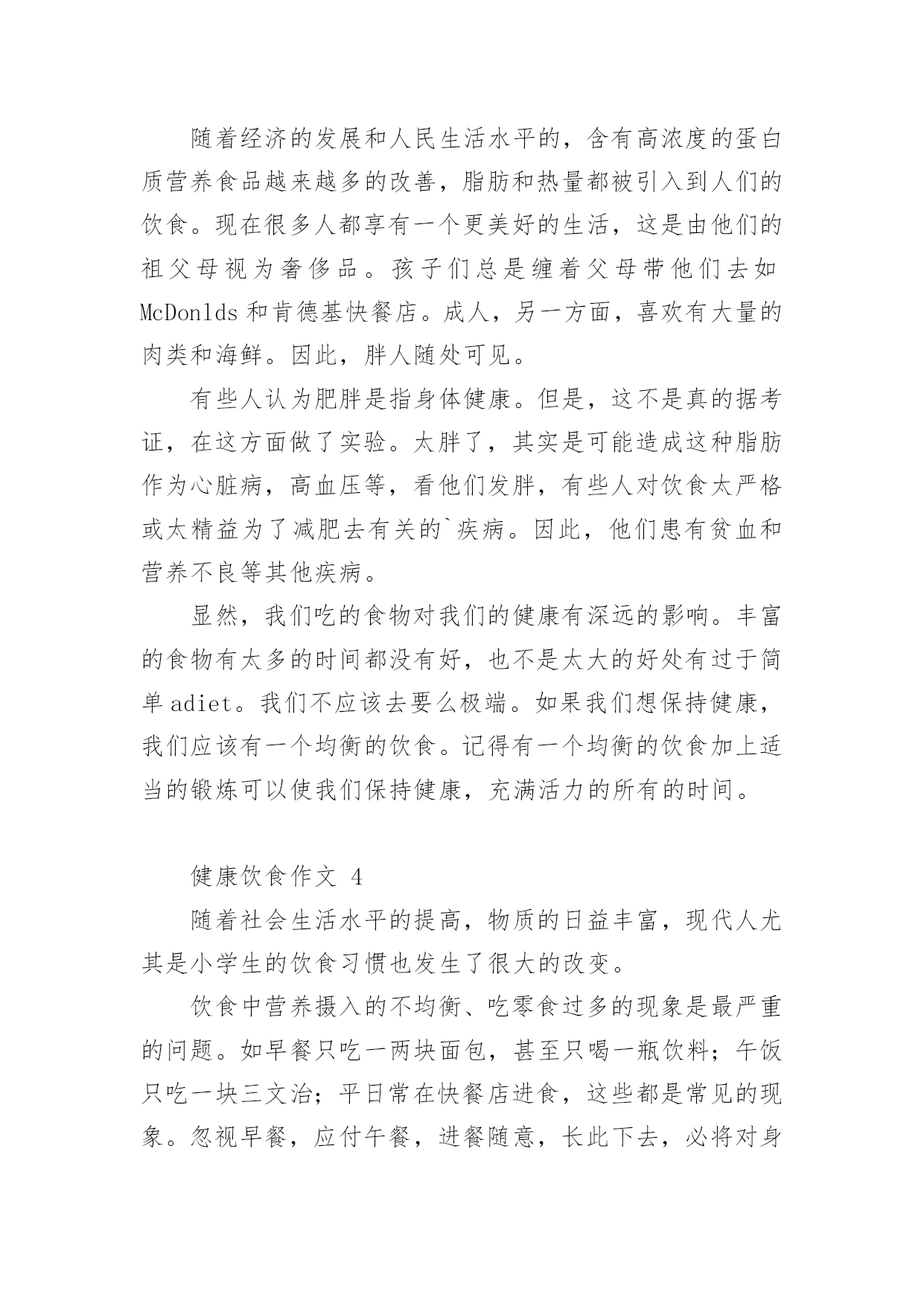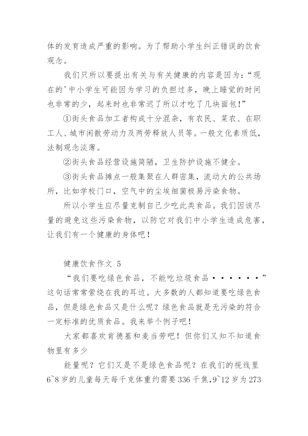 健康饮食作文健康饮食作文(通用20篇)在学习、工作、生活中,大家或多或少都会接触过作文吧,作文是一种言语活动,具有高度的综合性和创造性。那么一般作文是怎么写的呢?下面是小编帮大家整理的健康饮食作文,希望对大家有所帮助。健康饮食作文1随着人们的生活条件越来越好,大家会经常买一些对身体不好的小零食、路边摊、一些不卫生的食品。我们要杜绝这种不好的饮食习惯。我们要科学合理地饮食。要学会鉴别垃圾食品,树立健康的饮食观念。像同学们比较喜爱的食品:辣条、烧烤、膨化食品、饮品,要科学饮食。不要经常吃,要学会控制饮食,不暴饮暴食,要讲卫生,不吃不卫生的食品。买食品时要注意查看生产日期、保质期、生产许可标题等。少吃油炸食品,多吃一些蔬菜水果,等有营养的食品。还有,许多同学都有挑食的习惯,在日常生活中要吃各种粮食,水果、蔬菜、鱼肉、鸡蛋、牛奶等食物。如果有挑食的`习惯,就容易引起营养失调,发育不良等状况,影响我们的健康。在吃饭时,要细嚼慢咽,不要吃太快,这样有助于消化和保护肠胃。同学们,希望大家爱护自己的身体,养成良好的饮食习惯,做一个健康的学生。健康饮食作文2正如图中所示,中国的粮食分配已从1960年的巨大变化的到1990年的根据谷物,蔬菜,肉类,水果,此数字,这些谁吃大米,面粉,蔬菜,极大地在过去的四年数目减少几十年。在此,这些谁吃油或肉类数量急剧增加的对比。从这样的`饮食变化,我们可以看到我国人民生活水平的迅速提高。为什么会出现这种改善?直接原因是,中华民族都十分重视自己的健康照顾的事实。从全国来看,中国的经济增长正在蓬勃发展,越来越多的人越来越富。个别而言,每个人的食品消费日益多样化。特别是,大多数人都不愿意吃多了蔬菜,肉和油,但许多在他们的饮食。在我看来,中国的饮食分布的变化似乎是正面和负面的。积极因素是,中国的经济增长已经给予生活丰富,最幸福的人上升到更高层次的膳食标准。但消极的一面是,我很害怕,吃蔬菜少会导致健康状况较差,如缺乏一个人的体内维生素营养物质。因此,我们认为有必要在中国成为平衡膳食意识到:大量的蔬菜和肉,这可能会获得我们在新世纪健康的身体。健康饮食作文3随着经济的发展和人民生活水平的,含有高浓度的蛋白质营养食品越来越多的改善,脂肪和热量都被引入到人们的饮食。现在很多人都享有一个更美好的生活,这是由他们的祖父母视为奢侈品。孩子们总是缠着父母带他们去如McDonlds和肯德基快餐店。成人,另一方面,喜欢有大量的肉类和海鲜。因此,胖人随处可见。有些人认为肥胖是指身体健康。但是,这不是真的据考证,在这方面做了实验。太胖了,其实是可能造成这种脂肪作为心脏病,高血压等,看他们发胖,有些人对饮食太严格或太精益为了减肥去有关的`疾病。因此,他们患有贫血和营养不良等其他疾病。显然,我们吃的食物对我们的健康有深远的影响。丰富的食物有太多的时间都没有好,也不是太大的好处有过于简单adiet。我们不应该去要么极端。如果我们想保持健康,我们应该有一个均衡的饮食。记得有一个均衡的饮食加上适当的锻炼可以使我们保持健康,充满活力的所有的时间。健康饮食作文4随着社会生活水平的提高,物质的日益丰富,现代人尤其是小学生的饮食习惯也发生了很大的改变。饮食中营养摄入的不均衡、吃零食过多的现象是最严重的问题。如早餐只吃一两块面包,甚至只喝一瓶饮料;午饭只吃一块三文治;平日常在快餐店进食,这些都是常见的现象。忽视早餐,应付午餐,进餐随意,长此下去,必将对身体的发育造成严重的影响。为了帮助小学生纠正错误的饮食观念。我们只所以要提出有关与有关健康的内容是因为:“现在的'中小学生可能因为学习的负担过多,晚上睡觉的时间也非常的少,起来时也非常迟了所以才吃了几块面包!”①街头食品加工者构成十分混杂,有农民、菜农、在职工人、城市闲散劳动力及两劳释放人员等。一般文化素质低,法制观念淡薄。②街头食品经营设施简陋,卫生防护设施不健全。③街头食品摊点一般集聚在人群密集,流动大的公共场所,比如学校门口,空气中的尘埃细菌极易污染食物。所以小学生应尽量克制自己少吃此类食品。我们因该尽量的避免这些污染食物,以防它对我们中小学生造成危害,让我们有一个健康的身体吧!健康饮食作文5“我们要吃绿色食品,不能吃垃圾食品······”这句话常常萦绕在我的耳边。大多数的人都知道要吃绿色食品,但是绿色食品又是什么呢?绿色食品就是无污染的符合一定标准的优质食品。我来举个例子吧!大家都喜欢肯德基和麦当劳吧!但你们又知不知道食物里有多少能量呢?它们又是不是绿色食品呢?在我们的视线里6~8岁的儿童每天每千克体重约需要336千焦,9~12岁为273千焦。像我们这么大,大约30千克至40千克就每天需要8190至10920千焦。下面我来说说我们喜欢的食品有多少能量。我们喝的一罐为250克的可乐能产生热量460千焦,一罐为