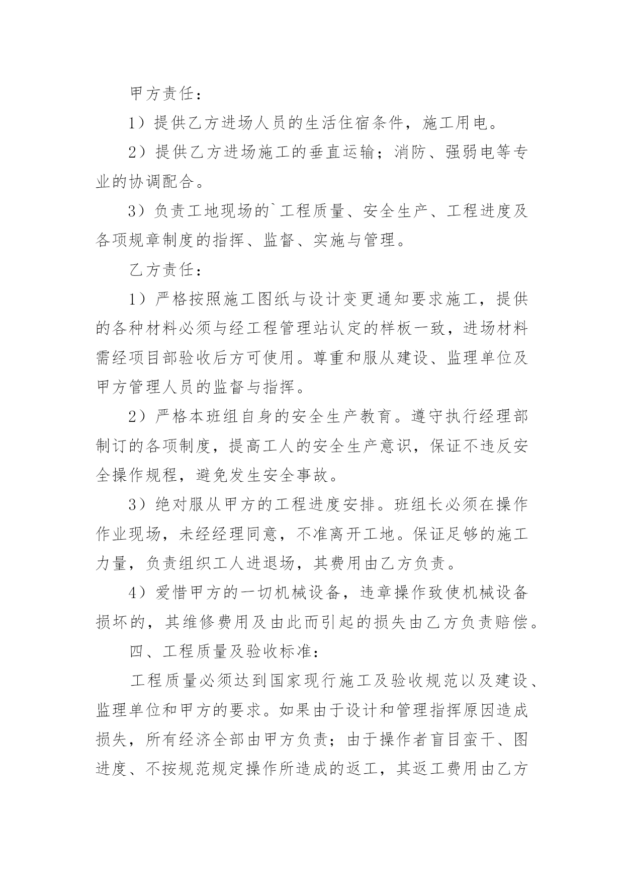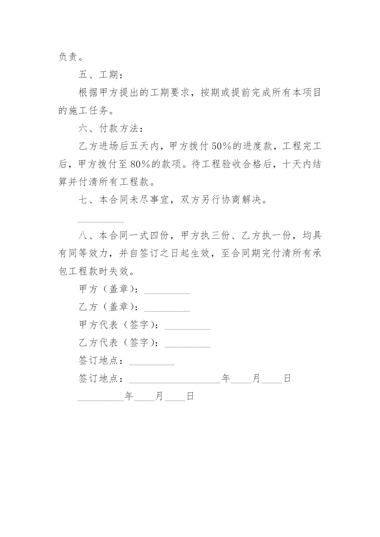 天花吊顶施工承包协议在生活中,男女老少都可能需要用到协议,签订了协议就有了法律依靠。那么相关的协议到底怎么写呢?下面是小编为大家整理的天花吊顶施工承包协议,欢迎大家借鉴与参考,希望对大家有所帮助。发包方(以下简称甲方):________承包方(以下简称乙方):_________甲方承建的工程室内_________天花吊顶单项工程,于_________年_________月_________日由甲方发包给乙方,采用包工包料方式进行施工。为了明确工程内容及双方责任,本着互相协助及分工负责等原则,根据本工程的具体情况,特商定如下条款,共同遵守执行:一、工程内容:_________施工图,标准层核心筒天花吊顶工程项目及设计变更的所有工作内容。具体如下:600×600防水_________吊顶,采用白色喷塑t形凹槽龙骨;角线采用6cm石膏线条,油面漆二遍。二、承包单价:根据施工图纸,按实际吊顶面积计算。包工包料:_________吊顶每平方米_________元整;石膏线条每米_________元整。三、双方责任:甲方责任:1)提供乙方进场人员的生活住宿条件,施工用电。2)提供乙方进场施工的垂直运输;消防、强弱电等专业的协调配合。3)负责工地现场的`工程质量、安全生产、工程进度及各项规章制度的指挥、监督、实施与管理。乙方责任:1)严格按照施工图纸与设计变更通知要求施工,提供的各种材料必须与经工程管理站认定的样板一致,进场材料需经项目部验收后方可使用。尊重和服从建设、监理单位及甲方管理人员的监督与指挥。2)严格本班组自身的安全生产教育。遵守执行经理部制订的各项制度,提高工人的安全生产意识,保证不违反安全操作规程,避免发生安全事故。3)绝对服从甲方的工程进度安排。班组长必须在操作作业现场,未经经理同意,不准离开工地。保证足够的施工力量,负责组织工人进退场,其费用由乙方负责。4)爱惜甲方的一切机械设备,违章操作致使机械设备损坏的,其维修费用及由此而引起的损失由乙方负责赔偿。四、工程质量及验收标准:工程质量必须达到国家现行施工及验收规范以及建设、监理单位和甲方的要求。如果由于设计和管理指挥原因造成损失,所有经济全部由甲方负责;由于操作者盲目蛮干、图进度、不按规范规定操作所造成的返工,其返工费用由乙方负责。五、工期:根据甲方提出的工期要求,按期或提前完成所有本项目的施工任务。六、付款方法:乙方进场后五天内,甲方拨付50%的进度款,工程完工后,甲方拨付至80%的款项。待工程验收合格后,十天内结算并付清所有工程款。七、本合同未尽事宜,双方另行协商解决。_________八、本合同一式四份,甲方执三份、乙方执一份,均具有同等效力,并自签订之日起生效,至合同期完付清所有承包工程款时失效。甲方(盖章):_________乙方(盖章):_________甲方代表(签字):_________乙方代表(签字):_________签订地点:_________签订地点:__________________年____月____日_________年____月____日
