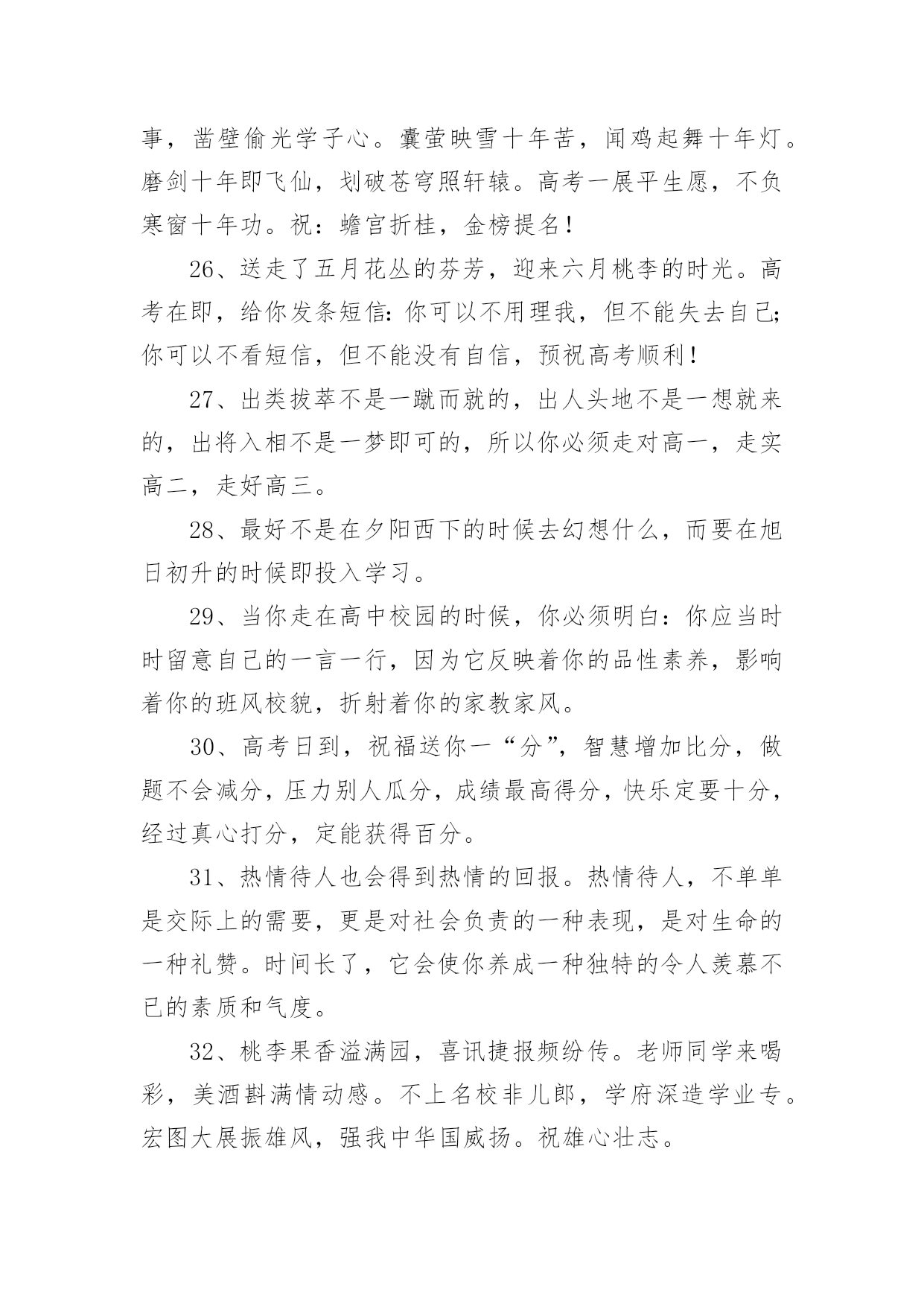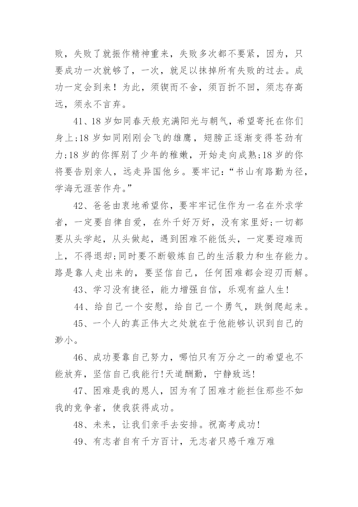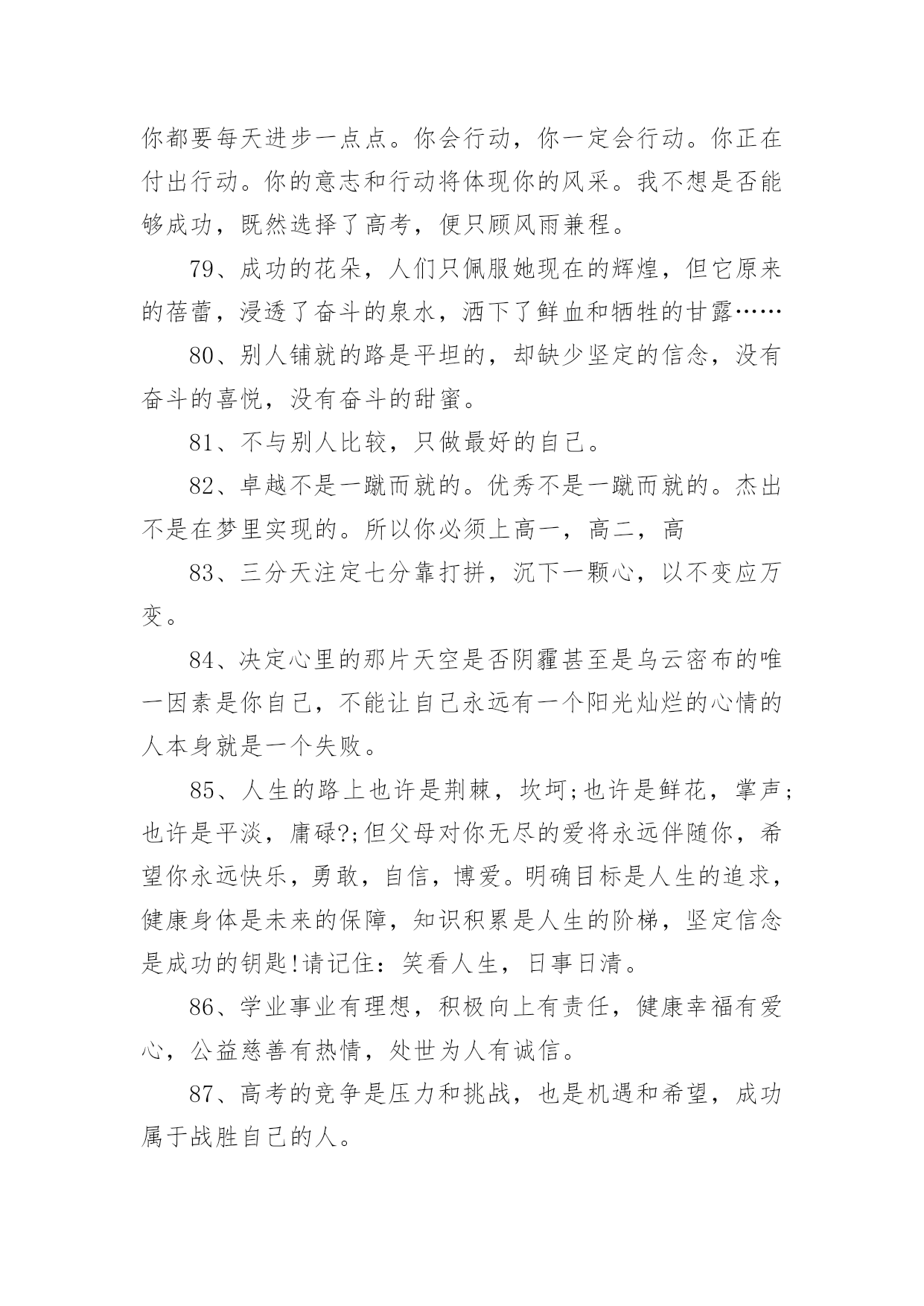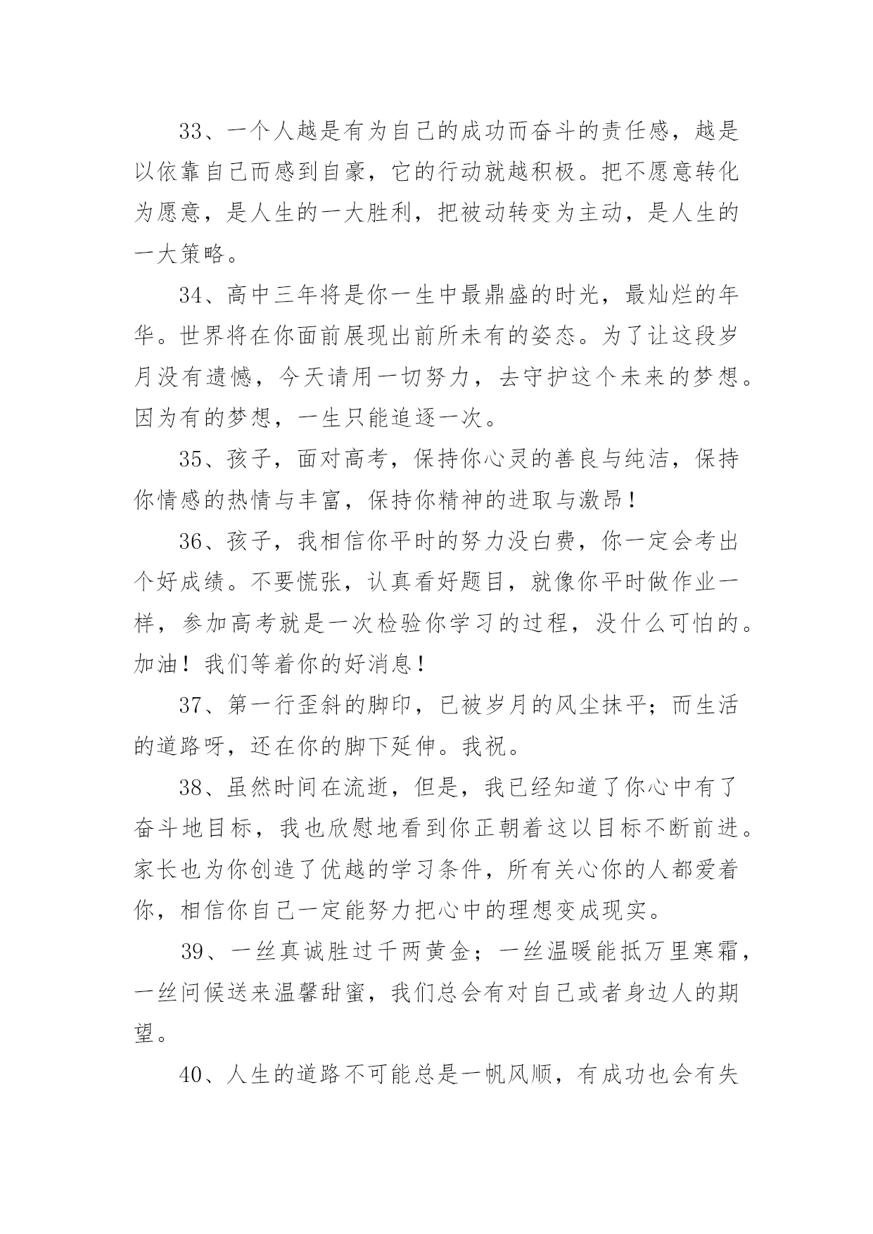 高考父母鼓励的话语高考父母鼓励的话语(精选200句)随着社交网络的普及,大家都接触过很多优秀的话语吧,话语是人们说出来或写出来的语言。那么什么样的话语才更具感染力呢?下面是小编帮大家整理的高考父母鼓励的话语(精选200句),仅供参考,大家一起来看看吧。1、经历了汗水洗礼,才更懂得收获的喜悦,加油!2、荆棘、坎坷是磨砺开拓者意志的摇复;困难艰险,是开拓者前进路上的垫脚石。3、精神成就事业,态度决定一切。4、绝境是人生的醒悟和升华。5、开启高考成功之门,钥匙有三。其一:勤奋的精神;其二:科学的方法;其三:良好的心态。6、开拓者走的是弯弯曲曲的路,而他留下的却是又直又宽的足迹。7、恐惧自己受苦的人,已经因为自己的恐惧在受苦。8、快乐不是因为得到的多而是因为计较的少!9、快乐在我看来很简单,只要生活过得充实,就会快乐。书是人类进步的阶梯,同时,也是人们的好朋友。读书不仅会使生活过得充实,而且从书中我们悟出了做人的道理,学会了学习的方法。而且我相信,在读书时,只要用心去读,总会有收获。10、离开奋斗的沃壤,天赋的种子便寻不到春华秋实的前程。11、理想是力量的泉源、智慧的摇篮、冲锋的战旗、斩棘的利剑。12、力争上游,龙腾虎跃朝气蓬勃;壮志凌云,你追我赶誓夺第一。13、六十同窗同甘共苦拼搏从此时,十二春秋风雨兼程成败在今年。14、没有风浪,便没有勇敢的弄潮儿;没有荆棘,也没有不屈的开拓者。15、没有口水与汗水,就没有成功的泪水。16、没有哪种教育能及得上逆境。17、没有一颗珍珠的闪光,是靠别人涂抹上去的。18、没有一种不通过蔑视、忍受和奋斗就可以征服的命运。19、命运如同手中的掌纹,无论多曲折,终掌握在自己手中。20、命运掌握在自己的手中,一切只能靠自己。21、模拟的意义在于如何走下去。22、你的脸是为了呈现上帝赐给人类最贵重的礼物微笑,一定要成为你工作最大的资产。23、你高考虽然没能如愿,但都没有怪你,因为你尽力了,你可千万不要哭,明年再考吧!24、你既然认准一条道路,何必去打听要走多久。25、十万进士读书人,自古名士出寒门。悬梁刺股平常事,凿壁偷光学子心。囊萤映雪十年苦,闻鸡起舞十年灯。磨剑十年即飞仙,划破苍穹照轩辕。高考一展平生愿,不负寒窗十年功。祝:蟾宫折桂,金榜提名!26、送走了五月花丛的芬芳,迎来六月桃李的时光。高考在即,给你发条短信:你可以不用理我,但不能失去自己;你可以不看短信,但不能没有自信,预祝高考顺利!27、出类拔萃不是一蹴而就的,出人头地不是一想就来的,出将入相不是一梦即可的,所以你必须走对高一,走实高二,走好高三。28、最好不是在夕阳西下的时候去幻想什么,而要在旭日初升的时候即投入学习。29、当你走在高中校园的时候,你必须明白:你应当时时留意自己的一言一行,因为它反映着你的品性素养,影响着你的班风校貌,折射着你的家教家风。30、高考日到,祝福送你一“分”,智慧增加比分,做题不会减分,压力别人瓜分,成绩最高得分,快乐定要十分,经过真心打分,定能获得百分。31、热情待人也会得到热情的回报。热情待人,不单单是交际上的需要,更是对社会负责的一种表现,是对生命的一种礼赞。时间长了,它会使你养成一种独特的令人羡慕不已的素质和气度。32、桃李果香溢满园,喜讯捷报频纷传。老师同学来喝彩,美酒斟满情动感。不上名校非儿郎,学府深造学业专。宏图大展振雄风,强我中华国威扬。祝雄心壮志。33、一个人越是有为自己的成功而奋斗的责任感,越是以依靠自己而感到自豪,它的行动就越积极。把不愿意转化为愿意,是人生的一大胜利,把被动转变为主动,是人生的一大策略。34、高中三年将是你一生中最鼎盛的时光,最灿烂的年华。世界将在你面前展现出前所未有的姿态。为了让这段岁月没有遗憾,今天请用一切努力,去守护这个未来的梦想。因为有的梦想,一生只能追逐一次。35、孩子,面对高考,保持你心灵的善良与纯洁,保持你情感的热情与丰富,保持你精神的进取与激昂!36、孩子,我相信你平时的努力没白费,你一定会考出个好成绩。不要慌张,认真看好题目,就像你平时做作业一样,参加高考就是一次检验你学习的过程,没什么可怕的。加油!我们等着你的好消息!37、第一行歪斜的脚印,已被岁月的风尘抹平;而生活的道路呀,还在你的脚下延伸。我祝。38、虽然时间在流逝,但是,我已经知道了你心中有了奋斗地目标,我也欣慰地看到你正朝着这以目标不断前进。家长也为你创造了优越的学习条件,所有关心你的人都爱着你,相信你自己一定能努力把心中的理想变成现实。39、一丝真诚胜过千两黄金;一丝温暖能抵万里寒霜,一丝问候送来温馨甜蜜,我们总会有对自己或者身边人的期望。40、人生的道路不可能总是一帆风顺,有成功也会有失败,失败了就振作精神重来,失败多次都不要紧,因为,只要成功一次就够了,一次,就足以抹掉所有失败的过去。成功一