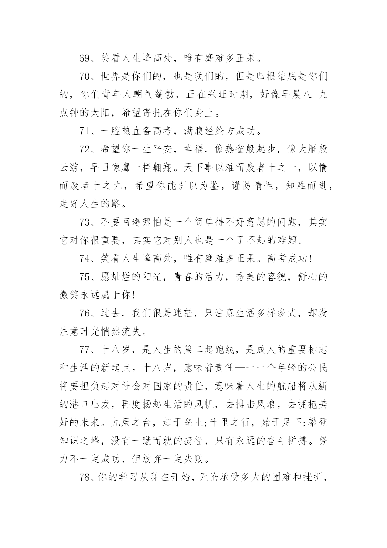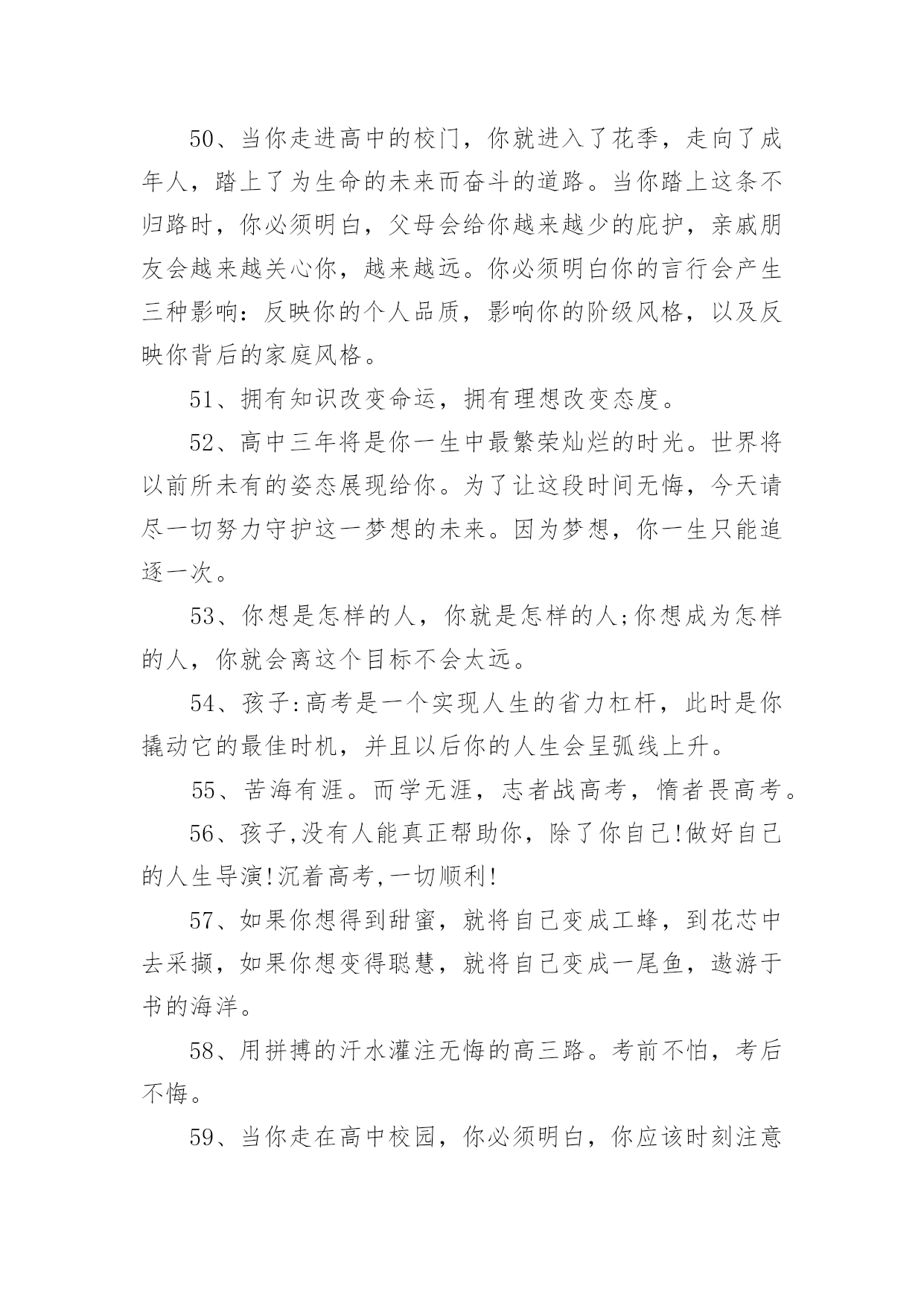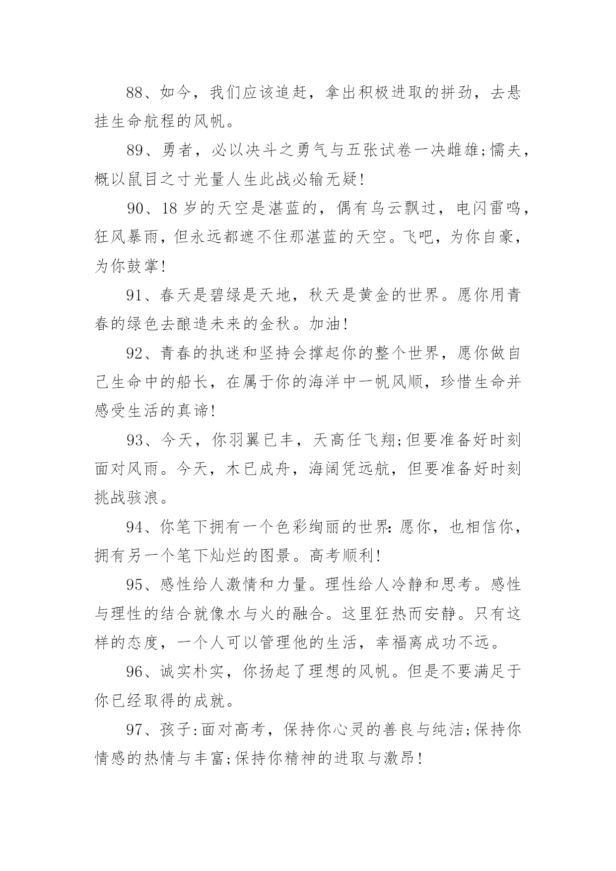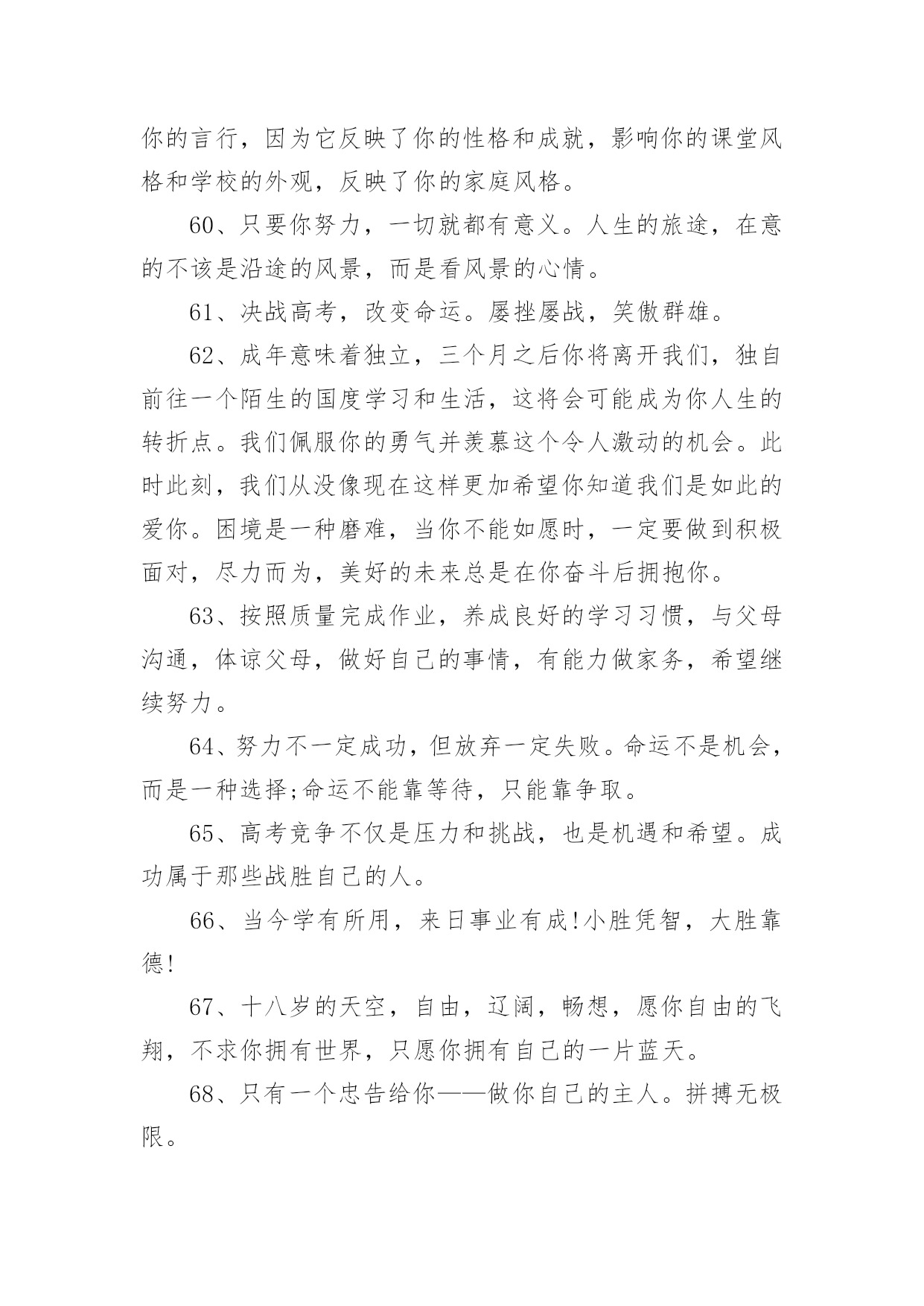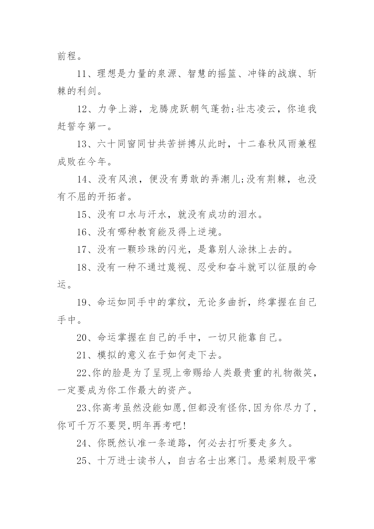 高考父母鼓励的话语高考父母鼓励的话语(精选200句)随着社交网络的普及,大家都接触过很多优秀的话语吧,话语是人们说出来或写出来的语言。那么什么样的话语才更具感染力呢?下面是小编帮大家整理的高考父母鼓励的话语(精选200句),仅供参考,大家一起来看看吧。1、经历了汗水洗礼,才更懂得收获的喜悦,加油!2、荆棘、坎坷是磨砺开拓者意志的摇复;困难艰险,是开拓者前进路上的垫脚石。3、精神成就事业,态度决定一切。4、绝境是人生的醒悟和升华。5、开启高考成功之门,钥匙有三。其一:勤奋的精神;其二:科学的方法;其三:良好的心态。6、开拓者走的是弯弯曲曲的路,而他留下的却是又直又宽的足迹。7、恐惧自己受苦的人,已经因为自己的恐惧在受苦。8、快乐不是因为得到的多而是因为计较的少!9、快乐在我看来很简单,只要生活过得充实,就会快乐。书是人类进步的阶梯,同时,也是人们的好朋友。读书不仅会使生活过得充实,而且从书中我们悟出了做人的道理,学会了学习的方法。而且我相信,在读书时,只要用心去读,总会有收获。10、离开奋斗的沃壤,天赋的种子便寻不到春华秋实的前程。11、理想是力量的泉源、智慧的摇篮、冲锋的战旗、斩棘的利剑。12、力争上游,龙腾虎跃朝气蓬勃;壮志凌云,你追我赶誓夺第一。13、六十同窗同甘共苦拼搏从此时,十二春秋风雨兼程成败在今年。14、没有风浪,便没有勇敢的弄潮儿;没有荆棘,也没有不屈的开拓者。15、没有口水与汗水,就没有成功的泪水。16、没有哪种教育能及得上逆境。17、没有一颗珍珠的闪光,是靠别人涂抹上去的。18、没有一种不通过蔑视、忍受和奋斗就可以征服的命运。19、命运如同手中的掌纹,无论多曲折,终掌握在自己手中。20、命运掌握在自己的手中,一切只能靠自己。21、模拟的意义在于如何走下去。22、你的脸是为了呈现上帝赐给人类最贵重的礼物微笑,一定要成为你工作最大的资产。23、你高考虽然没能如愿,但都没有怪你,因为你尽力了,你可千万不要哭,明年再考吧!24、你既然认准一条道路,何必去打听要走多久。25、十万进士读书人,自古名士出寒门。悬梁刺股平常事,凿壁偷光学子心。囊萤映雪十年苦,闻鸡起舞十年灯。磨剑十年即飞仙,划破苍穹照轩辕。高考一展平生愿,不负寒窗十年功。祝:蟾宫折桂,金榜提名!26、送走了五月花丛的芬芳,迎来六月桃李的时光。高考在即,给你发条短信:你可以不用理我,但不能失去自己;你可以不看短信,但不能没有自信,预祝高考顺利!27、出类拔萃不是一蹴而就的,出人头地不是一想就来的,出将入相不是一梦即可的,所以你必须走对高一,走实高二,走好高三。28、最好不是在夕阳西下的时候去幻想什么,而要在旭日初升的时候即投入学习。29、当你走在高中校园的时候,你必须明白:你应当时时留意自己的一言一行,因为它反映着你的品性素养,影响着你的班风校貌,折射着你的家教家风。30、高考日到,祝福送你一“分”,智慧增加比分,做题不会减分,压力别人瓜分,成绩最高得分,快乐定要十分,经过真心打分,定能获得百分。31、热情待人也会得到热情的回报。热情待人,不单单是交际上的需要,更是对社会负责的一种表现,是对生命的一种礼赞。时间长了,它会使你养成一种独特的令人羡慕不已的素质和气度。32、桃李果香溢满园,喜讯捷报频纷传。老师同学来喝彩,美酒斟满情动感。不上名校非儿郎,学府深造学业专。宏图大展振雄风,强我中华国威扬。祝雄心壮志。33、一个人越是有为自己的成功而奋斗的责任感,越是以依靠自己而感到自豪,它的行动就越积极。把不愿意转化为愿意,是人生的一大胜利,把被动转变为主动,是人生的一大策略。34、高中三年将是你一生中最鼎盛的时光,最灿烂的年华。世界将在你面前展现出前所未有的姿态。为了让这段岁月没有遗憾,今天请用一切努力,去守护这个未来的梦想。因为有的梦想,一生只能追逐一次。35、孩子,面对高考,保持你心灵的善良与纯洁,保持你情感的热情与丰富,保持你精神的进取与激昂!36、孩子,我相信你平时的努力没白费,你一定会考出个好成绩。不要慌张,认真看好题目,就像你平时做作业一样,参加高考就是一次检验你学习的过程,没什么可怕的。加油!我们等着你的好消息!37、第一行歪斜的脚印,已被岁月的风尘抹平;而生活的道路呀,还在你的脚下延伸。我祝。38、虽然时间在流逝,但是,我已经知道了你心中有了奋斗地目标,我也欣慰地看到你正朝着这以目标不断前进。家长也为你创造了优越的学习条件,所有关心你的人都爱着你,相信你自己一定能努力把心中的理想变成现实。39、一丝真诚胜过千两黄金;一丝温暖能抵万里寒霜,一丝问候送来温馨甜蜜,我们总会有对自己或者身边人的期望。40、人生的道路不可能总是一帆风顺,有成功也会有失败,失败了就振作精神重来,失败多次都不要紧,因为,只要成功一次就够了,一次,就足以抹掉所有失败的过去。成功一