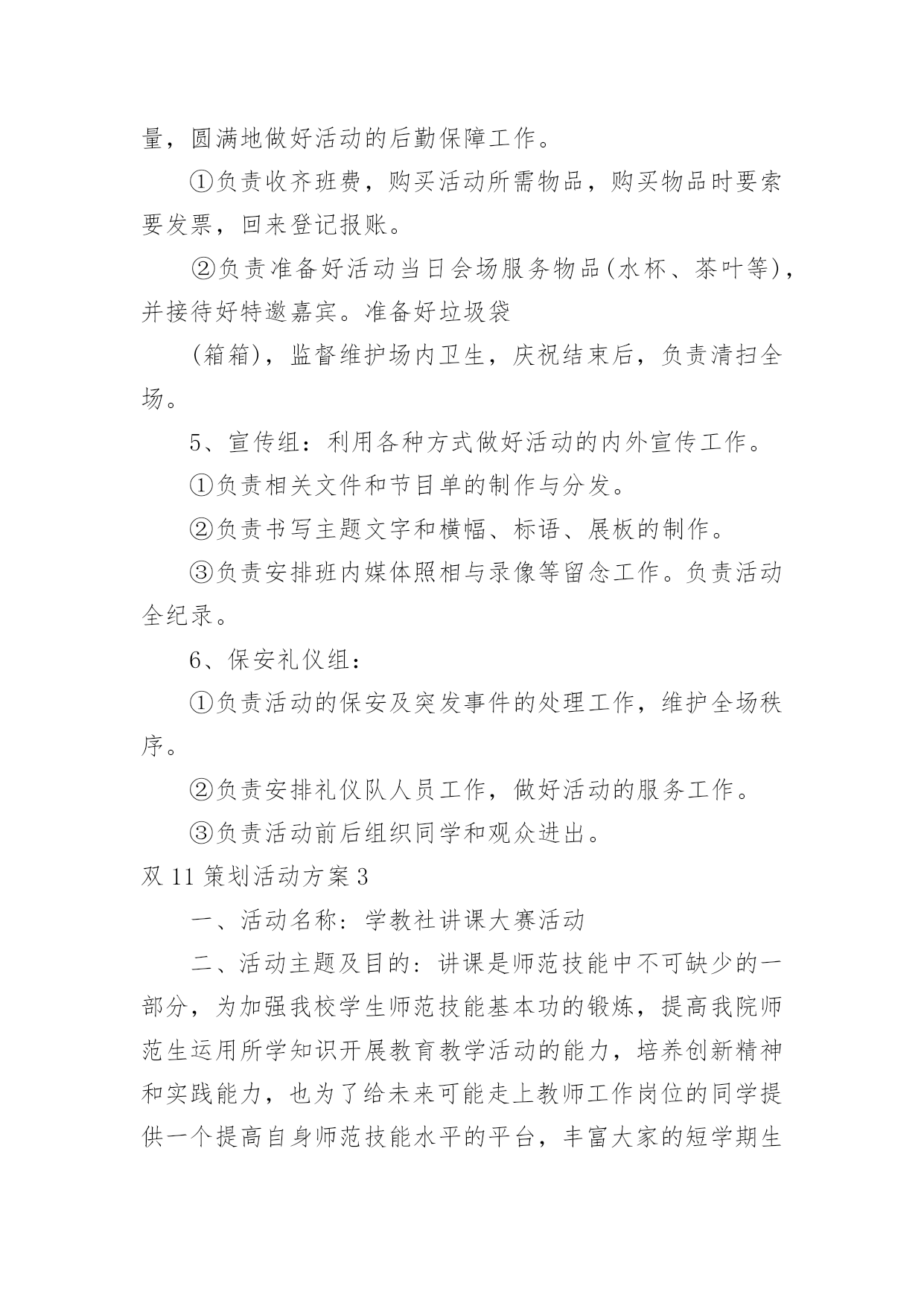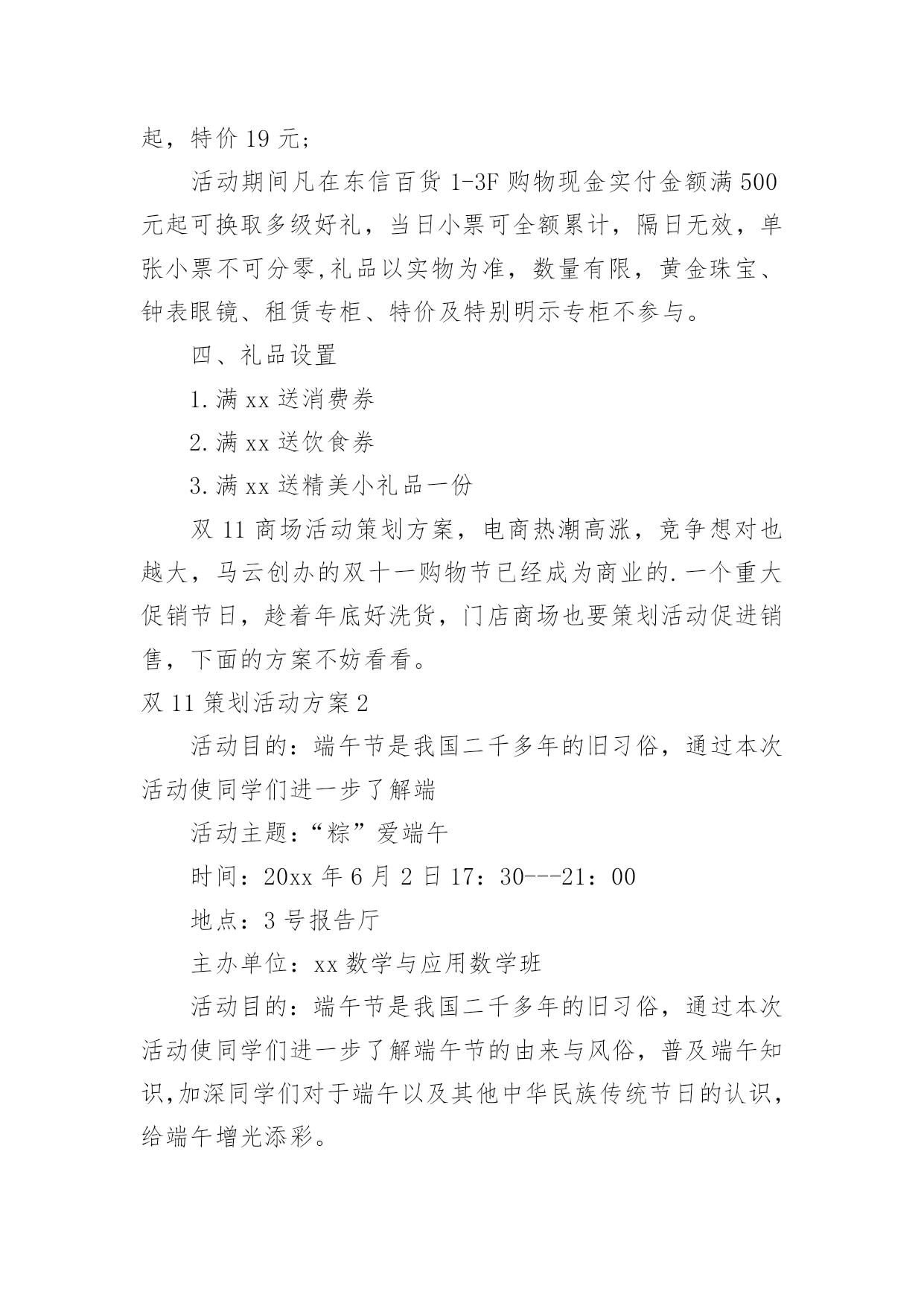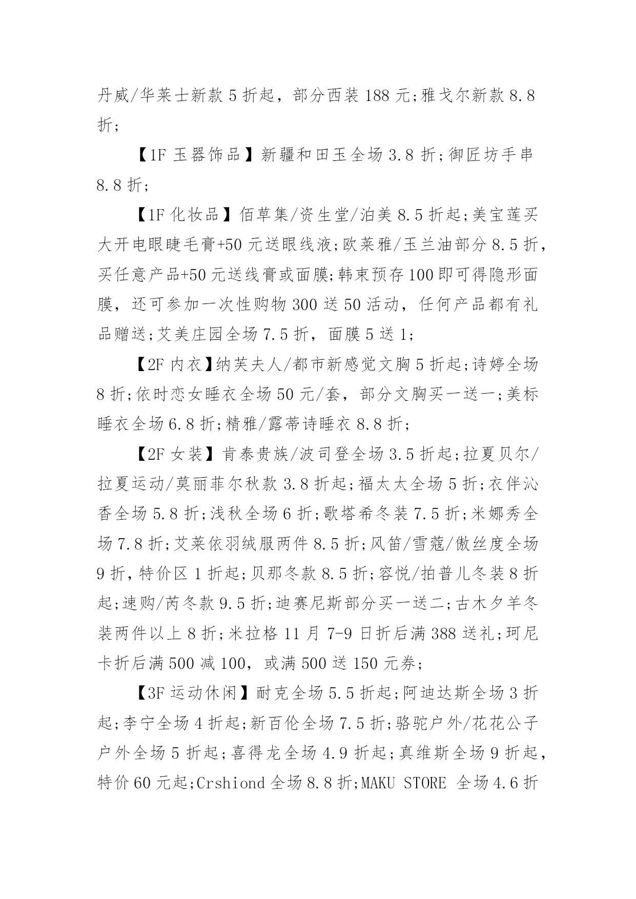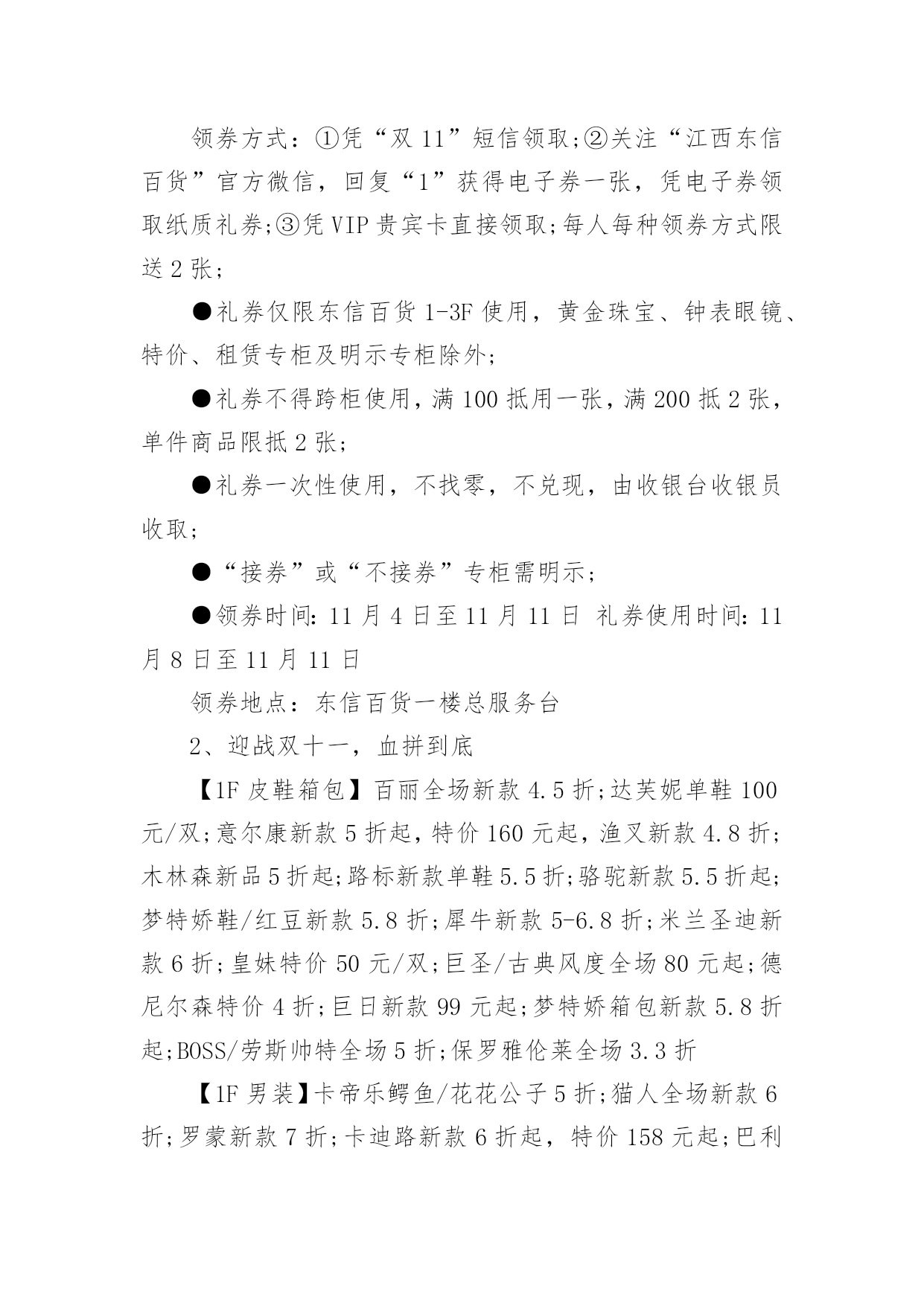 双11策划活动方案双11策划活动方案为了确保工作或事情能有条不紊地开展,时常需要预先开展方案准备工作,方案是为某一行动所制定的具体行动实施办法细则、步骤和安排等。那么我们该怎么去写方案呢?下面是小编为大家收集的双11策划活动方案,仅供参考,欢迎大家阅读。双11策划活动方案1双11是历年电商必争之节日,活动和宣传力度之大,参与品类品牌之多,活动形式之丰富均是年度之最。作为线下的实体商场,我们需要抓住双11购物狂欢这一概念,在11月气温下降时机开展冬装促销。在活动力度、营销方式和实地体验上要更加区别于电商,从而突出实体店的特色。一、活动主题:双11大决战——东信百货开启中国购物节!二、活动时间:11月8日(周六)—11月11日(周二)共4天三、送礼处:三楼宝缦家纺旁三、活动内容东信百货11月11日史无前例,重磅出击,双十一大决战,向电商宣战,比网购更优惠!1、重磅消息:10元现金礼券来了,看你抢不抢!!!领券方式:①凭“双11”短信领取;②关注“江西东信百货”官方微信,回复“1”获得电子券一张,凭电子券领取纸质礼券;③凭VIP贵宾卡直接领取;每人每种领券方式限送2张;●礼券仅限东信百货1-3F使用,黄金珠宝、钟表眼镜、特价、租赁专柜及明示专柜除外;●礼券不得跨柜使用,满100抵用一张,满200抵2张,单件商品限抵2张;●礼券一次性使用,不找零,不兑现,由收银台收银员收取;●“接券”或“不接券”专柜需明示;●领券时间:11月4日至11月11日礼券使用时间:11月8日至11月11日领券地点:东信百货一楼总服务台2、迎战双十一,血拼到底【1F皮鞋箱包】百丽全场新款4.5折;达芙妮单鞋100元/双;意尔康新款5折起,特价160元起,渔叉新款4.8折;木林森新品5折起;路标新款单鞋5.5折;骆驼新款5.5折起;梦特娇鞋/红豆新款5.8折;犀牛新款5-6.8折;米兰圣迪新款6折;皇妹特价50元/双;巨圣/古典风度全场80元起;德尼尔森特价4折;巨日新款99元起;梦特娇箱包新款5.8折起;BOSS/劳斯帅特全场5折;保罗雅伦莱全场3.3折【1F男装】卡帝乐鳄鱼/花花公子5折;猫人全场新款6折;罗蒙新款7折;卡迪路新款6折起,特价158元起;巴利丹威/华莱士新款5折起,部分西装188元;雅戈尔新款8.8折;【1F玉器饰品】新疆和田玉全场3.8折;御匠坊手串8.8折;【1F化妆品】佰草集/资生堂/泊美8.5折起;美宝莲买大开电眼睫毛膏+50元送眼线液;欧莱雅/玉兰油部分8.5折,买任意产品+50元送线膏或面膜;韩束预存100即可得隐形面膜,还可参加一次性购物300送50活动,任何产品都有礼品赠送;艾美庄园全场7.5折,面膜5送1;【2F内衣】纳芙夫人/都市新感觉文胸5折起;诗婷全场8折;依时恋女睡衣全场50元/套,部分文胸买一送一;美标睡衣全场6.8折;精雅/露蒂诗睡衣8.8折;【2F女装】肯泰贵族/波司登全场3.5折起;拉夏贝尔/拉夏运动/莫丽菲尔秋款3.8折起;福太太全场5折;衣伴沁香全场5.8折;浅秋全场6折;歌塔希冬装7.5折;米娜秀全场7.8折;艾莱依羽绒服两件8.5折;风笛/雪蔻/傲丝度全场9折,特价区1折起;贝那冬款8.5折;容悦/拍普儿冬装8折起;速购/芮冬款9.5折;迪赛尼斯部分买一送二;古木夕羊冬装两件以上8折;米拉格11月7-9日折后满388送礼;珂尼卡折后满500减100,或满500送150元券;【3F运动休闲】耐克全场5.5折起;阿迪达斯全场3折起;李宁全场4折起;新百伦全场7.5折;骆驼户外/花花公子户外全场5折起;喜得龙全场4.9折起;真维斯全场9折起,特价60元起;Crshiond全场8.8折;MAKUSTORE全场4.6折起,特价19元;活动期间凡在东信百货1-3F购物现金实付金额满500元起可换取多级好礼,当日小票可全额累计,隔日无效,单张小票不可分零,礼品以实物为准,数量有限,黄金珠宝、钟表眼镜、租赁专柜、特价及特别明示专柜不参与。四、礼品设置1.满xx送消费券2.满xx送饮食券3.满xx送精美小礼品一份双11商场活动策划方案,电商热潮高涨,竞争想对也越大,马云创办的双十一购物节已经成为商业的.一个重大促销节日,趁着年底好洗货,门店商场也要策划活动促进销售,下面的方案不妨看看。双11策划活动方案2活动目的:端午节是我国二千多年的旧习俗,通过本次活动使同学们进一步了解端活动主题:“粽”爱端午时间:20xx年6月2日17:30---21:00地点:3号报告厅主办单位:xx数学与应用数学班活动目的:端午节是我国二千多年的旧习俗,通过本次活动使同学们进一步了解端午节的由来与风俗,普及端午知识,加深同学们对于端午以及其他中华民族传统节日的认识,给端午增光添彩。活动特点:活动生动有趣,可以调动大家的积极性,溶爱国情、师
