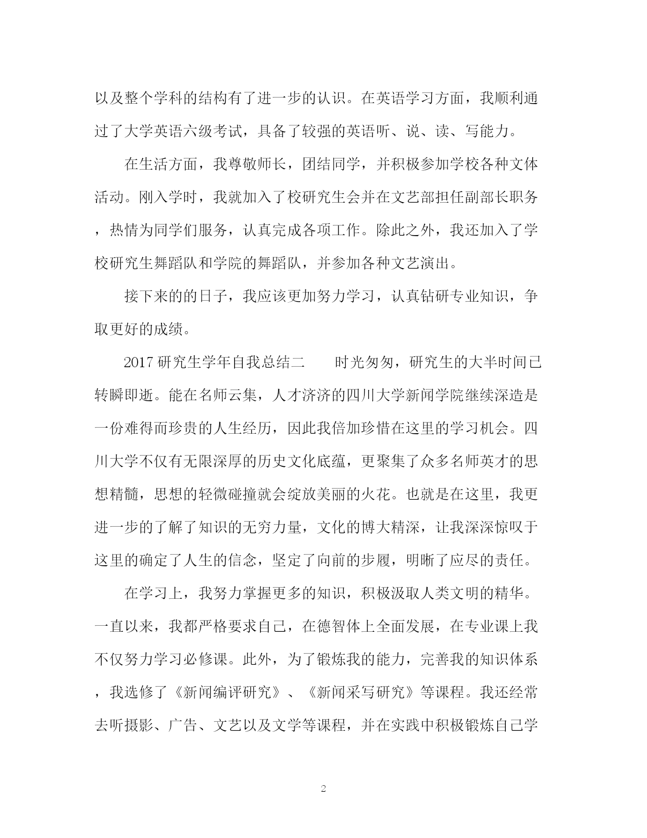 此资料由网络收集而来,如有侵权请告知上传者立即删除。资料共分享,我们负责传递知识。PAGEPAGE10研究生学年自我总结2017研究生学年自我总结自我总结就是把我们的一段时间里的个人基本情况进行一个客观的全面的分析不足成绩以及获得经验。下面是小编搜集整理的2017研究生学年自我总结,欢迎阅读。更多资讯尽在自我总结栏目!2017研究生学年自我总结一时光飞逝,日月如梭。转眼之间我已经是一名研二的学生了。在过去的一年时间里,我在思想、学习、生活都有很大的收获。思想方面,我一直对自己有较高的要求。虽然我还没有加入党组织,但是我始终以共产党员的标准要求自己。我注意学习先进的政治理论,关心国内国际大事,积极拥护党和国家的各项路线、方针、政策,自觉遵守法律、法规和学校的各项规章制度。同时,我清醒地意识到自己所担负的社会责任。对个人的人生理想和发展目标,我也有了相对成熟的认识和定位。在学习方面,我努力学习专业课程,并阅读了大量与本专业相关的书籍和论文,这既让我开阔了视野,也使我对自己研究方向的内容以及整个学科的结构有了进一步的认识。在英语学习方面,我顺利通过了大学英语六级考试,具备了较强的英语听、说、读、写能力。在生活方面,我尊敬师长,团结同学,并积极参加学校各种文体活动。刚入学时,我就加入了校研究生会并在文艺部担任副部长职务,热情为同学们服务,认真完成各项工作。除此之外,我还加入了学校研究生舞蹈队和学院的舞蹈队,并参加各种文艺演出。接下来的的日子,我应该更加努力学习,认真钻研专业知识,争取更好的成绩。2017研究生学年自我总结二时光匆匆,研究生的大半时间已转瞬即逝。能在名师云集,人才济济的四川大学新闻学院继续深造是一份难得而珍贵的人生经历,因此我倍加珍惜在这里的学习机会。四川大学不仅有无限深厚的历史文化底蕴,更聚集了众多名师英才的思想精髓,思想的轻微碰撞就会绽放美丽的火花。也就是在这里,我更进一步的了解了知识的无穷力量,文化的博大精深,让我深深惊叹于这里的确定了人生的信念,坚定了向前的步履,明晰了应尽的责任。在学习上,我努力掌握更多的知识,积极汲取人类文明的精华。一直以来,我都严格要求自己,在德智体上全面发展,在专业课上我不仅努力学习必修课。此外,为了锻炼我的能力,完善我的知识体系,我选修了《新闻编评研究》、《新闻采写研究》等课程。我还经常去听摄影、广告、文艺以及文学等课程,并在实践中积极锻炼自己学以致用的’能力,学习编辑软件、摄影技巧等。在课外我阅读了《消费社会》《童年的消逝》《技术垄断》《景观社会》《理解大众文化》《后现代主义与大众文化》《做新闻》《萨特论艺术》《激进的美学锋芒》《第二性》《图像时代:视觉文化传播的理论诠释》等大量新闻学经典著作,不但领略了不同学派的观点以及其研究方法,我也针对其部分观点发表学术论文。这一系列的学习都是为了补充自己不完善的知识体系。书本是思想的凝缩,是智者的精华,因此,我一有时间就在学校图书馆阅览室阅览或者查阅书刊杂志,不仅仅专业的中外书籍,也阅览包括心理学社会学管理学经济学等书刊杂志。我深知做一个现代的一专多能的人才,必须知识丰富,视野开阔,这样才能有利于我在以后的学习和工作中发展的更好。我深深珍惜在四川大学的读书机会,经常去听新闻传播学、文学、儒学等各种讲座,补充营养,开拓视野,给自己加力。每到周五的时候,我都会参加学校的英语角活动,并认识了很多优秀的同学,他们是我的榜样,也是我向上的力量。除此之外,我阅读大量的英文报刊杂志,并阅读英文原著来补充自己。在研究生阶段,我的英文听说读写能力有了很大提高。在生活方面,我尊敬师长,友爱同学,热心于班级活动,积极参加各种文体活动,努力参与各种社会实践丰富自己的能力。热心于各种学术讲座,博采百家之长,积蓄各种智慧和思想结晶,并积极参加学校和学院的活动,热情为同学们服务,认真完成各项工作,在这一系列的活动中,我进一步开阔了视野,拓展了学习兴趣,大大提高了自身能力。生活中与同学们和谐相处,相互关心,彼此鼓励,共同进步。在思想上,我不断追求进步,参加了学术部,成为入党积极分子。我竭心尽力力争做好表率模范,保持良好的学习态度,关心时政,重视理论修养的提升,坚持我党的优良传统。认真学习党在各个时期的方针政策,领会共产党的思想和宗旨,认真阅读马列主义原著,全面把握了马克思主义与中国革命和建设实践相结合的曲折历程以及当代中国的马克思主义的崭新风貌,进一步理解了党的最高纲领和最低纲领的统一性以及其与党在各个历史时期的路线、方针、政策的内在一致性,进而增强了自己在政治、思想、组织上与党中央保持高度一致的自觉性。在行动上,平时注意作风纪律养成,能够自觉遵守条令条例和研究生队的各项管理规定;入学后,很快探索出与导师、同学和谐相处的适宜