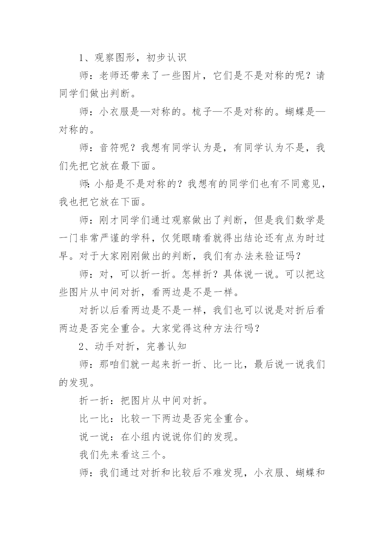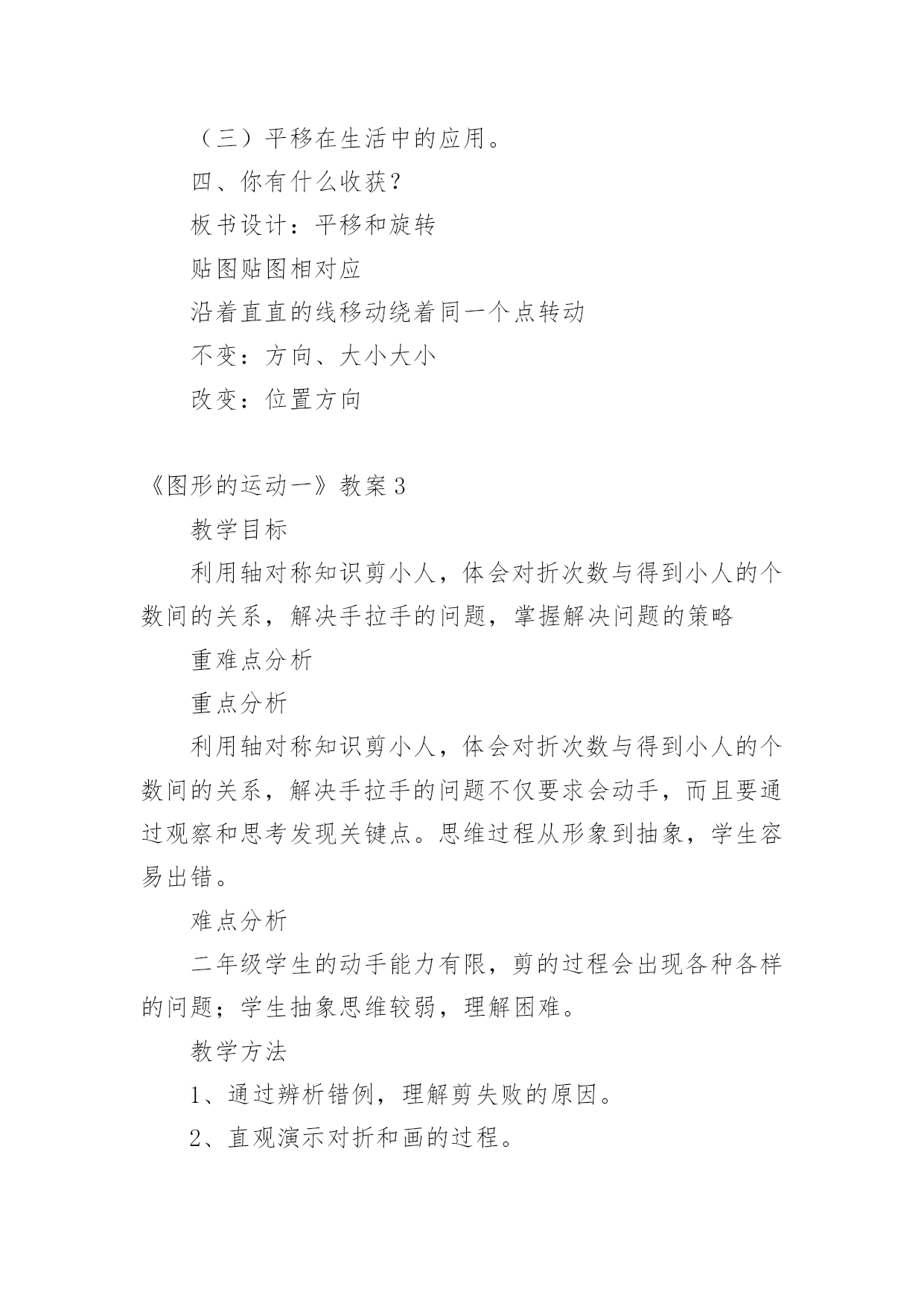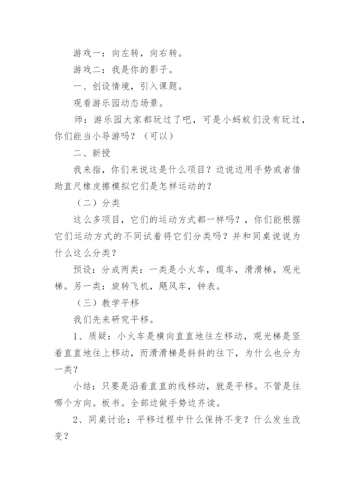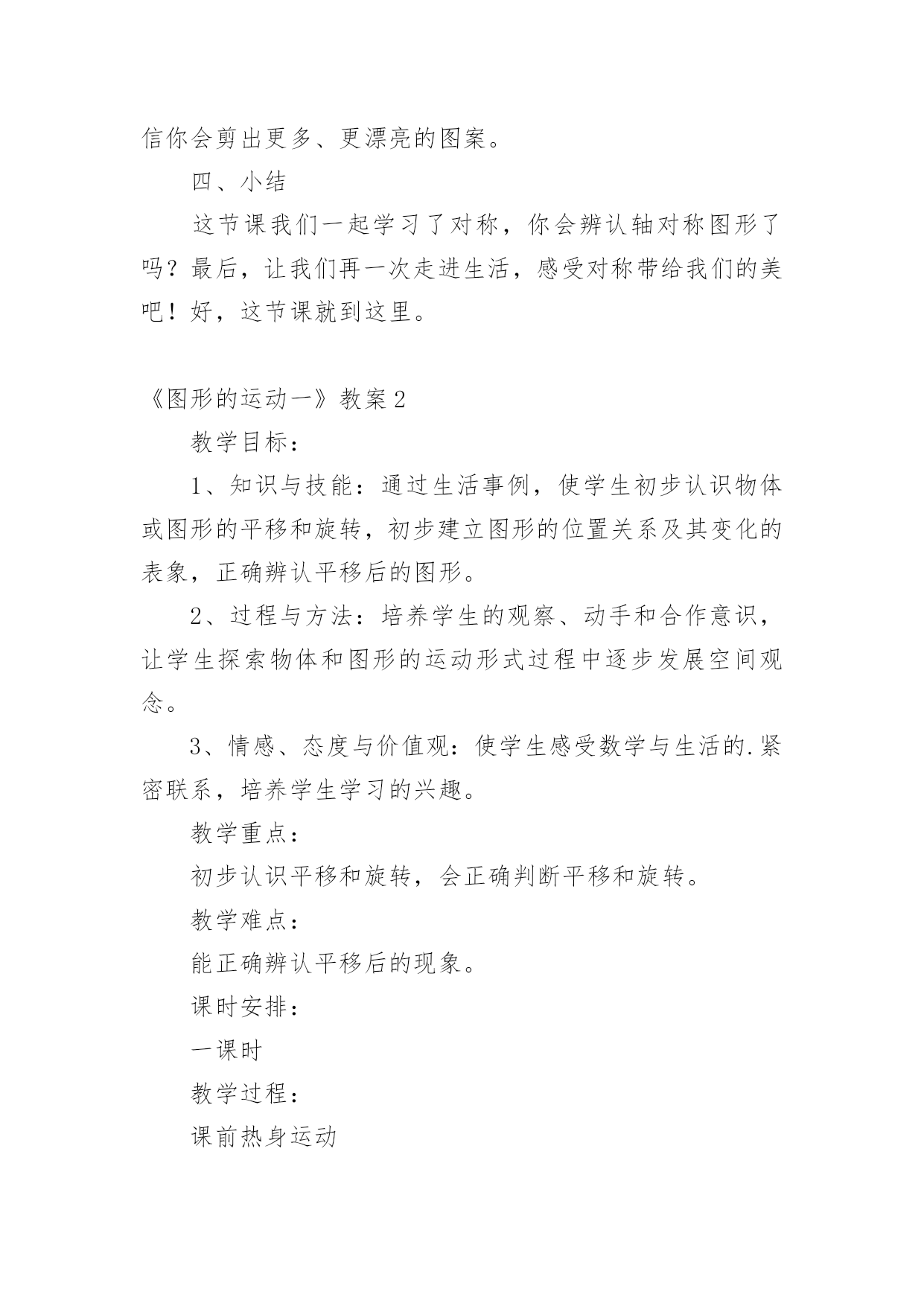 《图形的运动一》教案作为一无名无私奉献的教育工作者,通常会被要求编写教案,教案是备课向课堂教学转化的关节点。如何把教案做到重点突出呢?以下是小编帮大家整理的《图形的运动一》教案,仅供参考,大家一起来看看吧。《图形的运动一》教案1课题名称教学目标认识对称现象和轴对称图形重难点分析重点分析知识点本身比较抽象:轴对称图形需要想象加实际操作相结合。难点分析学生空间想象能力较弱,理解困难:二年级学生的思维主要以形象思维为主,抽象逻辑思维较弱,在图形比较复杂的情况下,很难进行轴对称图形的判断。教学方法1、通过折一折,比一比,感受轴对称图形对折后完全重合的特点。2、通过观察、操作、想象初步认识对称现象和轴对称图形,能判断一个图形是否是轴对称图形。教学过程一、导入师:同学们喜欢做游戏吗?今天我们玩一个猜图形的游戏,根据物体的一部分,猜出这个物体是什么,好吗?师:请看图,对,是剪刀,猜的真准,再来一个你猜出来了吗?到底是什么呢?我们一起来看,奥,是手套。师:再来一幅,对,是螃蟹,那这个呢?你猜出来了吗?到底是什么呢?我们一起来看,奥,是飞机。师:再来一幅,对,是灯笼,那这个呢?你猜出来了吗?到底是什么呢?我们一起来看,奥,是杯子。师:通过刚才的猜图游戏,你发现左边的物体好猜还是右边的物体好猜?确实是左边的好猜,那为什么左边的物体好猜?师:对,因为左边物体两边都是一样的,看到一半很容易想到另一半,右边物体两边都不一样。师:看来还真不能怪有的同学猜的不好。像左边这些物体,两边的大小和形状都是一样的,在数学上,我们称这些物体都是对称的。今天这节课我们就一起来学习对称。二、知识讲解(难点突破)(一)认识对称现象师:像这样的对称现象在生活中有很多,试着说一说,你还见过哪些物体有这种对称的特征?师:对,电视是对称的、黑板是对称的、天安门城楼也是对称的。(二)认识轴对称图形1、观察图形,初步认识师:老师还带来了一些图片,它们是不是对称的呢?请同学们做出判断。师:小衣服是—对称的。梳子—不是对称的。蝴蝶是—对称的。师:音符呢?我想有同学认为是,有同学认为不是,我们先把它放在最下面。师:小船是不是对称的?我想有的同学们也有不同意见,我也把它放在下面。师:刚才同学们通过观察做出了判断,但是我们数学是一门非常严谨的学科,仅凭眼睛看就得出结论还有点为时过早。对于大家刚刚做出的判断,我们有办法来验证吗?师:对,可以折一折。怎样折?具体说一说。可以把这些图片从中间对折,看两边是不是一样。对折以后看两边是不是一样,我们也可以说是对折后看两边是否完全重合。大家觉得这种方法行吗?2、动手对折,完善认知师:那咱们就一起来折一折、比一比,最后说一说我们的发现。折一折:把图片从中间对折。比一比:比较一下两边是否完全重合。说一说:在小组内说说你们的发现。我们先来看这三个。师:我们通过对折和比较后不难发现,小衣服、蝴蝶和花朵的两边都能够完全重合,所以它们三个是对称的。师:仔细观察花朵,你还发现什么?对,花朵既可以左右对折,也可以上下或斜着对折,对折后两边都能完全重合,相信你能很全面的观察。师:再来说一说梳子,通过对折你有什么发现?师:对,梳子无论怎样对折都不能完全重合,所以它肯定不是对称的。最后我们来看这两图形,刚才同学们的意见不太统一,现在你们想说点什么?可以指着说一说。师:对,音符对折后有一部分能重合,但是还有一部分没有重合,所以它不是对称的。看来对折后我们还需要认真观察,有一点不一样都不行。师:那小船呢?对,小船对折后不能重合,所以它也不是对称的。可是这两只小鸭子是一模一样的啊?说说你的想法。师:对,虽然这两只小鸭子是一样的,但是对折后无法完全重合,所以它也不是对称的。师:原来我们在判断一个图形是否对称时,除了要看两边是否一样,还要看对折后两边是否一样。我师:把它也拿走。现在黑板上只剩下了这三个图形,它们在对折后都能够完全重合,在数学上,我们把这样的图形叫做“轴对称图形”。3、实际操作,深化认知师:刚才,大家一致认为这件小衣服是轴对称图形,下面我们就专门来研究研究它。你有什么办法能把它剪出来吗?师:对,可以先对折。那,为什么要对折?对,对折后只需要剪出衣服的一半就可以了。师:真是一个好方法,这样剪出来的图形两边一定可以完全重合。课下请同学们用这种方法剪一剪、试一试。除了小衣服,你还可以尝试着剪一剪其他的图形,比一比谁剪得最有创意,剪得时候要注意安全!师:老师搜集了一些同学的作品,我们一起欣赏一下。师:这些作品都是出自同学们灵巧的双手,看着我都想动手试一试。老师这里有剪下的一些图形,但是剪下来的图形和剩下的'纸边不小心弄乱了,你能猜出下面的图形分别是从哪张纸上剪下来的吗?师:这个是,对了,这个呢?对,这个呢,对。同学们真善于思考,这些作品,虽然形状不同,大小不同,但都是通过对折之