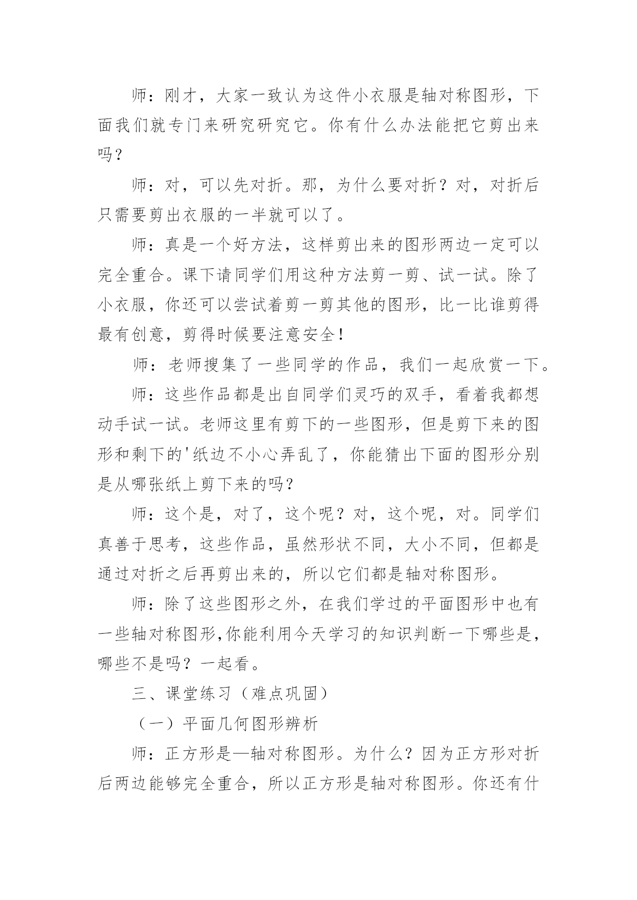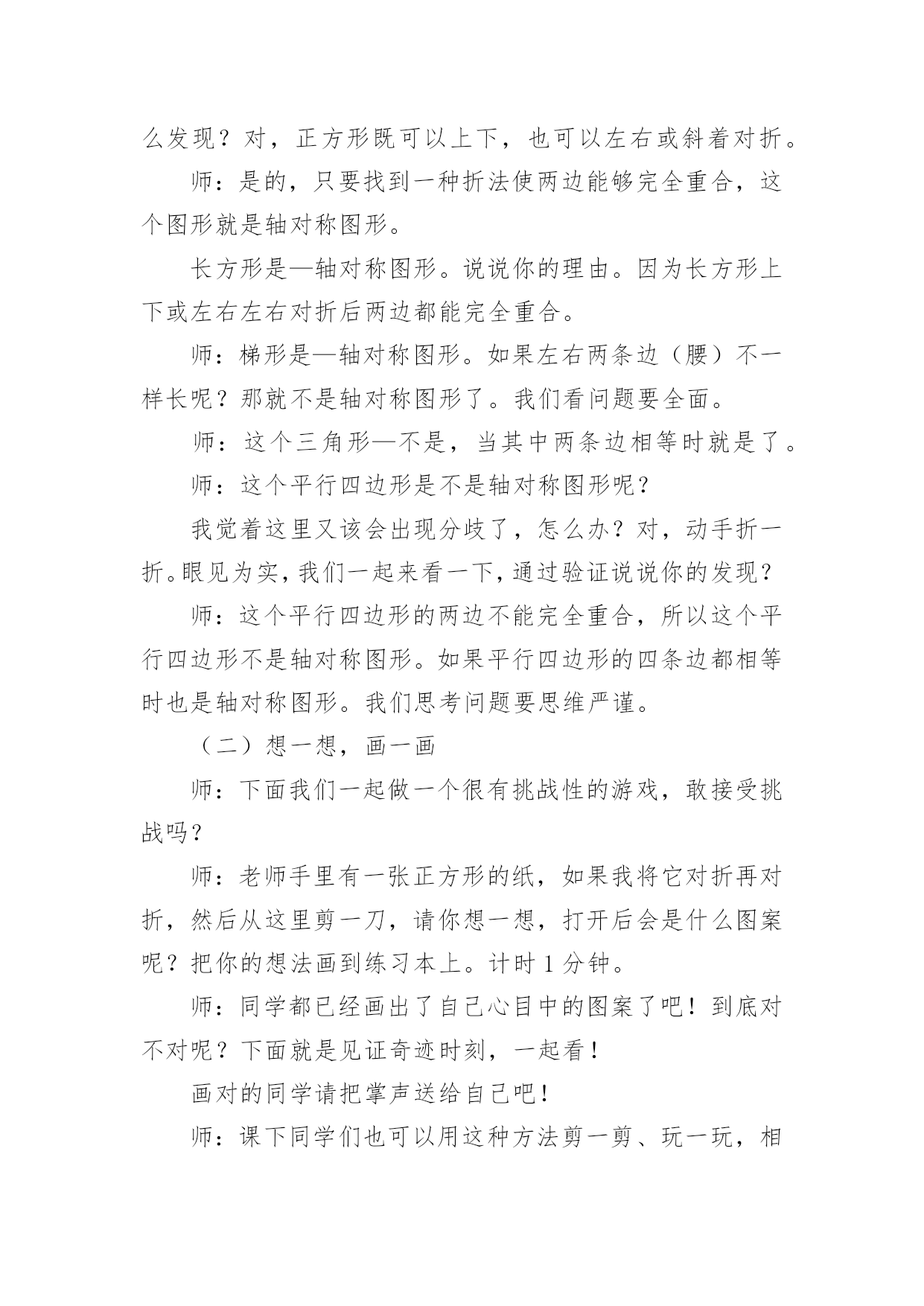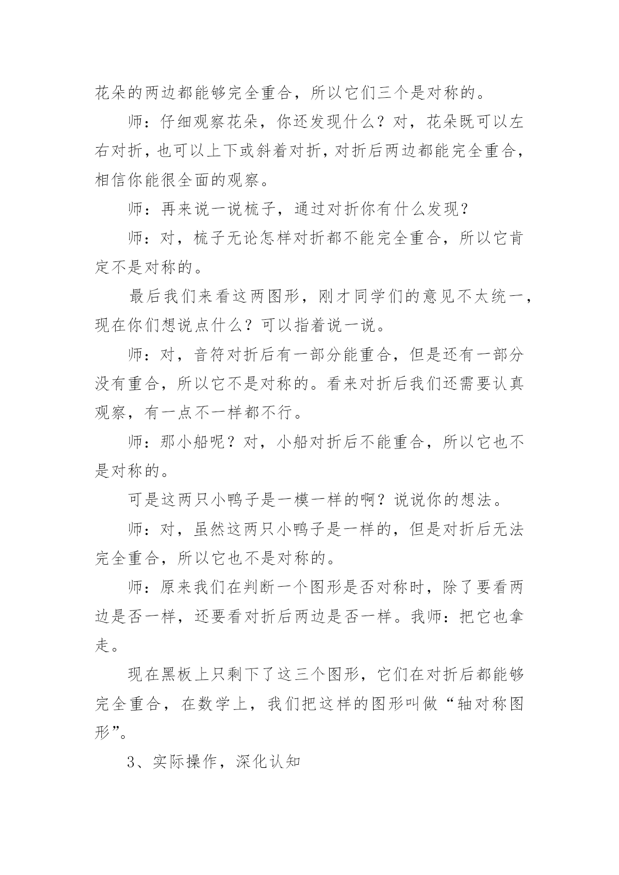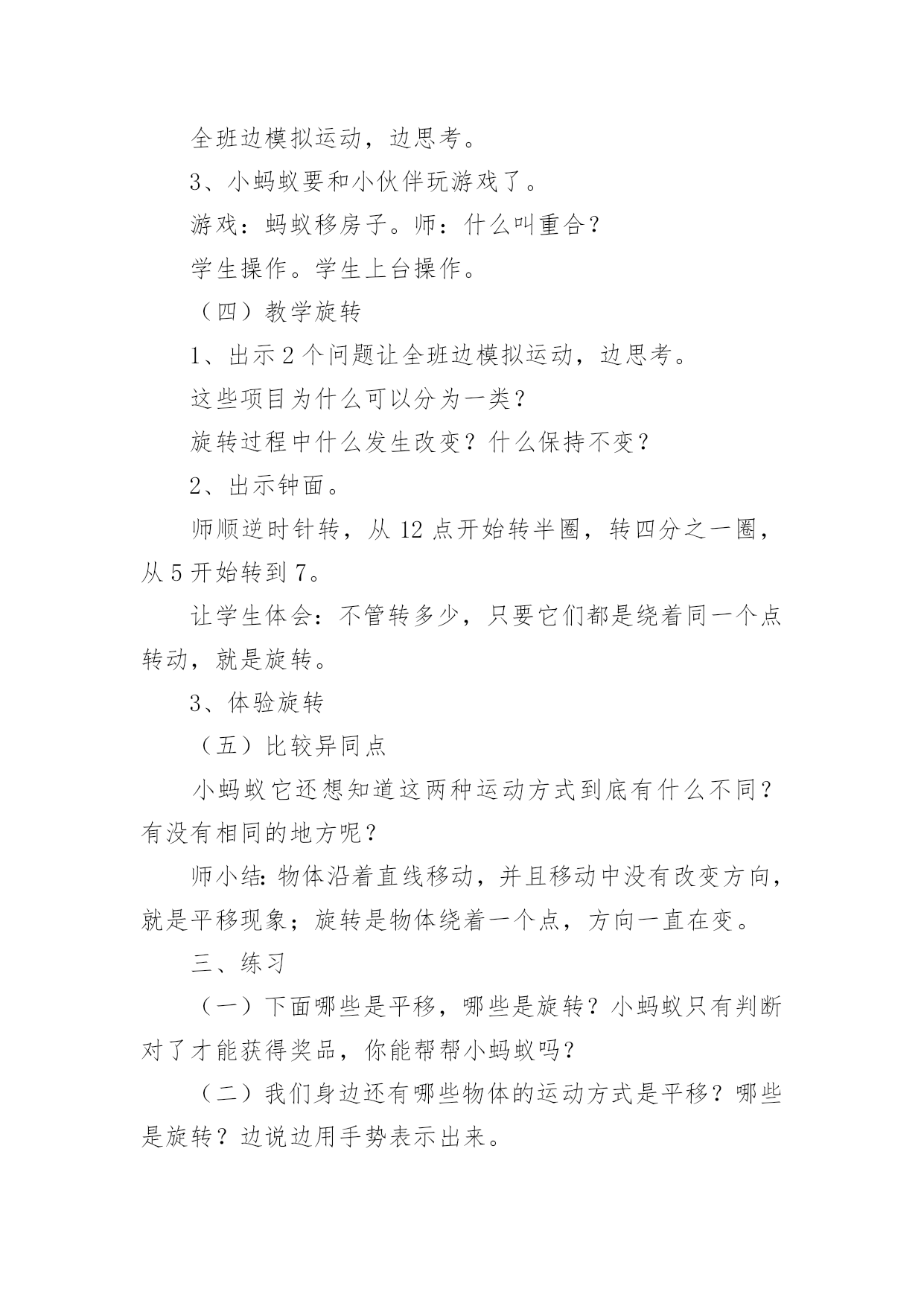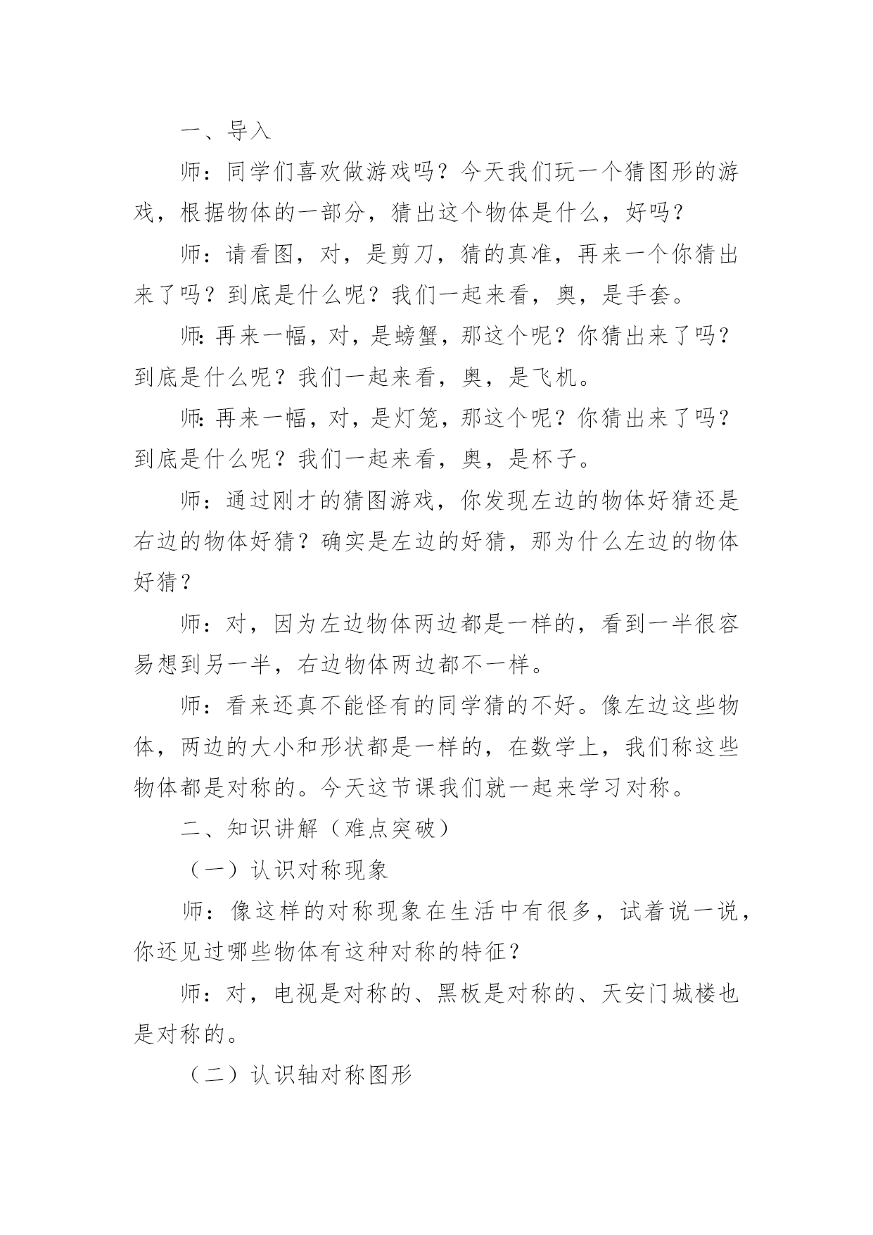 《图形的运动一》教案作为一无名无私奉献的教育工作者,通常会被要求编写教案,教案是备课向课堂教学转化的关节点。如何把教案做到重点突出呢?以下是小编帮大家整理的《图形的运动一》教案,仅供参考,大家一起来看看吧。《图形的运动一》教案1课题名称教学目标认识对称现象和轴对称图形重难点分析重点分析知识点本身比较抽象:轴对称图形需要想象加实际操作相结合。难点分析学生空间想象能力较弱,理解困难:二年级学生的思维主要以形象思维为主,抽象逻辑思维较弱,在图形比较复杂的情况下,很难进行轴对称图形的判断。教学方法1、通过折一折,比一比,感受轴对称图形对折后完全重合的特点。2、通过观察、操作、想象初步认识对称现象和轴对称图形,能判断一个图形是否是轴对称图形。教学过程一、导入师:同学们喜欢做游戏吗?今天我们玩一个猜图形的游戏,根据物体的一部分,猜出这个物体是什么,好吗?师:请看图,对,是剪刀,猜的真准,再来一个你猜出来了吗?到底是什么呢?我们一起来看,奥,是手套。师:再来一幅,对,是螃蟹,那这个呢?你猜出来了吗?到底是什么呢?我们一起来看,奥,是飞机。师:再来一幅,对,是灯笼,那这个呢?你猜出来了吗?到底是什么呢?我们一起来看,奥,是杯子。师:通过刚才的猜图游戏,你发现左边的物体好猜还是右边的物体好猜?确实是左边的好猜,那为什么左边的物体好猜?师:对,因为左边物体两边都是一样的,看到一半很容易想到另一半,右边物体两边都不一样。师:看来还真不能怪有的同学猜的不好。像左边这些物体,两边的大小和形状都是一样的,在数学上,我们称这些物体都是对称的。今天这节课我们就一起来学习对称。二、知识讲解(难点突破)(一)认识对称现象师:像这样的对称现象在生活中有很多,试着说一说,你还见过哪些物体有这种对称的特征?师:对,电视是对称的、黑板是对称的、天安门城楼也是对称的。(二)认识轴对称图形1、观察图形,初步认识师:老师还带来了一些图片,它们是不是对称的呢?请同学们做出判断。师:小衣服是—对称的。梳子—不是对称的。蝴蝶是—对称的。师:音符呢?我想有同学认为是,有同学认为不是,我们先把它放在最下面。师:小船是不是对称的?我想有的同学们也有不同意见,我也把它放在下面。师:刚才同学们通过观察做出了判断,但是我们数学是一门非常严谨的学科,仅凭眼睛看就得出结论还有点为时过早。对于大家刚刚做出的判断,我们有办法来验证吗?师:对,可以折一折。怎样折?具体说一说。可以把这些图片从中间对折,看两边是不是一样。对折以后看两边是不是一样,我们也可以说是对折后看两边是否完全重合。大家觉得这种方法行吗?2、动手对折,完善认知师:那咱们就一起来折一折、比一比,最后说一说我们的发现。折一折:把图片从中间对折。比一比:比较一下两边是否完全重合。说一说:在小组内说说你们的发现。我们先来看这三个。师:我们通过对折和比较后不难发现,小衣服、蝴蝶和花朵的两边都能够完全重合,所以它们三个是对称的。师:仔细观察花朵,你还发现什么?对,花朵既可以左右对折,也可以上下或斜着对折,对折后两边都能完全重合,相信你能很全面的观察。师:再来说一说梳子,通过对折你有什么发现?师:对,梳子无论怎样对折都不能完全重合,所以它肯定不是对称的。最后我们来看这两图形,刚才同学们的意见不太统一,现在你们想说点什么?可以指着说一说。师:对,音符对折后有一部分能重合,但是还有一部分没有重合,所以它不是对称的。看来对折后我们还需要认真观察,有一点不一样都不行。师:那小船呢?对,小船对折后不能重合,所以它也不是对称的。可是这两只小鸭子是一模一样的啊?说说你的想法。师:对,虽然这两只小鸭子是一样的,但是对折后无法完全重合,所以它也不是对称的。师:原来我们在判断一个图形是否对称时,除了要看两边是否一样,还要看对折后两边是否一样。我师:把它也拿走。现在黑板上只剩下了这三个图形,它们在对折后都能够完全重合,在数学上,我们把这样的图形叫做“轴对称图形”。3、实际操作,深化认知师:刚才,大家一致认为这件小衣服是轴对称图形,下面我们就专门来研究研究它。你有什么办法能把它剪出来吗?师:对,可以先对折。那,为什么要对折?对,对折后只需要剪出衣服的一半就可以了。师:真是一个好方法,这样剪出来的图形两边一定可以完全重合。课下请同学们用这种方法剪一剪、试一试。除了小衣服,你还可以尝试着剪一剪其他的图形,比一比谁剪得最有创意,剪得时候要注意安全!师:老师搜集了一些同学的作品,我们一起欣赏一下。师:这些作品都是出自同学们灵巧的双手,看着我都想动手试一试。老师这里有剪下的一些图形,但是剪下来的图形和剩下的'纸边不小心弄乱了,你能猜出下面的图形分别是从哪张纸上剪下来的吗?师:这个是,对了,这个呢?对,这个呢,对。同学们真善于思考,这些作品,虽然形状不同,大小不同,但都是通过对折之