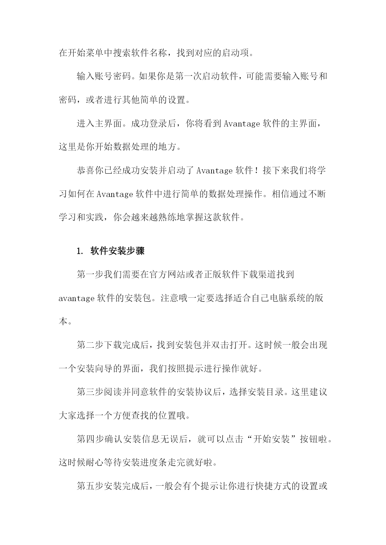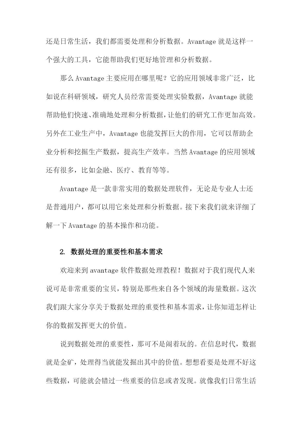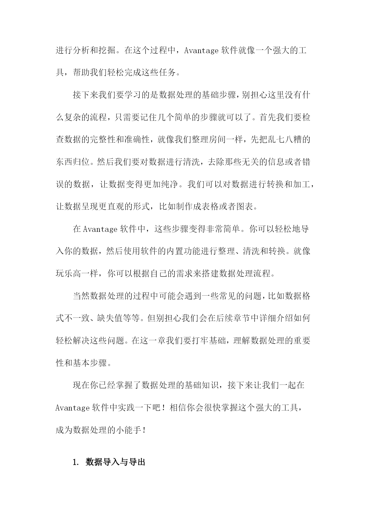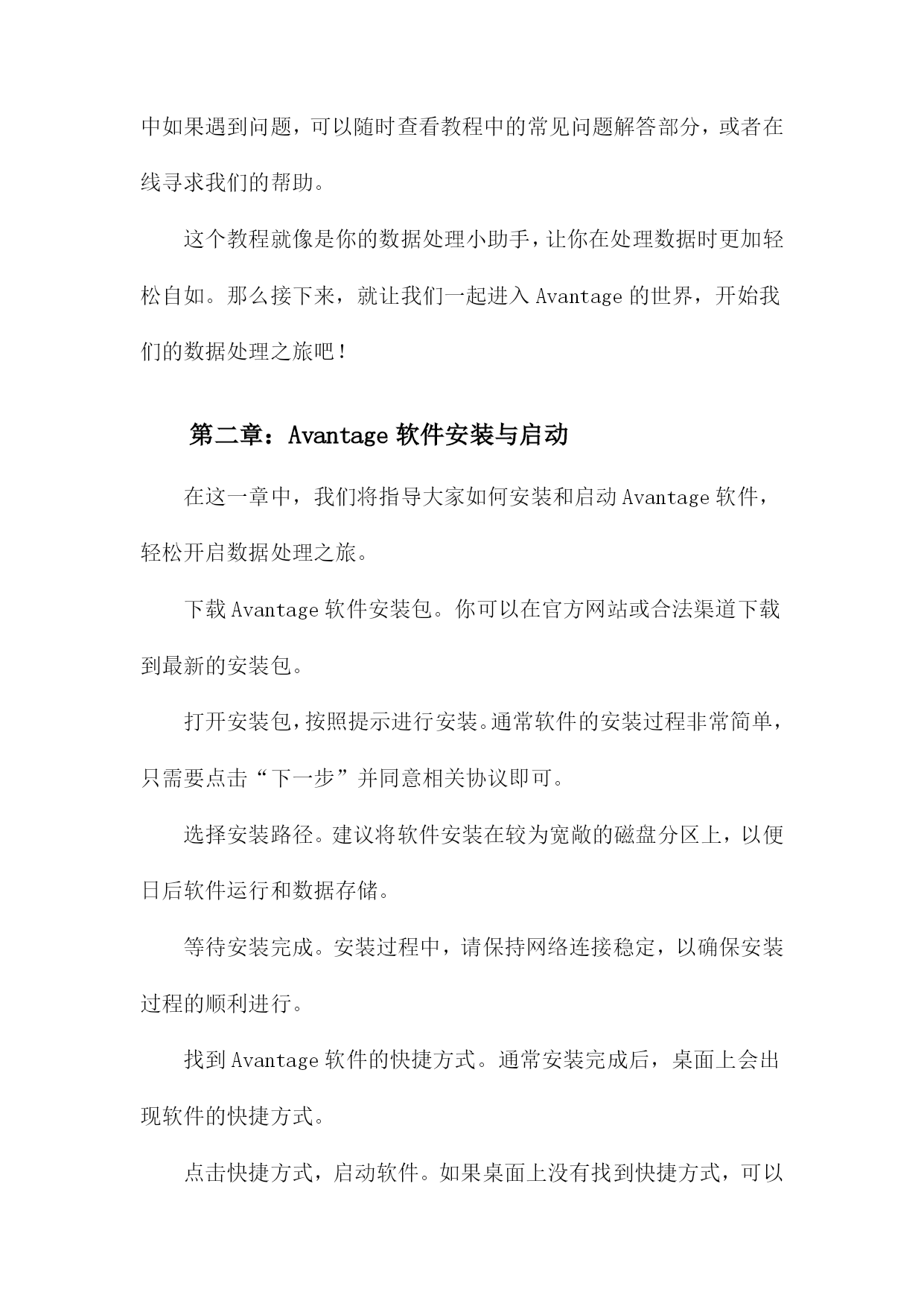 avantage软件简单数据处理教程一、文章标题:《avantage软件简单数据处理教程》欢迎来到Avantage软件的奇妙世界!你是不是经常遇到数据处理方面的困扰,尤其是面对大量数据时感到无从下手?今天就让我带你一起探索如何使用Avantage软件轻松处理数据,让你的数据处理之路变得更加顺畅。你是不是刚刚接触Avantage软件,或者是对它的一些功能还不太熟悉?没关系本教程将为你详细介绍这款软件的基本操作和数据处理的简便方法。在这里你不会感受到冰冷的机器语言,只有接地气的操作指南和通俗易懂的解释。我会用最朴实、最直接的语言,帮助你理解每一个步骤和操作。首先让我们先来了解一下Avantage软件。这款软件以其强大的数据处理能力受到广大用户的喜爱,无论是数据分析、数据可视化还是数据整合,Avantage都能轻松应对。更重要的是,它的操作界面友好,即使是没有专业背景的小白也能轻松上手。准备好了吗?让我们一起踏上这次数据处理之旅吧!相信通过本教程的学习,你将能够轻松掌握Avantage软件的数据处理方法,让你的数据处理之路更加顺畅。让我们一起探索数据的奥秘,开启数据处理的新篇章!二、文章大纲:欢迎来到《avantage软件简单数据处理教程》的第二部分!接下来我们将一起探索这个教程的内容大纲,别担心我们会用简单易懂的方式,帮助你一步步掌握avantage软件的数据处理技巧。在这一部分,我们会先简要介绍avantage软件是什么,它的功能是什么,以及为什么我们需要进行数据处理。用轻松的语言,让你对软件有个初步的了解。接下来我们会讲解软件的基础操作,别担心我们会用简单的话语和生动的图示,一步步教你如何打开软件、导入数据、导出数据等。这里我们不会让你感到有任何压力。在这一部分,我们会详细介绍一些数据处理技巧。我们会讲解如何筛选数据、排序数据、计算数据等。我们会在实践中教你如何使用这些技巧,让你更快地掌握。在这一部分,我们会列出一些常见问题,并给出解答。无论你在使用过程中遇到什么问题,都可以在这里找到答案。我们希望通过这种方式,帮助你更好地使用软件。第一章:简述欢迎来到《avantage软件简单数据处理教程》的学习之旅!在这里我们将一起探索如何使用avantage软件轻松处理数据,让复杂的数据变得简单易懂。你是否曾为海量的数据感到困扰,不知道如何下手处理?或是觉得数据处理是一件遥不可及的事情,需要深厚的专业知识才能胜任?其实有了avantage软件,一切变得简单多了!avantage软件是一款功能强大的数据处理工具,无论你是数据分析的新手还是老手,都能轻松上手。它能帮助你快速整理、分析和可视化数据,让你从繁杂的数据中迅速找到有价值的信息。在这本教程中,我们将一步步带你了解avantage软件的基本操作和数据处理的技巧。我们不会讲复杂的专业术语,而是用通俗易懂的语言,让你轻松跟上学习的步伐。不用担心数据处理不再遥不可及,拿起这本教程,跟着我们一起探索avantage软件的魅力吧!让我们一起享受数据处理带来的乐趣和成就感!1.介绍Avantage软件及其应用领域Avantage是一款功能强大的数据处理软件,就像我们处理照片会用Photoshop,处理视频会用Premiere一样,Avantage主要是用来处理各种数据的。在现代社会,数据无处不在,无论是科研、工作还是日常生活,我们都需要处理和分析数据。Avantage就是这样一个强大的工具,它能帮助我们更好地管理和分析数据。那么Avantage主要应用在哪里呢?它的应用领域非常广泛,比如说在科研领域,研究人员经常需要处理实验数据,Avantage就能帮助他们快速、准确地处理和分析数据,让他们的研究工作更加高效。另外在工业生产中,Avantage也能发挥巨大的作用,它可以帮助企业分析和挖掘生产数据,提高生产效率。当然Avantage的应用领域还有很多,比如金融、医疗、教育等等。Avantage是一款非常实用的数据处理软件,无论是专业人士还是普通用户,都可以用它来处理和分析数据。接下来我们就来详细了解一下Avantage的基本操作和功能。2.数据处理的重要性和基本需求欢迎来到avantage软件数据处理教程!数据对于我们现代人来说可是非常重要的宝贝,特别是那些来自各个领域的海量数据。这次我们跟大家分享关于数据处理的重要性和基本需求,让你知道怎样让你的数据发挥更大的价值。说到数据处理的重要性,那可不是闹着玩的。在信息时代,数据就是金矿,处理得当就能发掘出其中的价值。想想看要是处理不好这些数据,可能就会错过一些重要的信息或者发现。就像我们日常生活中整理照片、视频一样,数据处理也是为了让我们的数据更清晰、更有条理。那么数据处理有哪些基本需求呢?首先你得知道数