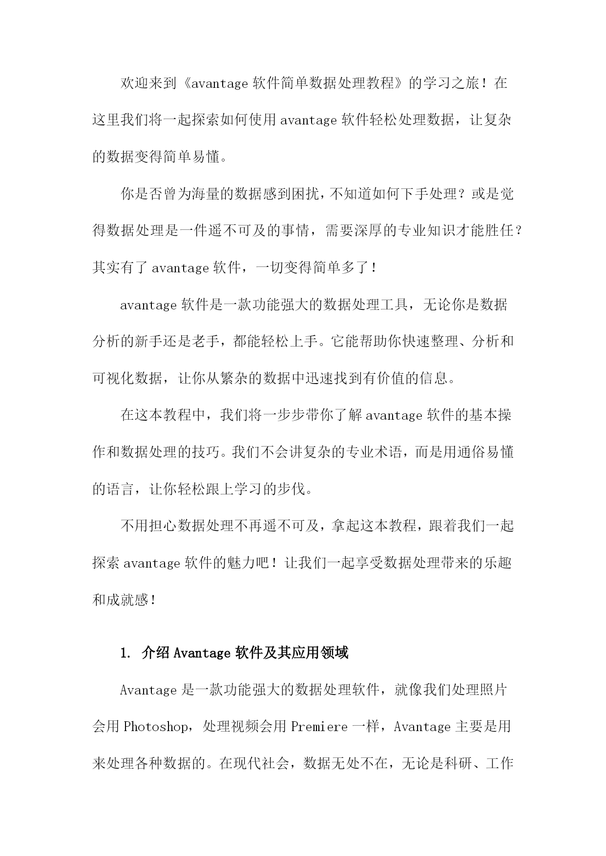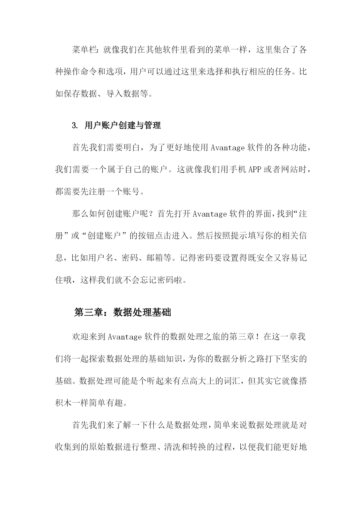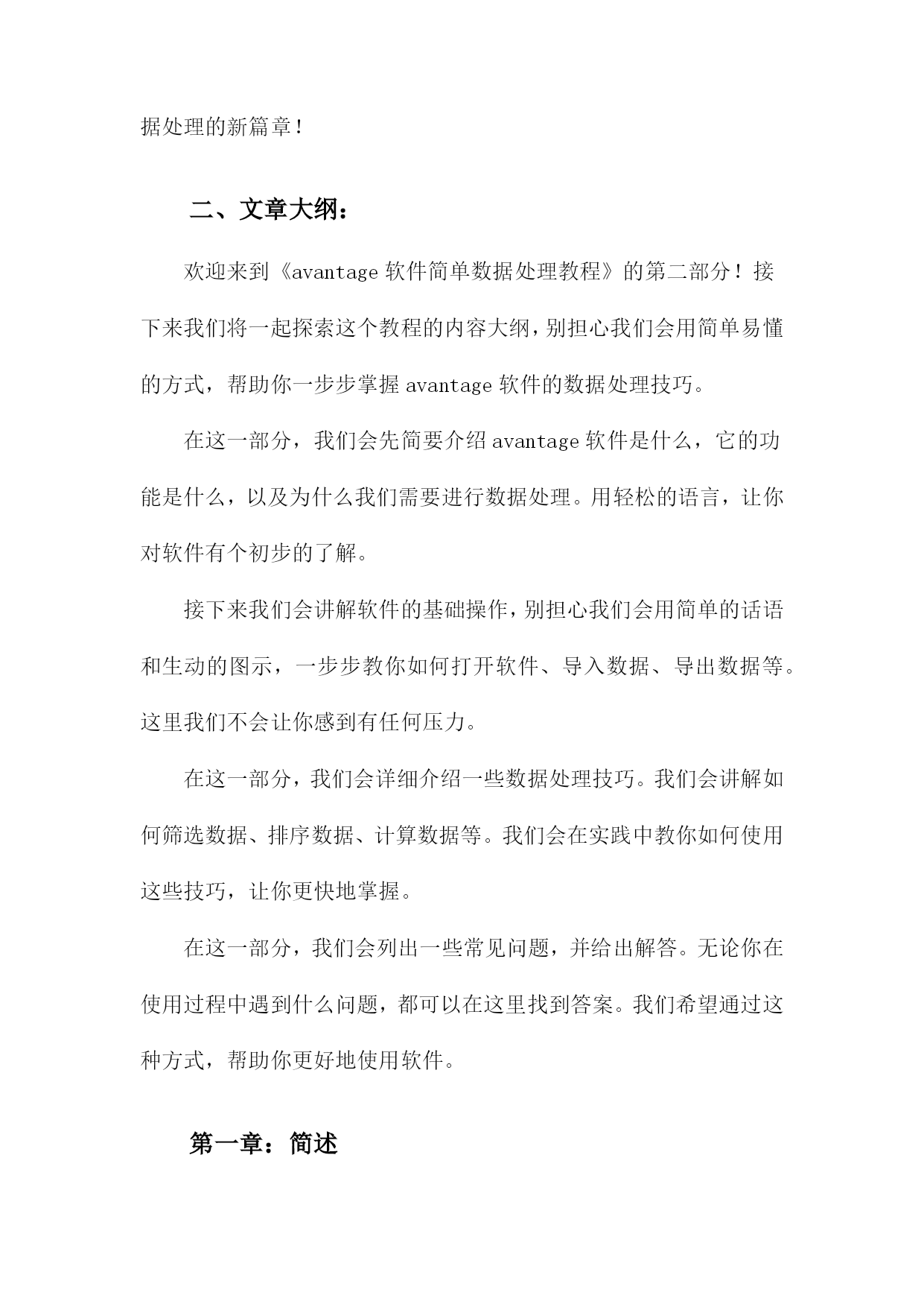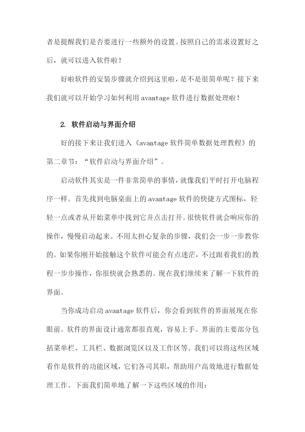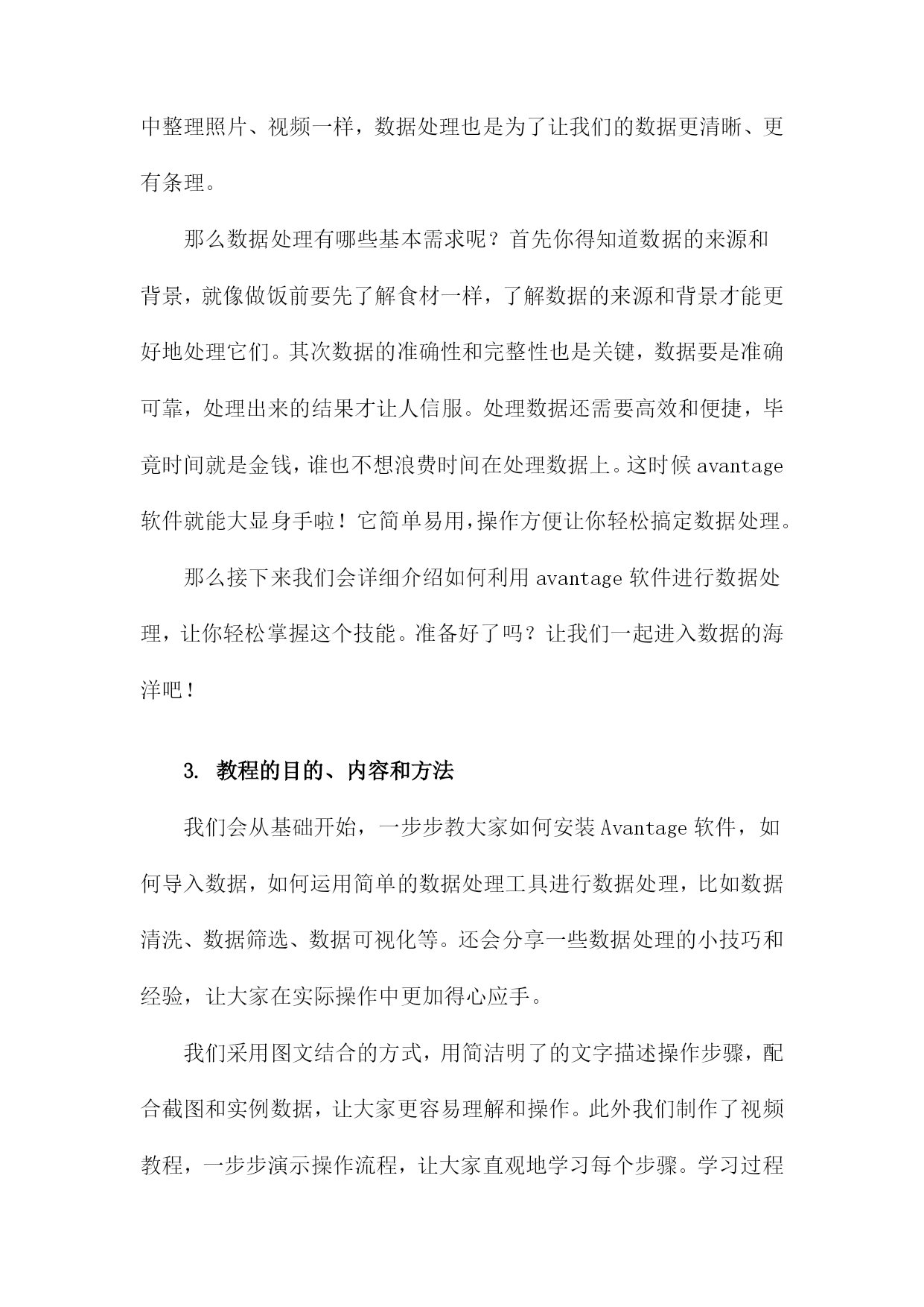 avantage软件简单数据处理教程一、文章标题:《avantage软件简单数据处理教程》欢迎来到Avantage软件的奇妙世界!你是不是经常遇到数据处理方面的困扰,尤其是面对大量数据时感到无从下手?今天就让我带你一起探索如何使用Avantage软件轻松处理数据,让你的数据处理之路变得更加顺畅。你是不是刚刚接触Avantage软件,或者是对它的一些功能还不太熟悉?没关系本教程将为你详细介绍这款软件的基本操作和数据处理的简便方法。在这里你不会感受到冰冷的机器语言,只有接地气的操作指南和通俗易懂的解释。我会用最朴实、最直接的语言,帮助你理解每一个步骤和操作。首先让我们先来了解一下Avantage软件。这款软件以其强大的数据处理能力受到广大用户的喜爱,无论是数据分析、数据可视化还是数据整合,Avantage都能轻松应对。更重要的是,它的操作界面友好,即使是没有专业背景的小白也能轻松上手。准备好了吗?让我们一起踏上这次数据处理之旅吧!相信通过本教程的学习,你将能够轻松掌握Avantage软件的数据处理方法,让你的数据处理之路更加顺畅。让我们一起探索数据的奥秘,开启数据处理的新篇章!二、文章大纲:欢迎来到《avantage软件简单数据处理教程》的第二部分!接下来我们将一起探索这个教程的内容大纲,别担心我们会用简单易懂的方式,帮助你一步步掌握avantage软件的数据处理技巧。在这一部分,我们会先简要介绍avantage软件是什么,它的功能是什么,以及为什么我们需要进行数据处理。用轻松的语言,让你对软件有个初步的了解。接下来我们会讲解软件的基础操作,别担心我们会用简单的话语和生动的图示,一步步教你如何打开软件、导入数据、导出数据等。这里我们不会让你感到有任何压力。在这一部分,我们会详细介绍一些数据处理技巧。我们会讲解如何筛选数据、排序数据、计算数据等。我们会在实践中教你如何使用这些技巧,让你更快地掌握。在这一部分,我们会列出一些常见问题,并给出解答。无论你在使用过程中遇到什么问题,都可以在这里找到答案。我们希望通过这种方式,帮助你更好地使用软件。第一章:简述欢迎来到《avantage软件简单数据处理教程》的学习之旅!在这里我们将一起探索如何使用avantage软件轻松处理数据,让复杂的数据变得简单易懂。你是否曾为海量的数据感到困扰,不知道如何下手处理?或是觉得数据处理是一件遥不可及的事情,需要深厚的专业知识才能胜任?其实有了avantage软件,一切变得简单多了!avantage软件是一款功能强大的数据处理工具,无论你是数据分析的新手还是老手,都能轻松上手。它能帮助你快速整理、分析和可视化数据,让你从繁杂的数据中迅速找到有价值的信息。在这本教程中,我们将一步步带你了解avantage软件的基本操作和数据处理的技巧。我们不会讲复杂的专业术语,而是用通俗易懂的语言,让你轻松跟上学习的步伐。不用担心数据处理不再遥不可及,拿起这本教程,跟着我们一起探索avantage软件的魅力吧!让我们一起享受数据处理带来的乐趣和成就感!1.介绍Avantage软件及其应用领域Avantage是一款功能强大的数据处理软件,就像我们处理照片会用Photoshop,处理视频会用Premiere一样,Avantage主要是用来处理各种数据的。在现代社会,数据无处不在,无论是科研、工作还是日常生活,我们都需要处理和分析数据。Avantage就是这样一个强大的工具,它能帮助我们更好地管理和分析数据。那么Avantage主要应用在哪里呢?它的应用领域非常广泛,比如说在科研领域,研究人员经常需要处理实验数据,Avantage就能帮助他们快速、准确地处理和分析数据,让他们的研究工作更加高效。另外在工业生产中,Avantage也能发挥巨大的作用,它可以帮助企业分析和挖掘生产数据,提高生产效率。当然Avantage的应用领域还有很多,比如金融、医疗、教育等等。Avantage是一款非常实用的数据处理软件,无论是专业人士还是普通用户,都可以用它来处理和分析数据。接下来我们就来详细了解一下Avantage的基本操作和功能。2.数据处理的重要性和基本需求欢迎来到avantage软件数据处理教程!数据对于我们现代人来说可是非常重要的宝贝,特别是那些来自各个领域的海量数据。这次我们跟大家分享关于数据处理的重要性和基本需求,让你知道怎样让你的数据发挥更大的价值。说到数据处理的重要性,那可不是闹着玩的。在信息时代,数据就是金矿,处理得当就能发掘出其中的价值。想想看要是处理不好这些数据,可能就会错过一些重要的信息或者发现。就像我们日常生活中整理照片、视频一样,数据处理也是为了让我们的数据更清晰、更有条理。那么数据处理有哪些基本需求呢?首先你得知道数