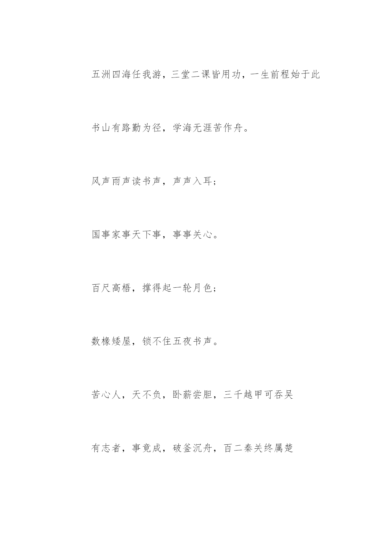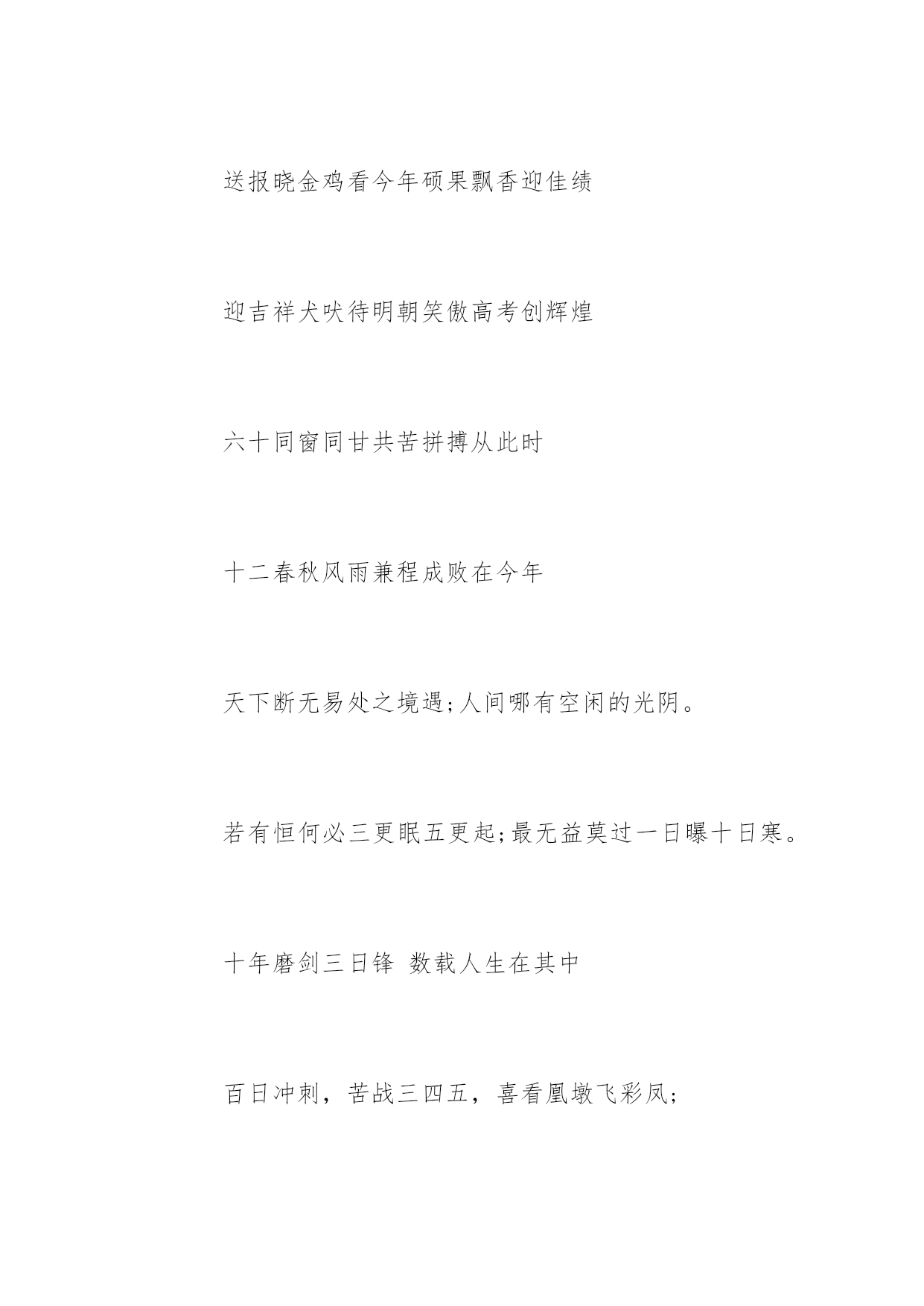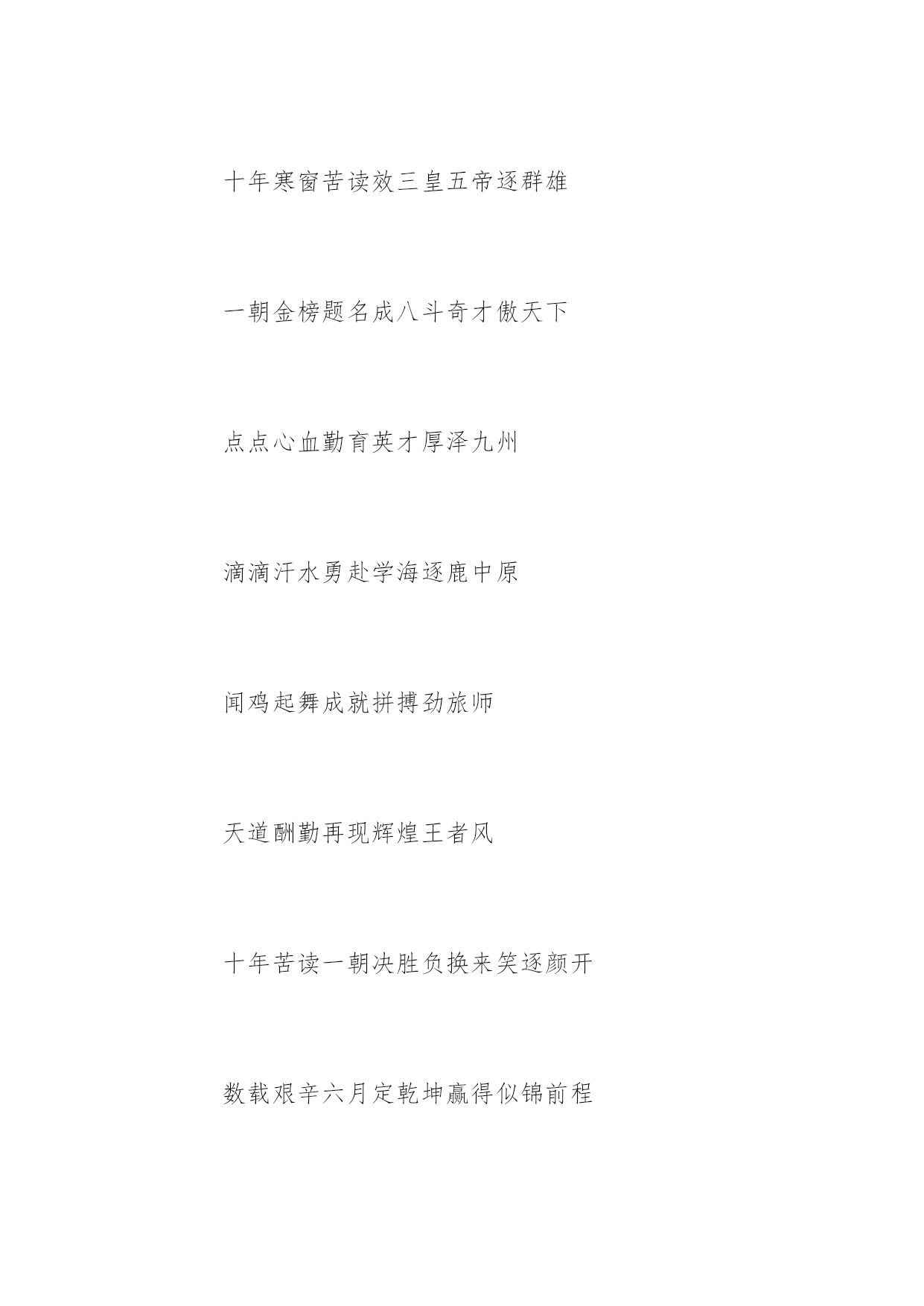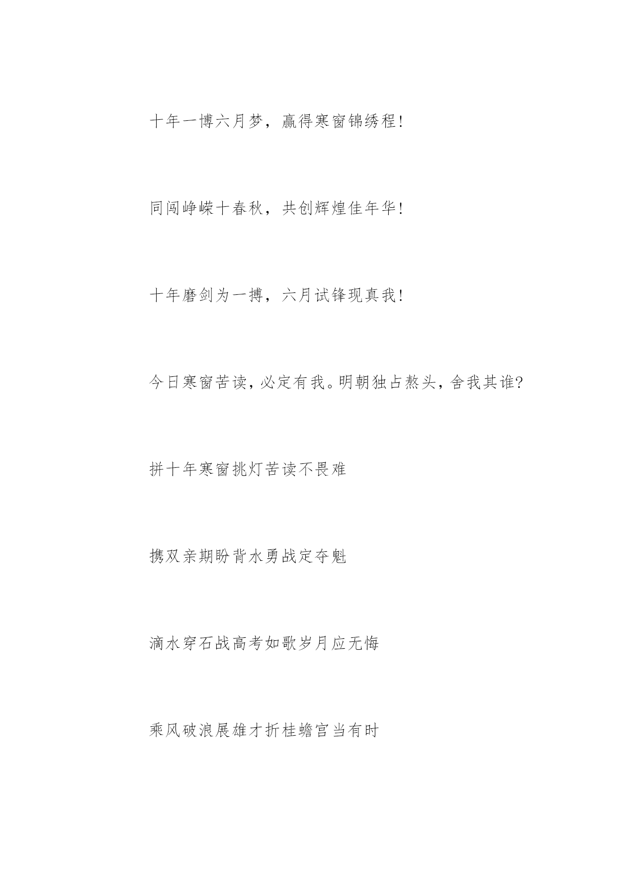 迎战高考鼓励标语口号迎战高考鼓励标语口号精选滴水穿石战高考如歌岁月应无悔,乘风破浪展雄才折桂蟾宫当有时!下面是YJBYS小编整理的迎战高考鼓励标语口号精选,欢迎阅读!头悬梁,锥刺骨,巾帼挥毫书奇志三更火,五更鸡,须眉仗笔写华章今朝灯火阑珊处,何忧无友它年折桂古蟾宫,必定有君一心读遍圣贤书,三心二意无益处,四书五经励我志,五洲四海任我游,三堂二课皆用功,一生前程始于此书山有路勤为径,学海无涯苦作舟。风声雨声读书声,声声入耳;国事家事天下事,事事关心。百尺高梧,撑得起一轮月色;数椽矮屋,锁不住五夜书声。苦心人,天不负,卧薪尝胆,三千越甲可吞吴有志者,事竟成,破釜沉舟,百二秦关终属楚十年一博六月梦,赢得寒窗锦绣程!同闯峥嵘十春秋,共创辉煌佳年华!十年磨剑为一搏,六月试锋现真我!今日寒窗苦读,必定有我。明朝独占熬头,舍我其谁?拼十年寒窗挑灯苦读不畏难携双亲期盼背水勇战定夺魁滴水穿石战高考如歌岁月应无悔乘风破浪展雄才折桂蟾宫当有时十年寒窗苦读效三皇五帝逐群雄一朝金榜题名成八斗奇才傲天下点点心血勤育英才厚泽九州滴滴汗水勇赴学海逐鹿中原闻鸡起舞成就拼搏劲旅师天道酬勤再现辉煌王者风十年苦读一朝决胜负换来笑逐颜开数载艰辛六月定乾坤赢得似锦前程送报晓金鸡看今年硕果飘香迎佳绩迎吉祥犬吠待明朝笑傲高考创辉煌六十同窗同甘共苦拼搏从此时十二春秋风雨兼程成败在今年天下断无易处之境遇;人间哪有空闲的光阴。若有恒何必三更眠五更起;最无益莫过一日曝十日寒。十年磨剑三日锋数载人生在其中百日冲刺,苦战三四五,喜看凰墩飞彩凤;一心教学,笑迎七八九,争传瓜井育贤才。