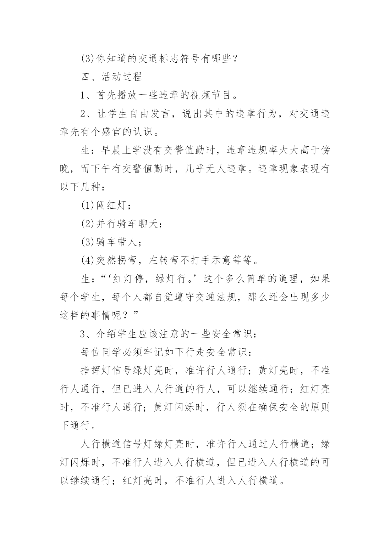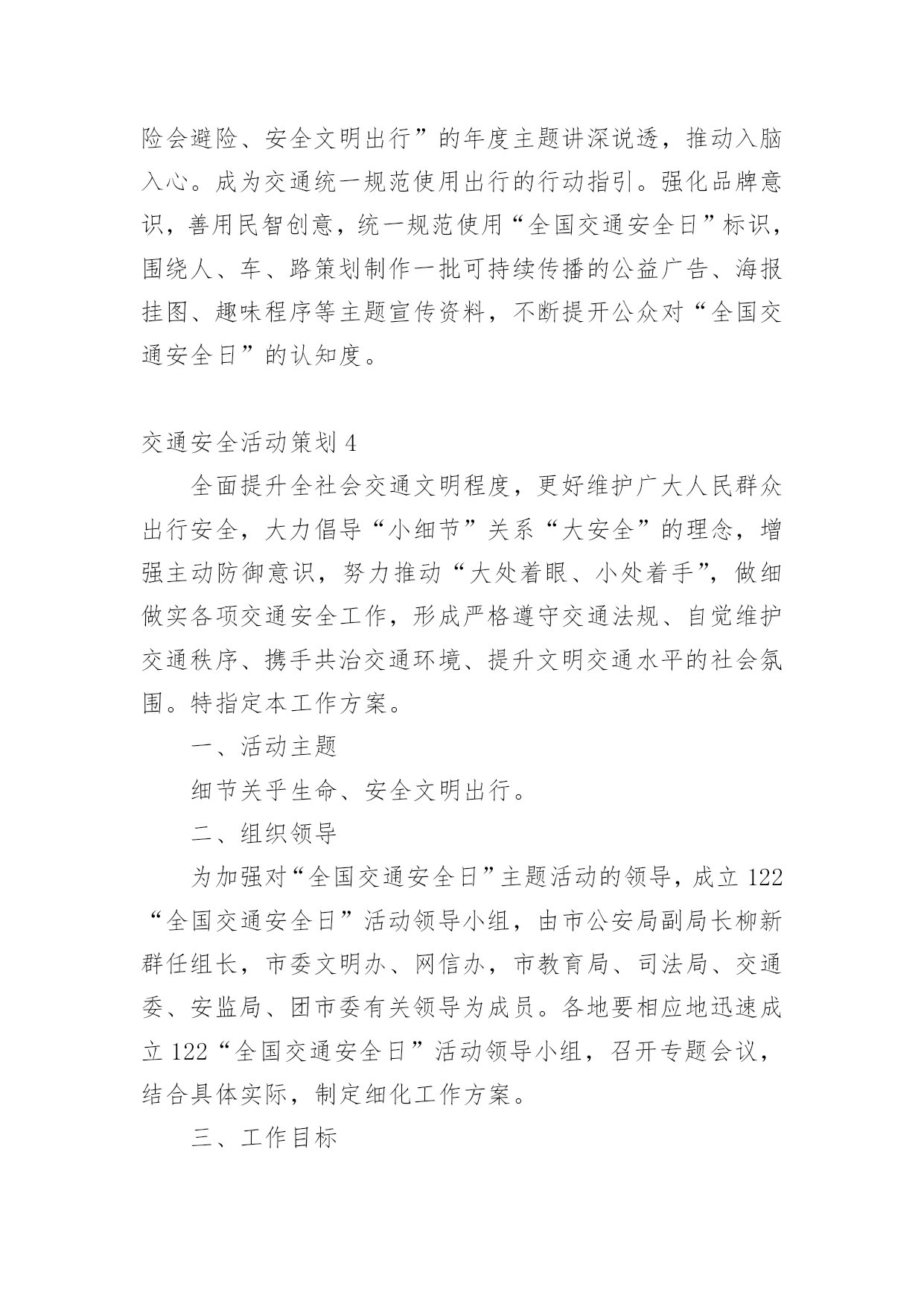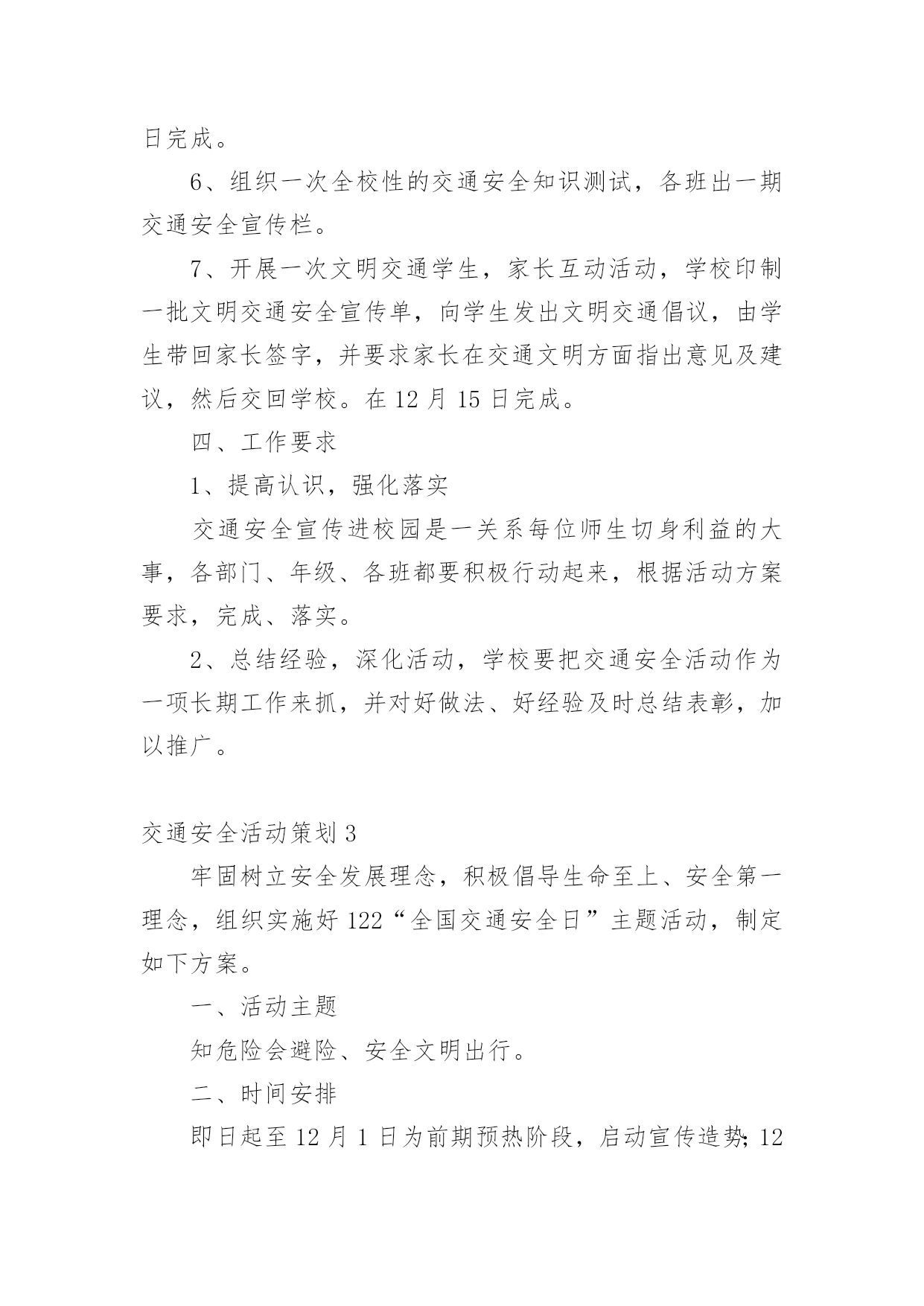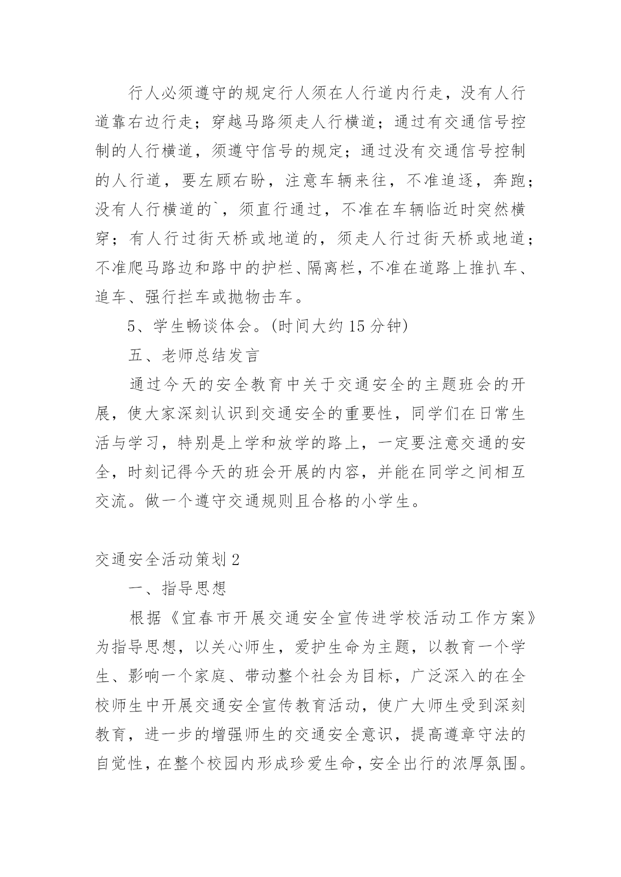 交通安全活动策划交通安全活动策划1一、活动背景交通安全是中小学生日常生活中的一件头等大事。可是我们的小学生是否都能严格遵守交通法规呢?面对青少年严重的交通安全问题,所以我认为有必要就小学生交通法规教育进行探索,有必要对小学生遵守交通法规的现状和意识进行调查,并让学生亲身参加社会实践,帮助学生提高交通法规的认知水平。二、指导思想(一)使学生牢固树立“珍爱生命,安全第一,遵纪守法,和谐共处”的意识,具备自救自护的素养和能力。(二)通过开展交通安全教育,培养学生的社会安全责任感,使学生逐步形成安全意识,掌握必要的安全行为的知识和技能。(三)交通安全教育要遵循学生身心发展规律,把握学生认知特点,注重实践性、实用性和实效性。坚持知识教育与强化管理、培养习惯相结合;学校教育与家庭、社会教育相结合;自救自护与力所能及地帮助他人相结合。三、班会活动准备问卷调查(1)你身边的违反交通规则的行为有哪些?(2)你认为学生违反交通规则时的心理是什么?(3)你知道的交通标志符号有哪些?四、活动过程1、首先播放一些违章的视频节目。2、让学生自由发言,说出其中的违章行为,对交通违章先有个感官的认识。生:早晨上学没有交警值勤时,违章违规率大大高于傍晚,而下午有交警值勤时,几乎无人违章。违章现象表现有以下几种:(1)闯红灯;(2)并行骑车聊天;(3)骑车带人;(4)突然拐弯,左转弯不打手示意等等。生:“‘红灯停,绿灯行。’这个多么简单的道理,如果每个学生,每个人都自觉遵守交通法规,那么还会出现多少这样的事情呢?”3、介绍学生应该注意的一些安全常识:每位同学必须牢记如下行走安全常识:指挥灯信号绿灯亮时,准许行人通行;黄灯亮时,不准行人通行,但已进入人行道的行人,可以继续通行;红灯亮时,不准行人通行;黄灯闪烁时,行人须在确保安全的原则下通行。人行横道信号灯绿灯亮时,准许行人通过人行横道;绿灯闪烁时,不准行人进入人行横道,但已进入人行横道的可以继续通行;红灯亮时,不准行人进入人行横道。行人必须遵守的规定行人须在人行道内行走,没有人行道靠右边行走;穿越马路须走人行横道;通过有交通信号控制的人行横道,须遵守信号的规定;通过没有交通信号控制的人行道,要左顾右盼,注意车辆来往,不准追逐,奔跑;没有人行横道的`,须直行通过,不准在车辆临近时突然横穿;有人行过街天桥或地道的,须走人行过街天桥或地道;不准爬马路边和路中的护栏、隔离栏,不准在道路上推扒车、追车、强行拦车或抛物击车。5、学生畅谈体会。(时间大约15分钟)五、老师总结发言通过今天的安全教育中关于交通安全的主题班会的开展,使大家深刻认识到交通安全的重要性,同学们在日常生活与学习,特别是上学和放学的路上,一定要注意交通的安全,时刻记得今天的班会开展的内容,并能在同学之间相互交流。做一个遵守交通规则且合格的小学生。交通安全活动策划2一、指导思想根据《宜春市开展交通安全宣传进学校活动工作方案》为指导思想,以关心师生,爱护生命为主题,以教育一个学生、影响一个家庭、带动整个社会为目标,广泛深入的在全校师生中开展交通安全宣传教育活动,使广大师生受到深刻教育,进一步的增强师生的交通安全意识,提高遵章守法的自觉性,在整个校园内形成珍爱生命,安全出行的浓厚氛围。针对校园交通安全管理的薄弱环节,采取有效的措施,扎实的做好校园交通安全宣传工作,为全校师生创造一个安全、文明、祥和的工作和学习环境。二、工作目标全面落实交通安全知识进学校、进课堂,以创建交通安全学校为目标,力争全校师生在交通法规和交通安全常识受教育率达到100%,行车、走路抽查合格率达90%以上。全校师生无严重交通违法记录,全校师生的交通安全意识和遵章守法的自觉性得到明显的提高。三、活动内容根据宜春市交通安全宣传进学校活动的`要求,从我校实际情况出发,我校计划落实以下内容。1、建立一个固定交通宣传栏,并根据实际情况更换或增加新的内容,宣传栏在12月17日前完成。2、规范校园内及校门口车辆的停放,师生有专门的停车棚,小车有专用停车位。校门口划出停车位。在12月5日前完成。3、聘请两位交通安全教育辅导员,并与辅导员商量好具体活动内容,在业务上得到指导帮助。利用国旗下的讲话进行交通安全教育,在12月17日前完成。4、印制交通安全宣传资料,下发给每一位学生,并利用班会时间,统一组织学习。5、积极发挥学生会干部的作用,在学生进校及放学时,在校内及校门口,对学生进行交通安全检查监督。在12月3日完成。6、组织一次全校性的交通安全知识测试,各班出一期交通安全宣传栏。7、开展一次文明交通学生,家长互动活动,学校印制一批文明交通安全宣传单,向学生发出文明交通倡议,由学生带回家长签字,并要求家长在交通文明方面指出意见及建议,然后交回学校。在12月15日完成。四、工作要求1、提高认识,强化落实交通安