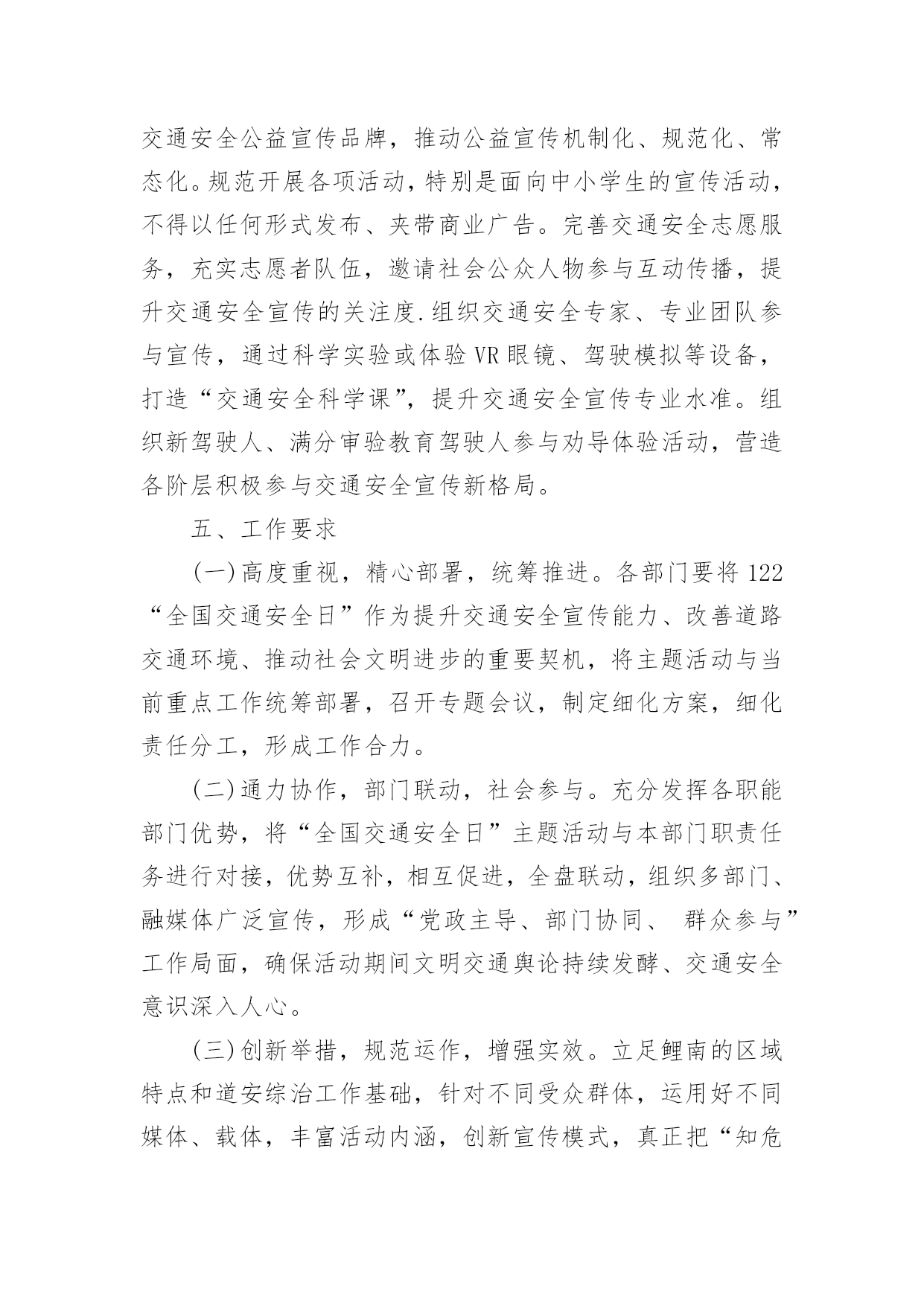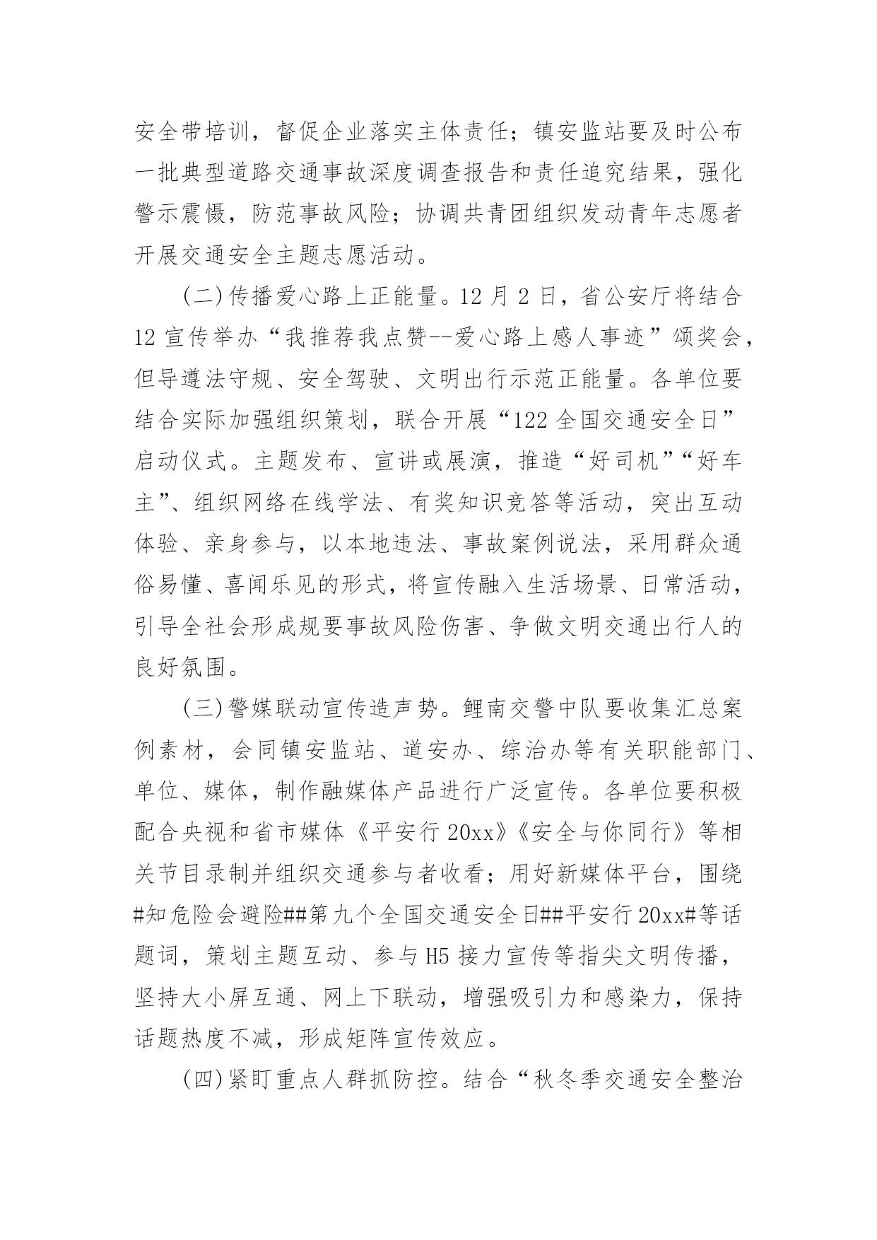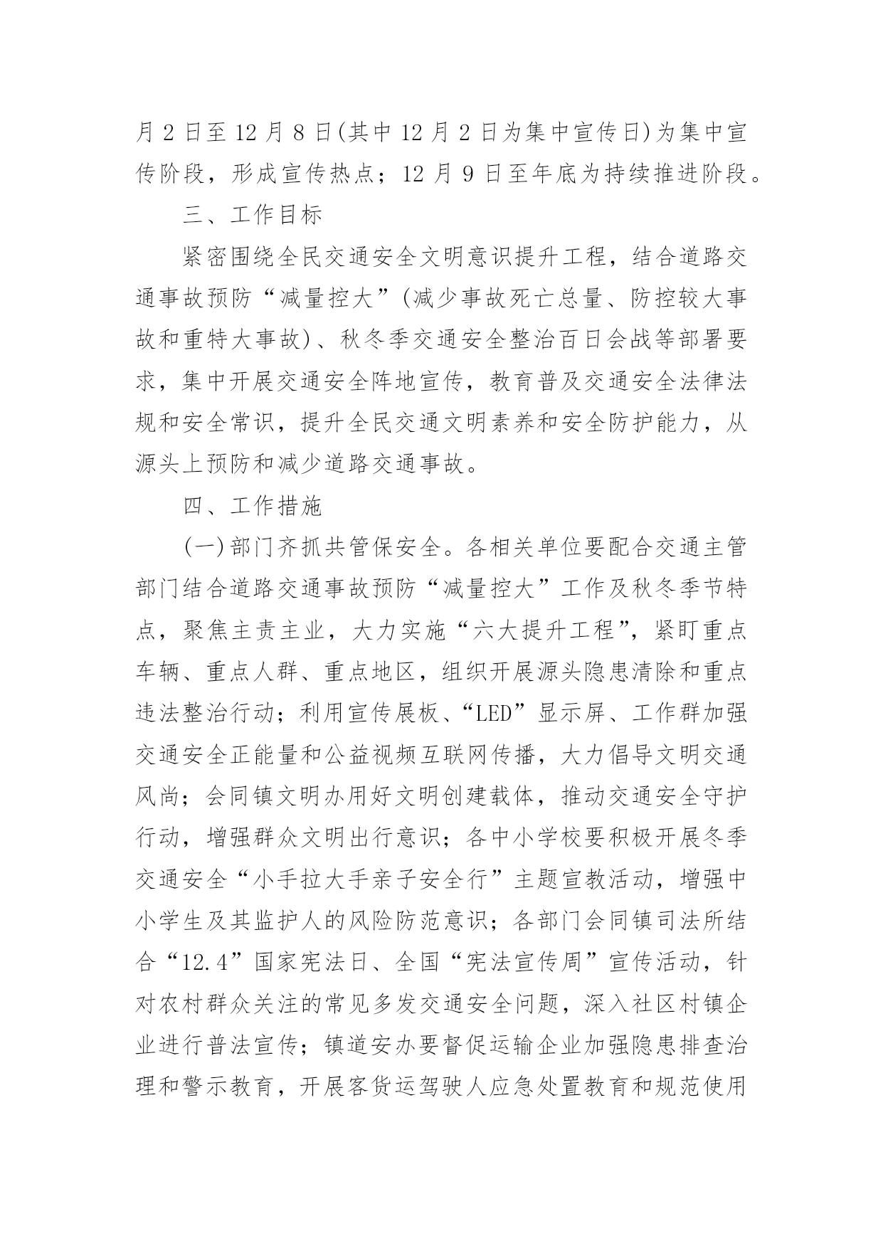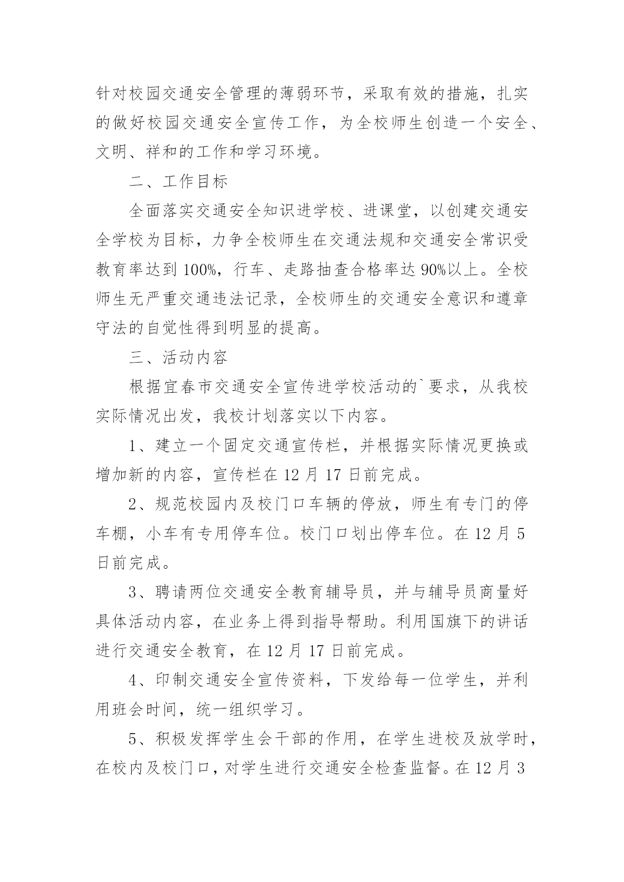 交通安全活动策划交通安全活动策划1一、活动背景交通安全是中小学生日常生活中的一件头等大事。可是我们的小学生是否都能严格遵守交通法规呢?面对青少年严重的交通安全问题,所以我认为有必要就小学生交通法规教育进行探索,有必要对小学生遵守交通法规的现状和意识进行调查,并让学生亲身参加社会实践,帮助学生提高交通法规的认知水平。二、指导思想(一)使学生牢固树立“珍爱生命,安全第一,遵纪守法,和谐共处”的意识,具备自救自护的素养和能力。(二)通过开展交通安全教育,培养学生的社会安全责任感,使学生逐步形成安全意识,掌握必要的安全行为的知识和技能。(三)交通安全教育要遵循学生身心发展规律,把握学生认知特点,注重实践性、实用性和实效性。坚持知识教育与强化管理、培养习惯相结合;学校教育与家庭、社会教育相结合;自救自护与力所能及地帮助他人相结合。三、班会活动准备问卷调查(1)你身边的违反交通规则的行为有哪些?(2)你认为学生违反交通规则时的心理是什么?(3)你知道的交通标志符号有哪些?四、活动过程1、首先播放一些违章的视频节目。2、让学生自由发言,说出其中的违章行为,对交通违章先有个感官的认识。生:早晨上学没有交警值勤时,违章违规率大大高于傍晚,而下午有交警值勤时,几乎无人违章。违章现象表现有以下几种:(1)闯红灯;(2)并行骑车聊天;(3)骑车带人;(4)突然拐弯,左转弯不打手示意等等。生:“‘红灯停,绿灯行。’这个多么简单的道理,如果每个学生,每个人都自觉遵守交通法规,那么还会出现多少这样的事情呢?”3、介绍学生应该注意的一些安全常识:每位同学必须牢记如下行走安全常识:指挥灯信号绿灯亮时,准许行人通行;黄灯亮时,不准行人通行,但已进入人行道的行人,可以继续通行;红灯亮时,不准行人通行;黄灯闪烁时,行人须在确保安全的原则下通行。人行横道信号灯绿灯亮时,准许行人通过人行横道;绿灯闪烁时,不准行人进入人行横道,但已进入人行横道的可以继续通行;红灯亮时,不准行人进入人行横道。行人必须遵守的规定行人须在人行道内行走,没有人行道靠右边行走;穿越马路须走人行横道;通过有交通信号控制的人行横道,须遵守信号的规定;通过没有交通信号控制的人行道,要左顾右盼,注意车辆来往,不准追逐,奔跑;没有人行横道的`,须直行通过,不准在车辆临近时突然横穿;有人行过街天桥或地道的,须走人行过街天桥或地道;不准爬马路边和路中的护栏、隔离栏,不准在道路上推扒车、追车、强行拦车或抛物击车。5、学生畅谈体会。(时间大约15分钟)五、老师总结发言通过今天的安全教育中关于交通安全的主题班会的开展,使大家深刻认识到交通安全的重要性,同学们在日常生活与学习,特别是上学和放学的路上,一定要注意交通的安全,时刻记得今天的班会开展的内容,并能在同学之间相互交流。做一个遵守交通规则且合格的小学生。交通安全活动策划2一、指导思想根据《宜春市开展交通安全宣传进学校活动工作方案》为指导思想,以关心师生,爱护生命为主题,以教育一个学生、影响一个家庭、带动整个社会为目标,广泛深入的在全校师生中开展交通安全宣传教育活动,使广大师生受到深刻教育,进一步的增强师生的交通安全意识,提高遵章守法的自觉性,在整个校园内形成珍爱生命,安全出行的浓厚氛围。针对校园交通安全管理的薄弱环节,采取有效的措施,扎实的做好校园交通安全宣传工作,为全校师生创造一个安全、文明、祥和的工作和学习环境。二、工作目标全面落实交通安全知识进学校、进课堂,以创建交通安全学校为目标,力争全校师生在交通法规和交通安全常识受教育率达到100%,行车、走路抽查合格率达90%以上。全校师生无严重交通违法记录,全校师生的交通安全意识和遵章守法的自觉性得到明显的提高。三、活动内容根据宜春市交通安全宣传进学校活动的`要求,从我校实际情况出发,我校计划落实以下内容。1、建立一个固定交通宣传栏,并根据实际情况更换或增加新的内容,宣传栏在12月17日前完成。2、规范校园内及校门口车辆的停放,师生有专门的停车棚,小车有专用停车位。校门口划出停车位。在12月5日前完成。3、聘请两位交通安全教育辅导员,并与辅导员商量好具体活动内容,在业务上得到指导帮助。利用国旗下的讲话进行交通安全教育,在12月17日前完成。4、印制交通安全宣传资料,下发给每一位学生,并利用班会时间,统一组织学习。5、积极发挥学生会干部的作用,在学生进校及放学时,在校内及校门口,对学生进行交通安全检查监督。在12月3日完成。6、组织一次全校性的交通安全知识测试,各班出一期交通安全宣传栏。7、开展一次文明交通学生,家长互动活动,学校印制一批文明交通安全宣传单,向学生发出文明交通倡议,由学生带回家长签字,并要求家长在交通文明方面指出意见及建议,然后交回学校。在12月15日完成。四、工作要求1、提高认识,强化落实交通安