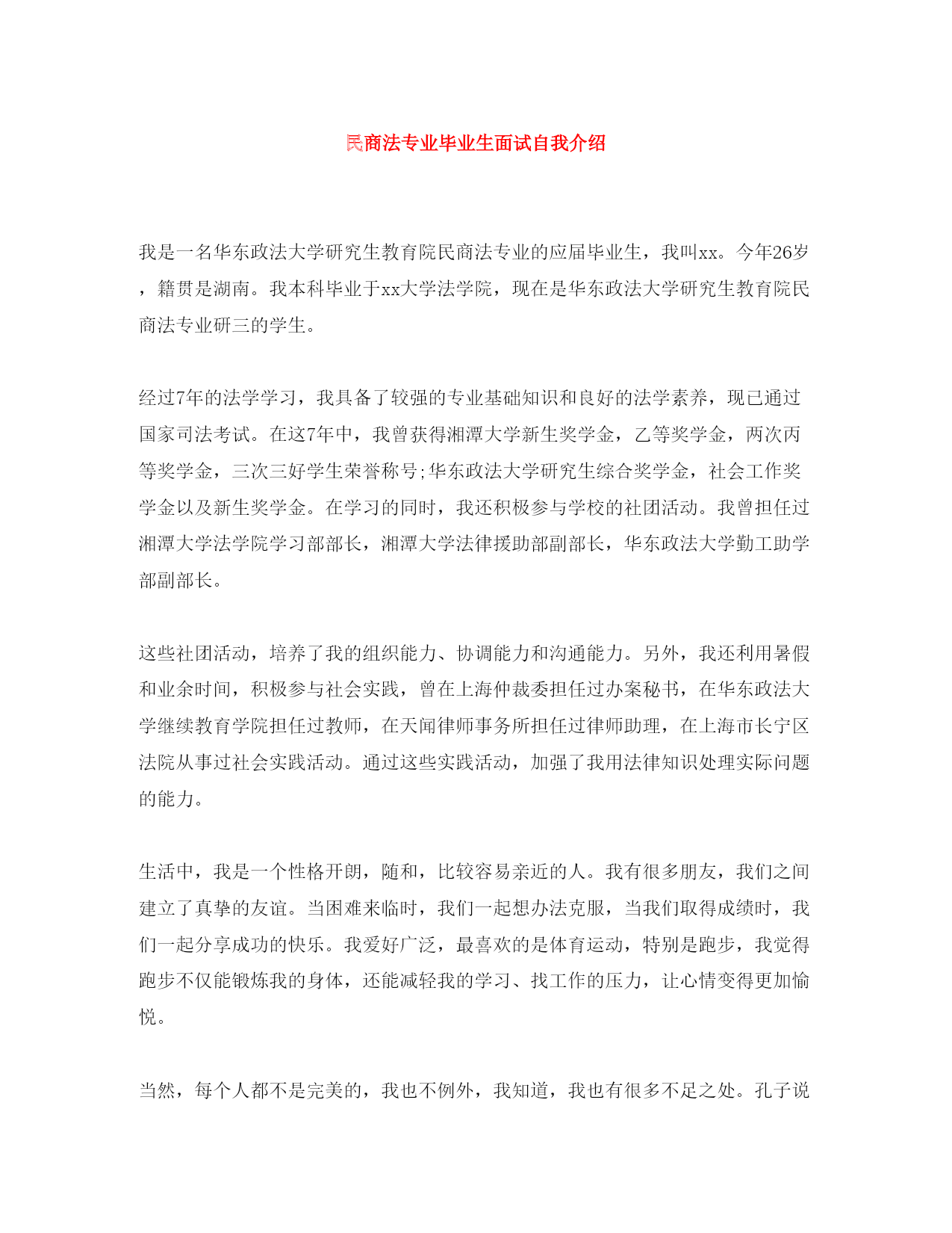 此资料由网络收集而来,如有侵权请告知上传者立即删除。资料共分享,我们负责传递知识。民商法专业毕业生面试自我介绍我是一名华东政法大学研究生教育院民商法专业的应届毕业生,我叫xx。今年26岁,籍贯是湖南。我本科毕业于xx大学法学院,现在是华东政法大学研究生教育院民商法专业研三的学生。经过7年的法学学习,我具备了较强的专业基础知识和良好的法学素养,现已通过国家司法考试。在这7年中,我曾获得湘潭大学新生奖学金,乙等奖学金,两次丙等奖学金,三次三好学生荣誉称号;华东政法大学研究生综合奖学金,社会工作奖学金以及新生奖学金。在学习的同时,我还积极参与学校的社团活动。我曾担任过湘潭大学法学院学习部部长,湘潭大学法律援助部副部长,华东政法大学勤工助学部副部长。这些社团活动,培养了我的组织能力、协调能力和沟通能力。另外,我还利用暑假和业余时间,积极参与社会实践,曾在上海仲裁委担任过办案秘书,在华东政法大学继续教育学院担任过教师,在天闻律师事务所担任过律师助理,在上海市长宁区法院从事过社会实践活动。通过这些实践活动,加强了我用法律知识处理实际问题的能力。生活中,我是一个性格开朗,随和,比较容易亲近的人。我有很多朋友,我们之间建立了真挚的友谊。当困难来临时,我们一起想办法克服,当我们取得成绩时,我们一起分享成功的快乐。我爱好广泛,最喜欢的是体育运动,特别是跑步,我觉得跑步不仅能锻炼我的身体,还能减轻我的学习、找工作的压力,让心情变得更加愉悦。当然,每个人都不是完美的,我也不例外,我知道,我也有很多不足之处。孔子说:知错能改,善莫大焉。”;我相信,在今后的工作中,通过我自身的努力,通过领导、同事对我的帮助,我一定不断改正我的缺点,成为一名合格的工作人员的。
