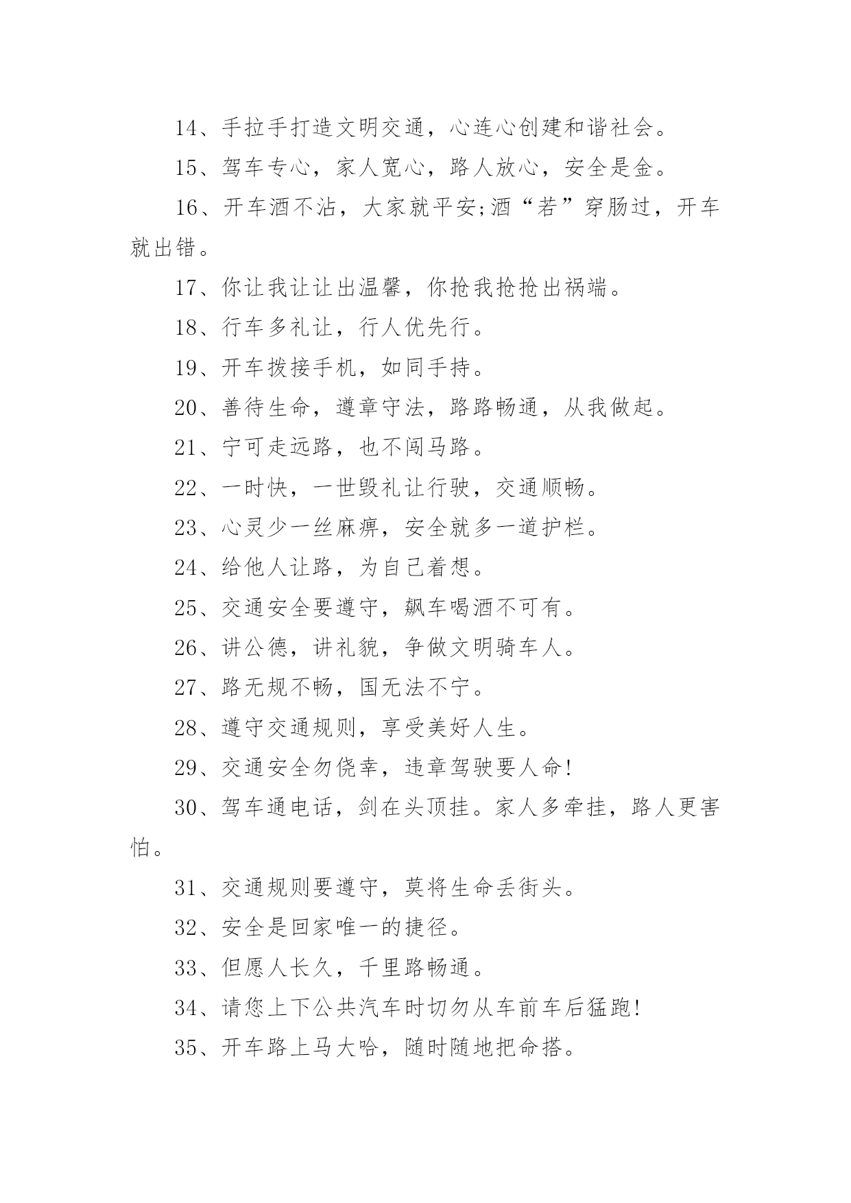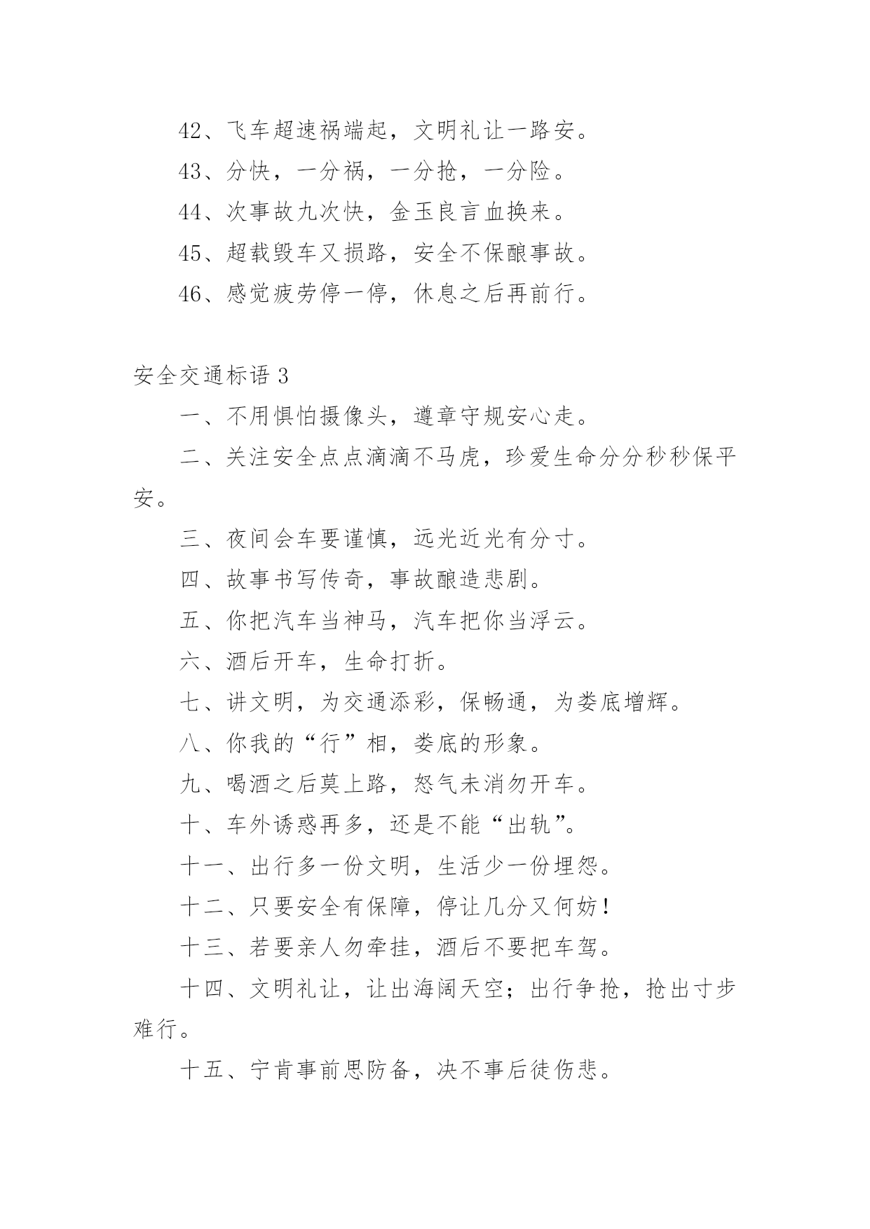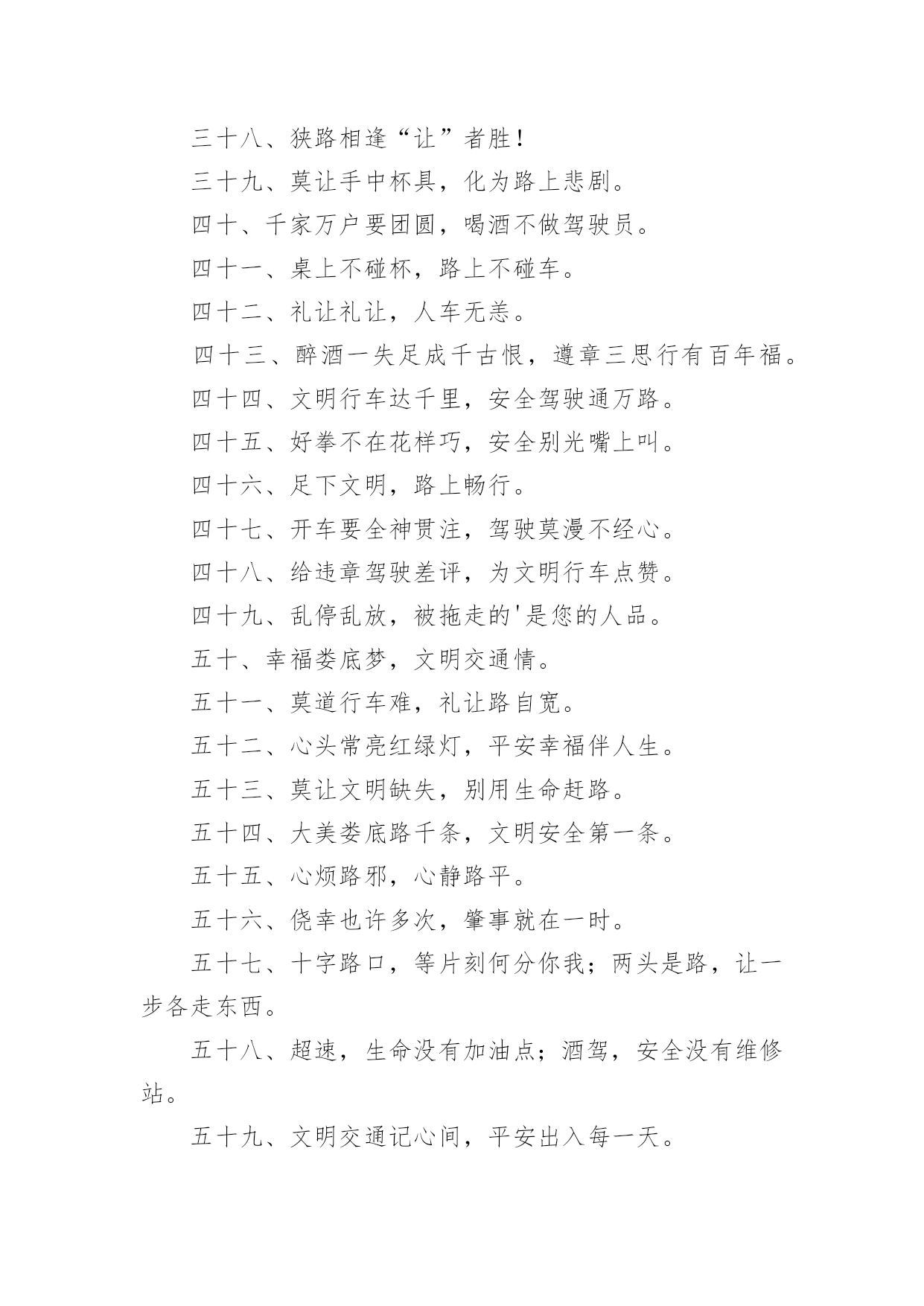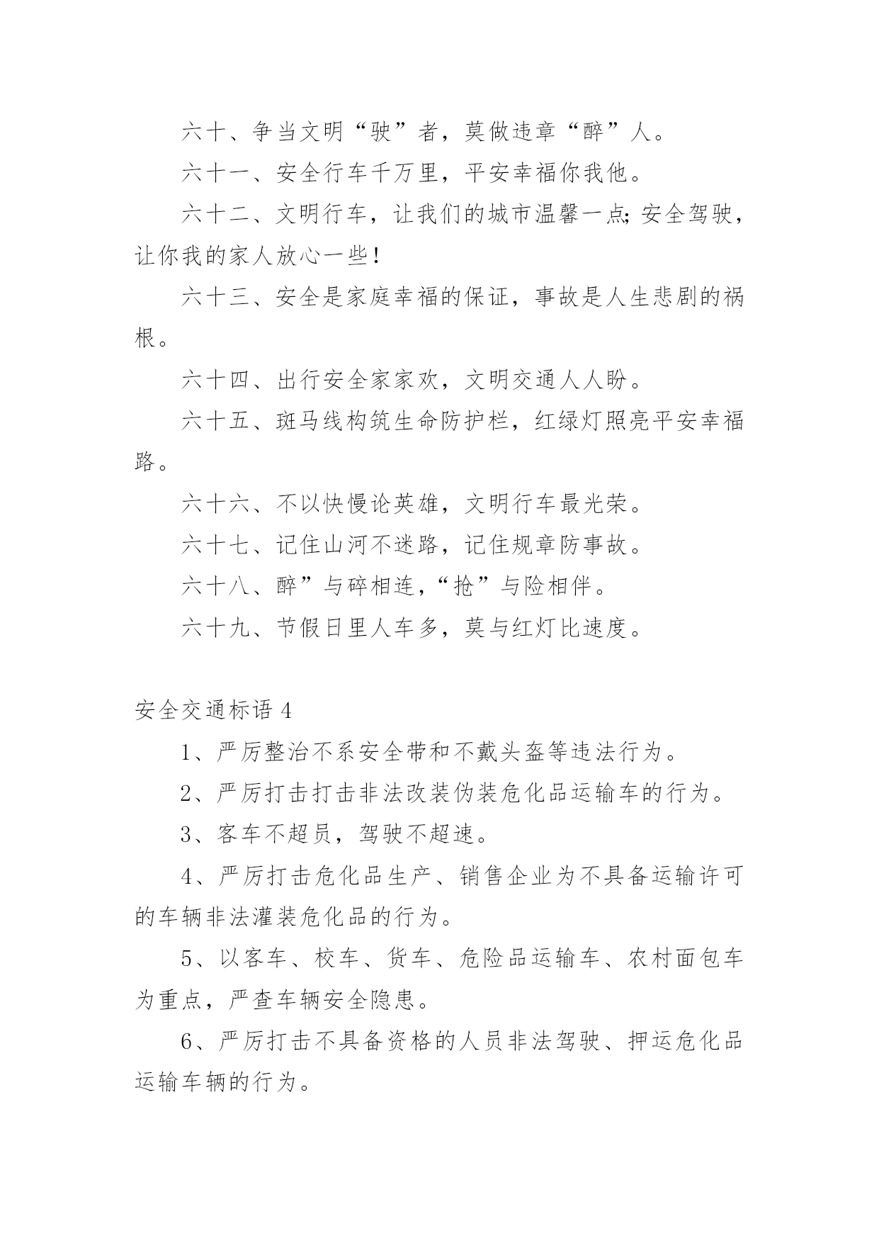 安全交通标语在平时的学习、工作或生活中,许多人都接触过一些比较经典的标语吧,标语具有在理智上启发人们,在情感上打动人们的作用。那什么样的标语才具有启发意义呢?下面是小编精心整理的安全交通标语,仅供参考,欢迎大家阅读。安全交通标语11、不追不跑不打闹,平平安安到学校。2、我要快乐,不要悲伤,爸爸开车不要喝酒。3、快快乐乐出门去,平平安安回家来。4、人人关心交通安全,路路小心伴您平安。5、红灯亮时,管好你的脚步;绿灯亮时,管好你的.速度!6、靠边接手机,疲劳请休息,安全带要系,请别拼运气。7、交通规则看清楚,开车上路不辛苦。8、谨慎驾驶千趟少大意行车一回多。9、拐弯路面尚危险,降速行驶好相闪,虽然车辆有投险,安全意识不得减。10、红灯停,绿灯行,不越线,不抢行。11、开车拨接电话,行人危险大。12、迟到总比永远不到好。13、贪一时之快,危险跟着来。14、手拉手打造文明交通,心连心创建和谐社会。15、驾车专心,家人宽心,路人放心,安全是金。16、开车酒不沾,大家就平安;酒“若”穿肠过,开车就出错。17、你让我让让出温馨,你抢我抢抢出祸端。18、行车多礼让,行人优先行。19、开车拨接手机,如同手持。20、善待生命,遵章守法,路路畅通,从我做起。21、宁可走远路,也不闯马路。22、一时快,一世毁礼让行驶,交通顺畅。23、心灵少一丝麻痹,安全就多一道护栏。24、给他人让路,为自己着想。25、交通安全要遵守,飙车喝酒不可有。26、讲公德,讲礼貌,争做文明骑车人。27、路无规不畅,国无法不宁。28、遵守交通规则,享受美好人生。29、交通安全勿侥幸,违章驾驶要人命!30、驾车通电话,剑在头顶挂。家人多牵挂,路人更害怕。31、交通规则要遵守,莫将生命丢街头。32、安全是回家唯一的捷径。33、但愿人长久,千里路畅通。34、请您上下公共汽车时切勿从车前车后猛跑!35、开车路上马大哈,随时随地把命搭。36、礼让礼让,人车无恙。37、交通规则若遵守,全国各地安心走。38、文明行车千里共婵娟,遵纪守法万家得团圆。39、只要你我多用心,交通恶运不降临。40、酒后驾车,拿命。安全交通标语21、开车超速一瞬间,祸福却是两重天。2、交通安全管理标语.警示语.提示语:3、控制生命时速,把握命运方向。4、酒若穿肠过,开车易成祸。5、客车乘员“超”一个,生命安全降一“格”。6、多拉快跑,隐患不小;一路疲乏,欲速不达。7、速度不是第一,平安才是终点。8、“十次车祸九次快”,杜绝“超速”免祸灾。9、超载装满危险,超速辗碎平安。10、无视交规,步步惊心;文明礼让,路路平安。11、减轻卡车的'重量,增加安全的保障。12、身体疲劳别开车,能免事故好处多。13、车有承受之重,人命重于泰山。14、行车图快必受其害,稳中求快安全永在。15、酒后驾驶不可取,出事后悔来不及。16、手握方向盘,时刻想安全。17、风度不凭速度,文明来自大度。18、多载一个人,危险一车人。19、疲劳千万别开车,迷迷糊糊事故多。20、生命无彩排,车酒不同台。21、疲劳驾驶不可取,生命安全非儿戏。22、酒桌上的杯具,马路上的悲剧。23、生命一生一次,危险一次一生。24、嘴巴酒精别结缘,结缘远离方向盘。25、减速慢行勿争先,关爱生命到永远。26、路在前,家在后,平安才是福。27、出行劝君酒莫沾,家兴人和万事安。28、慢一慢路上风景更好看,停一停换来一路好心情。29、生命只有一次,平安才能长久。30、醉驾入刑是高压,千万不要去碰它。31、双筷子三只碗,爱妻娇儿盼团圆。32、司机酒意绵绵,路上危险连连。33、威风不在车速高,安全才是第一招。34、超速超载多事故,疲劳驾驶患无穷。35、车要hold住,不能玩超速。36、劝君一言别酒驾,利人利己利大家。37、磨刀不误砍柴工,休息好了安全行。38、酒后莫掌方向盘,为人为己保安全。39、饮酒一分醉,驾车十分险。40、心急不吃热豆腐,开车切莫比速度。41、稳住油门“知足”常乐,文明礼让“吃亏”是福。42、飞车超速祸端起,文明礼让一路安。43、分快,一分祸,一分抢,一分险。44、次事故九次快,金玉良言血换来。45、超载毁车又损路,安全不保酿事故。46、感觉疲劳停一停,休息之后再前行。安全交通标语3一、不用惧怕摄像头,遵章守规安心走。二、关注安全点点滴滴不马虎,珍爱生命分分秒秒保平安。三、夜间会车要谨慎,远光近光有分寸。四、故事书写传奇,事故酿造悲剧。五、你把汽车当神马,汽车把你当浮云。六、酒后开车,生命打折。七、讲文明,为交通添彩,保畅通,为娄底增辉。八、你我的“行”相,娄底的形象。九、喝酒之后莫上路,怒气未消勿开车。十、车外诱惑再多,还是不能“出轨”。十一、出行多一份文明,生活少一份埋怨。十二、只要安全有保障,停让几分又何妨!十三、若要亲人勿牵挂,酒后不要把车驾。十