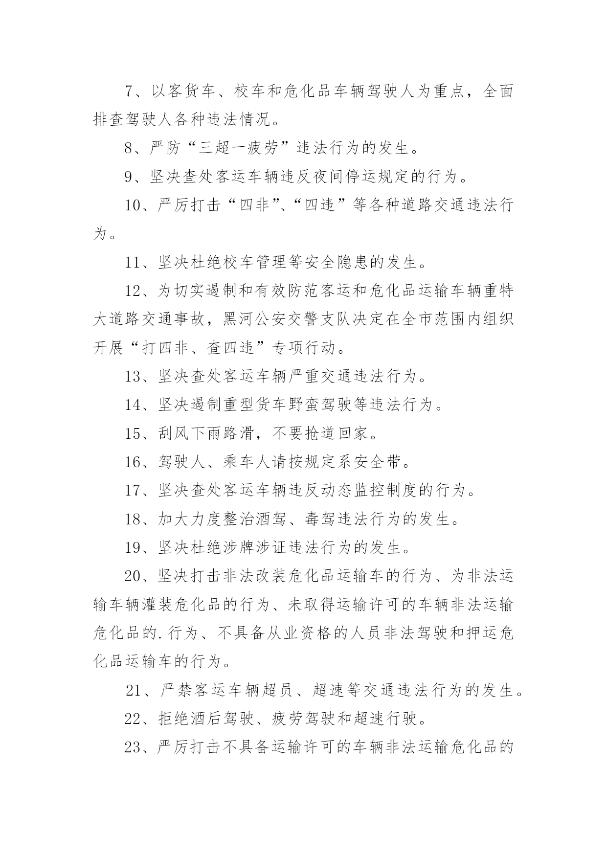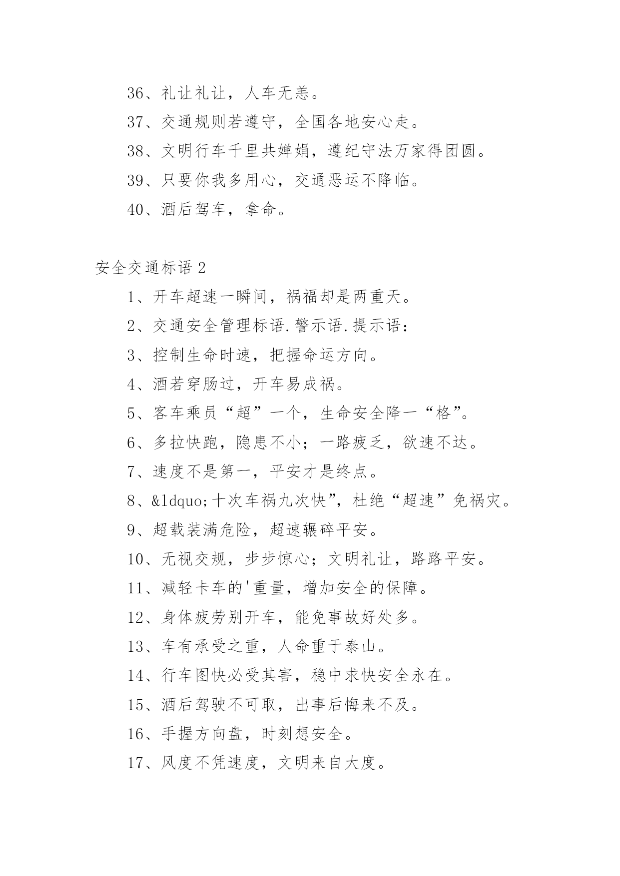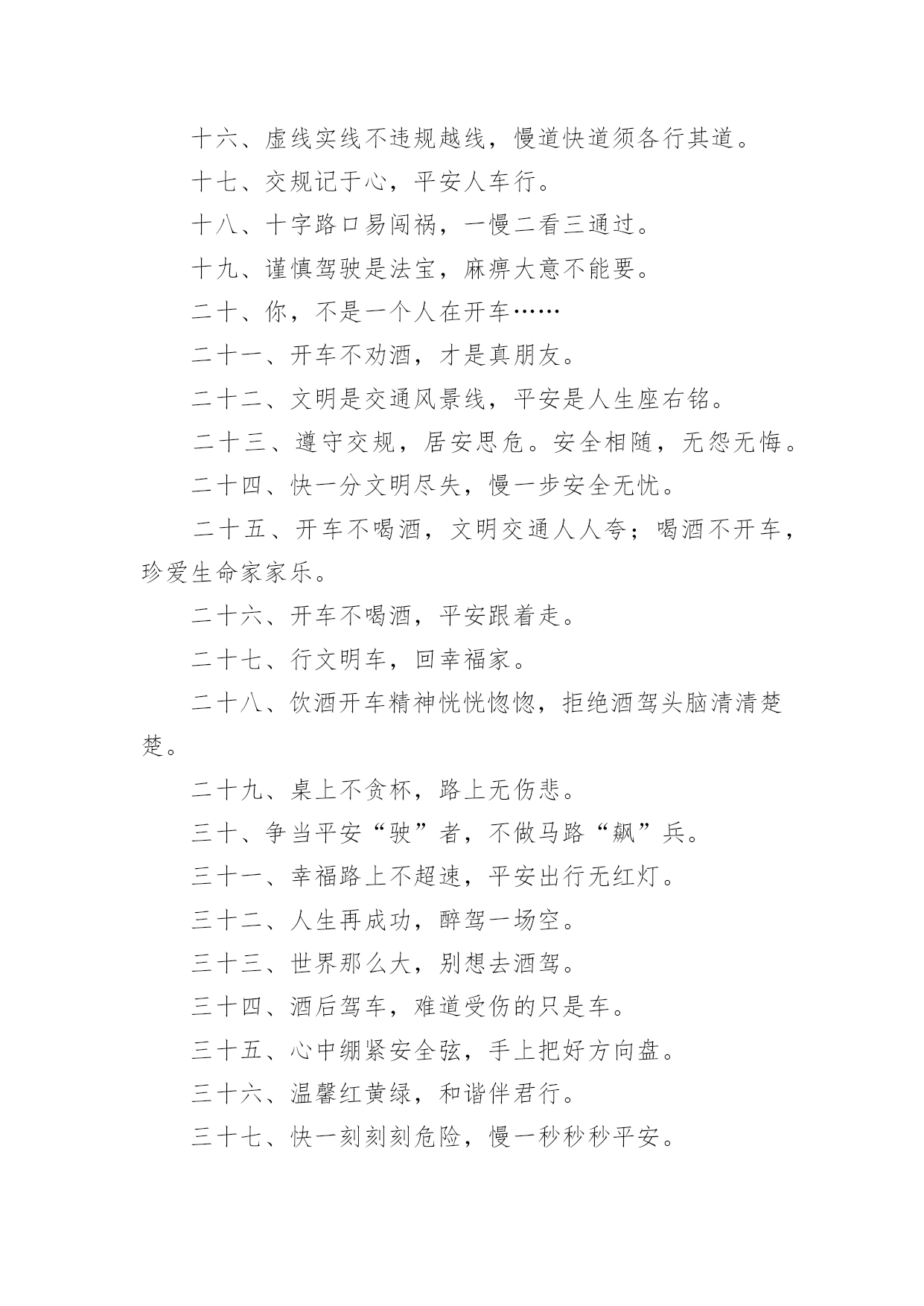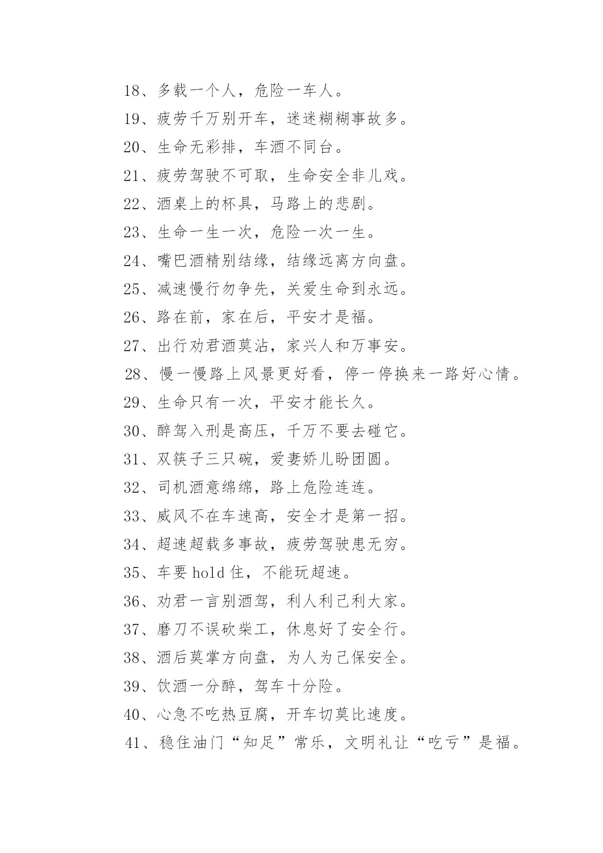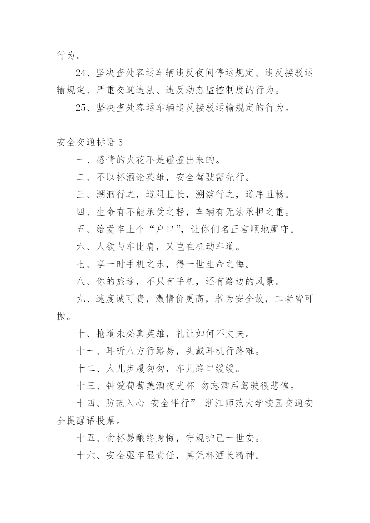 安全交通标语在平时的学习、工作或生活中,许多人都接触过一些比较经典的标语吧,标语具有在理智上启发人们,在情感上打动人们的作用。那什么样的标语才具有启发意义呢?下面是小编精心整理的安全交通标语,仅供参考,欢迎大家阅读。安全交通标语11、不追不跑不打闹,平平安安到学校。2、我要快乐,不要悲伤,爸爸开车不要喝酒。3、快快乐乐出门去,平平安安回家来。4、人人关心交通安全,路路小心伴您平安。5、红灯亮时,管好你的脚步;绿灯亮时,管好你的.速度!6、靠边接手机,疲劳请休息,安全带要系,请别拼运气。7、交通规则看清楚,开车上路不辛苦。8、谨慎驾驶千趟少大意行车一回多。9、拐弯路面尚危险,降速行驶好相闪,虽然车辆有投险,安全意识不得减。10、红灯停,绿灯行,不越线,不抢行。11、开车拨接电话,行人危险大。12、迟到总比永远不到好。13、贪一时之快,危险跟着来。14、手拉手打造文明交通,心连心创建和谐社会。15、驾车专心,家人宽心,路人放心,安全是金。16、开车酒不沾,大家就平安;酒“若”穿肠过,开车就出错。17、你让我让让出温馨,你抢我抢抢出祸端。18、行车多礼让,行人优先行。19、开车拨接手机,如同手持。20、善待生命,遵章守法,路路畅通,从我做起。21、宁可走远路,也不闯马路。22、一时快,一世毁礼让行驶,交通顺畅。23、心灵少一丝麻痹,安全就多一道护栏。24、给他人让路,为自己着想。25、交通安全要遵守,飙车喝酒不可有。26、讲公德,讲礼貌,争做文明骑车人。27、路无规不畅,国无法不宁。28、遵守交通规则,享受美好人生。29、交通安全勿侥幸,违章驾驶要人命!30、驾车通电话,剑在头顶挂。家人多牵挂,路人更害怕。31、交通规则要遵守,莫将生命丢街头。32、安全是回家唯一的捷径。33、但愿人长久,千里路畅通。34、请您上下公共汽车时切勿从车前车后猛跑!35、开车路上马大哈,随时随地把命搭。36、礼让礼让,人车无恙。37、交通规则若遵守,全国各地安心走。38、文明行车千里共婵娟,遵纪守法万家得团圆。39、只要你我多用心,交通恶运不降临。40、酒后驾车,拿命。安全交通标语21、开车超速一瞬间,祸福却是两重天。2、交通安全管理标语.警示语.提示语:3、控制生命时速,把握命运方向。4、酒若穿肠过,开车易成祸。5、客车乘员“超”一个,生命安全降一“格”。6、多拉快跑,隐患不小;一路疲乏,欲速不达。7、速度不是第一,平安才是终点。8、“十次车祸九次快”,杜绝“超速”免祸灾。9、超载装满危险,超速辗碎平安。10、无视交规,步步惊心;文明礼让,路路平安。11、减轻卡车的'重量,增加安全的保障。12、身体疲劳别开车,能免事故好处多。13、车有承受之重,人命重于泰山。14、行车图快必受其害,稳中求快安全永在。15、酒后驾驶不可取,出事后悔来不及。16、手握方向盘,时刻想安全。17、风度不凭速度,文明来自大度。18、多载一个人,危险一车人。19、疲劳千万别开车,迷迷糊糊事故多。20、生命无彩排,车酒不同台。21、疲劳驾驶不可取,生命安全非儿戏。22、酒桌上的杯具,马路上的悲剧。23、生命一生一次,危险一次一生。24、嘴巴酒精别结缘,结缘远离方向盘。25、减速慢行勿争先,关爱生命到永远。26、路在前,家在后,平安才是福。27、出行劝君酒莫沾,家兴人和万事安。28、慢一慢路上风景更好看,停一停换来一路好心情。29、生命只有一次,平安才能长久。30、醉驾入刑是高压,千万不要去碰它。31、双筷子三只碗,爱妻娇儿盼团圆。32、司机酒意绵绵,路上危险连连。33、威风不在车速高,安全才是第一招。34、超速超载多事故,疲劳驾驶患无穷。35、车要hold住,不能玩超速。36、劝君一言别酒驾,利人利己利大家。37、磨刀不误砍柴工,休息好了安全行。38、酒后莫掌方向盘,为人为己保安全。39、饮酒一分醉,驾车十分险。40、心急不吃热豆腐,开车切莫比速度。41、稳住油门“知足”常乐,文明礼让“吃亏”是福。42、飞车超速祸端起,文明礼让一路安。43、分快,一分祸,一分抢,一分险。44、次事故九次快,金玉良言血换来。45、超载毁车又损路,安全不保酿事故。46、感觉疲劳停一停,休息之后再前行。安全交通标语3一、不用惧怕摄像头,遵章守规安心走。二、关注安全点点滴滴不马虎,珍爱生命分分秒秒保平安。三、夜间会车要谨慎,远光近光有分寸。四、故事书写传奇,事故酿造悲剧。五、你把汽车当神马,汽车把你当浮云。六、酒后开车,生命打折。七、讲文明,为交通添彩,保畅通,为娄底增辉。八、你我的“行”相,娄底的形象。九、喝酒之后莫上路,怒气未消勿开车。十、车外诱惑再多,还是不能“出轨”。十一、出行多一份文明,生活少一份埋怨。十二、只要安全有保障,停让几分又何妨!十三、若要亲人勿牵挂,酒后不要把车驾。十