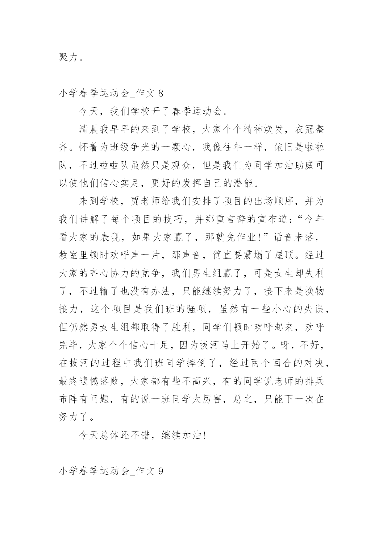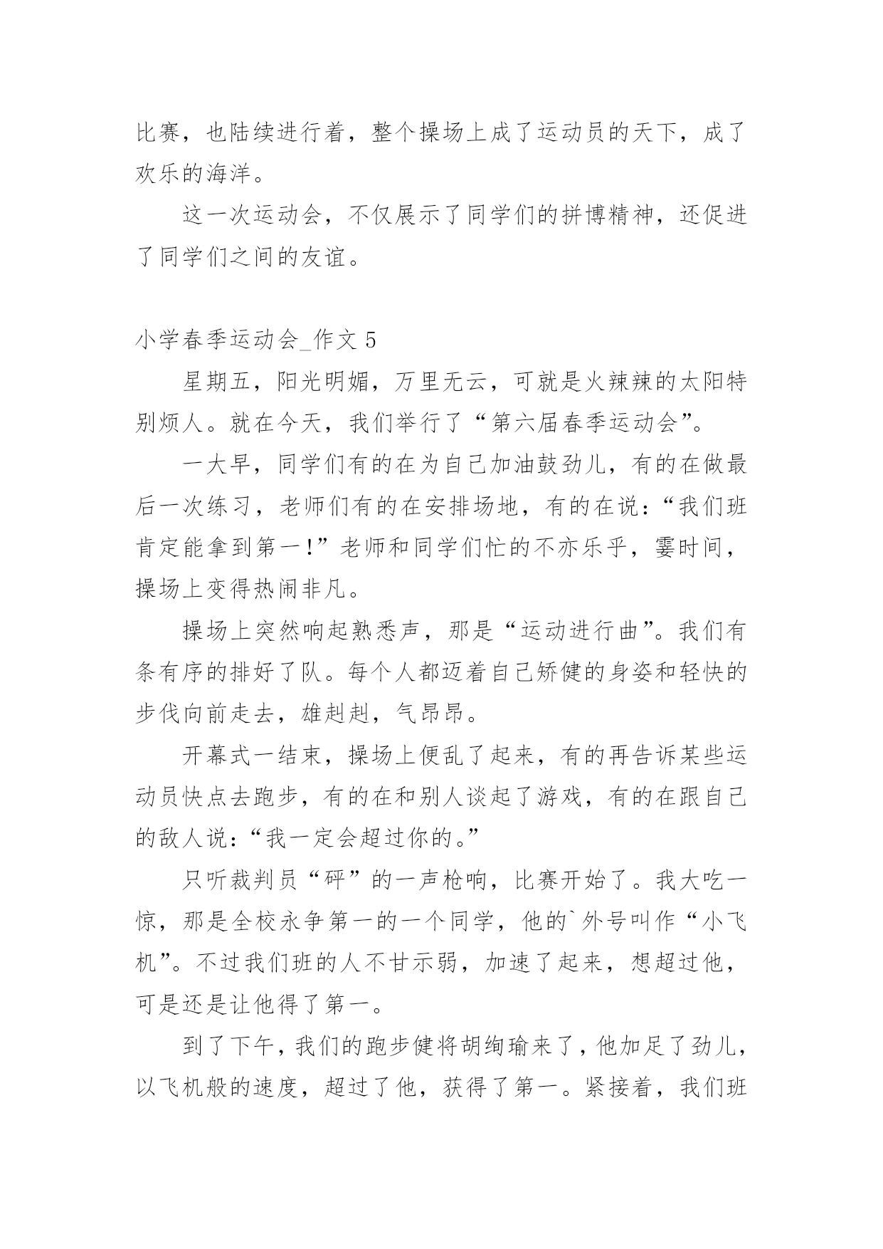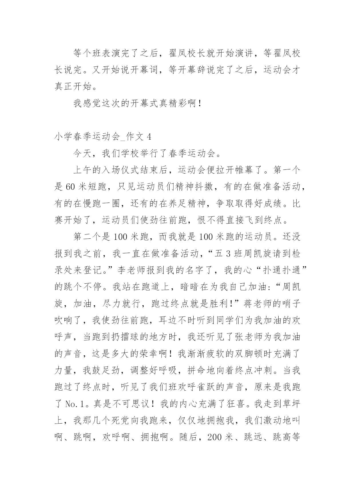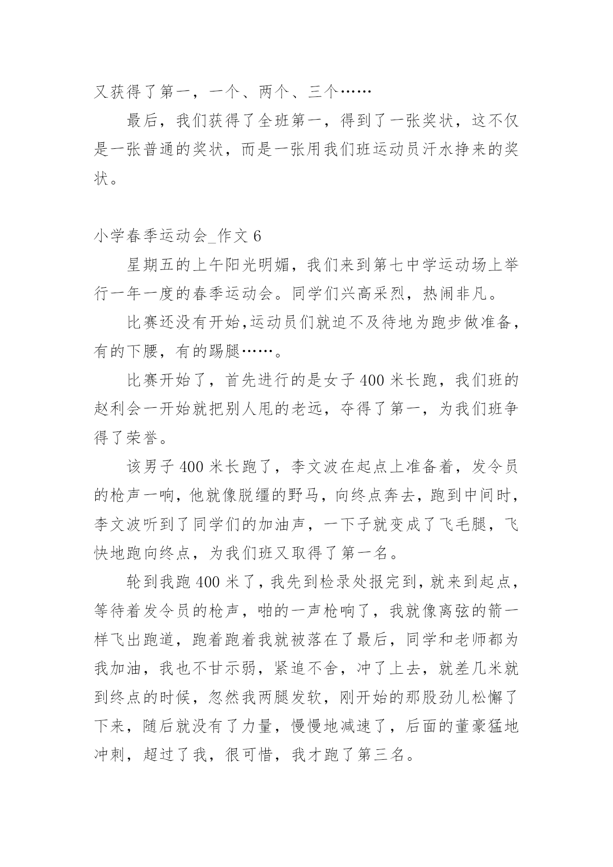 小学春季运动会_作文在平平淡淡的学习、工作、生活中,大家都不可避免地会接触到作文吧,作文根据写作时限的不同可以分为限时作文和非限时作文。那么你有了解过作文吗?下面是小编收集整理的小学春季运动会_作文,仅供参考,希望能够帮助到大家。小学春季运动会_作文1在一个晴空万里的日子里,我们的学校在六中举行了春季运动会,这天格外的蓝,朵朵白云在天空悠闲的散着步,同学们个个都精神抖擞,斗志昂扬。比赛还没开始前,操场上热闹非凡,有的吹起玩具小喇叭,有的举起牌子,上面写着“八班必胜”,还有的排着整齐的队伍入场。比赛开始了,其中最吸引我的就是跑步,只见运动员右脚紧挨着起跑线,右腿成了一张弓,身体倾斜,好像即将出枪的子弹。“啪――”的一声,只见运动员个个像捕捉猎物的狼,像似离线的弓箭,飞快地向前跑去,眼睛死死地盯着终点线。此时此刻,看台上的同学们再也忍不住了,高声呐喊:“坚持就是胜利!”“加油,他快赶上你了!”“为了班级的荣耀,加油!”运动员们听到加油声,好像汽车突然加满了油,飞速地跑了过去,只见他咬牙切齿,脸涨得通红,豆大的汗滴从脸颊上流了下来,双臂用力往前冲。终于得了第一名的好成绩,他欢呼雀跃起来。这次运动会真激烈呀!小学春季运动会_作文2运动会开幕式今天,我一来到班级里,就看到了他们穿着五颜六色的文化衫,有画阿狸的,有画枪的,有画果园的,有画龙的,有花复仇者的……。戴上了各种各样的帽子。有插风车的,有做礼帽的,有做斗笠的,有做女巫帽的真是各种帽子齐聚一堂啊!过了一会儿,邢老师说我们要下去参加开幕式了。我们下去后,看见了低年级的人和高年级的人穿的文化衫也很有趣!有的高年级的人画了我的世界,有人画了美国队长的盾牌,有人花了火影忍者,还有的人画了打篮球。后来,到表演的时候,我看到了很多班都好像模仿我们班去年似的。我们班去年有打篮球的、滑滑板的、骑自行车的、跳跳绳的、拿气球的。今年,很多班都模仿我们打篮球、滑滑板、骑自行车、放气球。我们表演之前,有一个人在宣读稿子,具体内容是“四十六个天使,四十六朵花,四十六个天使组成一个家。”到我们班表演的时候,我们就迅速变换了场地,开始了表演。张芮宁她们跳起了小苹果,我们班的小苹果有三个版本,于是,就有三组人再跳。结果,全校同学都唱了起来。表演完毕,我们班就开始看其他班的表演了。表玩完毕后,校长就开始宣读开幕式词了。然后,就开始升国旗、生校旗。这些环节结束后,开幕式就结束了,我们的比赛也开始了。小学春季运动会_作文3今天早上,我早早的起了床,你知道为什么吗?我来告诉你吧,其实,我们今天有春季达标运动会。所以,我才会很在的起了床。而且,这次运动会是要穿我们自己画的文化衫,和自己设计的帽子呢!我刚跨进教室的门,就看见同学们都穿上了各自的文化衫,和他们自己做的帽子,一点都不一样,还非常漂亮。看完这些,我也要穿上自己的文化衫,带上自己的帽子,准备到操场上,去参加春季达标运动会。我们来到我们班的指定位置的时候,接着鼓号队、彩旗队来了,鼓号队响起了乐器的声音,彩旗队的彩旗就像彩虹一样美丽。开幕式开始了,其他班的精彩表演都很好,我很期待我们班的精彩表演。又过了好一会,才轮到我们班。到了我们的时候,先是响起了《小苹果》,接着我们前面的人就开始跳起来《小苹果》。过了一会,不知道是哪个班的人,都开始唱起来了。等个班表演完了之后,翟凤校长就开始演讲,等翟凤校长说完。又开始说开幕词,等开幕辞说完了之后,运动会才真正开始。我感觉这次的开幕式真精彩啊!小学春季运动会_作文4今天,我们学校举行了春季运动会。上午的入场仪式结束后,运动会便拉开帷幕了。第一个是60米短跑,只见运动员们精神抖擞,有的在做准备活动,有的在慢跑一圈,还有的在养足精神,争取取得好成绩。比赛开始了,运动员们使劲往前跑,恨不得直接飞到终点。第二个是100米跑,而我就是100米跑的运动员。还没报到我之前,我一直在做准备活动,“五3班周凯旋请到检录处来登记。”李老师报到我的名字了,我的心“扑通扑通”的跳个不停。我站在跑道上,暗暗在为我自己加油:“周凯旋,加油,尽力就行,跑过终点就是胜利!”蒋老师的哨子吹响了,我使劲往前跑,耳边不时听到同学们为我加油的欢呼声,当跑到扔擂球的地方时,我还听见了张老师为我加油的声音,这是多大的荣幸啊!我渐渐疲软的双脚顿时充满了力量,我鼓足劲,调整好呼吸,拼命地向着终点冲刺。当我跑过了终点时,听见了我们班欢呼雀跃的声音,原来是我跑了No.1。真是不可思议!我的内心充满了狂喜。我走到草坪上,我那几个死党向我跑来,仅仅地拥抱我,我们激动地叫啊、跳啊,欢呼啊、拥抱啊。随后,200米、跳远、跳高等比赛,也陆续进行着,整个操场上成了运动员的天下,成了欢乐的海洋。这一次运动会,不仅展示了同学们的拼博精神,还促进了同学们之间的友谊。小学春季运动会_作文5星期五,阳