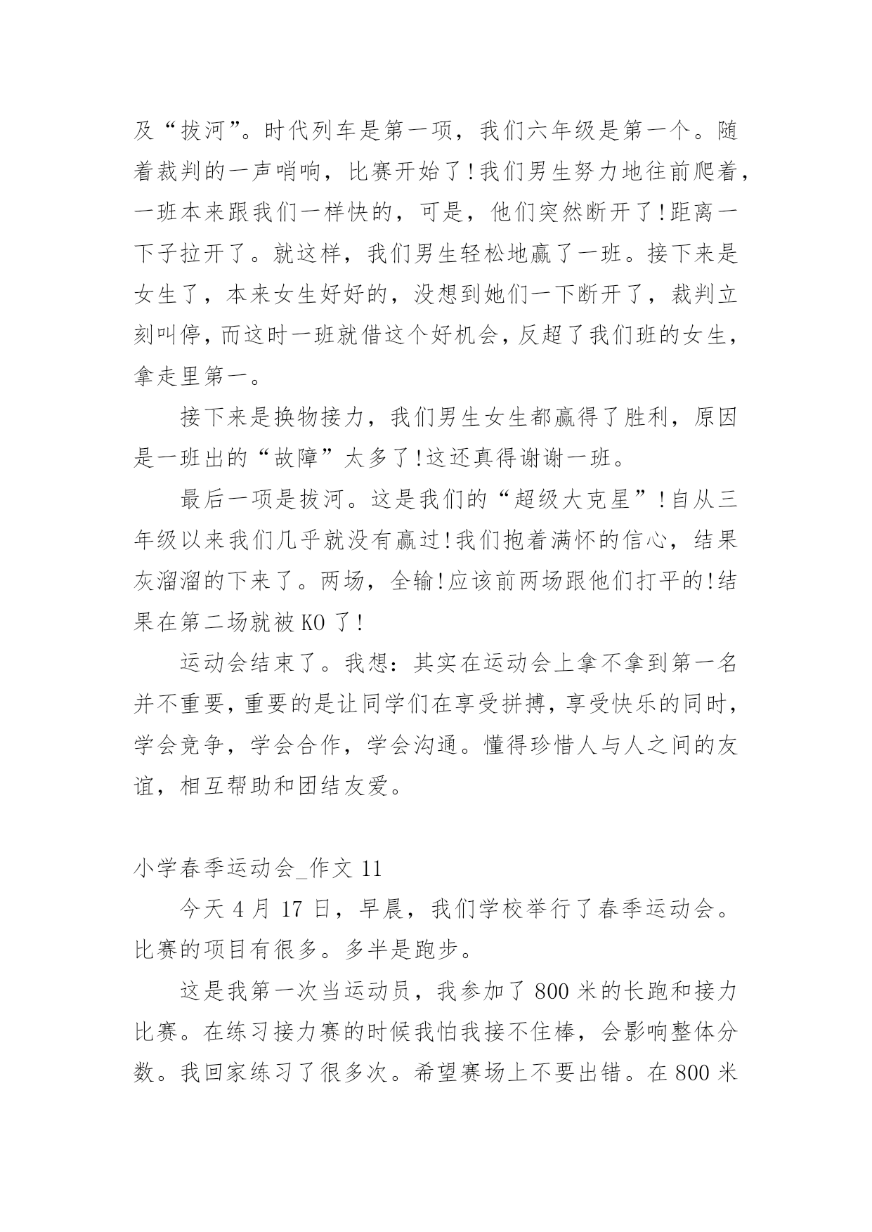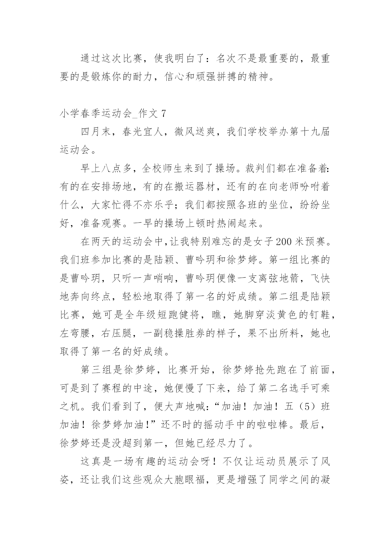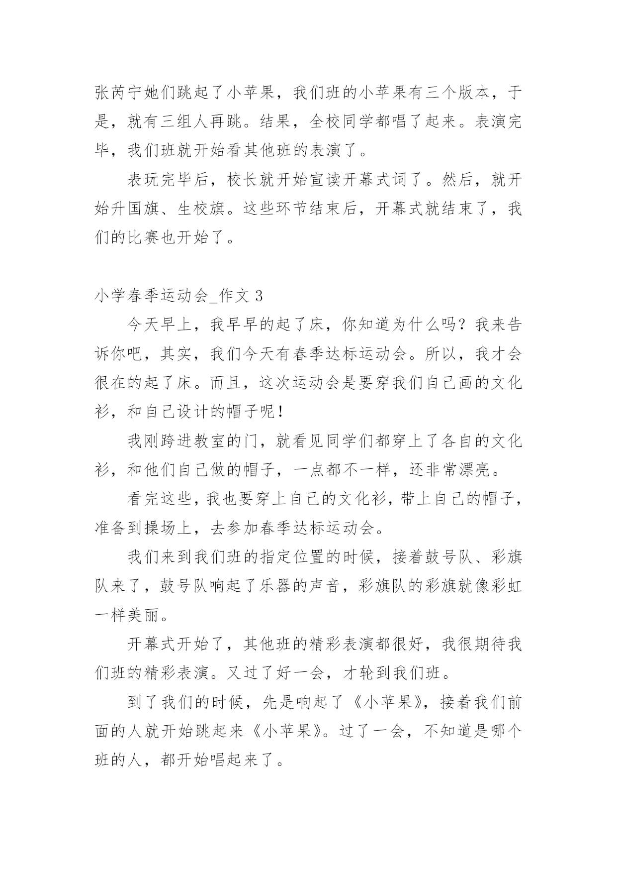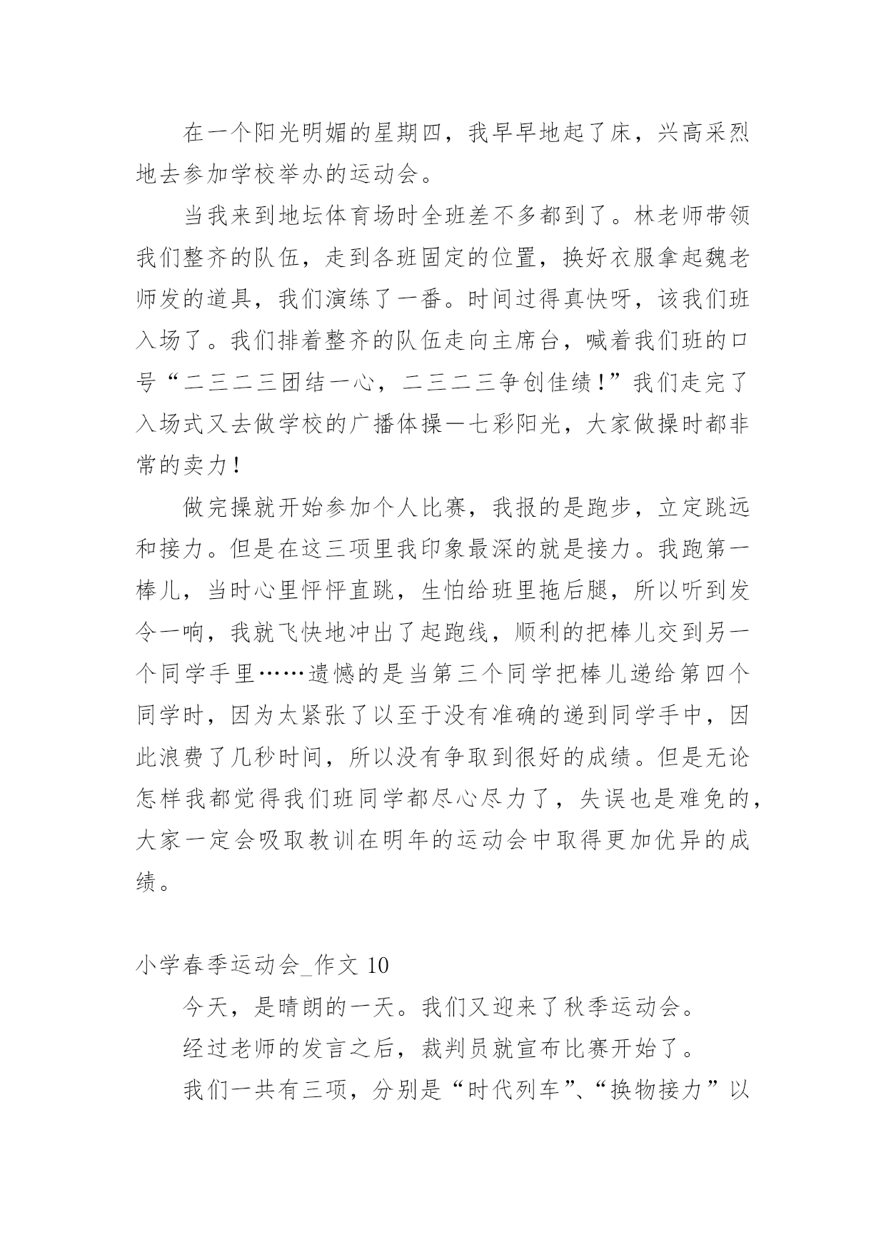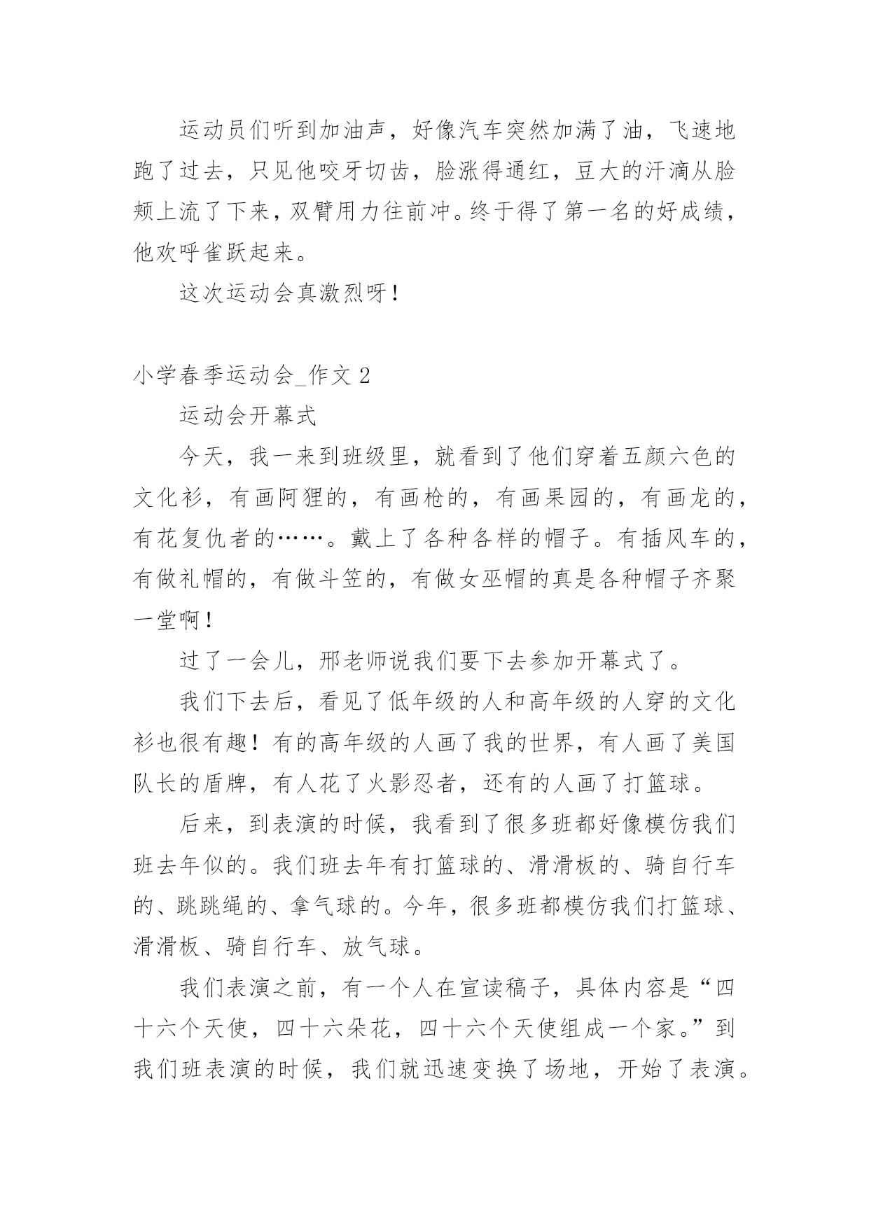 小学春季运动会_作文在平平淡淡的学习、工作、生活中,大家都不可避免地会接触到作文吧,作文根据写作时限的不同可以分为限时作文和非限时作文。那么你有了解过作文吗?下面是小编收集整理的小学春季运动会_作文,仅供参考,希望能够帮助到大家。小学春季运动会_作文1在一个晴空万里的日子里,我们的学校在六中举行了春季运动会,这天格外的蓝,朵朵白云在天空悠闲的散着步,同学们个个都精神抖擞,斗志昂扬。比赛还没开始前,操场上热闹非凡,有的吹起玩具小喇叭,有的举起牌子,上面写着“八班必胜”,还有的排着整齐的队伍入场。比赛开始了,其中最吸引我的就是跑步,只见运动员右脚紧挨着起跑线,右腿成了一张弓,身体倾斜,好像即将出枪的子弹。“啪――”的一声,只见运动员个个像捕捉猎物的狼,像似离线的弓箭,飞快地向前跑去,眼睛死死地盯着终点线。此时此刻,看台上的同学们再也忍不住了,高声呐喊:“坚持就是胜利!”“加油,他快赶上你了!”“为了班级的荣耀,加油!”运动员们听到加油声,好像汽车突然加满了油,飞速地跑了过去,只见他咬牙切齿,脸涨得通红,豆大的汗滴从脸颊上流了下来,双臂用力往前冲。终于得了第一名的好成绩,他欢呼雀跃起来。这次运动会真激烈呀!小学春季运动会_作文2运动会开幕式今天,我一来到班级里,就看到了他们穿着五颜六色的文化衫,有画阿狸的,有画枪的,有画果园的,有画龙的,有花复仇者的……。戴上了各种各样的帽子。有插风车的,有做礼帽的,有做斗笠的,有做女巫帽的真是各种帽子齐聚一堂啊!过了一会儿,邢老师说我们要下去参加开幕式了。我们下去后,看见了低年级的人和高年级的人穿的文化衫也很有趣!有的高年级的人画了我的世界,有人画了美国队长的盾牌,有人花了火影忍者,还有的人画了打篮球。后来,到表演的时候,我看到了很多班都好像模仿我们班去年似的。我们班去年有打篮球的、滑滑板的、骑自行车的、跳跳绳的、拿气球的。今年,很多班都模仿我们打篮球、滑滑板、骑自行车、放气球。我们表演之前,有一个人在宣读稿子,具体内容是“四十六个天使,四十六朵花,四十六个天使组成一个家。”到我们班表演的时候,我们就迅速变换了场地,开始了表演。张芮宁她们跳起了小苹果,我们班的小苹果有三个版本,于是,就有三组人再跳。结果,全校同学都唱了起来。表演完毕,我们班就开始看其他班的表演了。表玩完毕后,校长就开始宣读开幕式词了。然后,就开始升国旗、生校旗。这些环节结束后,开幕式就结束了,我们的比赛也开始了。小学春季运动会_作文3今天早上,我早早的起了床,你知道为什么吗?我来告诉你吧,其实,我们今天有春季达标运动会。所以,我才会很在的起了床。而且,这次运动会是要穿我们自己画的文化衫,和自己设计的帽子呢!我刚跨进教室的门,就看见同学们都穿上了各自的文化衫,和他们自己做的帽子,一点都不一样,还非常漂亮。看完这些,我也要穿上自己的文化衫,带上自己的帽子,准备到操场上,去参加春季达标运动会。我们来到我们班的指定位置的时候,接着鼓号队、彩旗队来了,鼓号队响起了乐器的声音,彩旗队的彩旗就像彩虹一样美丽。开幕式开始了,其他班的精彩表演都很好,我很期待我们班的精彩表演。又过了好一会,才轮到我们班。到了我们的时候,先是响起了《小苹果》,接着我们前面的人就开始跳起来《小苹果》。过了一会,不知道是哪个班的人,都开始唱起来了。等个班表演完了之后,翟凤校长就开始演讲,等翟凤校长说完。又开始说开幕词,等开幕辞说完了之后,运动会才真正开始。我感觉这次的开幕式真精彩啊!小学春季运动会_作文4今天,我们学校举行了春季运动会。上午的入场仪式结束后,运动会便拉开帷幕了。第一个是60米短跑,只见运动员们精神抖擞,有的在做准备活动,有的在慢跑一圈,还有的在养足精神,争取取得好成绩。比赛开始了,运动员们使劲往前跑,恨不得直接飞到终点。第二个是100米跑,而我就是100米跑的运动员。还没报到我之前,我一直在做准备活动,“五3班周凯旋请到检录处来登记。”李老师报到我的名字了,我的心“扑通扑通”的跳个不停。我站在跑道上,暗暗在为我自己加油:“周凯旋,加油,尽力就行,跑过终点就是胜利!”蒋老师的哨子吹响了,我使劲往前跑,耳边不时听到同学们为我加油的欢呼声,当跑到扔擂球的地方时,我还听见了张老师为我加油的声音,这是多大的荣幸啊!我渐渐疲软的双脚顿时充满了力量,我鼓足劲,调整好呼吸,拼命地向着终点冲刺。当我跑过了终点时,听见了我们班欢呼雀跃的声音,原来是我跑了No.1。真是不可思议!我的内心充满了狂喜。我走到草坪上,我那几个死党向我跑来,仅仅地拥抱我,我们激动地叫啊、跳啊,欢呼啊、拥抱啊。随后,200米、跳远、跳高等比赛,也陆续进行着,整个操场上成了运动员的天下,成了欢乐的海洋。这一次运动会,不仅展示了同学们的拼博精神,还促进了同学们之间的友谊。小学春季运动会_作文5星期五,阳