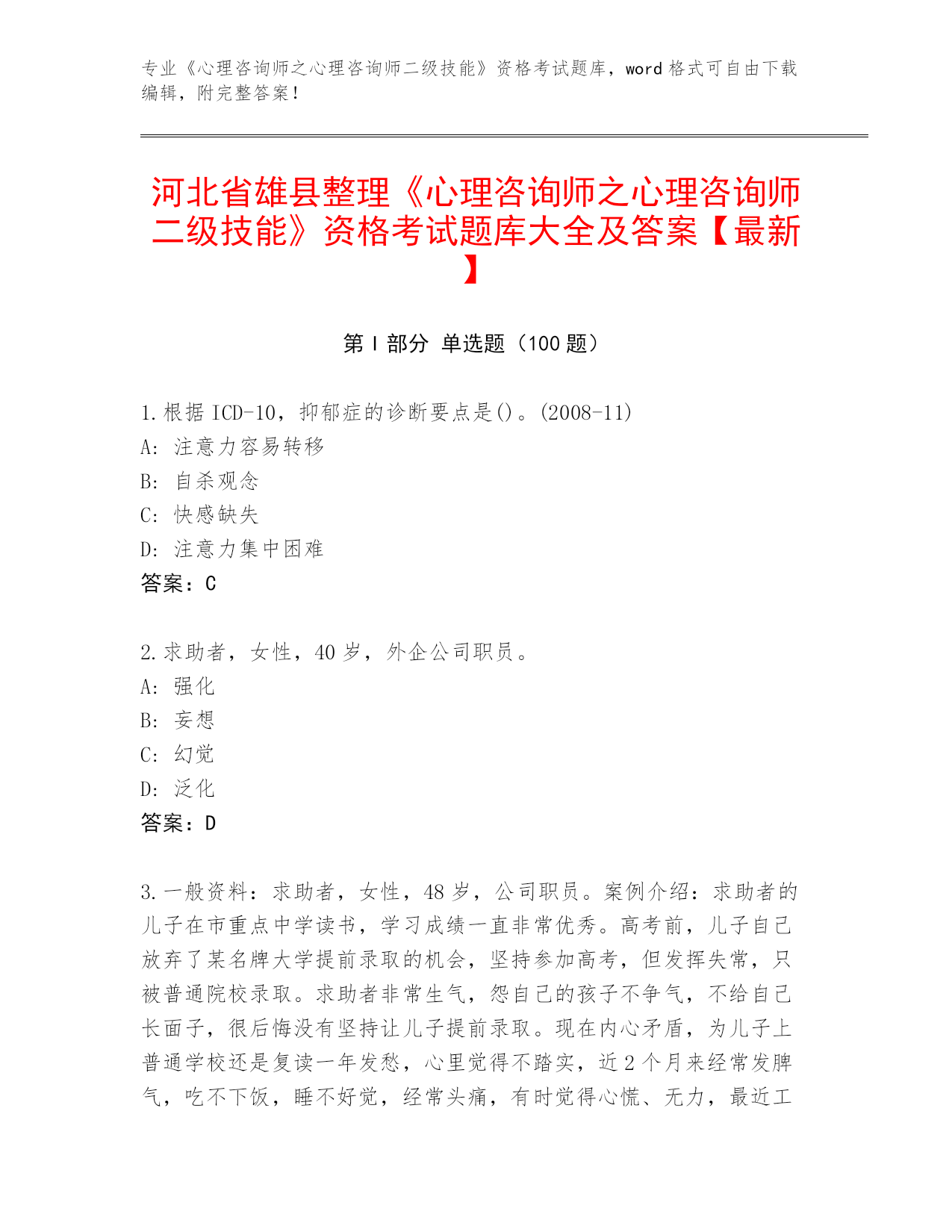 河北省雄县2024年《心理咨询师之心理咨询师二级技能》资格考试完整题库带答案(A卷)