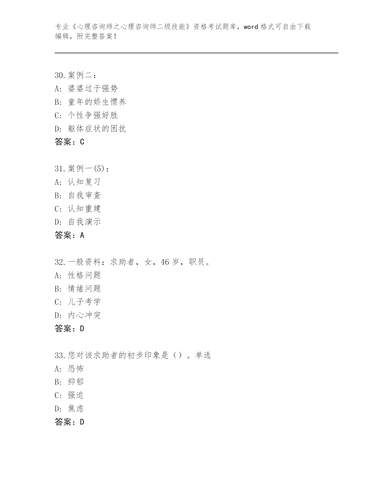 河北省雄县整理《心理咨询师之心理咨询师二级技能》资格考试题库大全及答案【最新】