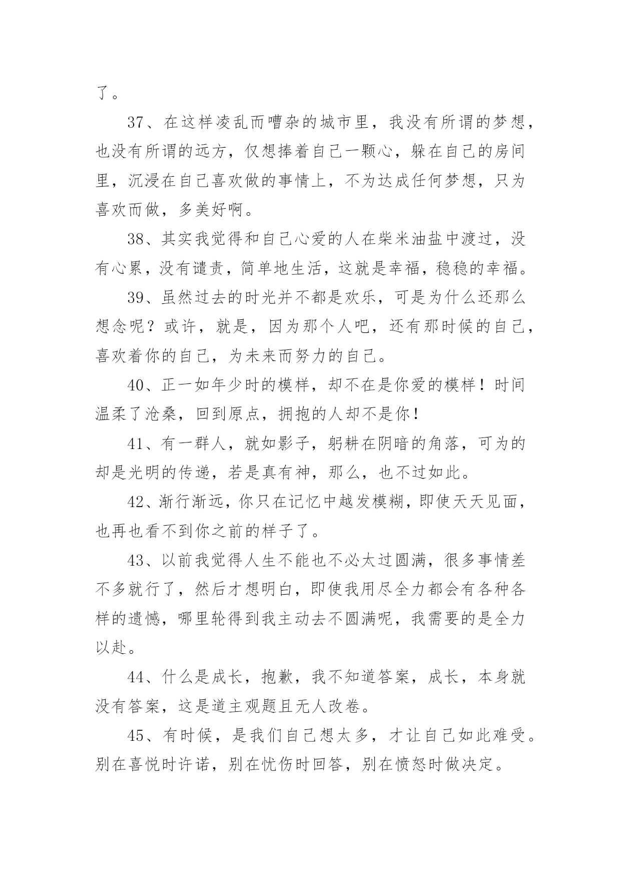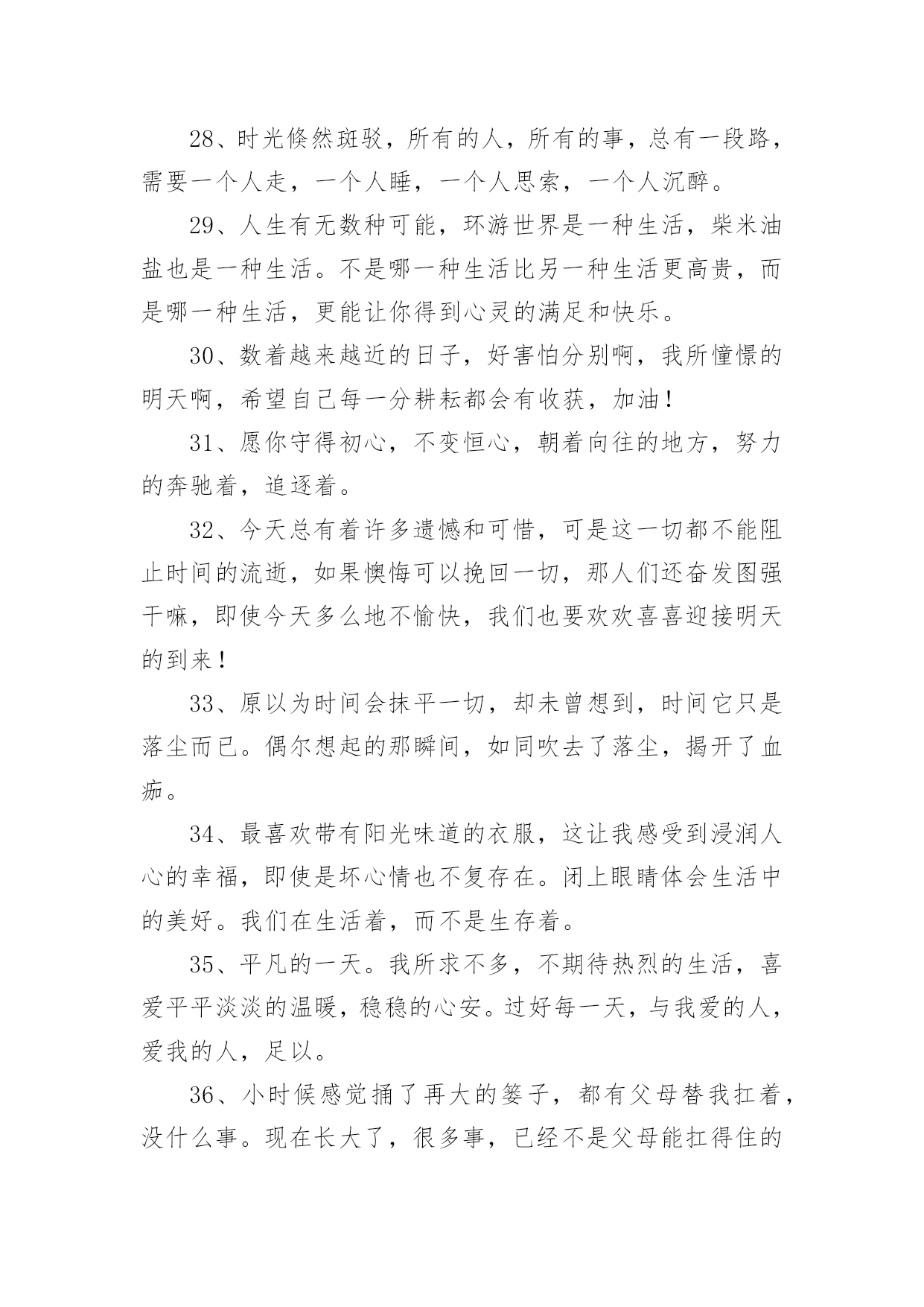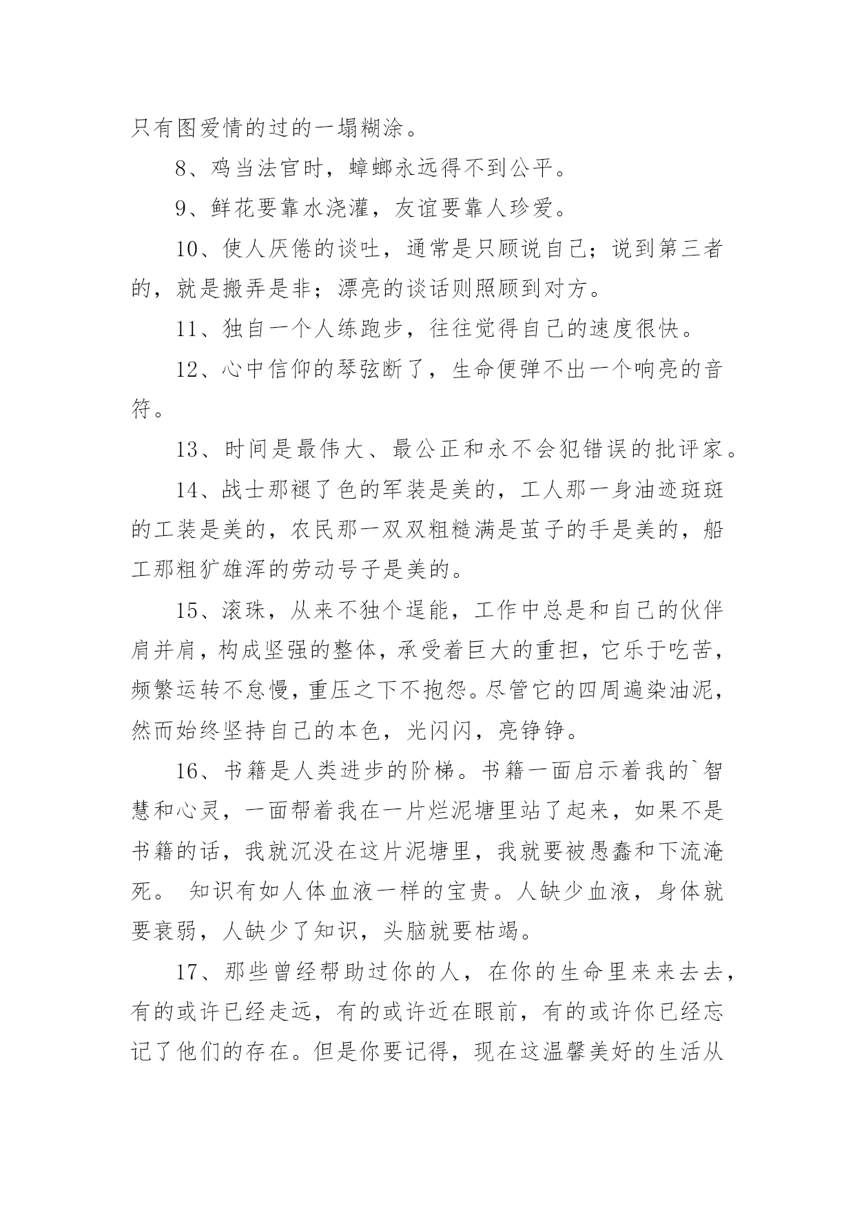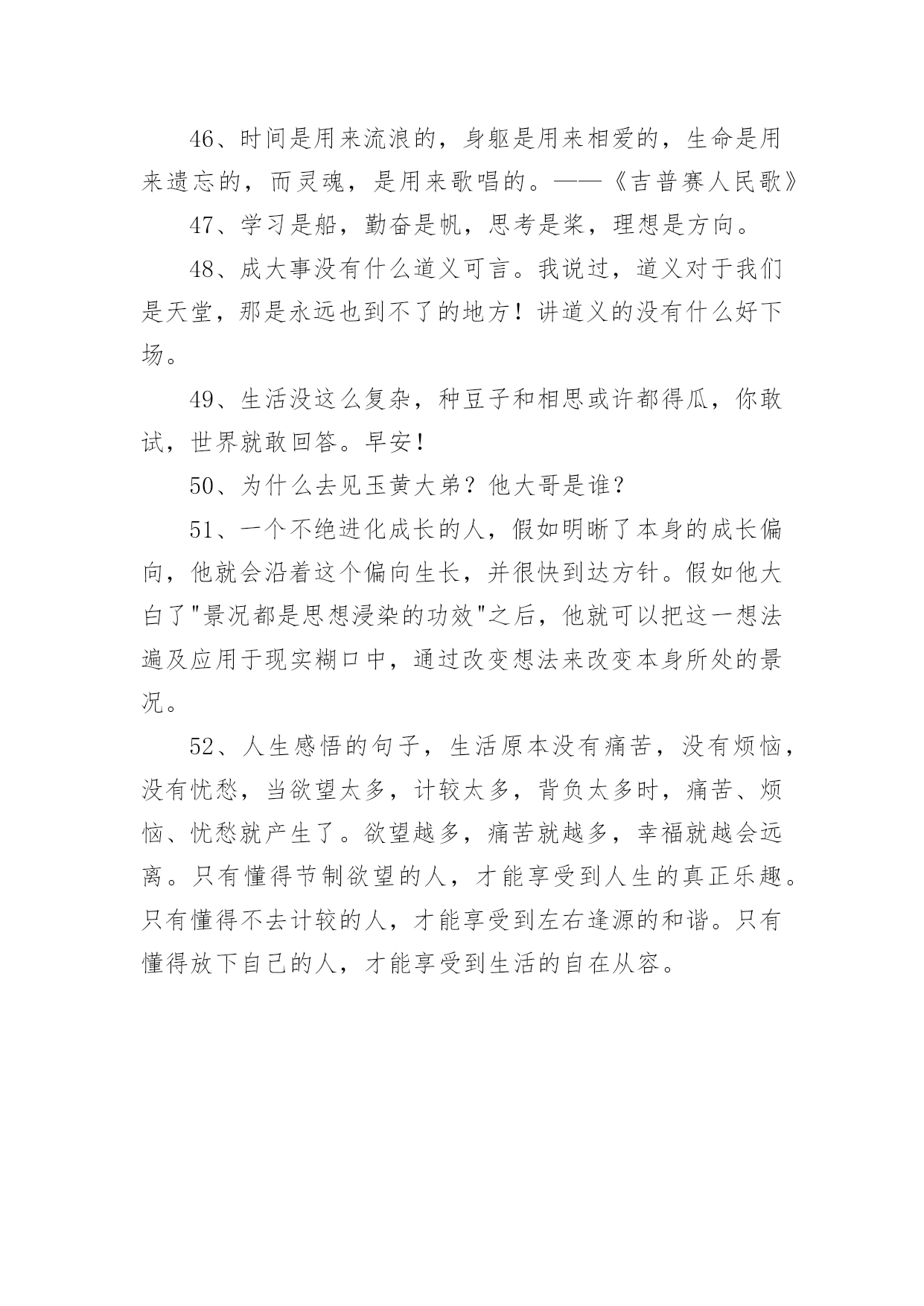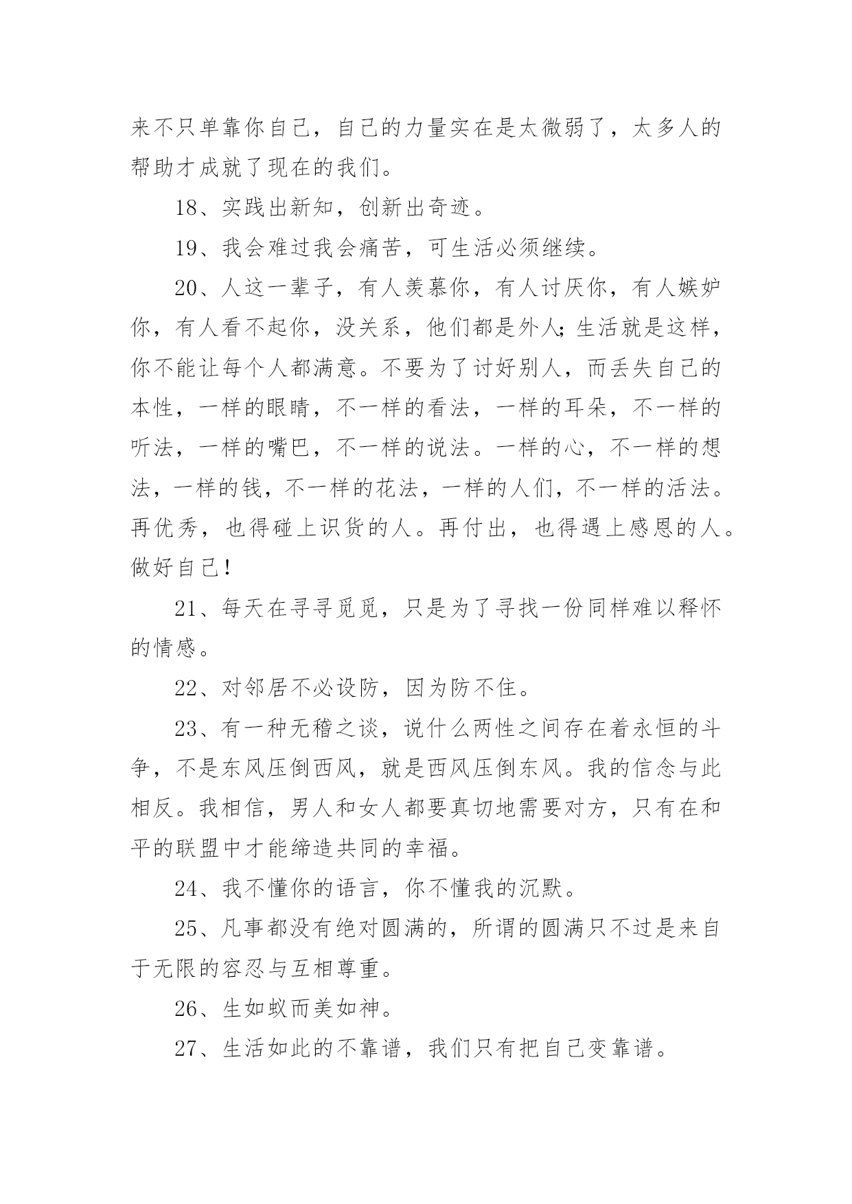 感悟生活语录实用的感悟生活语录大合集52句多讲点笑话,以诙谐的立场办事,这样子日子会好过一点下面是小编搜索整理的感悟生活语录52句,希望能够帮助到大家。1、每个人都会有自己的人生目标,为钱、为权、为女人、为事业,而我们应该反省的是自己究竟是为了什么?我们在确定了自己人生理想后,是在等天上掉下馅饼还是自己在努力创造馅饼?2、[天天禅语]爱的力量,可以抚平心灵的不安,让社会安定祥与,消除一切的灾难。3、悟道跟吃饭一样,一定要自己一口一口地吃,指望别人帮你吃饭,那是不现实的。听闻道理却没有领悟,跟盛了饭却没有吃一样,不能变成精神的营养。所以,要打消投机取巧的心理,将成功希望寄托在自己持之以恒的努力上。4、时间是个好东西,让我们知道日久见人心,留到最后的才是好的。也让我们学会冷暖自知,更懂得好自为之。5、生活是季节,不论春夏秋冬,人生没有如果,命运不相信假设。别在是非之间劳心费神,幸福才是人生的唯一答案;得到勿窃喜,失去毋徒悲,得失只是一种状态,保持灵魂的安静才是真正的大心境。6、为公者大爱,为私者大欲。7、突然发现,图钱图车图房的姑娘,现在都过的很好,只有图爱情的过的一塌糊涂。8、鸡当法官时,蟑螂永远得不到公平。9、鲜花要靠水浇灌,友谊要靠人珍爱。10、使人厌倦的谈吐,通常是只顾说自己;说到第三者的,就是搬弄是非;漂亮的谈话则照顾到对方。11、独自一个人练跑步,往往觉得自己的速度很快。12、心中信仰的琴弦断了,生命便弹不出一个响亮的音符。13、时间是最伟大、最公正和永不会犯错误的批评家。14、战士那褪了色的军装是美的,工人那一身油迹斑斑的工装是美的,农民那一双双粗糙满是茧子的手是美的,船工那粗犷雄浑的劳动号子是美的。15、滚珠,从来不独个逞能,工作中总是和自己的伙伴肩并肩,构成坚强的整体,承受着巨大的重担,它乐于吃苦,频繁运转不怠慢,重压之下不抱怨。尽管它的四周遍染油泥,然而始终坚持自己的本色,光闪闪,亮铮铮。16、书籍是人类进步的阶梯。书籍一面启示着我的`智慧和心灵,一面帮着我在一片烂泥塘里站了起来,如果不是书籍的话,我就沉没在这片泥塘里,我就要被愚蠢和下流淹死。知识有如人体血液一样的宝贵。人缺少血液,身体就要衰弱,人缺少了知识,头脑就要枯竭。17、那些曾经帮助过你的人,在你的生命里来来去去,有的或许已经走远,有的或许近在眼前,有的或许你已经忘记了他们的存在。但是你要记得,现在这温馨美好的生活从来不只单靠你自己,自己的力量实在是太微弱了,太多人的帮助才成就了现在的我们。18、实践出新知,创新出奇迹。19、我会难过我会痛苦,可生活必须继续。20、人这一辈子,有人羡慕你,有人讨厌你,有人嫉妒你,有人看不起你,没关系,他们都是外人;生活就是这样,你不能让每个人都满意。不要为了讨好别人,而丢失自己的本性,一样的眼睛,不一样的看法,一样的耳朵,不一样的听法,一样的嘴巴,不一样的说法。一样的心,不一样的想法,一样的钱,不一样的花法,一样的人们,不一样的活法。再优秀,也得碰上识货的人。再付出,也得遇上感恩的人。做好自己!21、每天在寻寻觅觅,只是为了寻找一份同样难以释怀的情感。22、对邻居不必设防,因为防不住。23、有一种无稽之谈,说什么两性之间存在着永恒的斗争,不是东风压倒西风,就是西风压倒东风。我的信念与此相反。我相信,男人和女人都要真切地需要对方,只有在和平的联盟中才能缔造共同的幸福。24、我不懂你的语言,你不懂我的沉默。25、凡事都没有绝对圆满的,所谓的圆满只不过是来自于无限的容忍与互相尊重。26、生如蚁而美如神。27、生活如此的不靠谱,我们只有把自己变靠谱。28、时光倏然斑驳,所有的人,所有的事,总有一段路,需要一个人走,一个人睡,一个人思索,一个人沉醉。29、人生有无数种可能,环游世界是一种生活,柴米油盐也是一种生活。不是哪一种生活比另一种生活更高贵,而是哪一种生活,更能让你得到心灵的满足和快乐。30、数着越来越近的日子,好害怕分别啊,我所憧憬的明天啊,希望自己每一分耕耘都会有收获,加油!31、愿你守得初心,不变恒心,朝着向往的地方,努力的奔驰着,追逐着。32、今天总有着许多遗憾和可惜,可是这一切都不能阻止时间的流逝,如果懊悔可以挽回一切,那人们还奋发图强干嘛,即使今天多么地不愉快,我们也要欢欢喜喜迎接明天的到来!33、原以为时间会抹平一切,却未曾想到,时间它只是落尘而已。偶尔想起的那瞬间,如同吹去了落尘,揭开了血痂。34、最喜欢带有阳光味道的衣服,这让我感受到浸润人心的幸福,即使是坏心情也不复存在。闭上眼睛体会生活中的美好。我们在生活着,而不是生存着。35、平凡的一天。我所求不多,不期待热烈的生活,喜爱平平淡淡的温暖,稳稳的心安。过好每一天,与我爱的人,爱我的人,足以。36、小时候感觉捅了再大的篓子,都有父母替我扛着,没什么事
