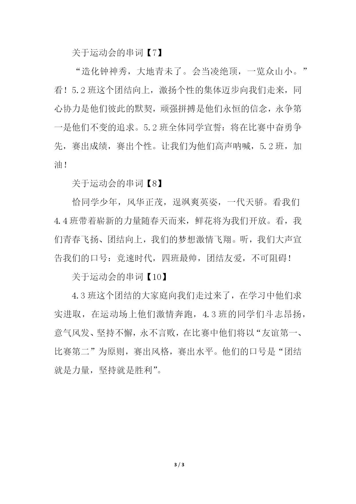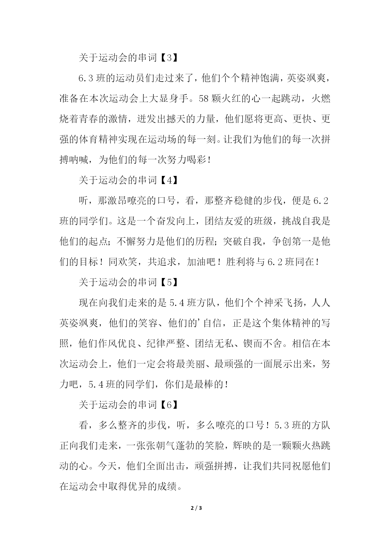 PAGE3/NUMPAGES3关于运动会的串词关于运动会的串词一年一度的运动会,怎么能够不重视呢,所有人都最爱的运动会马上要开始了,音乐响起的那一刹那,激昂慷慨的入场词让我们的热血都沸腾起来了。下面是整理收集的关于运动会的串词,欢迎阅读参考!关于运动会的串词【1】一群意气风发、精神抖擞的少年正向我们走来,整齐的步伐踏着他们的坚定,灿烂的微笑写着他们的热情,嘹亮的口号体现着他们的实力。他们团结友爱、勤奋好学,他们用拼搏的汗水挥洒赛场,用晶莹的泪水拥抱胜利的辉煌。这就是他们,这就是永远激情飞扬的6.1班!关于运动会的串词【2】迈着轻快的步子,带着愉快的微笑向我们走来的是6.4班的同学们。6.4班是一个团结向上、努力奋进的集体,朝气与活力在他们身上洋溢,友爱与鼓励在他们心中传递,本届运动会,他们不畏掌声的诠释,不畏刻意的征服,只用辛勤的汗水化作追求的脚步,用行动来诉说对华严老师们辛勤培养的报答。关于运动会的串词【3】6.3班的运动员们走过来了,他们个个精神饱满,英姿飒爽,准备在本次运动会上大显身手。58颗火红的心一起跳动,火燃烧着青春的激情,迸发出撼天的力量,他们愿将更高、更快、更强的体育精神实现在运动场的每一刻。让我们为他们的每一次拼搏呐喊,为他们的每一次努力喝彩!关于运动会的串词【4】听,那激昂嘹亮的口号,看,那整齐稳健的步伐,便是6.2班的同学们。这是一个奋发向上,团结友爱的班级,挑战自我是他们的起点;不懈努力是他们的历程;突破自我,争创第一是他们的目标!同欢笑,共追求,加油吧!胜利将与6.2班同在!关于运动会的串词【5】现在向我们走来的是5.4班方队,他们个个神采飞扬,人人英姿飒爽,他们的笑容、他们的'自信,正是这个集体精神的写照,他们作风优良、纪律严整、团结无私、锲而不舍。相信在本次运动会上,他们一定会将最美丽、最顽强的一面展示出来,努力吧,5.4班的同学们,你们是最棒的!关于运动会的串词【6】看,多么整齐的步伐,听,多么嘹亮的口号!5.3班的方队正向我们走来,一张张朝气蓬勃的笑脸,辉映的是一颗颗火热跳动的心。今天,他们全面出击,顽强拼搏,让我们共同祝愿他们在运动会中取得优异的成绩。关于运动会的串词【7】“造化钟神秀,大地青未了。会当凌绝顶,一览众山小。”看!5.2班这个团结向上,激扬个性的集体迈步向我们走来,同心协力是他们彼此的默契,顽强拼搏是他们永恒的信念,永争第一是他们不变的追求。5.2班全体同学宣誓:将在比赛中奋勇争先,赛出成绩,赛出个性。让我们为他们高声呐喊,5.2班,加油!关于运动会的串词【8】恰同学少年,风华正茂,逞飒爽英姿,一代天骄。看我们4.4班带着崭新的力量随春天而来,鲜花将为我们开放。看,我们青春飞扬、团结向上,我们的梦想激情飞翔。听,我们大声宣告我们的口号:竞速时代,四班最帅,团结友爱,不可阻碍!关于运动会的串词【10】4.3班这个团结的大家庭向我们走过来了,在学习中他们求实进取,在运动场上他们激情奔跑,4.3班的同学们斗志昂扬,意气风发、坚持不懈,永不言败,在比赛中他们将以“友谊第一、比赛第二”为原则,赛出风格,赛出水平。他们的口号是“团结就是力量,坚持就是胜利”。