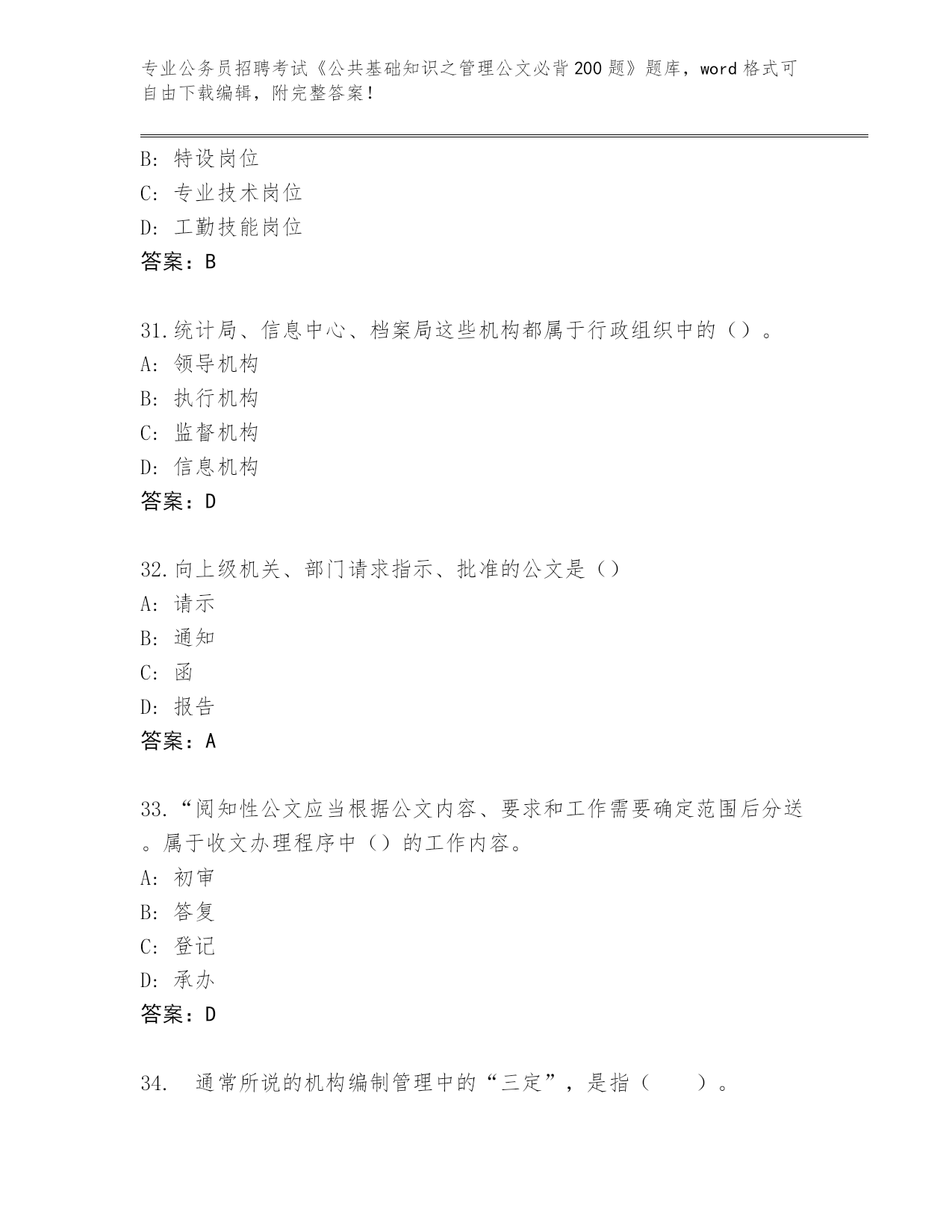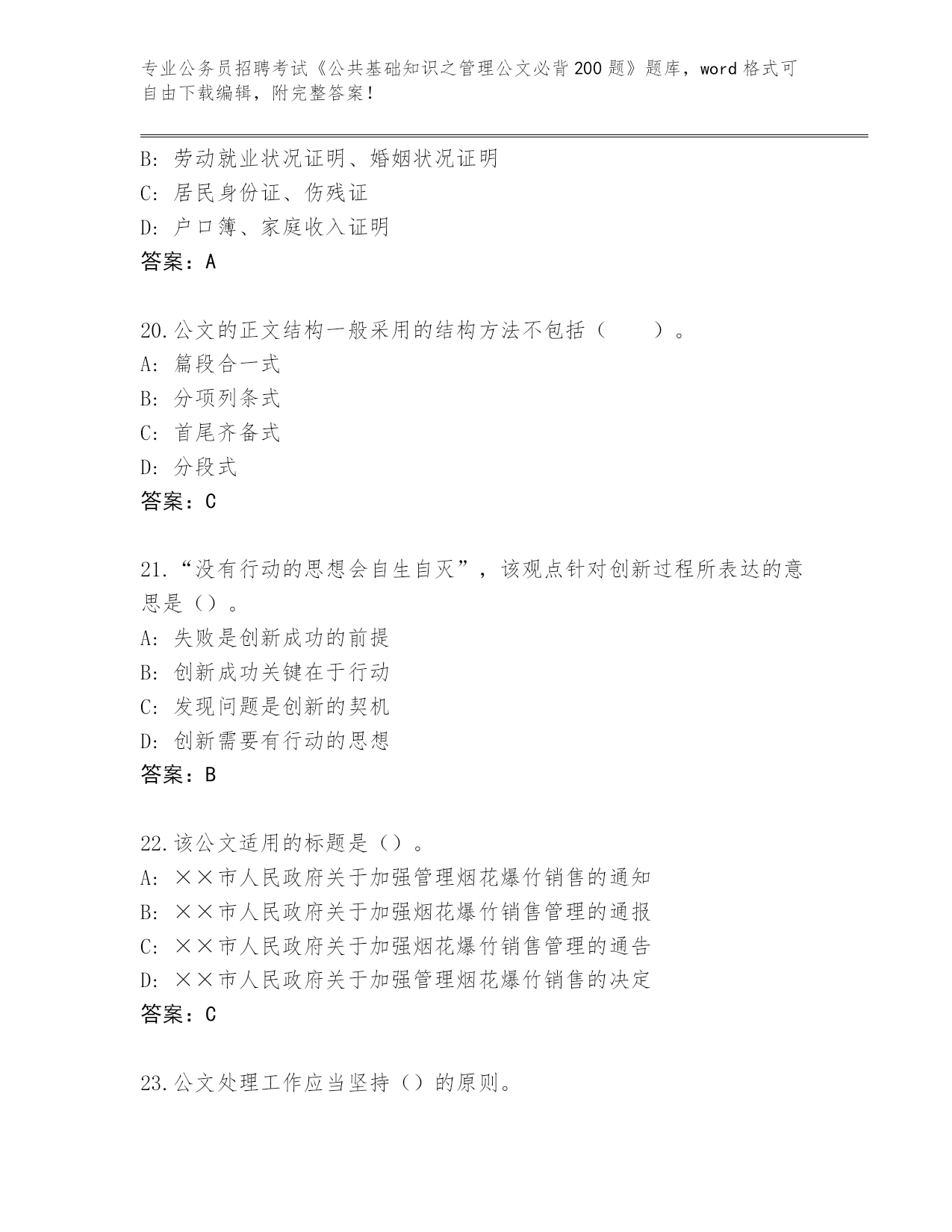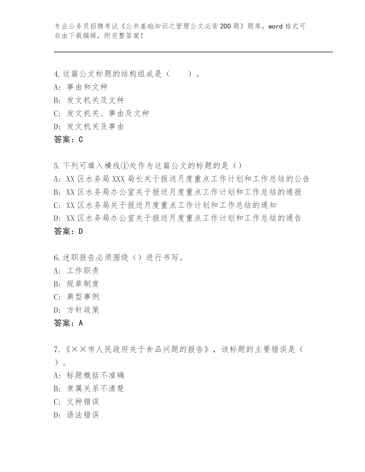 历年重庆市綦江区公务员招聘考试《公共基础知识之管理公文必背200题》真题(名师系列)