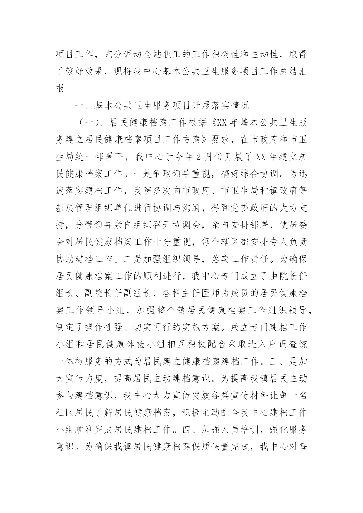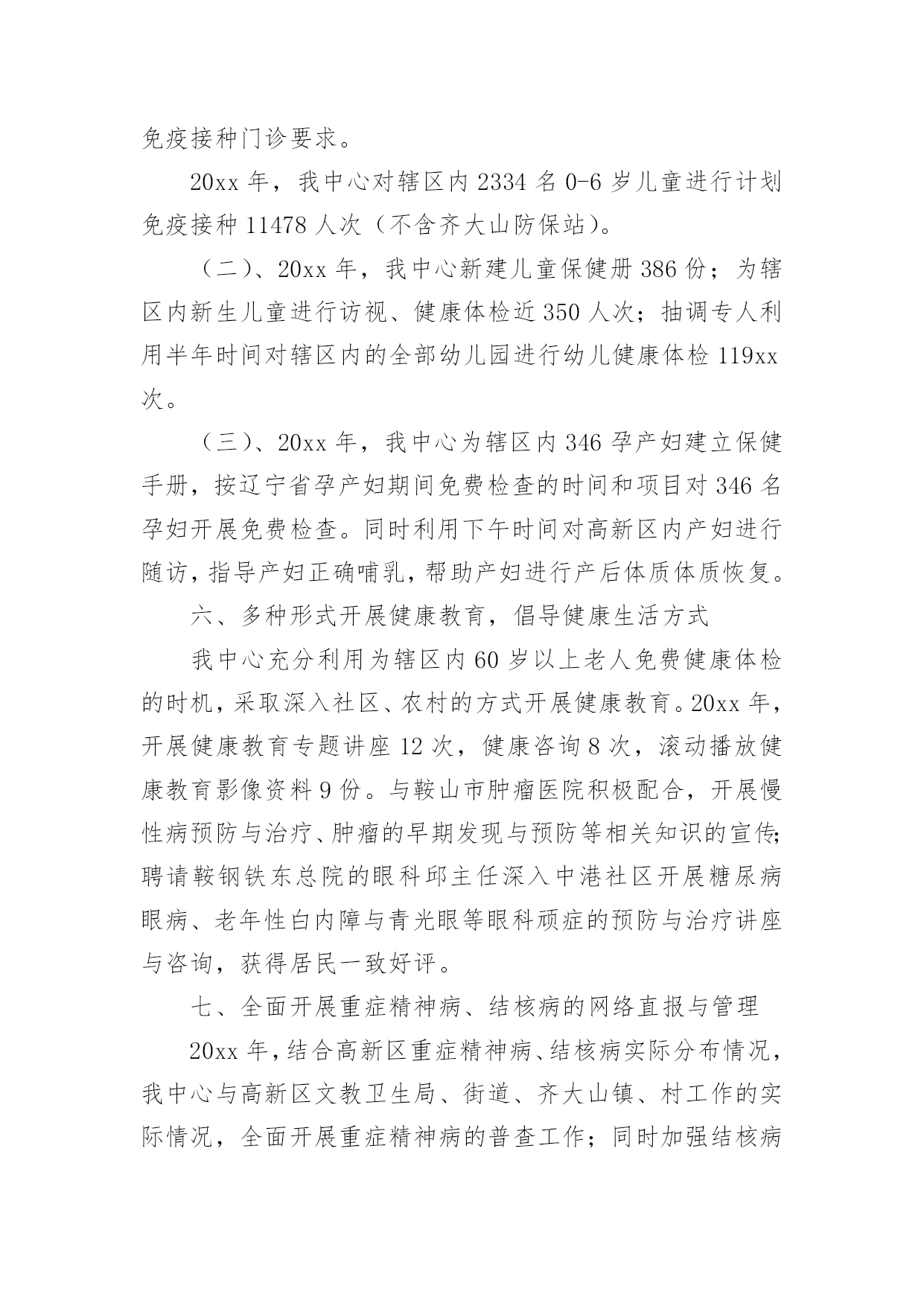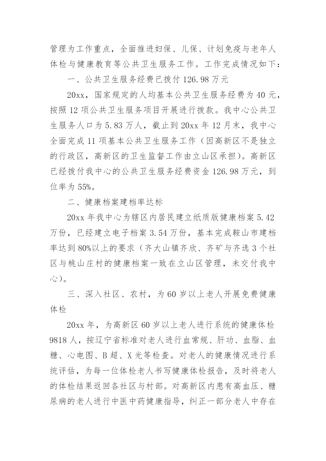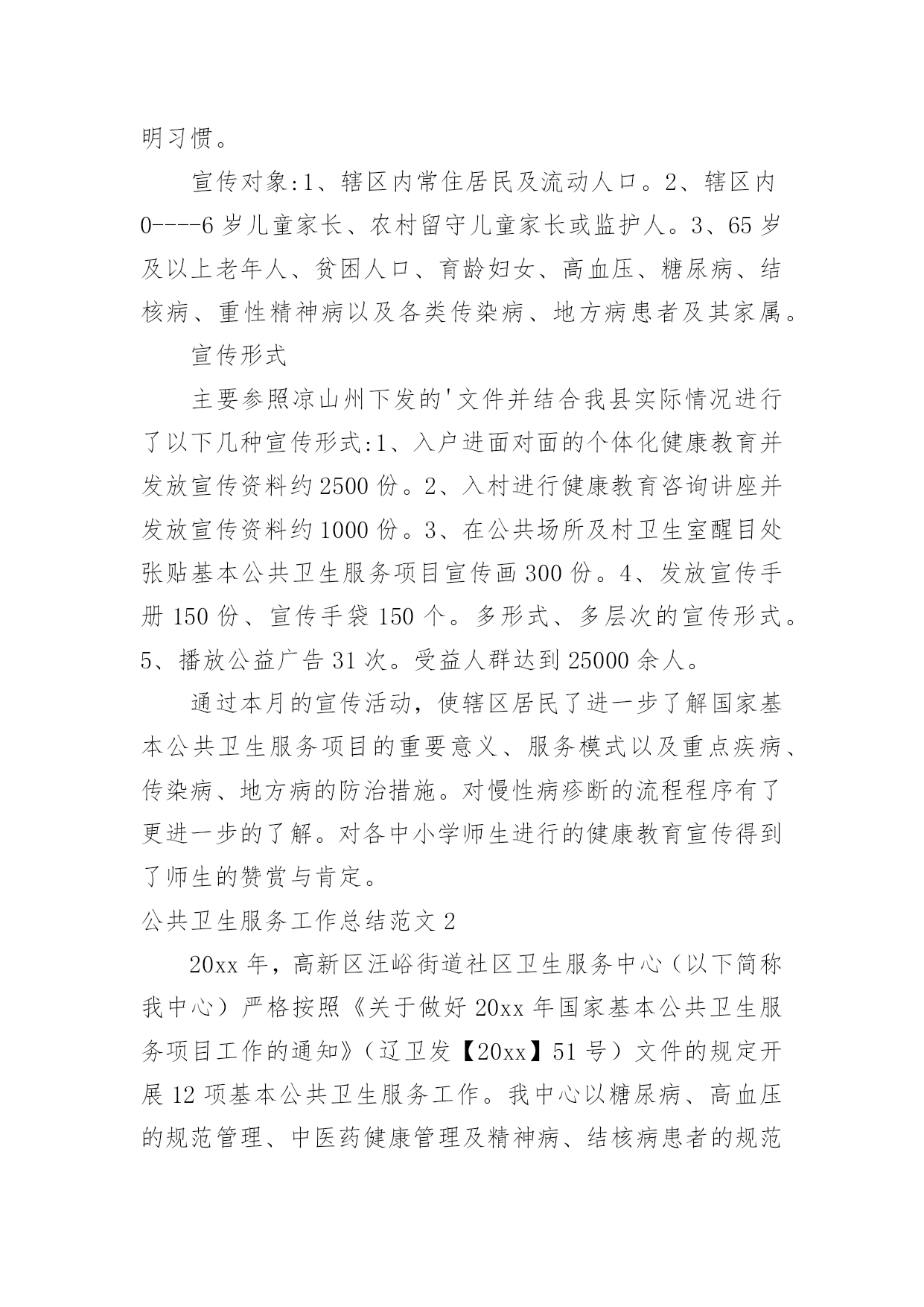 公共卫生服务工作总结公共卫生服务工作总结范文总结是指社会团体、企业单位和个人在自身的某一时期、某一项目或某些工作告一段落或者全部完成后进行回顾检查、分析评价,从而肯定成绩,得到经验,找出差距,得出教训和一些规律性认识的一种书面材料,它可以使我们更有效率,为此我们要做好回顾,写好总结。总结怎么写才能发挥它的作用呢?以下是小编为大家整理的公共卫生服务工作总结范文,欢迎阅读,希望大家能够喜欢。公共卫生服务工作总结范文1为巩固基本公共卫生服务已取得的工作成果,进一步提高城乡居民对项目的知晓率、参与度。积极响应凉山州卫生计生委关天开展“国家基本公共卫生服务项目宣传月”活动。县疾控中心与28个乡镇卫生院及社区服务中心于20xx年7月1日至20xx年8月14日全面展开了为期1月的国家基本公共卫生服务项目的宣传活动,宣传活动覆盖了全县28个乡镇的218个村、社区及各乡镇中小学校。现将宣传活动总结如下:此次宣传内容有:1实施国家基本公共卫生服务项目的重要意义;2、基本公共卫生服务项目核心信息;3、家庭医生式签约服务等新型服务模式;4、国家基本公共卫生服务工作进展情况;5、日常医疗卫生常识;6疾病的防治知识、健康文明习惯。宣传对象:1、辖区内常住居民及流动人口。2、辖区内0----6岁儿童家长、农村留守儿童家长或监护人。3、65岁及以上老年人、贫困人口、育龄妇女、高血压、糖尿病、结核病、重性精神病以及各类传染病、地方病患者及其家属。宣传形式主要参照凉山州下发的'文件并结合我县实际情况进行了以下几种宣传形式:1、入户进面对面的个体化健康教育并发放宣传资料约2500份。2、入村进行健康教育咨询讲座并发放宣传资料约1000份。3、在公共场所及村卫生室醒目处张贴基本公共卫生服务项目宣传画300份。4、发放宣传手册150份、宣传手袋150个。多形式、多层次的宣传形式。5、播放公益广告31次。受益人群达到25000余人。通过本月的宣传活动,使辖区居民了进一步了解国家基本公共卫生服务项目的重要意义、服务模式以及重点疾病、传染病、地方病的防治措施。对慢性病疹断的流程程序有了更进一步的了解。对各中小学师生进行的健康教育宣传得到了师生的赞赏与肯定。公共卫生服务工作总结范文220xx年,高新区汪峪街道社区卫生服务中心(以下简称我中心)严格按照《关于做好20xx年国家基本公共卫生服务项目工作的通知》(辽卫发【20xx】51号)文件的规定开展12项基本公共卫生服务工作。我中心以糖尿病、高血压的规范管理、中医药健康管理及精神病、结核病患者的规范管理为工作重点,全面推进妇保、儿保、计划免疫与老年人体检与健康教育等公共卫生服务工作。工作完成情况如下:一、公共卫生服务经费已拨付126.98万元20xx,国家规定的人均基本公共卫生服务经费为40元,按照12项公共卫生服务项目开展进行拨款。我中心公共卫生服务人口为5.83万人,截止到20xx年12月末,我中心全面完成11项基本公共卫生服务工作(因高新区不是独立的行政区,高新区的卫生监督工作由立山区承担)。高新区已经拨付我中心的公共卫生服务经费资金126.98万元,到位率为55%。二、健康档案建档率达标20xx年我中心为辖区内居民建立纸质版健康档案5.42万份,已经建立电子档案3.54万份,基本完成鞍山市建档率达到80%以上的要求(齐大山镇齐欣、齐矿与齐选3个社区与桃山庄村的健康档案一致在立山区管理,未交付我中心)。三、深入社区、农村,为60岁以上老人开展免费健康体检20xx年,为高新区60岁以上老人进行系统的健康体检9818人,按辽宁省标准对老人进行血常规、肝功、血脂、血糖、心电图、B超、X光等检查。对老人的健康情况进行系统评估,为每一位体检老人书写健康体检报告,及时将老人的体检结果返回各社区与村部。对高新区内患有高血压、糖尿病的老人进行中医中药健康指导,纠正一部分老人中存在的中药无毒不听从医生指导随便用药的倾向,指导他们合理服药,为老人的健康提供指导,帮助他们逐步建立正确的健康生活理念,保证他们的身体健康。四、进一步规范慢病管理,提升生活质量20xx年,按照国家慢病管理规定,我中心对高新区内5460名高血压与3081名糖尿病患者进行每季度一次的随访,及时跟踪他们的血压与血糖变化情况,对他们的服药、饮食进行健康指导,延迟高血压、糖尿病合并症的出现时间,提高他们的.生存质量。其中,规范管理高血压患者3880人次,规范管理糖尿病患者2188人次。高血压与糖尿病的规范管理达标率超过35%。同时,我中心充分利用10月份鞍山市分级诊疗工作全面开展的契机,主动与分级诊疗上级对口医院鞍山市肿瘤医院医务科联系配合,开展高血压、糖尿病防治知识宣传,充分利用健康体检的契机为高血压、糖尿病患者及其家属宣传相关的医疗、预防、生活保健常识,减轻这2类慢性病