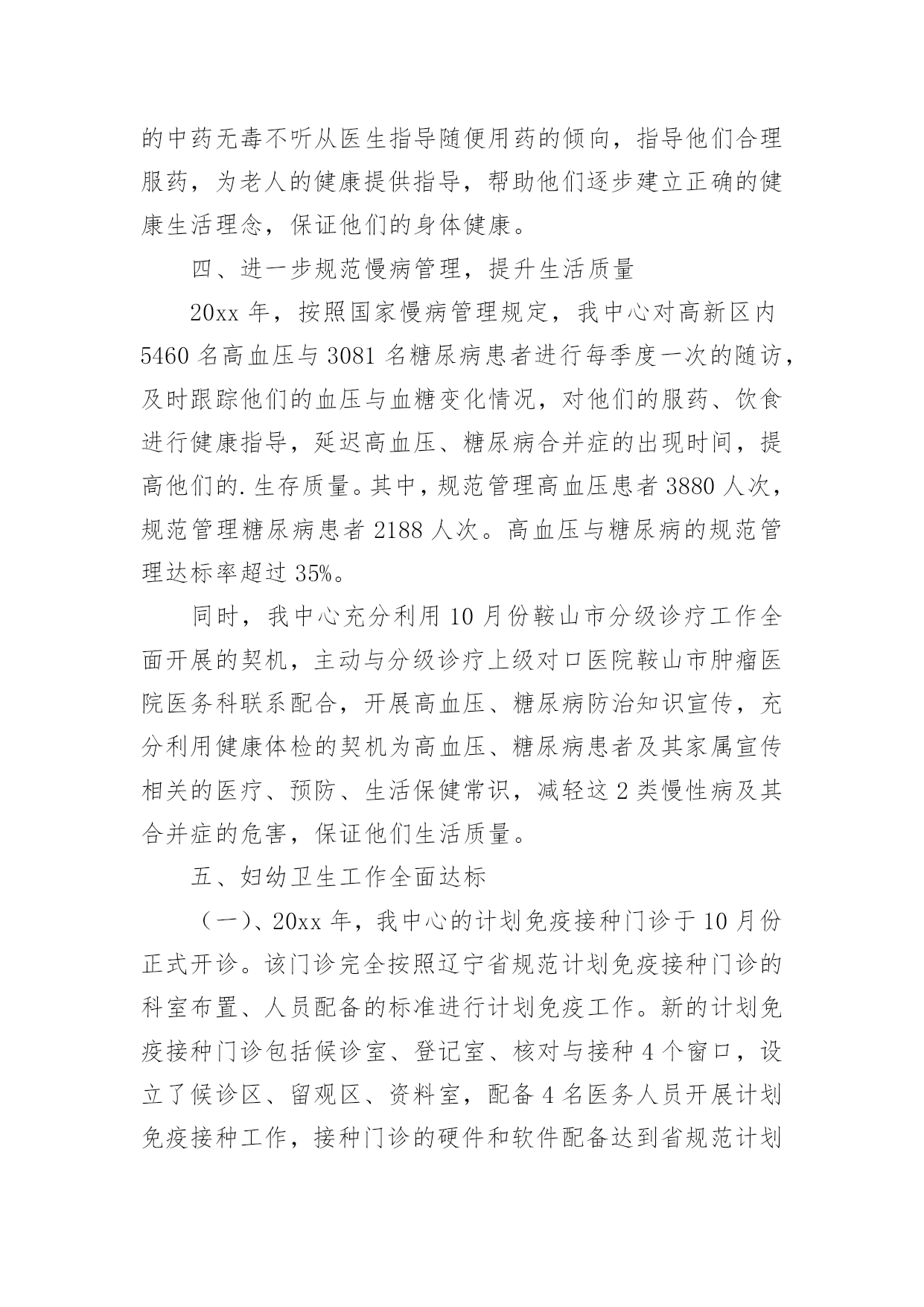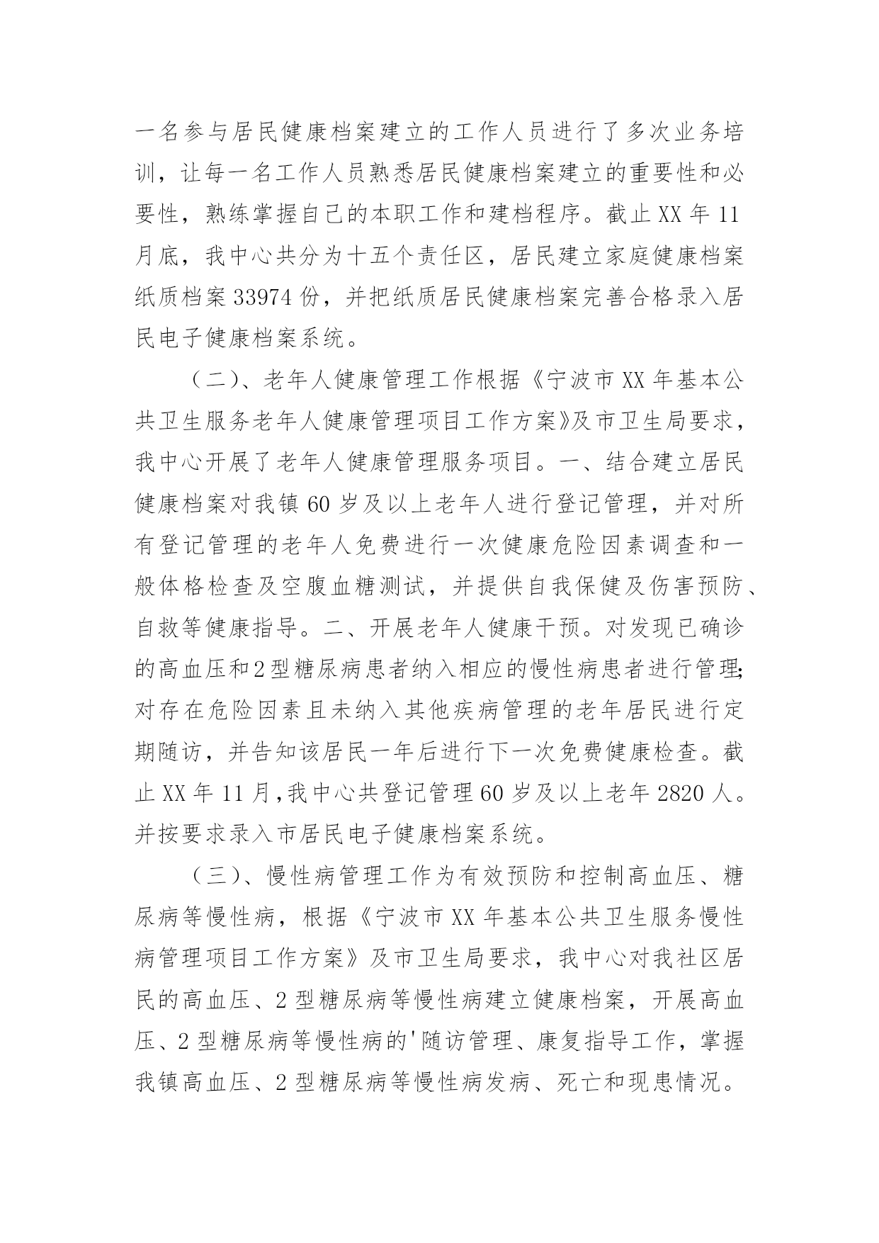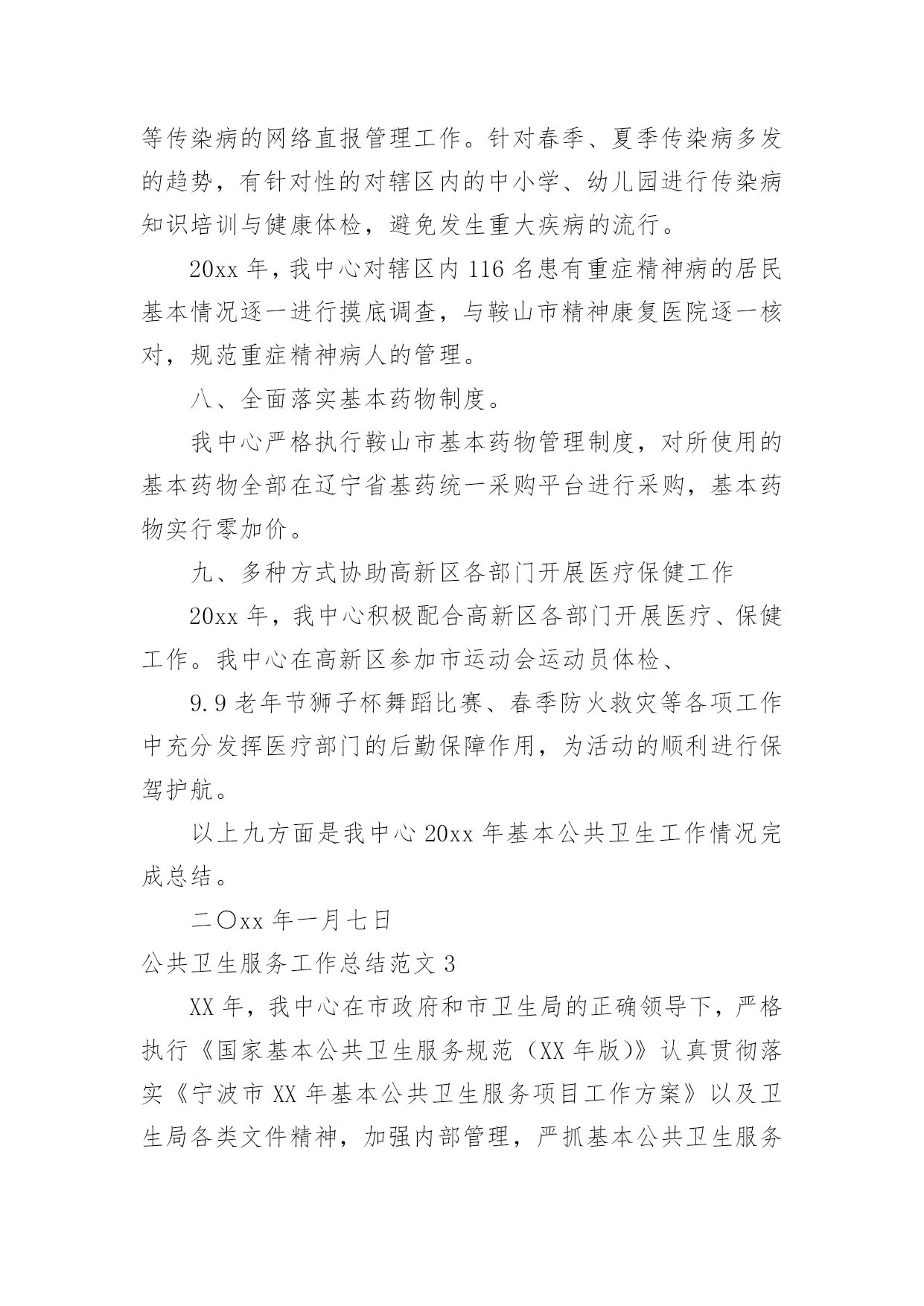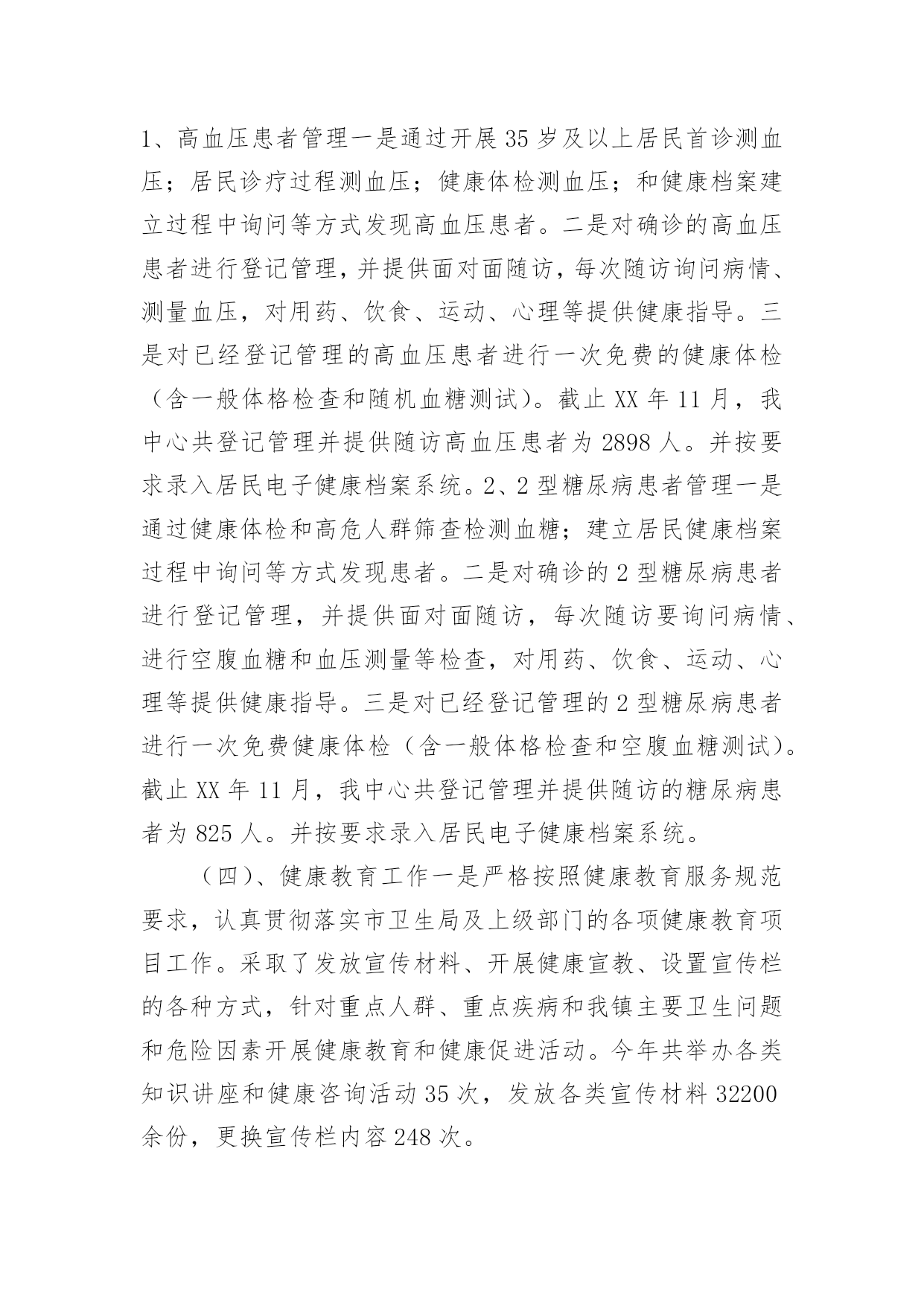 公共卫生服务工作总结公共卫生服务工作总结范文总结是指社会团体、企业单位和个人在自身的某一时期、某一项目或某些工作告一段落或者全部完成后进行回顾检查、分析评价,从而肯定成绩,得到经验,找出差距,得出教训和一些规律性认识的一种书面材料,它可以使我们更有效率,为此我们要做好回顾,写好总结。总结怎么写才能发挥它的作用呢?以下是小编为大家整理的公共卫生服务工作总结范文,欢迎阅读,希望大家能够喜欢。公共卫生服务工作总结范文1为巩固基本公共卫生服务已取得的工作成果,进一步提高城乡居民对项目的知晓率、参与度。积极响应凉山州卫生计生委关天开展“国家基本公共卫生服务项目宣传月”活动。县疾控中心与28个乡镇卫生院及社区服务中心于20xx年7月1日至20xx年8月14日全面展开了为期1月的国家基本公共卫生服务项目的宣传活动,宣传活动覆盖了全县28个乡镇的218个村、社区及各乡镇中小学校。现将宣传活动总结如下:此次宣传内容有:1实施国家基本公共卫生服务项目的重要意义;2、基本公共卫生服务项目核心信息;3、家庭医生式签约服务等新型服务模式;4、国家基本公共卫生服务工作进展情况;5、日常医疗卫生常识;6疾病的防治知识、健康文明习惯。宣传对象:1、辖区内常住居民及流动人口。2、辖区内0----6岁儿童家长、农村留守儿童家长或监护人。3、65岁及以上老年人、贫困人口、育龄妇女、高血压、糖尿病、结核病、重性精神病以及各类传染病、地方病患者及其家属。宣传形式主要参照凉山州下发的'文件并结合我县实际情况进行了以下几种宣传形式:1、入户进面对面的个体化健康教育并发放宣传资料约2500份。2、入村进行健康教育咨询讲座并发放宣传资料约1000份。3、在公共场所及村卫生室醒目处张贴基本公共卫生服务项目宣传画300份。4、发放宣传手册150份、宣传手袋150个。多形式、多层次的宣传形式。5、播放公益广告31次。受益人群达到25000余人。通过本月的宣传活动,使辖区居民了进一步了解国家基本公共卫生服务项目的重要意义、服务模式以及重点疾病、传染病、地方病的防治措施。对慢性病疹断的流程程序有了更进一步的了解。对各中小学师生进行的健康教育宣传得到了师生的赞赏与肯定。公共卫生服务工作总结范文220xx年,高新区汪峪街道社区卫生服务中心(以下简称我中心)严格按照《关于做好20xx年国家基本公共卫生服务项目工作的通知》(辽卫发【20xx】51号)文件的规定开展12项基本公共卫生服务工作。我中心以糖尿病、高血压的规范管理、中医药健康管理及精神病、结核病患者的规范管理为工作重点,全面推进妇保、儿保、计划免疫与老年人体检与健康教育等公共卫生服务工作。工作完成情况如下:一、公共卫生服务经费已拨付126.98万元20xx,国家规定的人均基本公共卫生服务经费为40元,按照12项公共卫生服务项目开展进行拨款。我中心公共卫生服务人口为5.83万人,截止到20xx年12月末,我中心全面完成11项基本公共卫生服务工作(因高新区不是独立的行政区,高新区的卫生监督工作由立山区承担)。高新区已经拨付我中心的公共卫生服务经费资金126.98万元,到位率为55%。二、健康档案建档率达标20xx年我中心为辖区内居民建立纸质版健康档案5.42万份,已经建立电子档案3.54万份,基本完成鞍山市建档率达到80%以上的要求(齐大山镇齐欣、齐矿与齐选3个社区与桃山庄村的健康档案一致在立山区管理,未交付我中心)。三、深入社区、农村,为60岁以上老人开展免费健康体检20xx年,为高新区60岁以上老人进行系统的健康体检9818人,按辽宁省标准对老人进行血常规、肝功、血脂、血糖、心电图、B超、X光等检查。对老人的健康情况进行系统评估,为每一位体检老人书写健康体检报告,及时将老人的体检结果返回各社区与村部。对高新区内患有高血压、糖尿病的老人进行中医中药健康指导,纠正一部分老人中存在的中药无毒不听从医生指导随便用药的倾向,指导他们合理服药,为老人的健康提供指导,帮助他们逐步建立正确的健康生活理念,保证他们的身体健康。四、进一步规范慢病管理,提升生活质量20xx年,按照国家慢病管理规定,我中心对高新区内5460名高血压与3081名糖尿病患者进行每季度一次的随访,及时跟踪他们的血压与血糖变化情况,对他们的服药、饮食进行健康指导,延迟高血压、糖尿病合并症的出现时间,提高他们的.生存质量。其中,规范管理高血压患者3880人次,规范管理糖尿病患者2188人次。高血压与糖尿病的规范管理达标率超过35%。同时,我中心充分利用10月份鞍山市分级诊疗工作全面开展的契机,主动与分级诊疗上级对口医院鞍山市肿瘤医院医务科联系配合,开展高血压、糖尿病防治知识宣传,充分利用健康体检的契机为高血压、糖尿病患者及其家属宣传相关的医疗、预防、生活保健常识,减轻这2类慢性病
