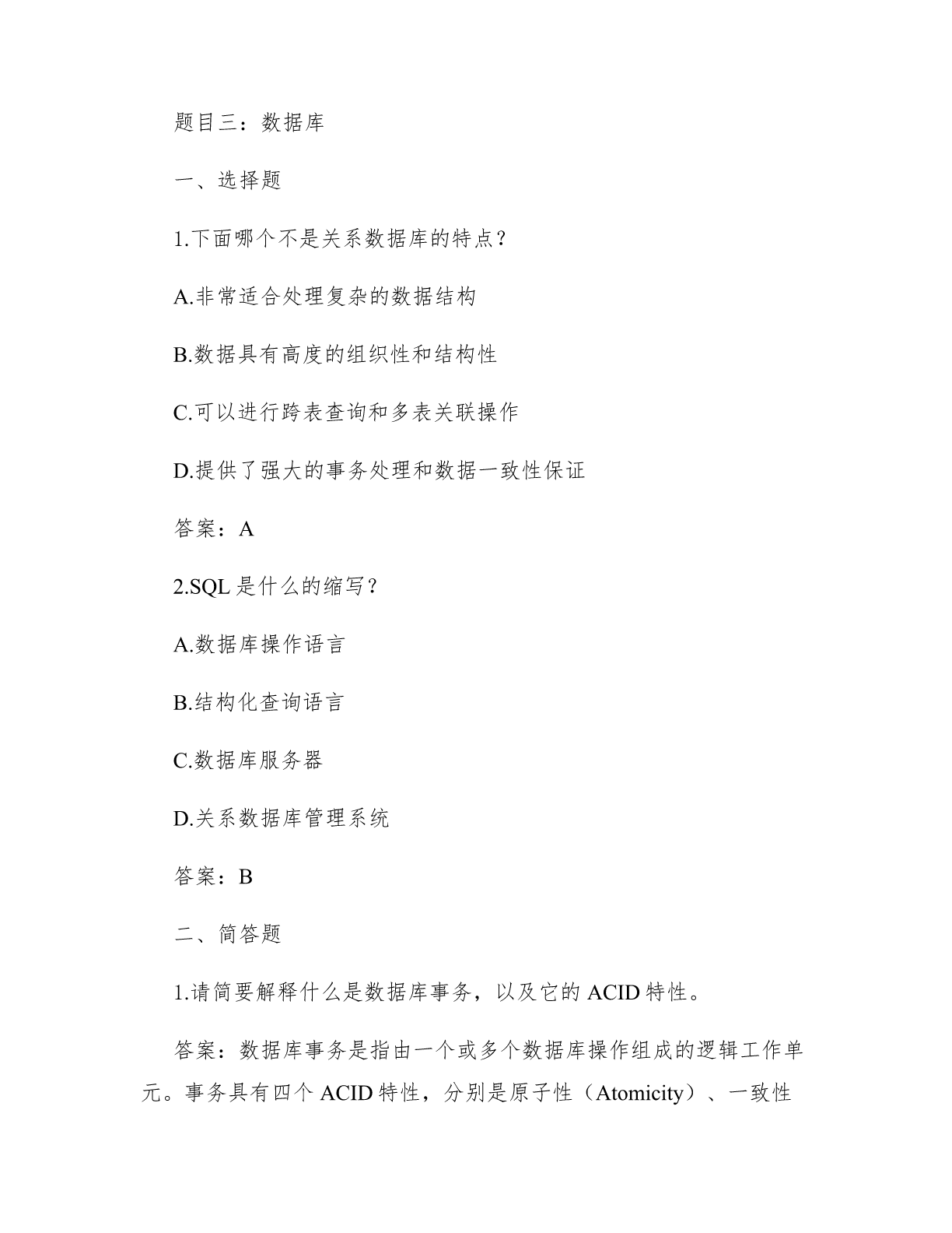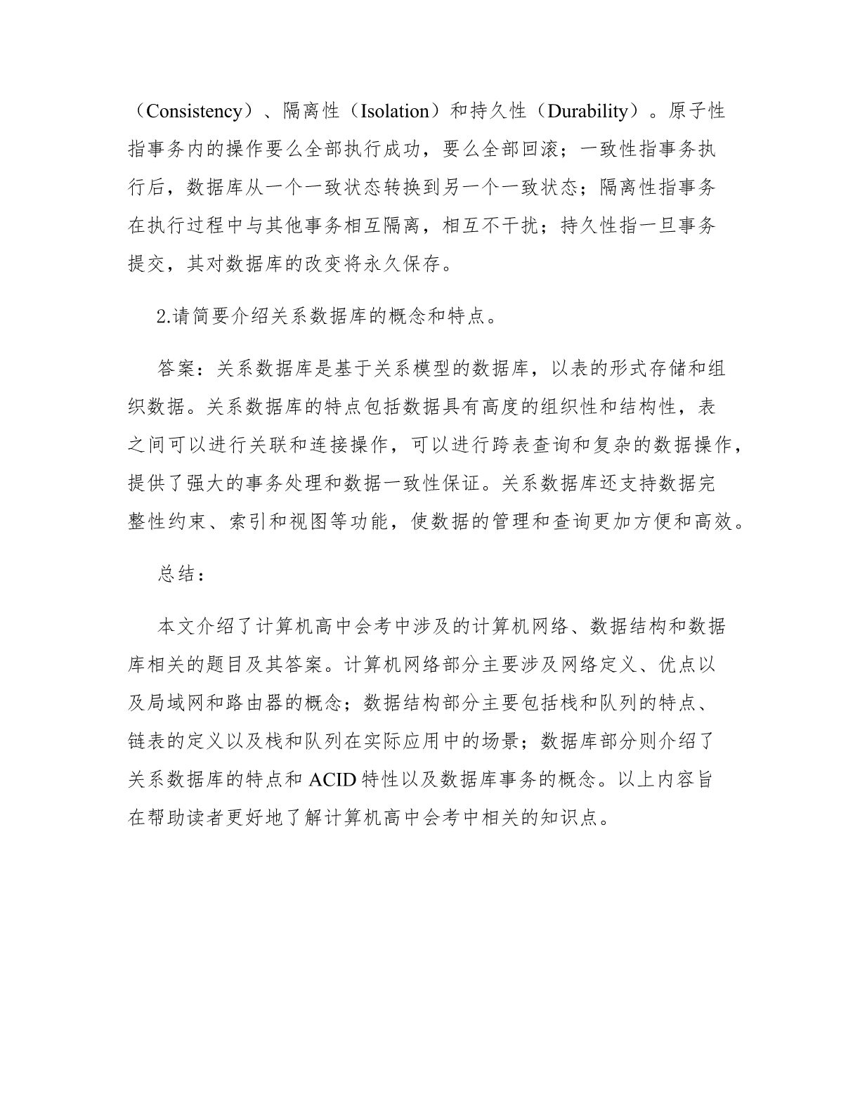 计算机高中会考试题及答案题目一:计算机网络一、选择题1.计算机网络的定义是()。A.将各种计算机通过网络连接起来B.将各种设备通过网络连接起来C.将各种计算机通过网络连接起来并实现信息交换D.将各种设备通过网络连接起来并实现信息交换答案:C2.下面哪个选项不属于计算机网络的优点?A.方便信息互通和共享B.高效传输速度C.提高数据安全性D.减少硬件设备成本答案:D二、判断题1.局域网(LAN)是指在较小的范围内传输数据的网络。答案:对2.路由器是连接互联网与局域网的设备。答案:对题目二:数据结构一、填空题1.栈是一种()结构,遵循先进后出的原则。答案:线性2.堆是一种()结构,用于实现优先队列。答案:树二、简答题1.请简要解释什么是链表,并列举链表的几种常见类型。答案:链表是一种用于存储和组织数据的数据结构,由一系列节点组成,每个节点包含一个数据元素和指向下一个节点的指针。链表的常见类型有单链表、双向链表和循环链表。2.简要介绍栈和队列的特点和应用场景。答案:栈是一种先进后出(LIFO)的数据结构,适用于需要后进先出操作的场景,例如函数调用、括号匹配等。队列是一种先进先出(FIFO)的数据结构,适用于需要先进先出操作的场景,例如任务调度、消息队列等。题目三:数据库一、选择题1.下面哪个不是关系数据库的特点?A.非常适合处理复杂的数据结构B.数据具有高度的组织性和结构性C.可以进行跨表查询和多表关联操作D.提供了强大的事务处理和数据一致性保证答案:A2.SQL是什么的缩写?A.数据库操作语言B.结构化查询语言C.数据库服务器D.关系数据库管理系统答案:B二、简答题1.请简要解释什么是数据库事务,以及它的ACID特性。答案:数据库事务是指由一个或多个数据库操作组成的逻辑工作单元。事务具有四个ACID特性,分别是原子性(Atomicity)、一致性(Consistency)、隔离性(Isolation)和持久性(Durability)。原子性指事务内的操作要么全部执行成功,要么全部回滚;一致性指事务执行后,数据库从一个一致状态转换到另一个一致状态;隔离性指事务在执行过程中与其他事务相互隔离,相互不干扰;持久性指一旦事务提交,其对数据库的改变将永久保存。2.请简要介绍关系数据库的概念和特点。答案:关系数据库是基于关系模型的数据库,以表的形式存储和组织数据。关系数据库的特点包括数据具有高度的组织性和结构性,表之间可以进行关联和连接操作,可以进行跨表查询和复杂的数据操作,提供了强大的事务处理和数据一致性保证。关系数据库还支持数据完整性约束、索引和视图等功能,使数据的管理和查询更加方便和高效。总结:本文介绍了计算机高中会考中涉及的计算机网络、数据结构和数据库相关的题目及其答案。计算机网络部分主要涉及网络定义、优点以及局域网和路由器的概念;数据结构部分主要包括栈和队列的特点、链表的定义以及栈和队列在实际应用中的场景;数据库部分则介绍了关系数据库的特点和ACID特性以及数据库事务的概念。以上内容旨在帮助读者更好地了解计算机高中会考中相关的知识点。