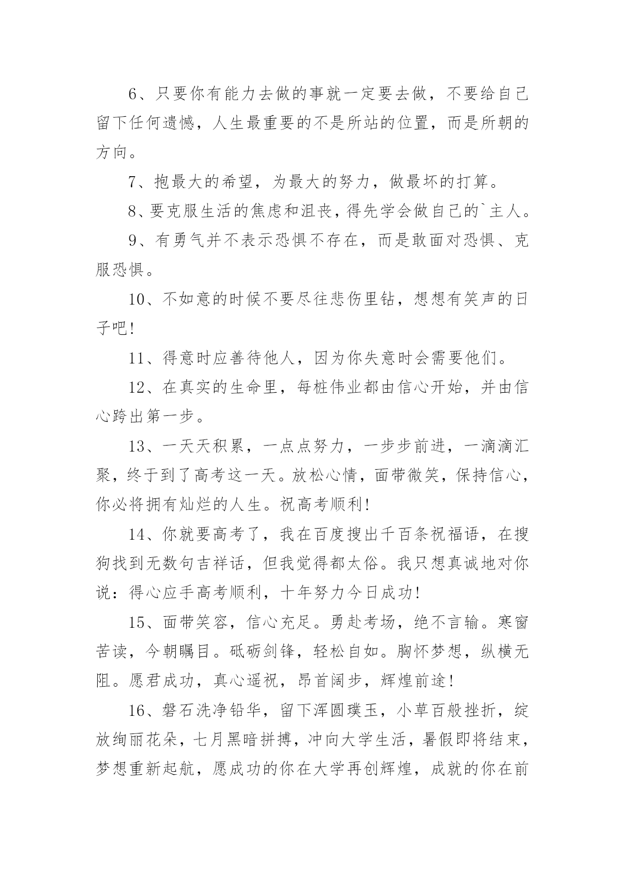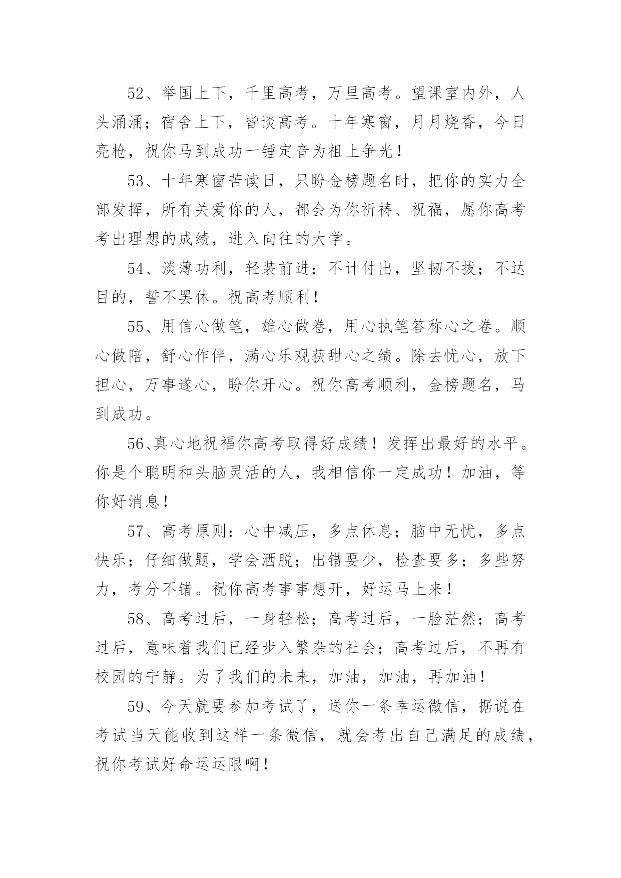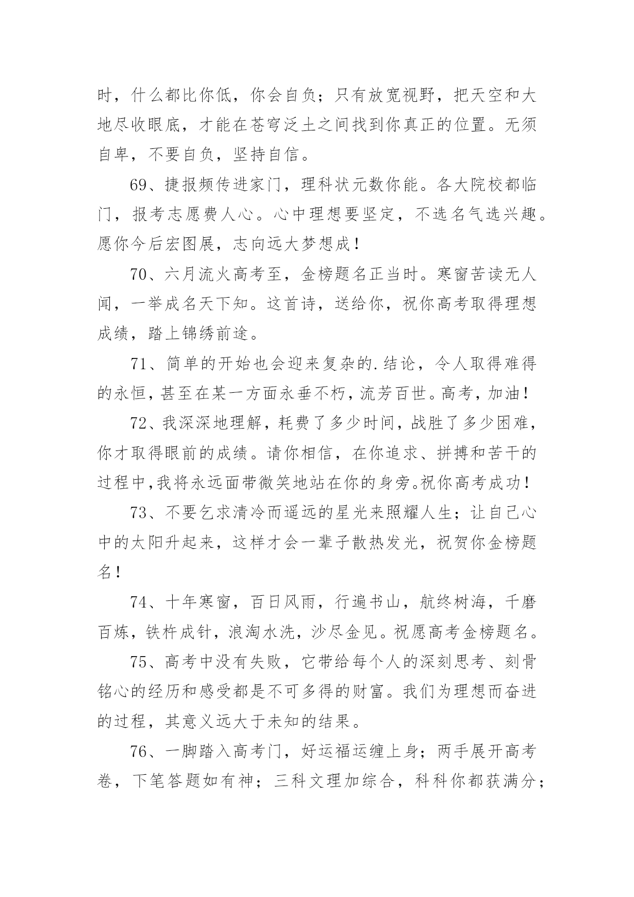 老师高考祝福语老师高考祝福语在日常学习、工作或生活中,大家都写过祝福语吧,祝福语可以给人们带去温暖和好心情。相信很多朋友都对写祝福语感到非常苦恼吧,以下是小编整理的老师高考祝福语,仅供参考,大家一起来看看吧。老师高考祝福语篇11、此刻打盹,你将做梦;而此刻学习,你将圆梦。2、不大可能的事也许今天实现,根本不可能的事也许明天会实现。3、长风破浪会有时,直挂云帆济沧海,高考是人生的一个起点,相信自己,明天又是一和个艳阳天!4、十年寒窗,盼前程似锦;百日苦战,誓金榜题名。5、只要路是对的,就不怕路远。6、苦想没盼头,苦干有奔头。7、我知道高考很难,但我也知道,如果不努力,以后会更难。8、任何人,如果放松了对自己的要求,不管你拥有多么辉煌的过去,都有可能很快掉队。9、成长,就是逼着你一个人,踉踉跄跄的受伤,跌跌撞撞的坚强。10、不求难题都做,先求中低档题不错。11、勤能补拙是良训,一分辛劳一分才。12、外在压力增加时,就应增强内在的动力。13、人生没有彩排,每一个细节都是现场直播。14、把汗水变成珍珠,把梦想变成现实!15、人生终有许多选择。每一步都要慎重。但是一次选择不能决定一切。不要犹豫,作出选择就不要后悔。只要我们能不屈不挠地奋斗,胜利就在前方。16、扛得住给我扛,扛不住给我死扛。17、别跟我说高考有多难。丢脸的事别和我说,丧气的话别对我讲,我这里只有成功的符号。18、学习时的痛苦是暂时的,未学到的痛苦是终生的。19、争取时间就是争取成功,提高效率就是提高分数。20、吃得苦中苦,方为人上人。21、我要怒放我的生命,飞向那自由的天地。像雄鹰一样翱翔。22、不要自卑,你不比别人笨。不要自满,别人不比你笨。23、高考的最后一题是我们的青春。24、看清知识的盲点、能力的弱项、丢分的原因。25、模拟失利并非坏事,让你发现问题。26、人活不为美丑而争奇斗艳,人活要为理想知难而进。27、你有你的赤橙黄绿,我有我的青蓝靛紫,天空同属于你们,因为你们年轻。28、人生之旅短暂而漫长,让我们都能发出理解之光。29、知识改变命运,勤奋创造未来。30、没有一件事情可以一步登天,所有的结果都有一个积累的过程,这个过程叫做坚持。31、四分学识智,三心细耐恒,二成应试法,一片平常心。32、你必须非常努力,才能看起来毫不费力。33、脚踏实地沉着备战,相信自己相信未来。34、有动力而无压力,紧张而不焦虑,迅速而不慌乱。35、高考得高分的秘诀就是少丢分!36、这三年的辛勤走过,你获得的太多太多。37、不思,故有惑;不求,故无得;不问,故不知。38、人生伟业的建立,不在能知,乃在能行。39、高三高考高目标,苦学善学上好学。40、超越自己,向自己挑战,向弱项挑战,向懒惰挑战,向陋习挑战。41、面对高考要有信心,高考之前要能平心,迎战高考要有开心,高考答卷要能细心,高考来临,愿你超水平发挥,马到成功。42、付出终有回报,信心绝对重要。高考了,别忘面带微笑。有空睡个好觉,不必紧张煎熬。敞开鲲鹏怀抱,直上青云九霄。43、高考即将来临,展示自我的时刻有信心而无胆怯,有动力而无压力,莫紧张无焦虑,答题迅速不慌乱!愿你马到成功,金笔提名!44、人生就是一考场,准备充分成绩好。拼搏努力全做到,结果怎样无愧心。人生之路千万条,未必就是读书高。考场之上人轻松,超常发挥不慌张。愿你高考尽全力,学业有成人欢笑!45、高考在即,紧张难免;适量放松,方位上策;书本暂放,好好休息;临阵磨枪,效果甚微;心态良好,至关重要;平常心待,万事皆宜,愿你高考,取得佳绩!46、高考在即,希望你能克服各方面的心理压力,注意加强营养,保持良好精神状态,相信你一定能超常发挥、马到成功!47、信心是成功的一半。高考是一种丰收,它包蕴太多的内涵。无论高考成绩如何,你的成长与成熟是毋庸置疑。这三年的辛勤付出,你将获得太多、太多。试试就能行,争争定能赢!48、十年寒窗了,人生步入新的起点;高考硝烟已散,报考志愿才是重点;浮躁烦恼去掉,胜利号角并不遥远。愿幸福与你相伴,金榜题名展笑颜!49、大学生活多完美,精彩人生炫舞跳。寒窗十年苦读书,只盼今日搏高考。满怀信情绪绪调,细阅精答看题标。真功实学显英才,夺冠提名全家笑。祝你:品学兼优成绩好,择校清华来一遭。50、高考来临,送你高考三法宝:幸运神笔一支,下笔就是满分;消难橡皮一块,错题一改即对;深深祝福一段,高考定然夺魁。高考日,祝你成功,幸运加倍!51、十年寒窗苦,全待今朝验。祝高考顺利!52、举国上下,千里高考,万里高考。望课室内外,人头涌涌;宿舍上下,皆谈高考。十年寒窗,月月烧香,今日亮枪,祝你马到成功一锤定音为祖上争光!53、十年寒窗苦读日,只盼金榜题名时,把你的实力全部发挥,所有关爱你的人,都会为你祈祷、祝福,愿你高考考出理想的成绩,进入向往的大学。54、淡薄功利,