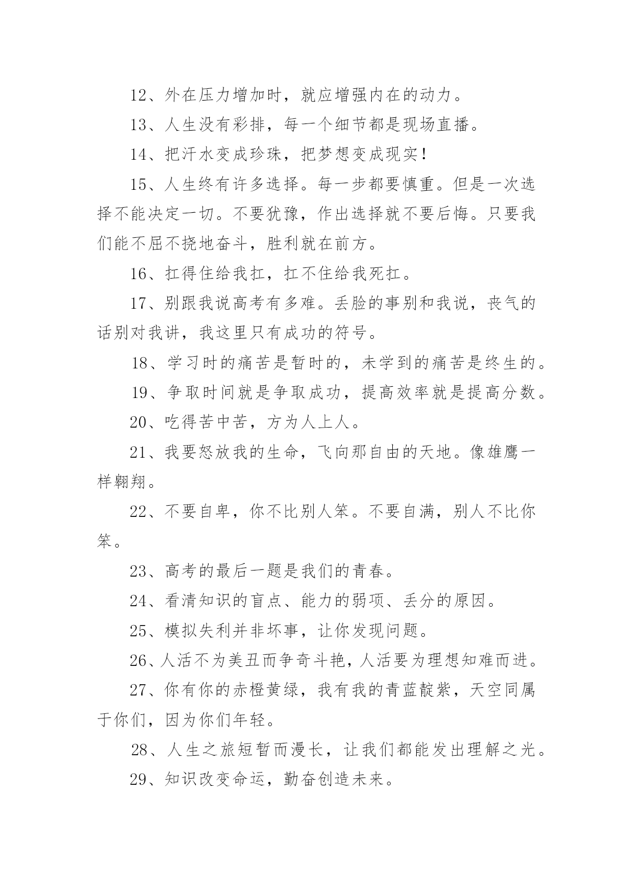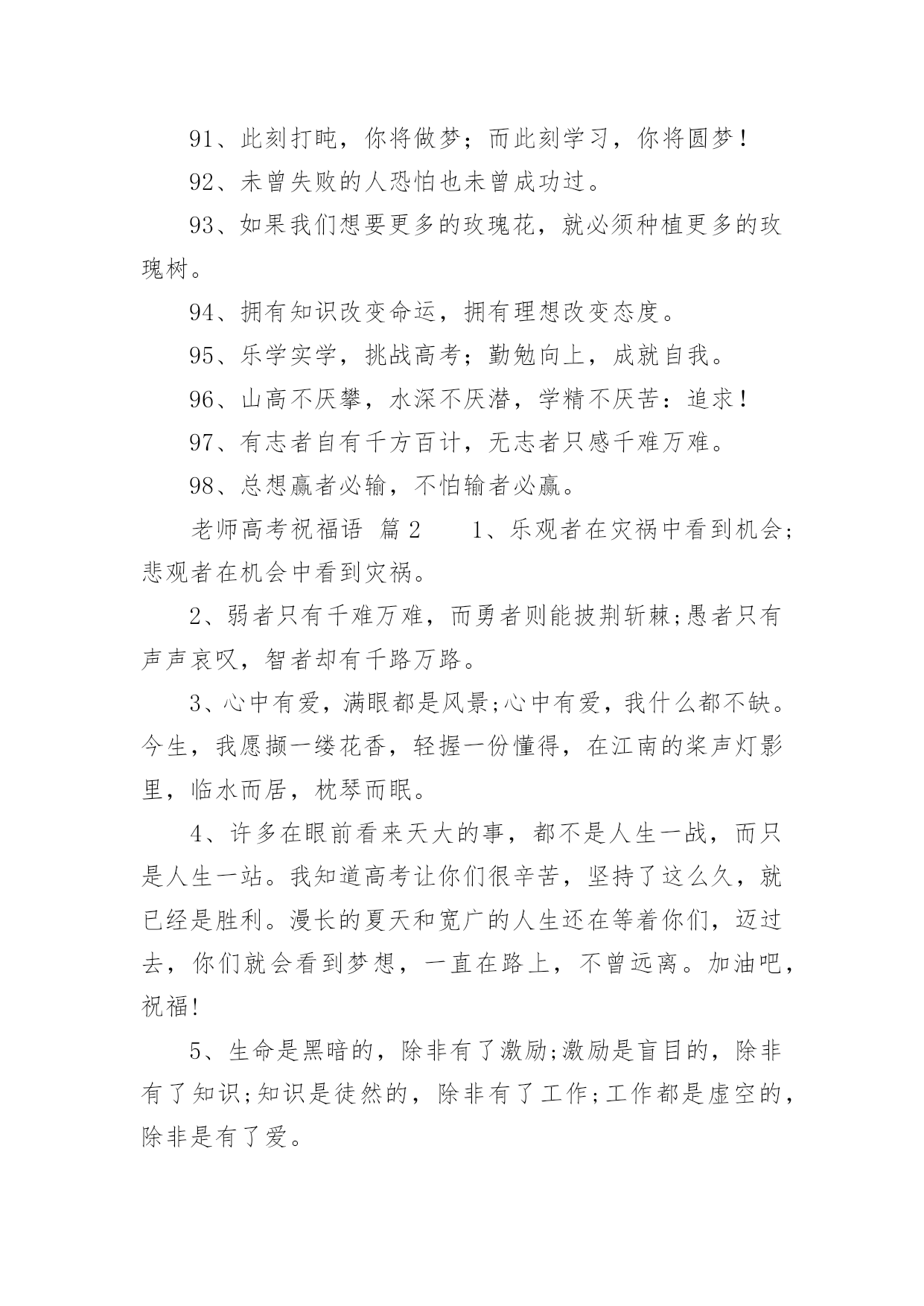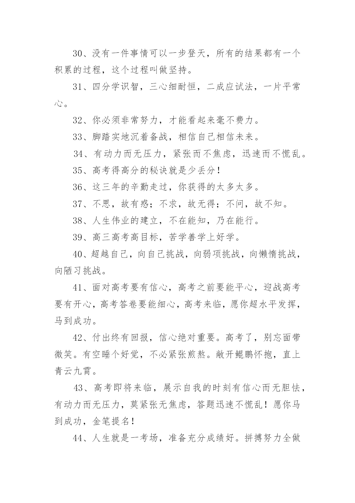老师高考祝福语老师高考祝福语在日常学习、工作或生活中,大家都写过祝福语吧,祝福语可以给人们带去温暖和好心情。相信很多朋友都对写祝福语感到非常苦恼吧,以下是小编整理的老师高考祝福语,仅供参考,大家一起来看看吧。老师高考祝福语篇11、此刻打盹,你将做梦;而此刻学习,你将圆梦。2、不大可能的事也许今天实现,根本不可能的事也许明天会实现。3、长风破浪会有时,直挂云帆济沧海,高考是人生的一个起点,相信自己,明天又是一和个艳阳天!4、十年寒窗,盼前程似锦;百日苦战,誓金榜题名。5、只要路是对的,就不怕路远。6、苦想没盼头,苦干有奔头。7、我知道高考很难,但我也知道,如果不努力,以后会更难。8、任何人,如果放松了对自己的要求,不管你拥有多么辉煌的过去,都有可能很快掉队。9、成长,就是逼着你一个人,踉踉跄跄的受伤,跌跌撞撞的坚强。10、不求难题都做,先求中低档题不错。11、勤能补拙是良训,一分辛劳一分才。12、外在压力增加时,就应增强内在的动力。13、人生没有彩排,每一个细节都是现场直播。14、把汗水变成珍珠,把梦想变成现实!15、人生终有许多选择。每一步都要慎重。但是一次选择不能决定一切。不要犹豫,作出选择就不要后悔。只要我们能不屈不挠地奋斗,胜利就在前方。16、扛得住给我扛,扛不住给我死扛。17、别跟我说高考有多难。丢脸的事别和我说,丧气的话别对我讲,我这里只有成功的符号。18、学习时的痛苦是暂时的,未学到的痛苦是终生的。19、争取时间就是争取成功,提高效率就是提高分数。20、吃得苦中苦,方为人上人。21、我要怒放我的生命,飞向那自由的天地。像雄鹰一样翱翔。22、不要自卑,你不比别人笨。不要自满,别人不比你笨。23、高考的最后一题是我们的青春。24、看清知识的盲点、能力的弱项、丢分的原因。25、模拟失利并非坏事,让你发现问题。26、人活不为美丑而争奇斗艳,人活要为理想知难而进。27、你有你的赤橙黄绿,我有我的青蓝靛紫,天空同属于你们,因为你们年轻。28、人生之旅短暂而漫长,让我们都能发出理解之光。29、知识改变命运,勤奋创造未来。30、没有一件事情可以一步登天,所有的结果都有一个积累的过程,这个过程叫做坚持。31、四分学识智,三心细耐恒,二成应试法,一片平常心。32、你必须非常努力,才能看起来毫不费力。33、脚踏实地沉着备战,相信自己相信未来。34、有动力而无压力,紧张而不焦虑,迅速而不慌乱。35、高考得高分的秘诀就是少丢分!36、这三年的辛勤走过,你获得的太多太多。37、不思,故有惑;不求,故无得;不问,故不知。38、人生伟业的建立,不在能知,乃在能行。39、高三高考高目标,苦学善学上好学。40、超越自己,向自己挑战,向弱项挑战,向懒惰挑战,向陋习挑战。41、面对高考要有信心,高考之前要能平心,迎战高考要有开心,高考答卷要能细心,高考来临,愿你超水平发挥,马到成功。42、付出终有回报,信心绝对重要。高考了,别忘面带微笑。有空睡个好觉,不必紧张煎熬。敞开鲲鹏怀抱,直上青云九霄。43、高考即将来临,展示自我的时刻有信心而无胆怯,有动力而无压力,莫紧张无焦虑,答题迅速不慌乱!愿你马到成功,金笔提名!44、人生就是一考场,准备充分成绩好。拼搏努力全做到,结果怎样无愧心。人生之路千万条,未必就是读书高。考场之上人轻松,超常发挥不慌张。愿你高考尽全力,学业有成人欢笑!45、高考在即,紧张难免;适量放松,方位上策;书本暂放,好好休息;临阵磨枪,效果甚微;心态良好,至关重要;平常心待,万事皆宜,愿你高考,取得佳绩!46、高考在即,希望你能克服各方面的心理压力,注意加强营养,保持良好精神状态,相信你一定能超常发挥、马到成功!47、信心是成功的一半。高考是一种丰收,它包蕴太多的内涵。无论高考成绩如何,你的成长与成熟是毋庸置疑。这三年的辛勤付出,你将获得太多、太多。试试就能行,争争定能赢!48、十年寒窗了,人生步入新的起点;高考硝烟已散,报考志愿才是重点;浮躁烦恼去掉,胜利号角并不遥远。愿幸福与你相伴,金榜题名展笑颜!49、大学生活多完美,精彩人生炫舞跳。寒窗十年苦读书,只盼今日搏高考。满怀信情绪绪调,细阅精答看题标。真功实学显英才,夺冠提名全家笑。祝你:品学兼优成绩好,择校清华来一遭。50、高考来临,送你高考三法宝:幸运神笔一支,下笔就是满分;消难橡皮一块,错题一改即对;深深祝福一段,高考定然夺魁。高考日,祝你成功,幸运加倍!51、十年寒窗苦,全待今朝验。祝高考顺利!52、举国上下,千里高考,万里高考。望课室内外,人头涌涌;宿舍上下,皆谈高考。十年寒窗,月月烧香,今日亮枪,祝你马到成功一锤定音为祖上争光!53、十年寒窗苦读日,只盼金榜题名时,把你的实力全部发挥,所有关爱你的人,都会为你祈祷、祝福,愿你高考考出理想的成绩,进入向往的大学。54、淡薄功利,