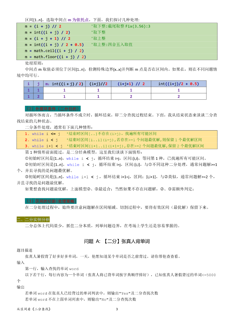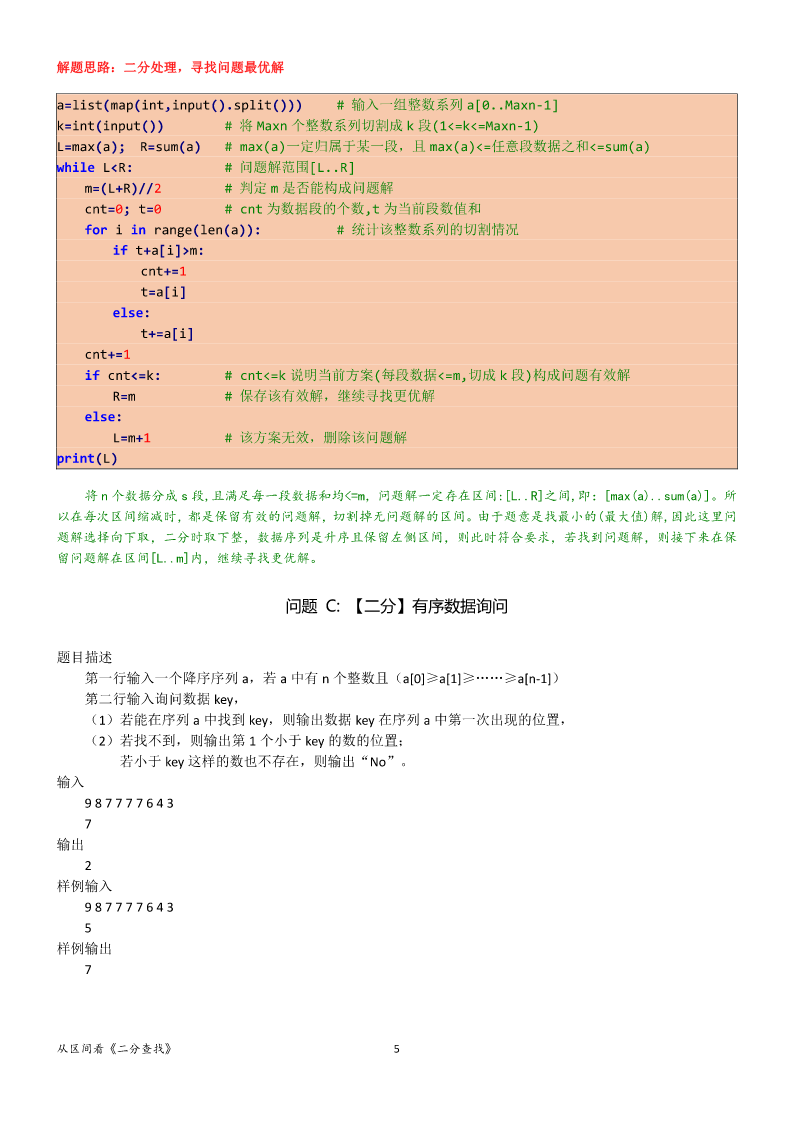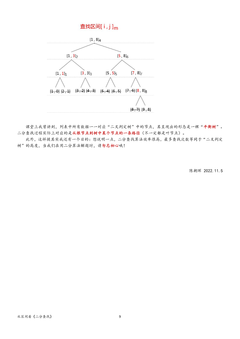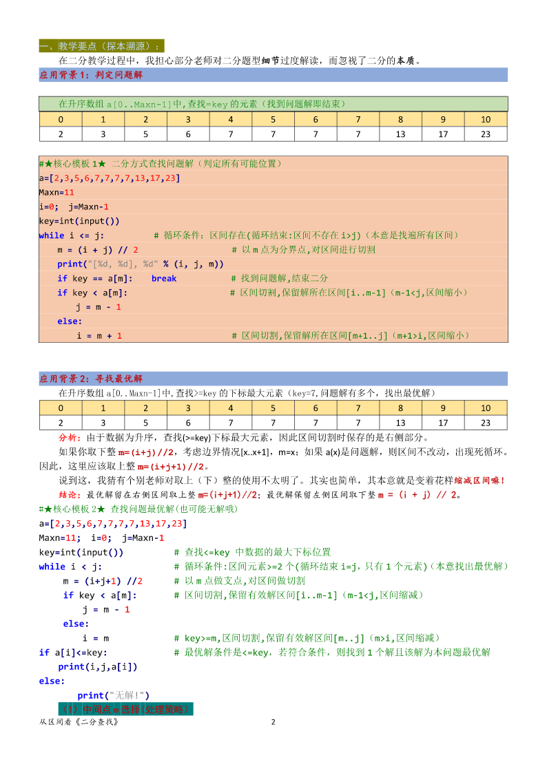 不忘初心、牢记使命——从区间角度看“二分”路桥中学陈朝晖最近网上对二分讨论热烈,昨天我们组李老师问到二分解题,原本自己压根就没准备写什么二分,今天想想还是写点,凑凑热闹吧……。上周我们组阮老师在准备一节《二分解题指导》市复习课,记得当时我给了她8个字:“不忘初心、牢记使命”,今天就拿它作标题吧。查找算法中最常见的是线性探查(顺序查找),放到具体应用中有不同需求:数据查找时,数据可能存在(不存在);找到其中一个解即结束;也可能找到符合题意多个解,如何确保最优解……不管怎样,二分查找本意就是查找,其算法代码描述并不复杂,但在具体应用中稍有不慎,易导致死循环。接下来,让我们一起走进二分查找吧。(1)二分的初心“初心”——让我们不要忘记二分前提是数据有序,并由此引出二分查找效率高、适合大数据。数据必须有序是二分使用的前提条件,如果脱离这个前提来谈二分,你不觉得很好笑吗!二分是一种查找策略,二分其目的是为了加快查找速度,与之相应的还有三分。二分查找效率在大数据下方能凸显出来。少量数据无需二分,如果你只有那么几个数据,有做二分的必要吗!(2)二分的使命“使命”——二分过程中始终要注意问题解在区间缩减、区间切割的过程中,要将有效区间留下来。为加深对区间切割的理解,在下面纸带上我写了一组有序数据,请你每次对折并撕掉无效纸带,直到找出。25小结:n个节点,采用二分算法查找,最多查找次数是。推论1:若有节点总个数为n的完全二叉树,则其树的高度k:证明:若该完全二叉树总节点个数为n,树的高度为k,根据推k论=5有lo:g2n+1(n≥1),即:……(1)−1−12对不等≤式(≤12)−两1侧(取≥对1数),有:2≤<2−1所以,有,由l于ogk22为整数≤,log可2知<:log22因此,有−1≤log2<,或者log2=k−1证毕。(注:推论1=等同+(≥)=(+)(≥)...................=.....(.......).+...(...≥...)...................................................几点思考:在二分查找过程中,每次查找位置点key等同于二叉树的一个节点,若将树中各节点查找过程绘制出来,则得到二分查找树。该二叉树特征如下。1.二分查找对象是有序序列,查找结果为(=key、<key、>key),该二分查找树一定为一棵二叉树2.由于每次查找均对应为找到的一个节点,所以树中所有内节点+叶节点和等同总节点数n。3.左子树、右子树总节点数差值<=1,因此该二叉树是一棵平衡二叉树。从区间看《二分查找》1一、教学要点(探本溯源):在二分教学过程中,我担心部分老师对二分题型细节过度解读,而忽视了二分的本质。应用背景1:判定问题解在升序数组中查找的元素(找到问题解即结束)a[0..Maxn-1],=key01234567891023567777131723#★核心模板1★二分方式查找问题解(判定所有可能位置)a=[2,3,5,6,7,7,7,7,13,17,23]Maxn=11i=0;j=Maxn-1key=int(input())whilei<=j:#循环条件:区间存在(循环结束:区间不存在i>j)(本意是找遍所有区间)m=(i+j)//2#以m点为分界点,对区间进行切割print("[%d,%d],%d"%(i,j,m))ifkey==a[m]:break#找到问题解,结束二分ifkey<a[m]:#区间切割,保留解所在区间[i..m-1](m-1<j,区间缩小)j=m-1else:i=m+1#区间切割,保留解所在区间[m+1..j](m+1>i,区间缩小)应用背景2:寻找最优解在升序数组a[0..Maxn-1]中,查找>=key的下标最大元素(key=7,问题解有多个,找出最优解)01234567891023567777131723分析:由于数据为升序,查找(>=key)下标最大元素,因此区间切割时保存的是右侧部分。如果你取下整,考虑边界情况,;如果是问题解,则区间不改动,出现死循环。m=(i+j)//2[x..x+1]m=xa(x)因此,这里应该取上整。m=(i+j+1)//2说到这,我猜有个别老师对取上(下)整的使用不太明了。其实也简单,其本意就是变着花样缩减区间嘛!结论:最优解留在右侧区间取上整m=(i+j+1)//2;最优解保留左侧区间取下整m=(i+j)//2。#★核心模板2★查找问题最优解(也可能无解哦)a=[2,3,5,6,7,7,7,7,13,17,23]Maxn=11;i=0;j