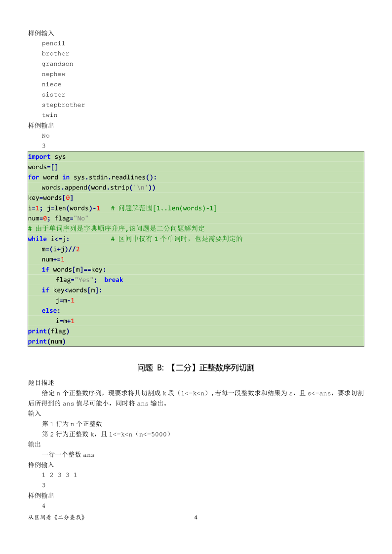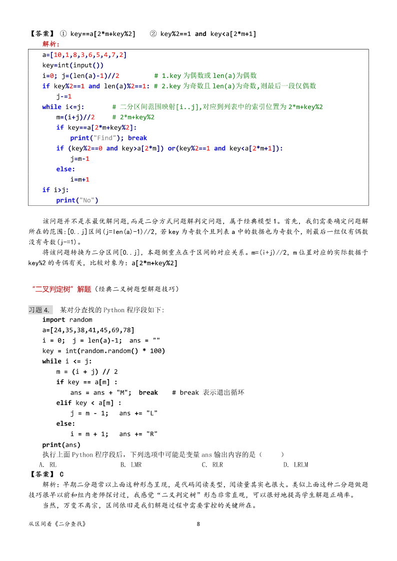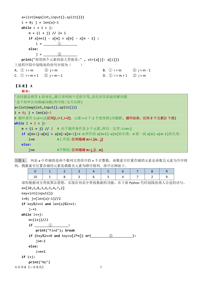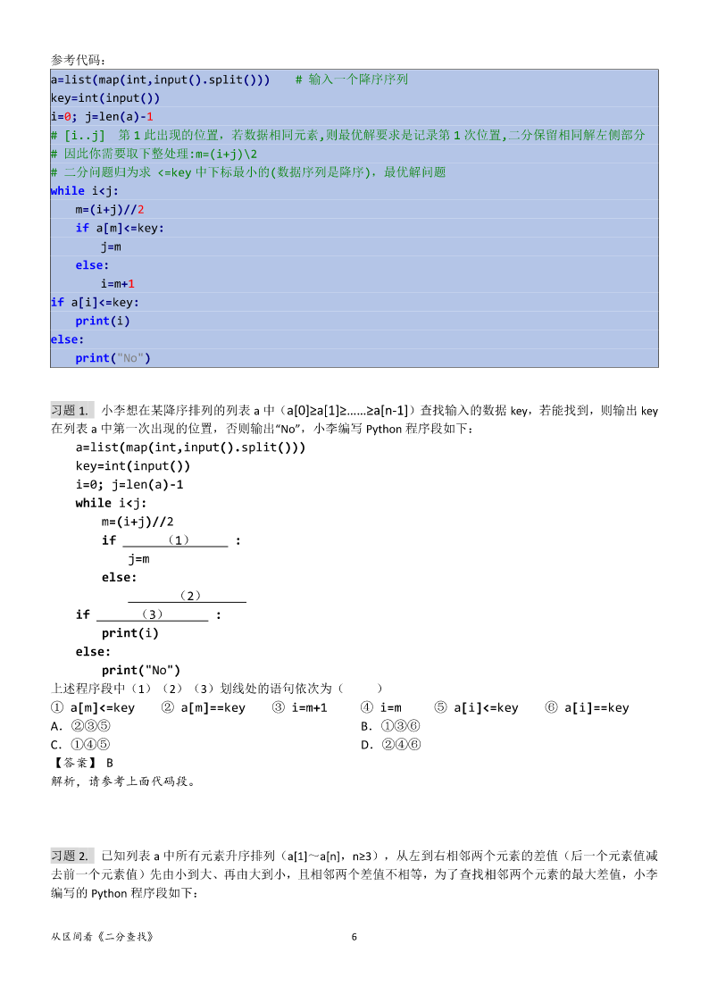 不忘初心、牢记使命——从区间角度看“二分”路桥中学陈朝晖最近网上对二分讨论热烈,昨天我们组李老师问到二分解题,原本自己压根就没准备写什么二分,今天想想还是写点,凑凑热闹吧……。上周我们组阮老师在准备一节《二分解题指导》市复习课,记得当时我给了她8个字:“不忘初心、牢记使命”,今天就拿它作标题吧。查找算法中最常见的是线性探查(顺序查找),放到具体应用中有不同需求:数据查找时,数据可能存在(不存在);找到其中一个解即结束;也可能找到符合题意多个解,如何确保最优解……不管怎样,二分查找本意就是查找,其算法代码描述并不复杂,但在具体应用中稍有不慎,易导致死循环。接下来,让我们一起走进二分查找吧。(1)二分的初心“初心”——让我们不要忘记二分前提是数据有序,并由此引出二分查找效率高、适合大数据。数据必须有序是二分使用的前提条件,如果脱离这个前提来谈二分,你不觉得很好笑吗!二分是一种查找策略,二分其目的是为了加快查找速度,与之相应的还有三分。二分查找效率在大数据下方能凸显出来。少量数据无需二分,如果你只有那么几个数据,有做二分的必要吗!(2)二分的使命“使命”——二分过程中始终要注意问题解在区间缩减、区间切割的过程中,要将有效区间留下来。为加深对区间切割的理解,在下面纸带上我写了一组有序数据,请你每次对折并撕掉无效纸带,直到找出。25小结:n个节点,采用二分算法查找,最多查找次数是。推论1:若有节点总个数为n的完全二叉树,则其树的高度k:证明:若该完全二叉树总节点个数为n,树的高度为k,根据推k论=5有lo:g2n+1(n≥1),即:……(1)−1−12对不等≤式(≤12)−两1侧(取≥对1数),有:2≤<2−1所以,有,由l于ogk22为整数≤,log可2知<:log22因此,有−1≤log2<,或者log2=k−1证毕。(注:推论1=等同+(≥)=(+)(≥)...................=.....(.......).+...(...≥...)...................................................几点思考:在二分查找过程中,每次查找位置点key等同于二叉树的一个节点,若将树中各节点查找过程绘制出来,则得到二分查找树。该二叉树特征如下。1.二分查找对象是有序序列,查找结果为(=key、<key、>key),该二分查找树一定为一棵二叉树2.由于每次查找均对应为找到的一个节点,所以树中所有内节点+叶节点和等同总节点数n。3.左子树、右子树总节点数差值<=1,因此该二叉树是一棵平衡二叉树。从区间看《二分查找》1一、教学要点(探本溯源):在二分教学过程中,我担心部分老师对二分题型细节过度解读,而忽视了二分的本质。应用背景1:判定问题解在升序数组中查找的元素(找到问题解即结束)a[0..Maxn-1],=key01234567891023567777131723#★核心模板1★二分方式查找问题解(判定所有可能位置)a=[2,3,5,6,7,7,7,7,13,17,23]Maxn=11i=0;j=Maxn-1key=int(input())whilei<=j:#循环条件:区间存在(循环结束:区间不存在i>j)(本意是找遍所有区间)m=(i+j)//2#以m点为分界点,对区间进行切割print("[%d,%d],%d"%(i,j,m))ifkey==a[m]:break#找到问题解,结束二分ifkey<a[m]:#区间切割,保留解所在区间[i..m-1](m-1<j,区间缩小)j=m-1else:i=m+1#区间切割,保留解所在区间[m+1..j](m+1>i,区间缩小)应用背景2:寻找最优解在升序数组a[0..Maxn-1]中,查找>=key的下标最大元素(key=7,问题解有多个,找出最优解)01234567891023567777131723分析:由于数据为升序,查找(>=key)下标最大元素,因此区间切割时保存的是右侧部分。如果你取下整,考虑边界情况,;如果是问题解,则区间不改动,出现死循环。m=(i+j)//2[x..x+1]m=xa(x)因此,这里应该取上整。m=(i+j+1)//2说到这,我猜有个别老师对取上(下)整的使用不太明了。其实也简单,其本意就是变着花样缩减区间嘛!结论:最优解留在右侧区间取上整m=(i+j+1)//2;最优解保留左侧区间取下整m=(i+j)//2。#★核心模板2★查找问题最优解(也可能无解哦)a=[2,3,5,6,7,7,7,7,13,17,23]Maxn=11;i=0;j